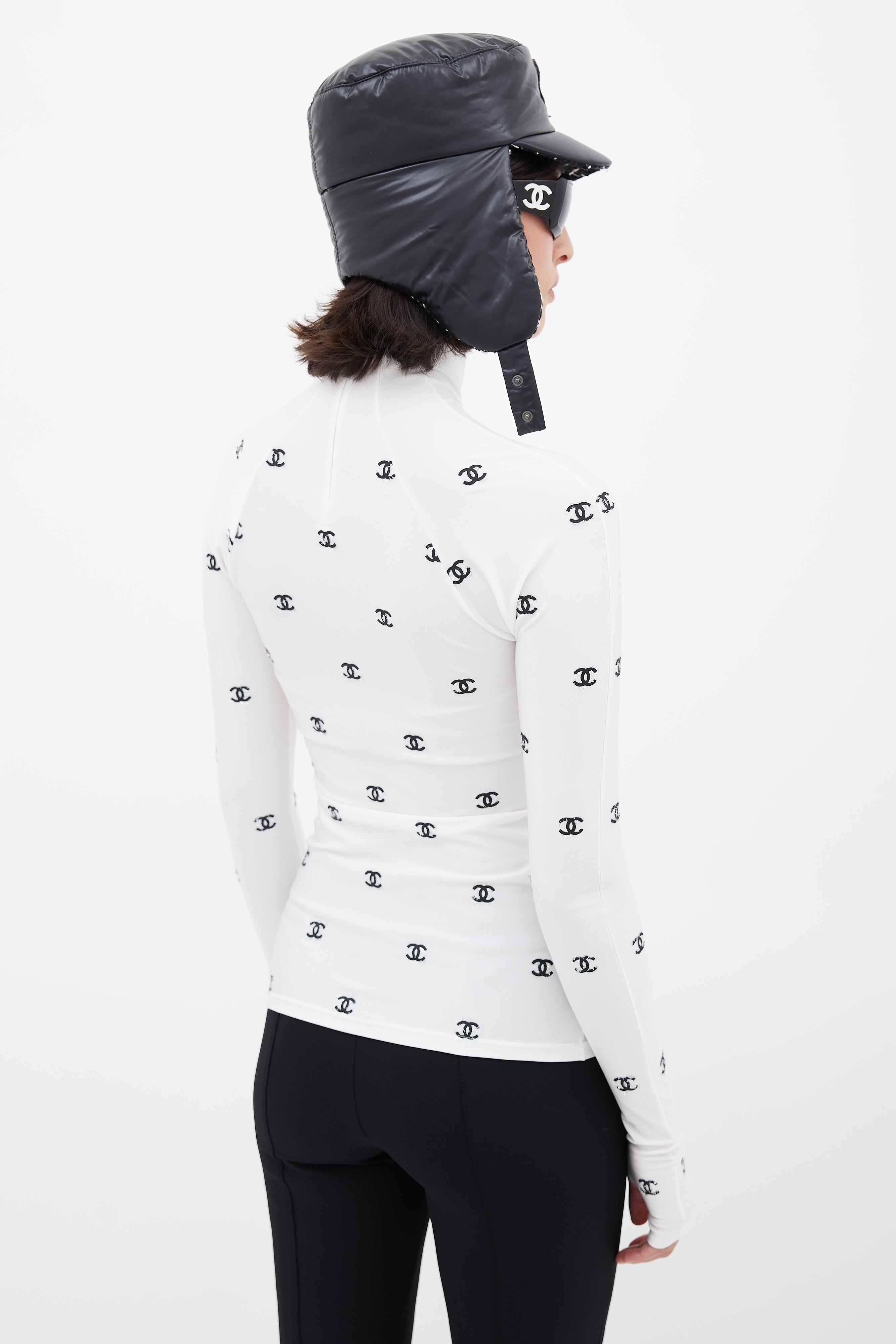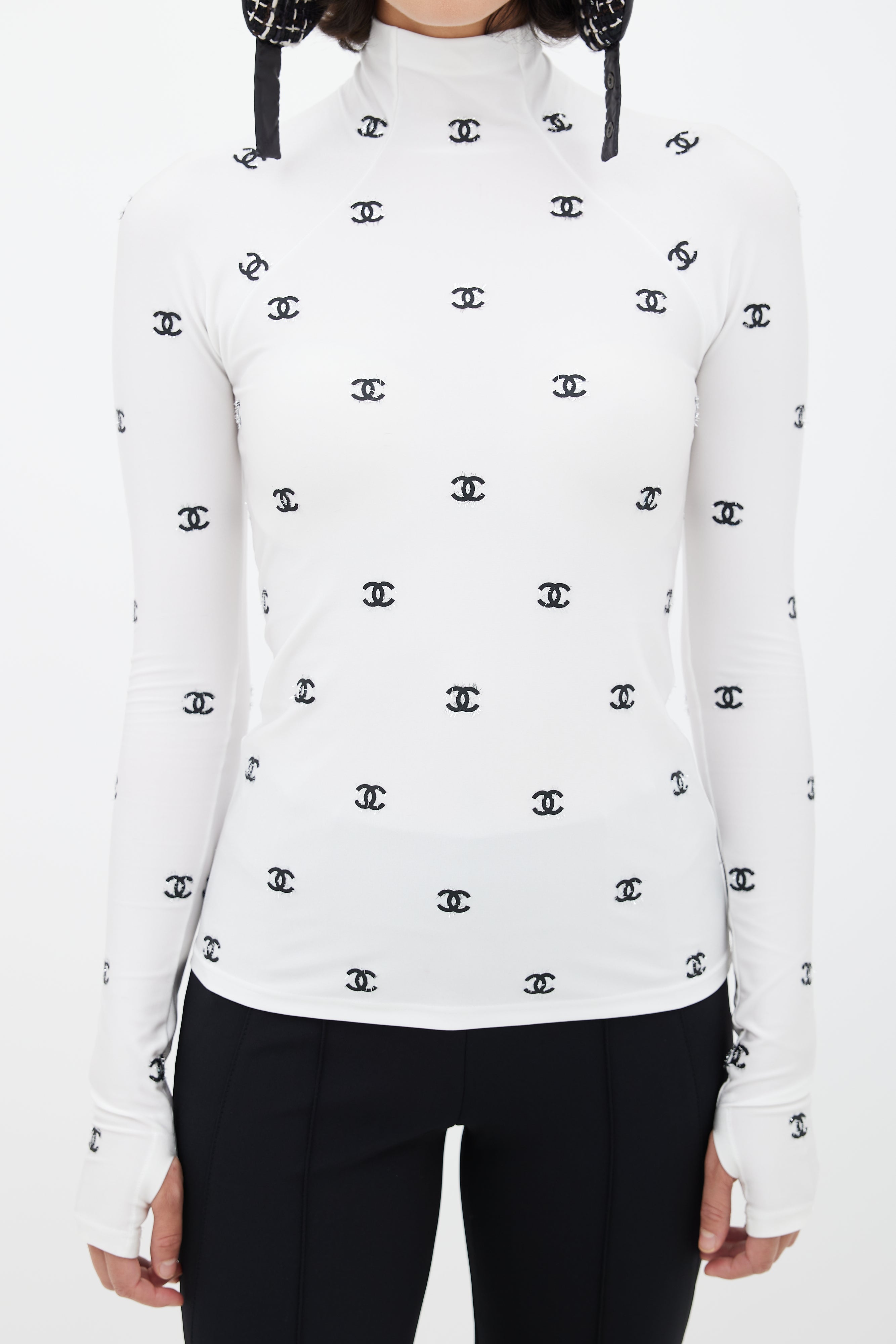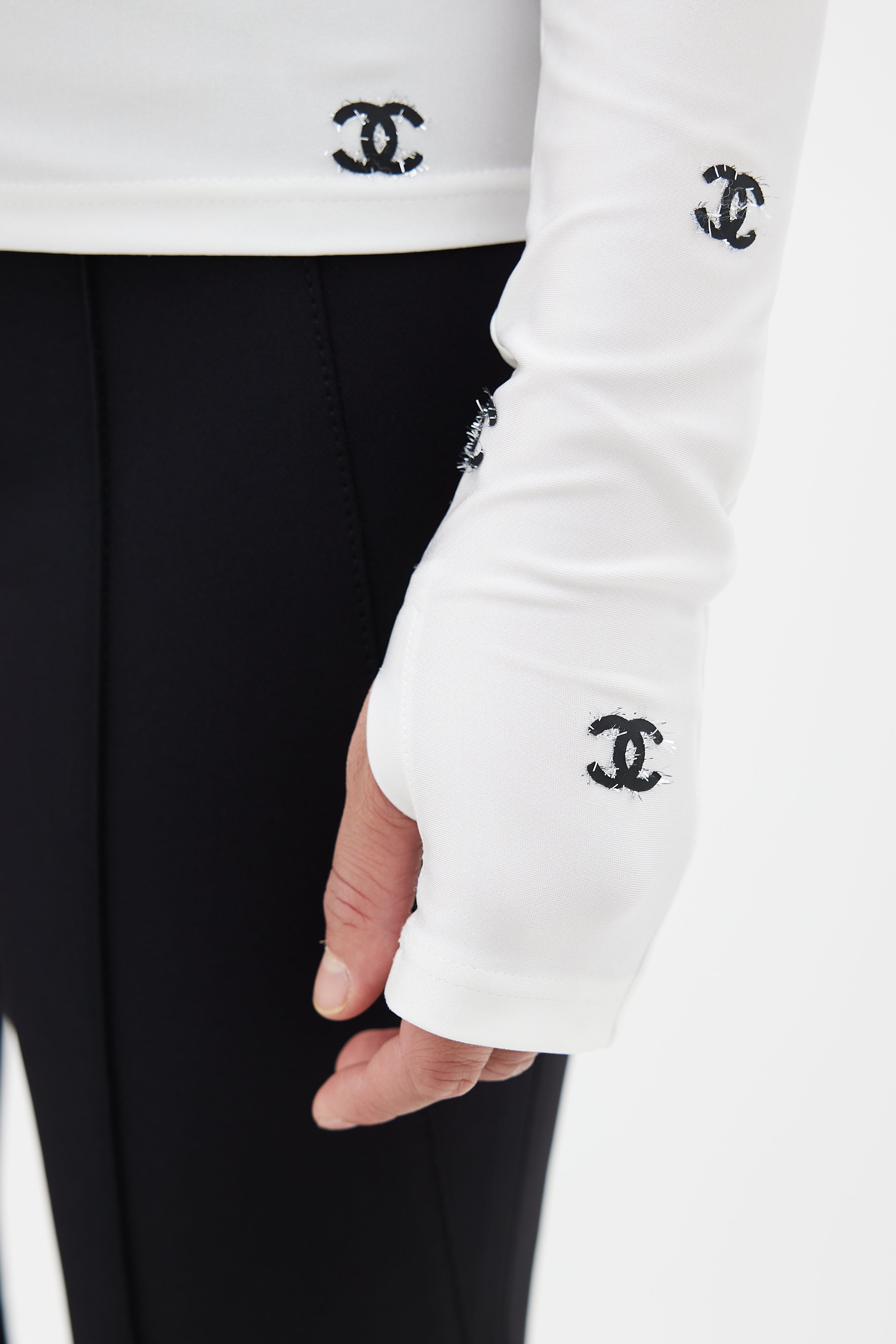 Pre-owned Fall 2021 Chanel white stretch top featuring long sleeves, turtleneck, black and silver CC embroidery throughout, concealed zip closure at back, and raglan shoulder.