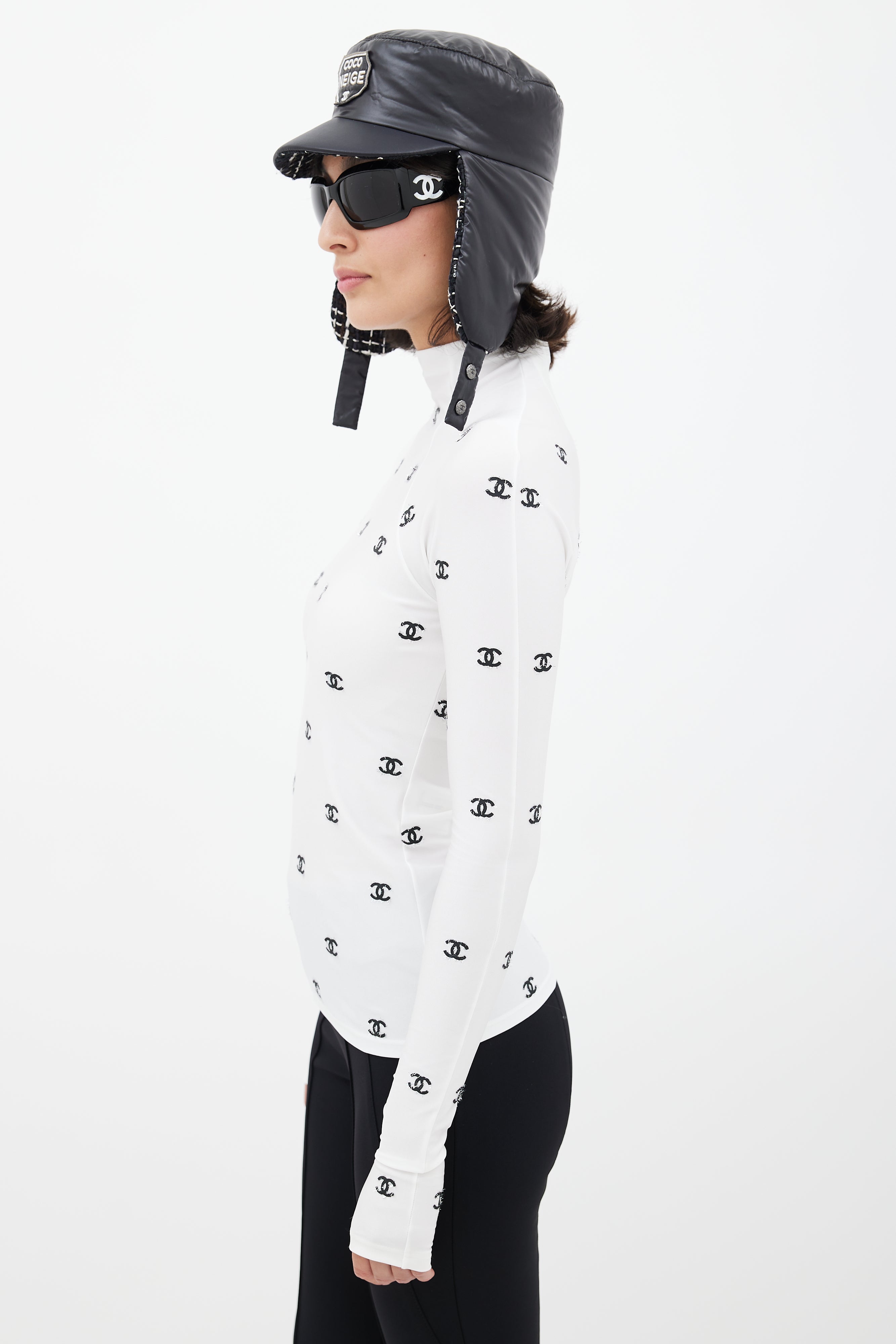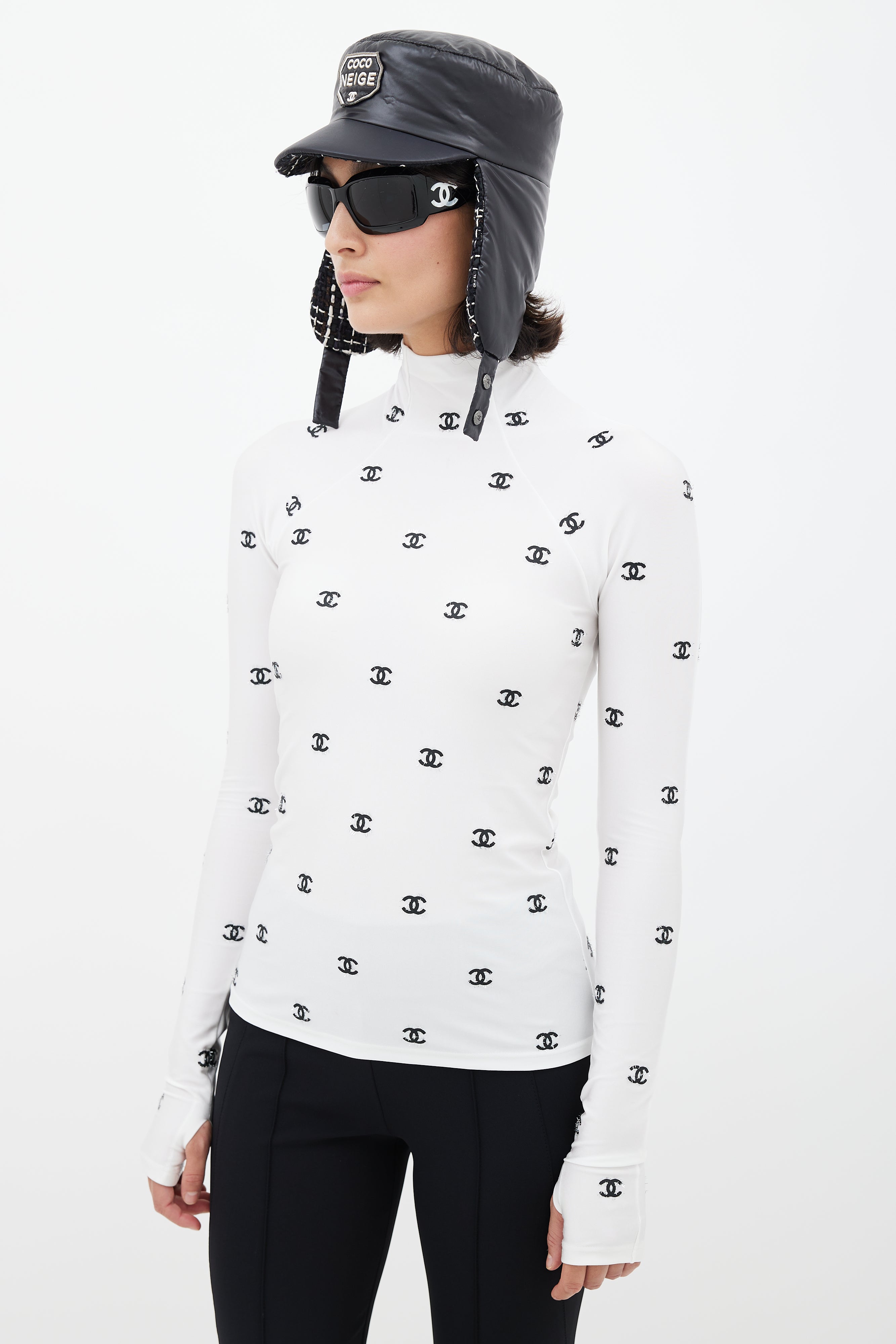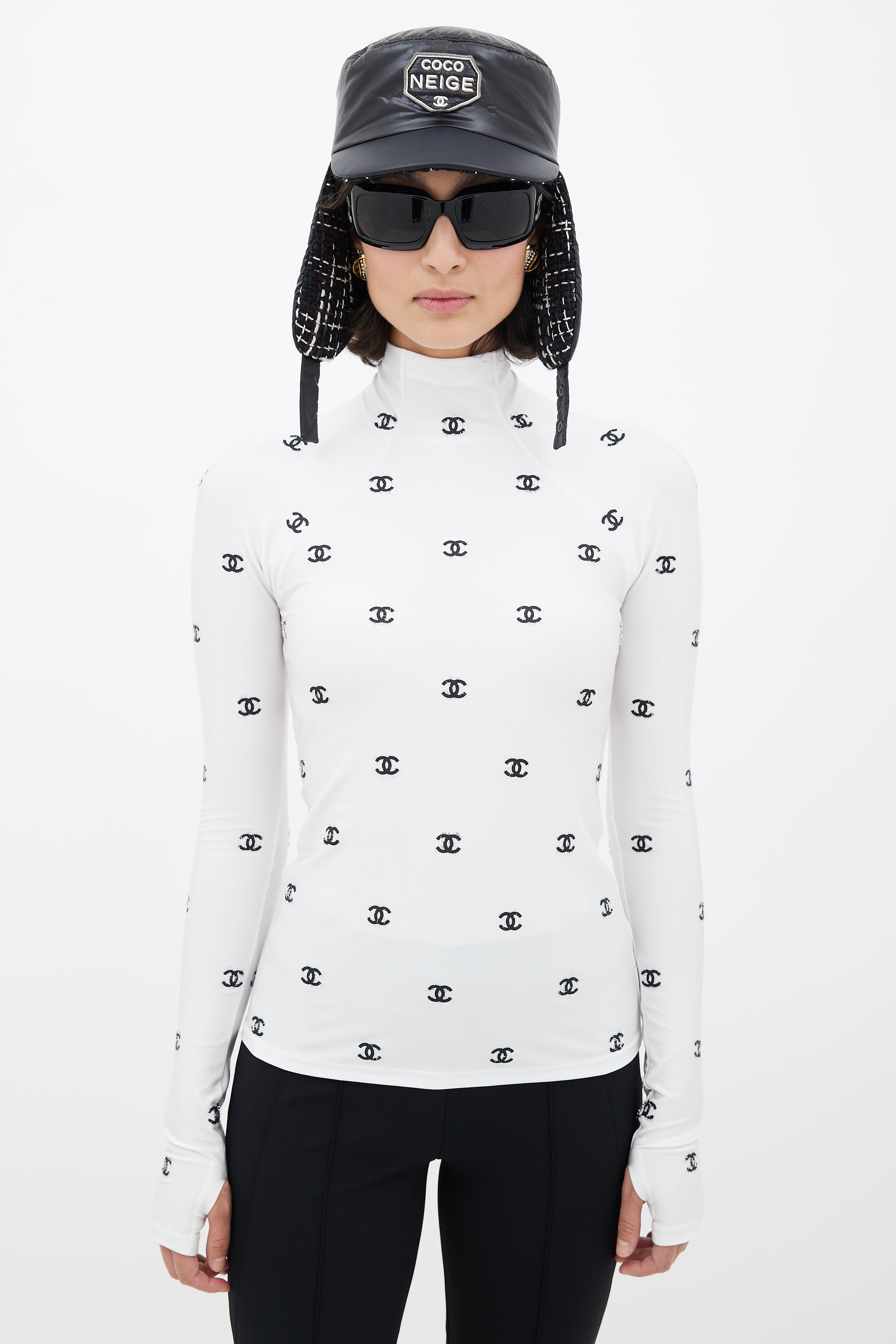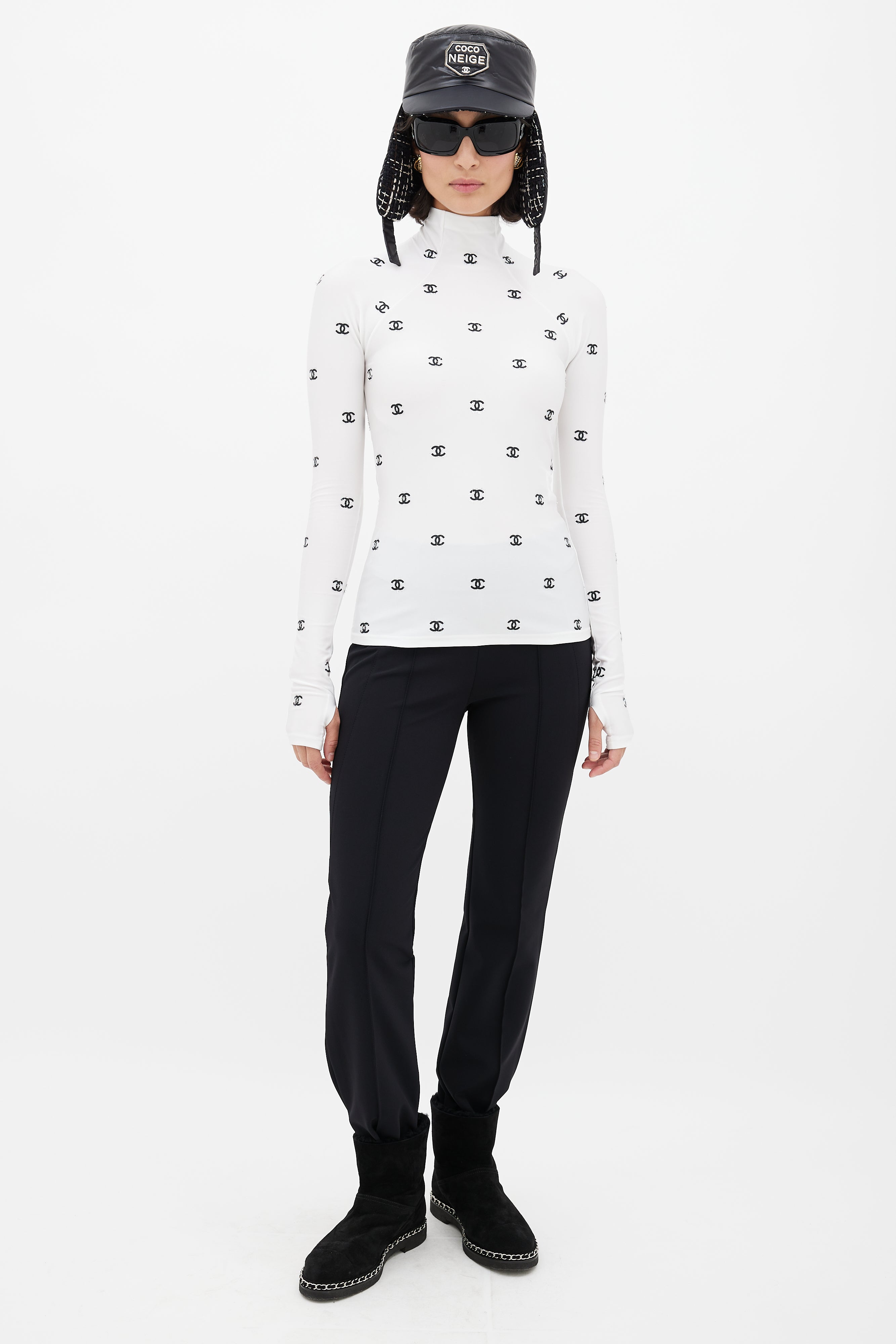 Pre-owned Fall 2021 Chanel white stretch top featuring long sleeves, turtleneck, black and silver CC embroidery throughout, concealed zip closure at back, and raglan shoulder.