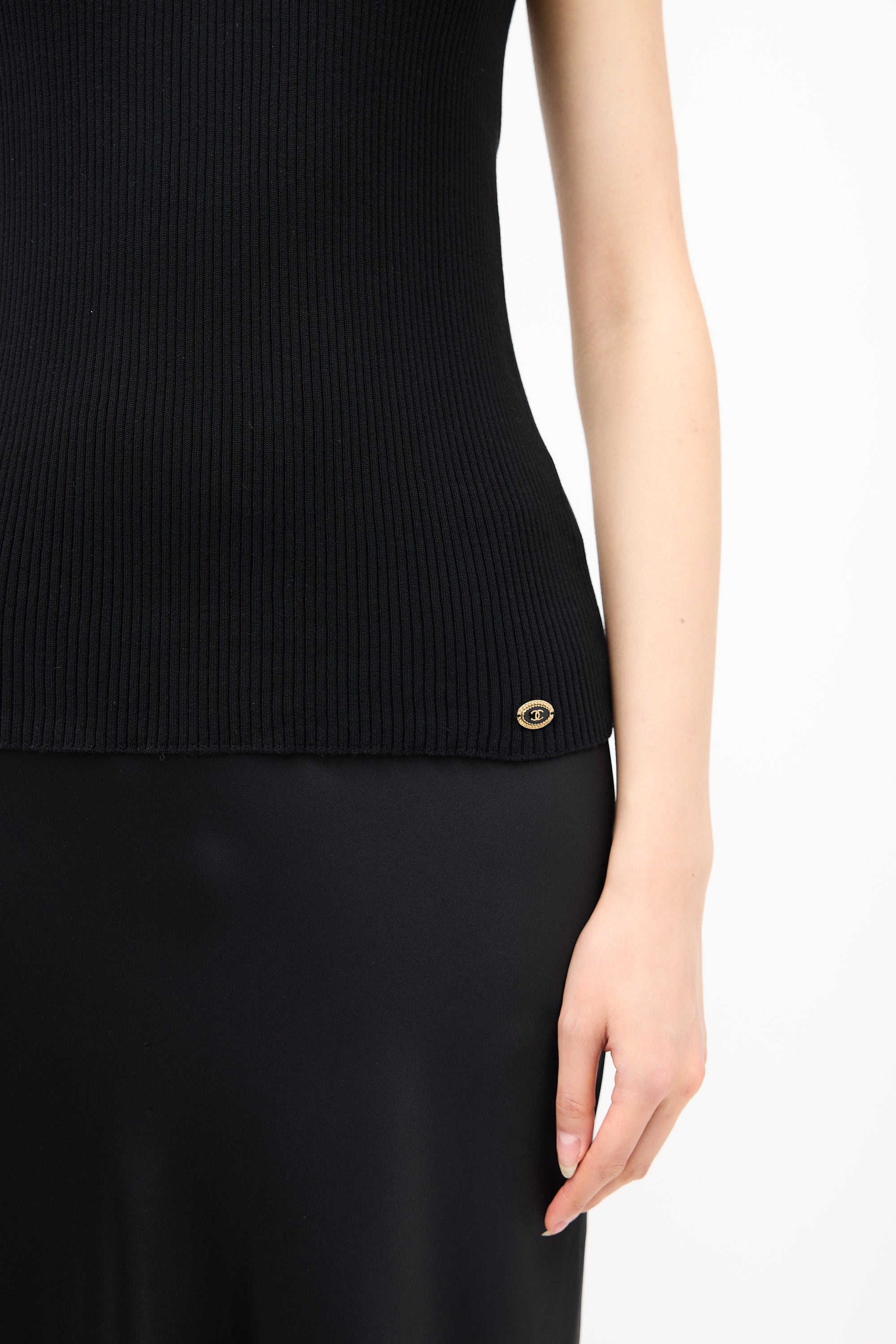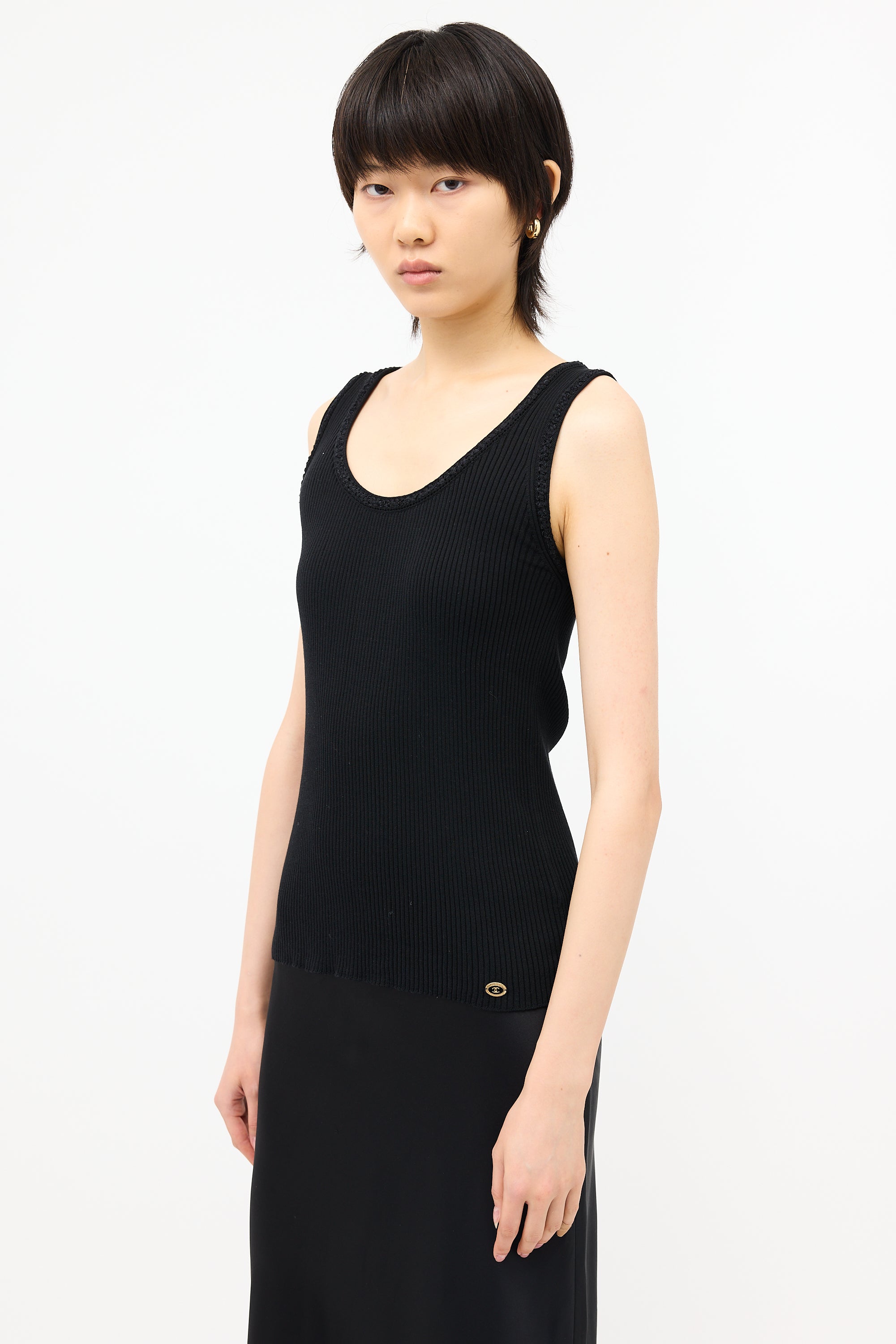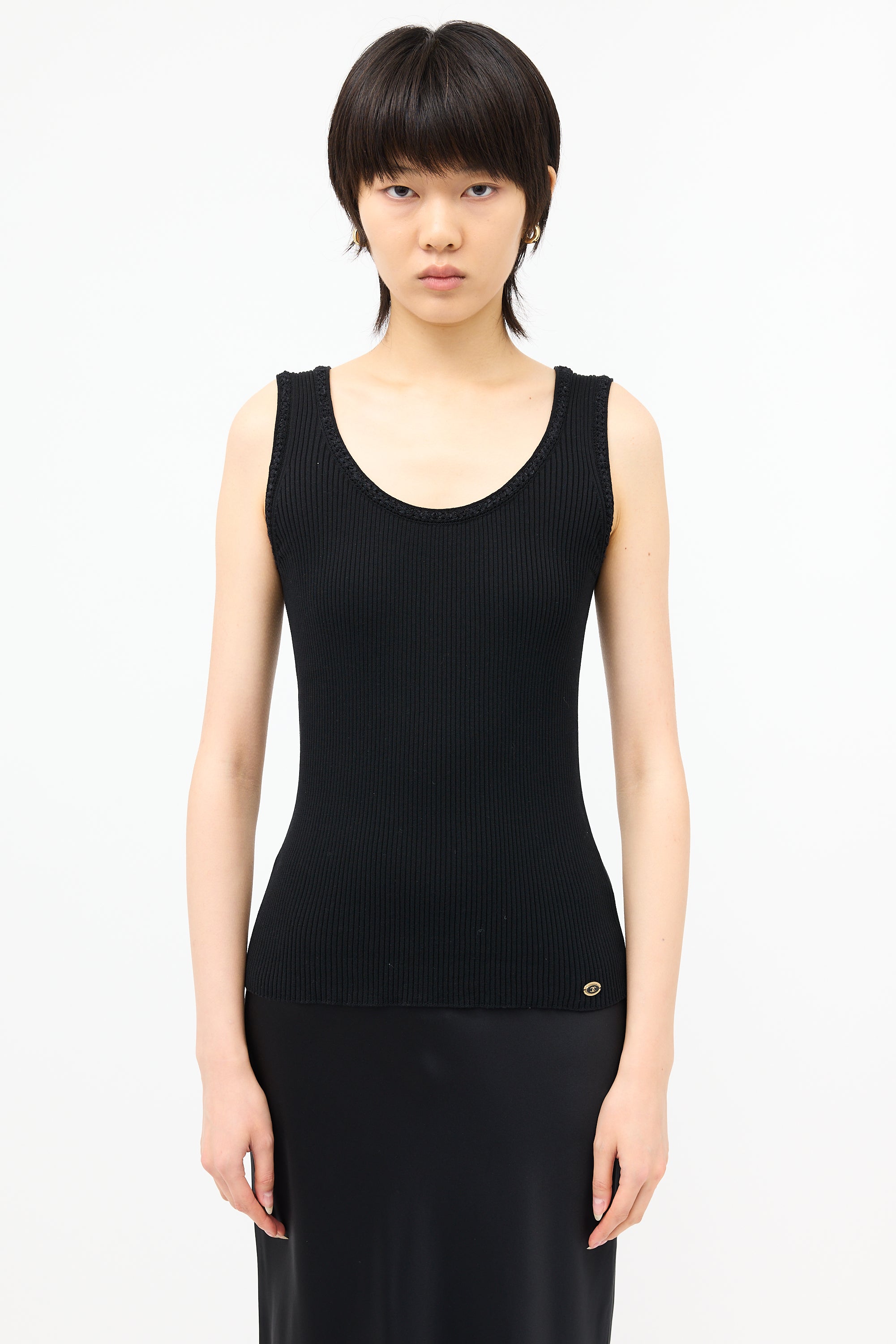 Pre-owned Chanel black rib knit tank top featuring round neckline, braided detail trim, and gold tone CC logo embellishment at hem.