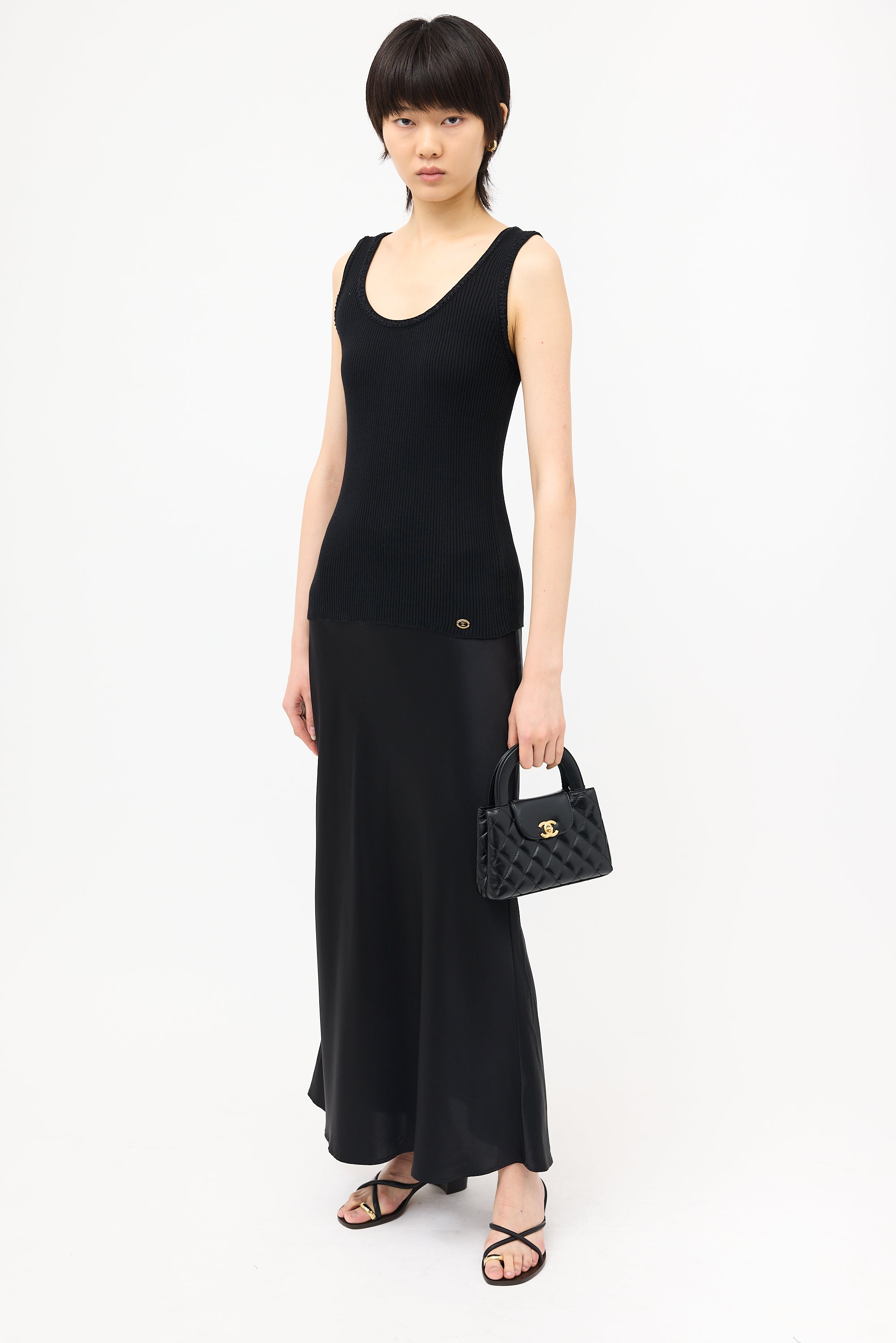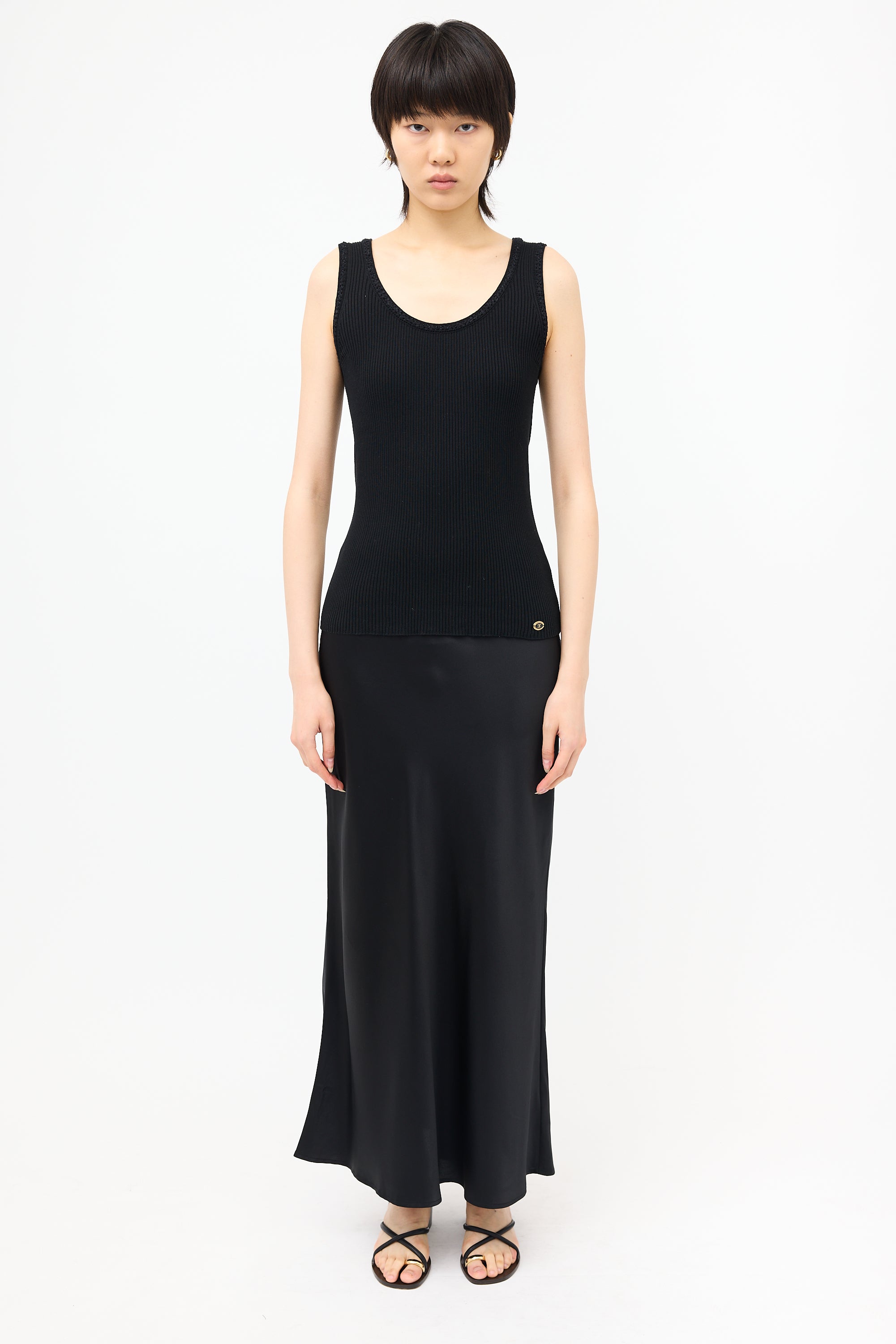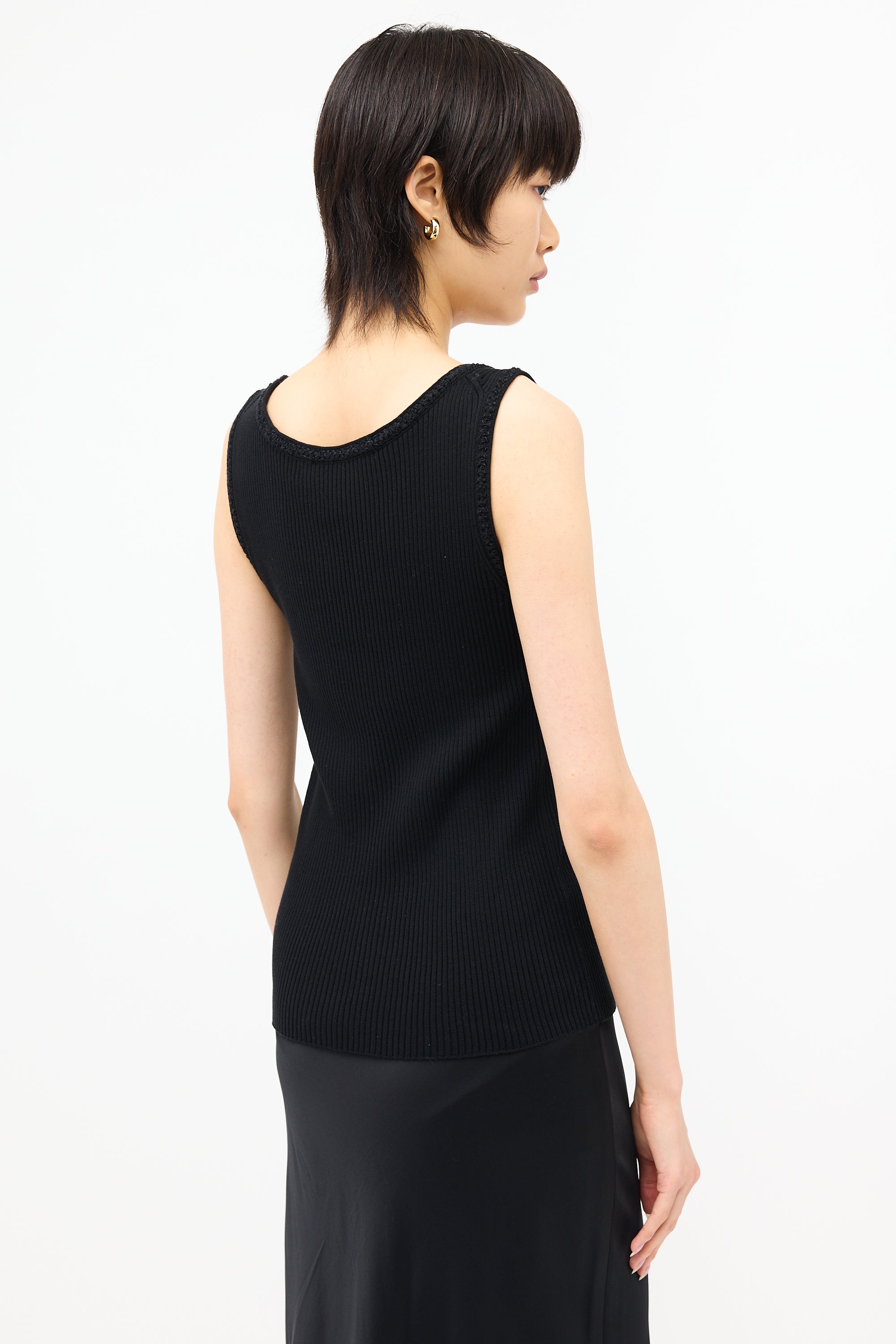 Pre-owned Chanel black rib knit tank top featuring round neckline, braided detail trim, and gold tone CC logo embellishment at hem.