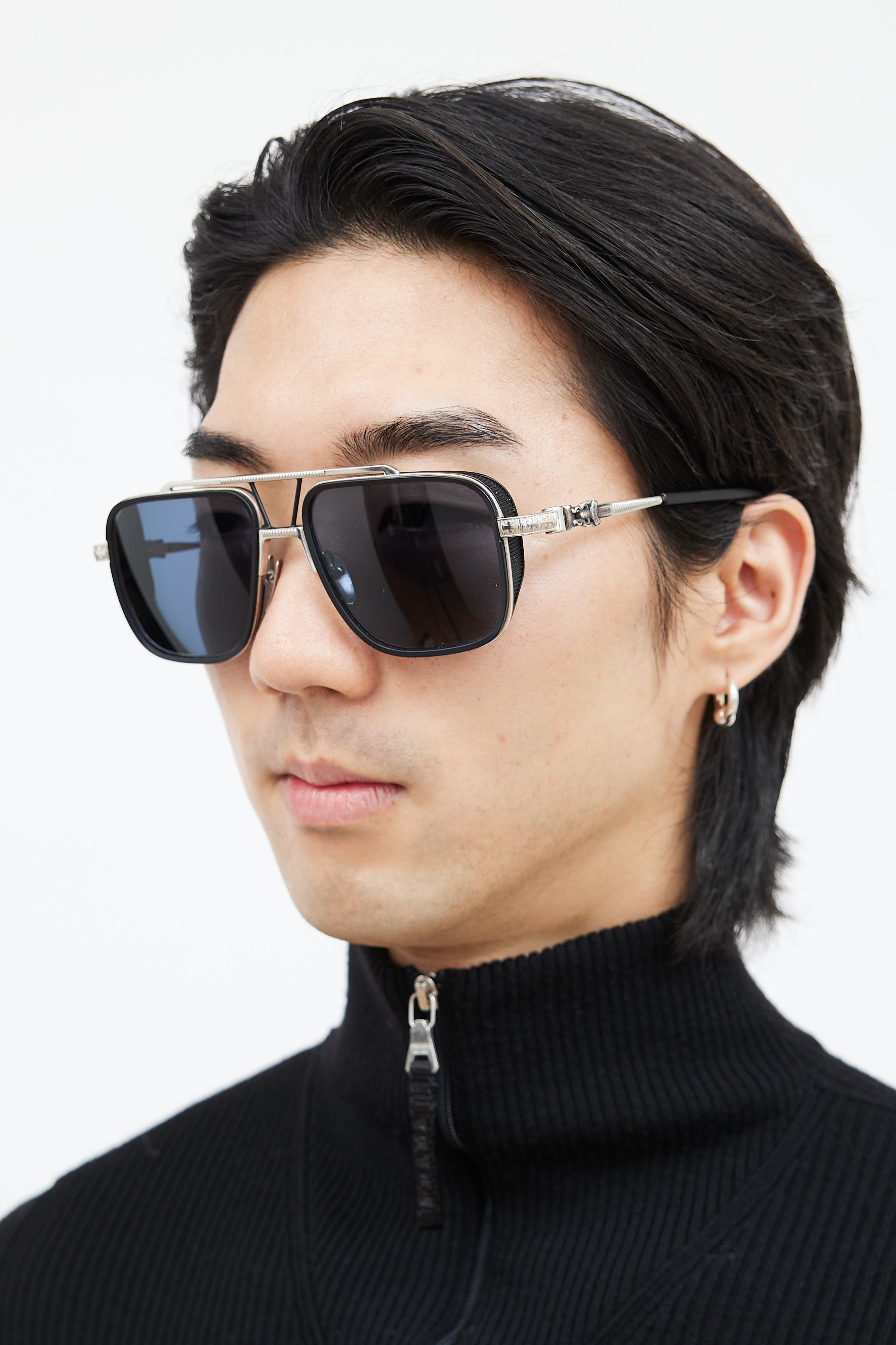 Pre-owned Chrome Hearts black and silver Pushin Rod II sunglasses featuring an aviator style frame, silver hardware throughout with logo at temples, and dark blue lenses. Comes with case. Lenses have prescription.