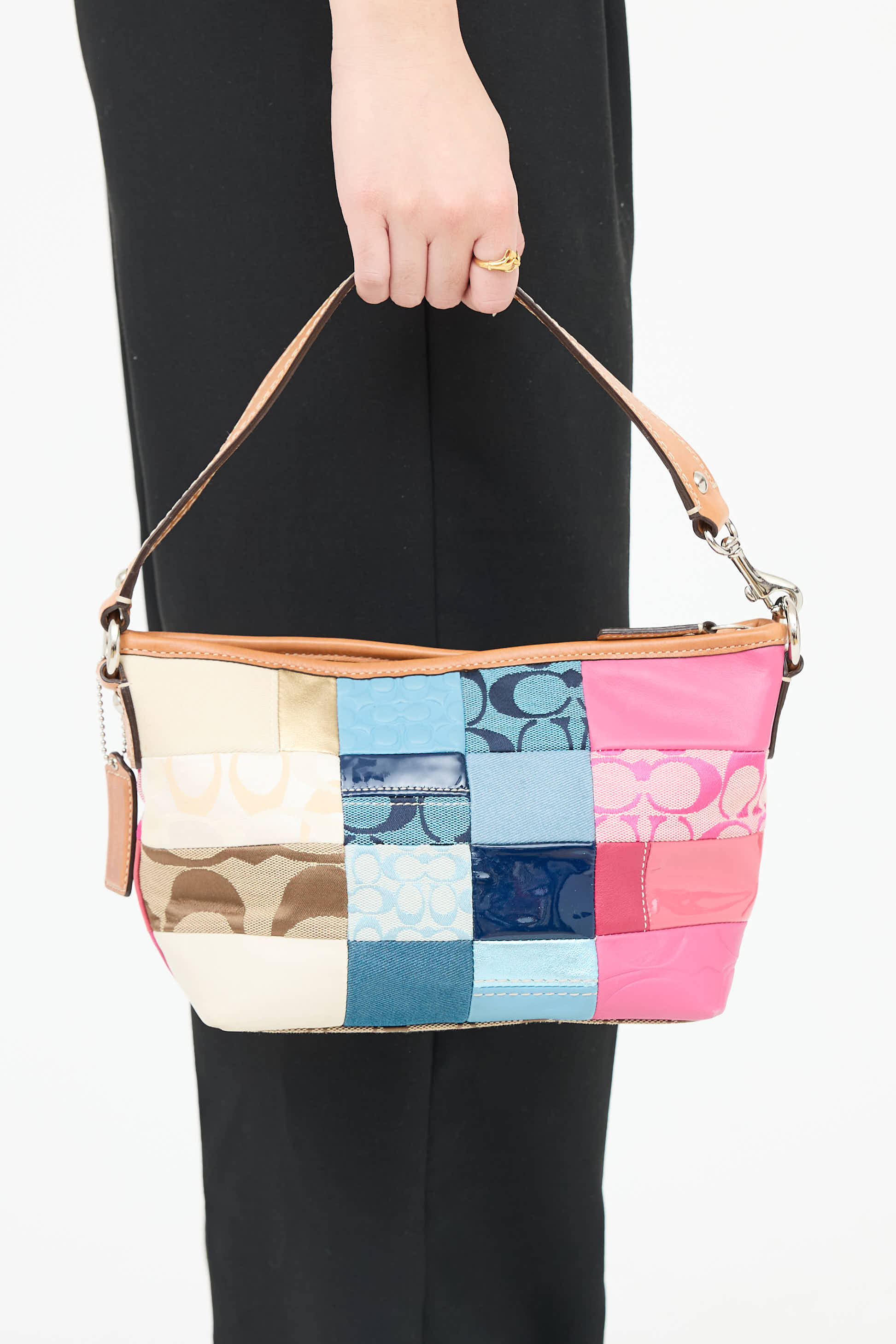 Pre-owned Coach brown and multicolor shoulder bag featuring flat shoulder strap with contrast stitching, patchwork body, silver tone hardware, top zip closure with one main compartment, and one interior slip pocket and zip pocket.