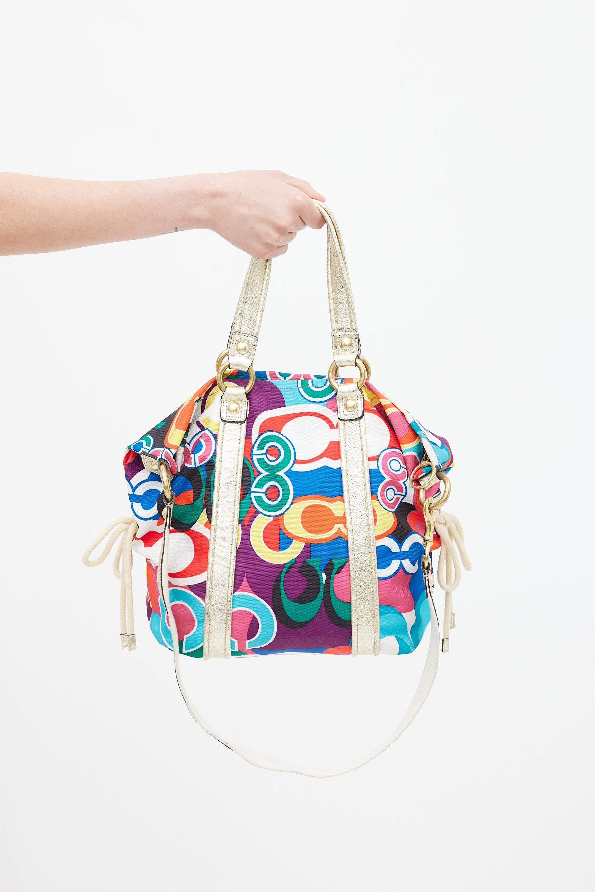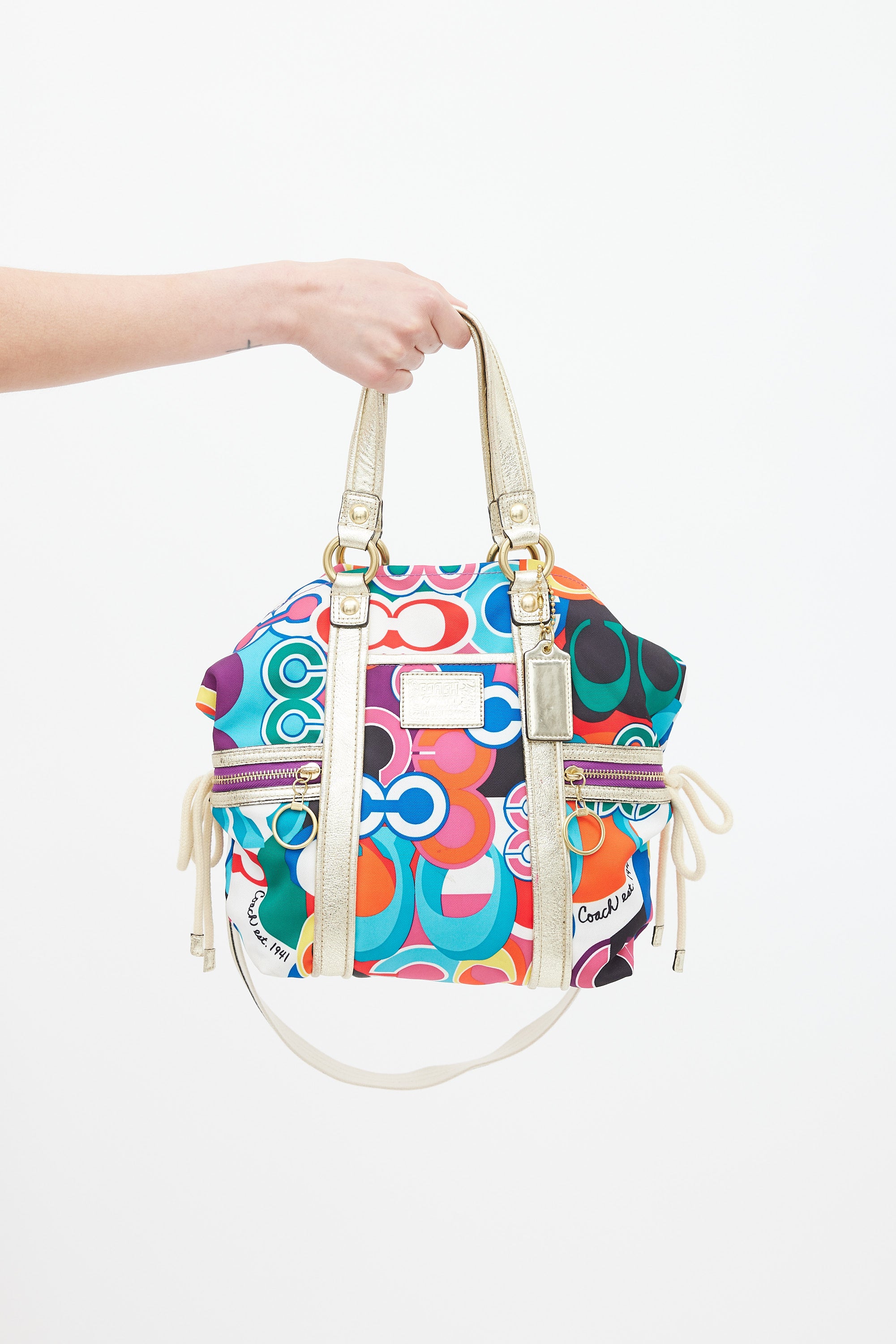 Pre-owned Coach red and multicolour Poppy C Spotlight tote bag featuring C motif print throughout body, gold tone hardware, textured silver tone shiny leather trim and handles, canvas shoulder strap with leather trim, debossed logo patch at front, one front slip pocket, two front zip pockets, side tie detail, top zip closure, one lined main compartment with one zip pocket and two slip pockets, and detachable patent leather logo charm.