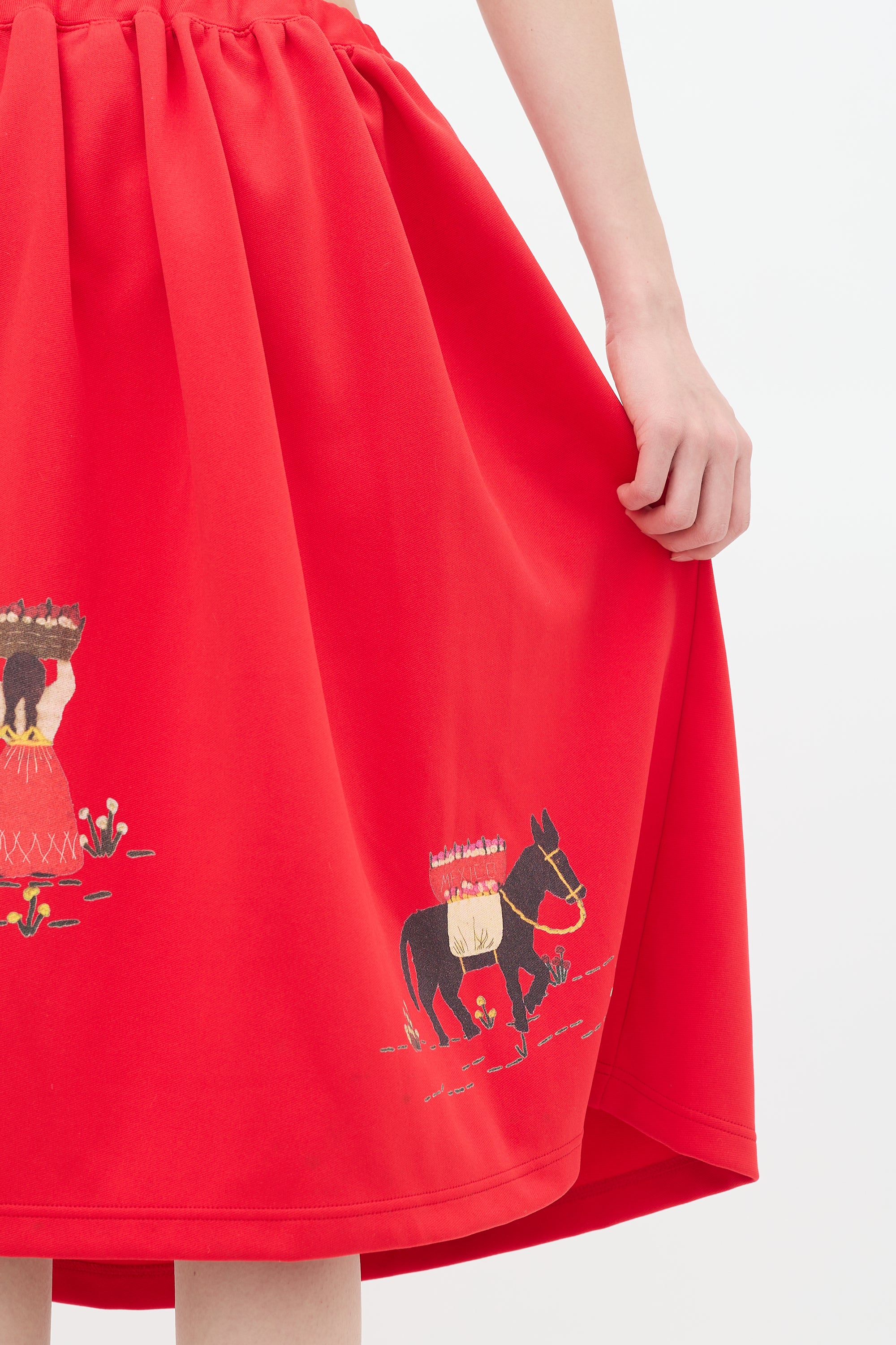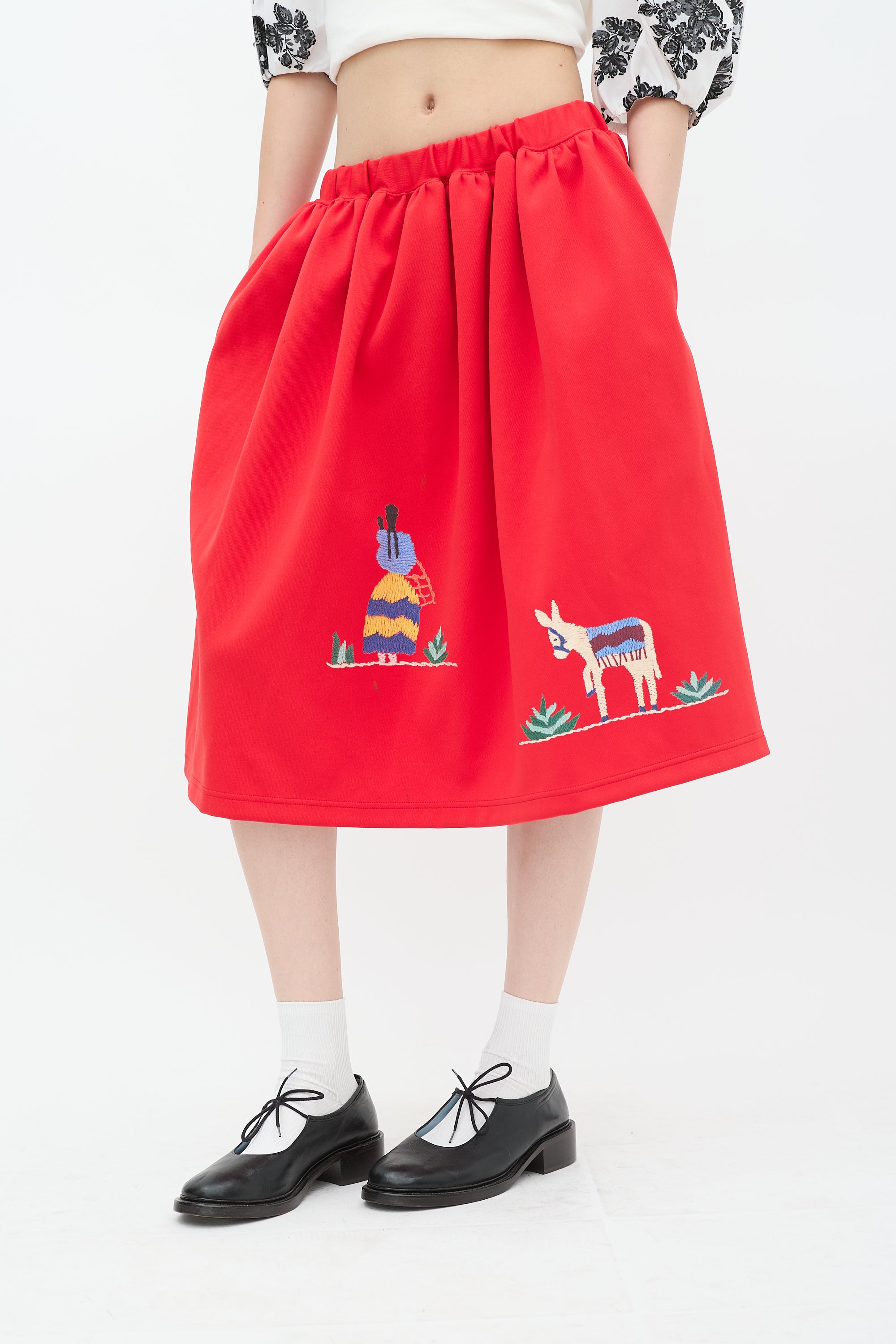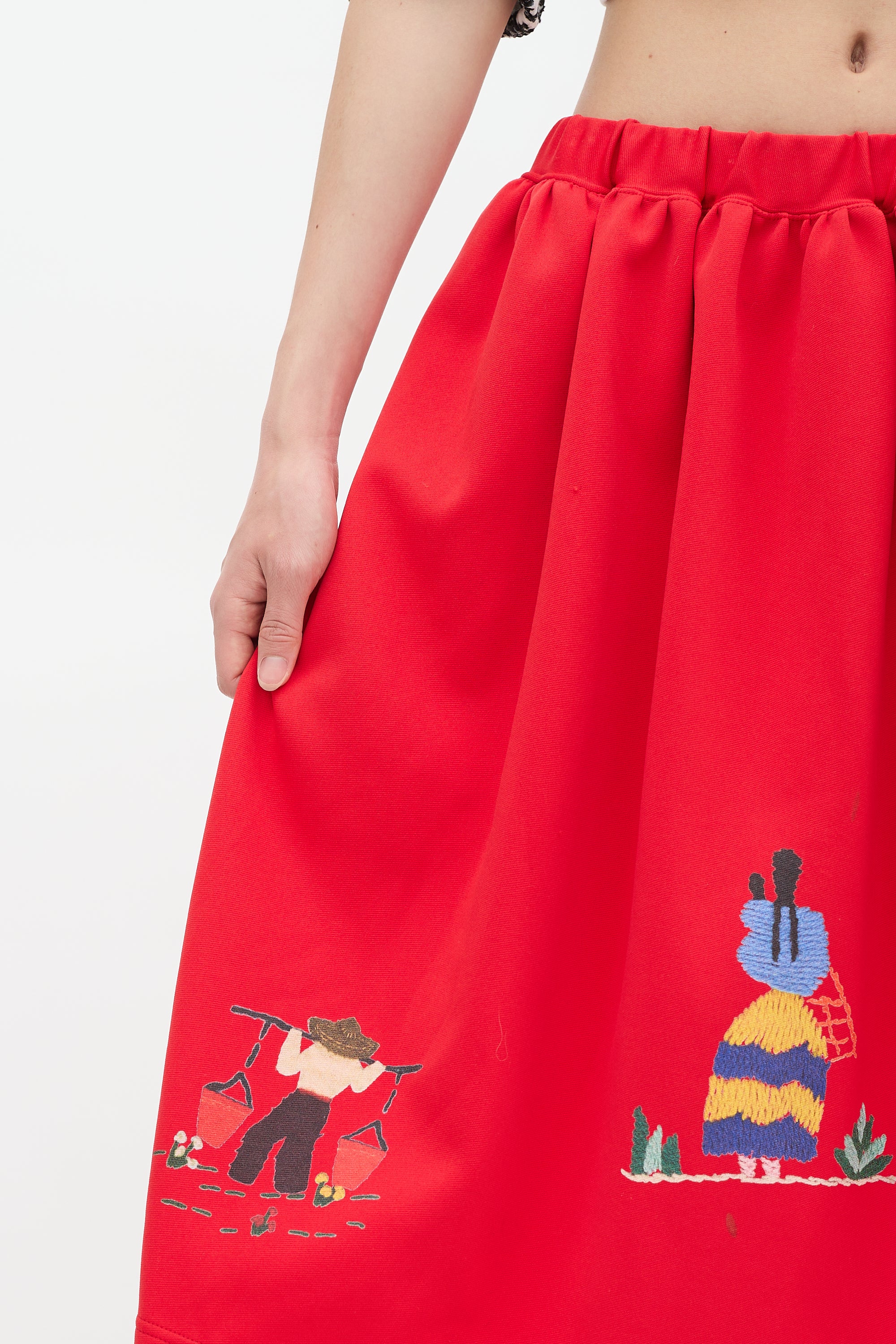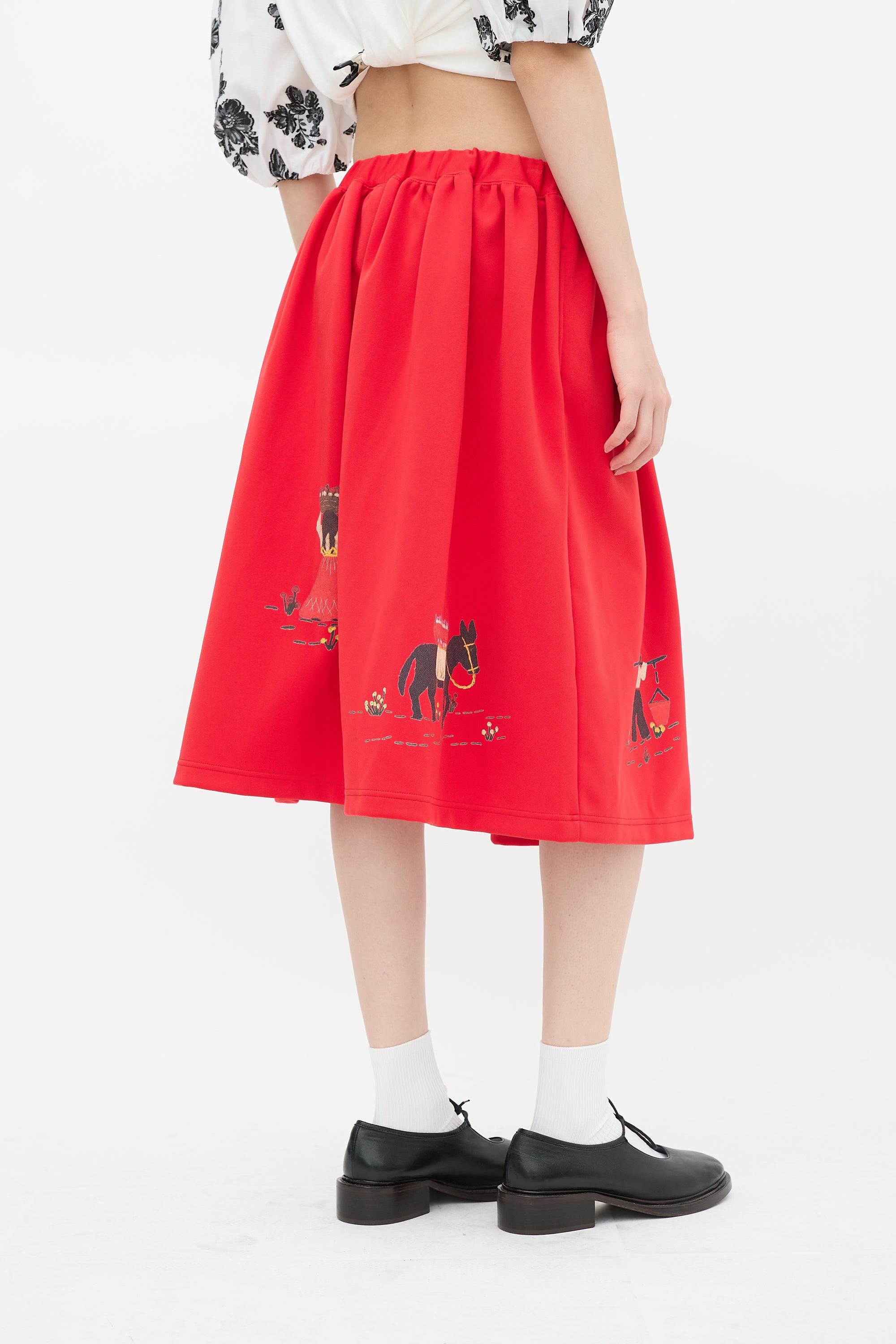Pre-owned Comme des Garçons Girl Fall/Winter 2021 red midi skirt featuring an elasticized waist with interior drawstring, in seam pockets, A-line cut, and printed figure and animal motif graphics throughout lower.
