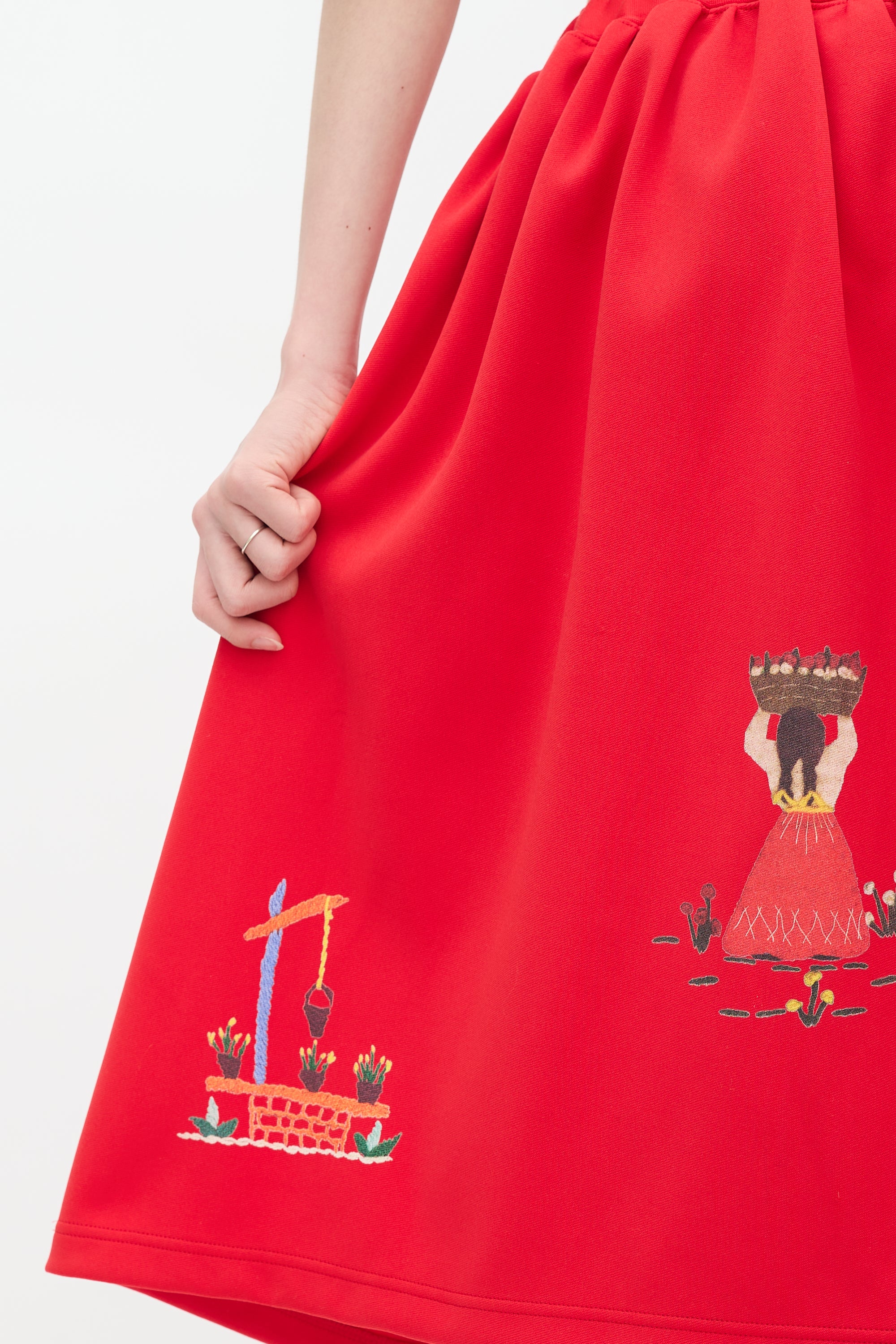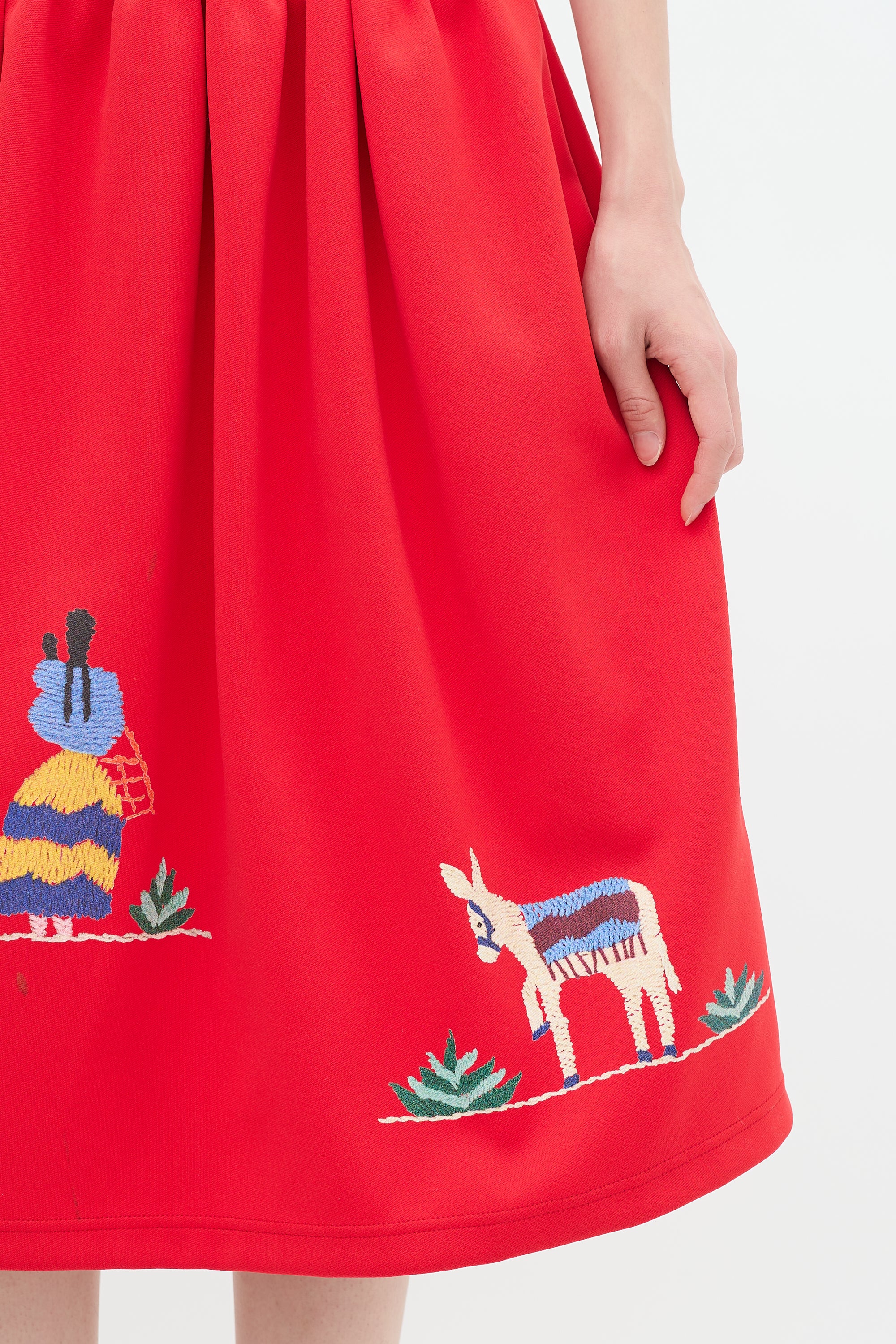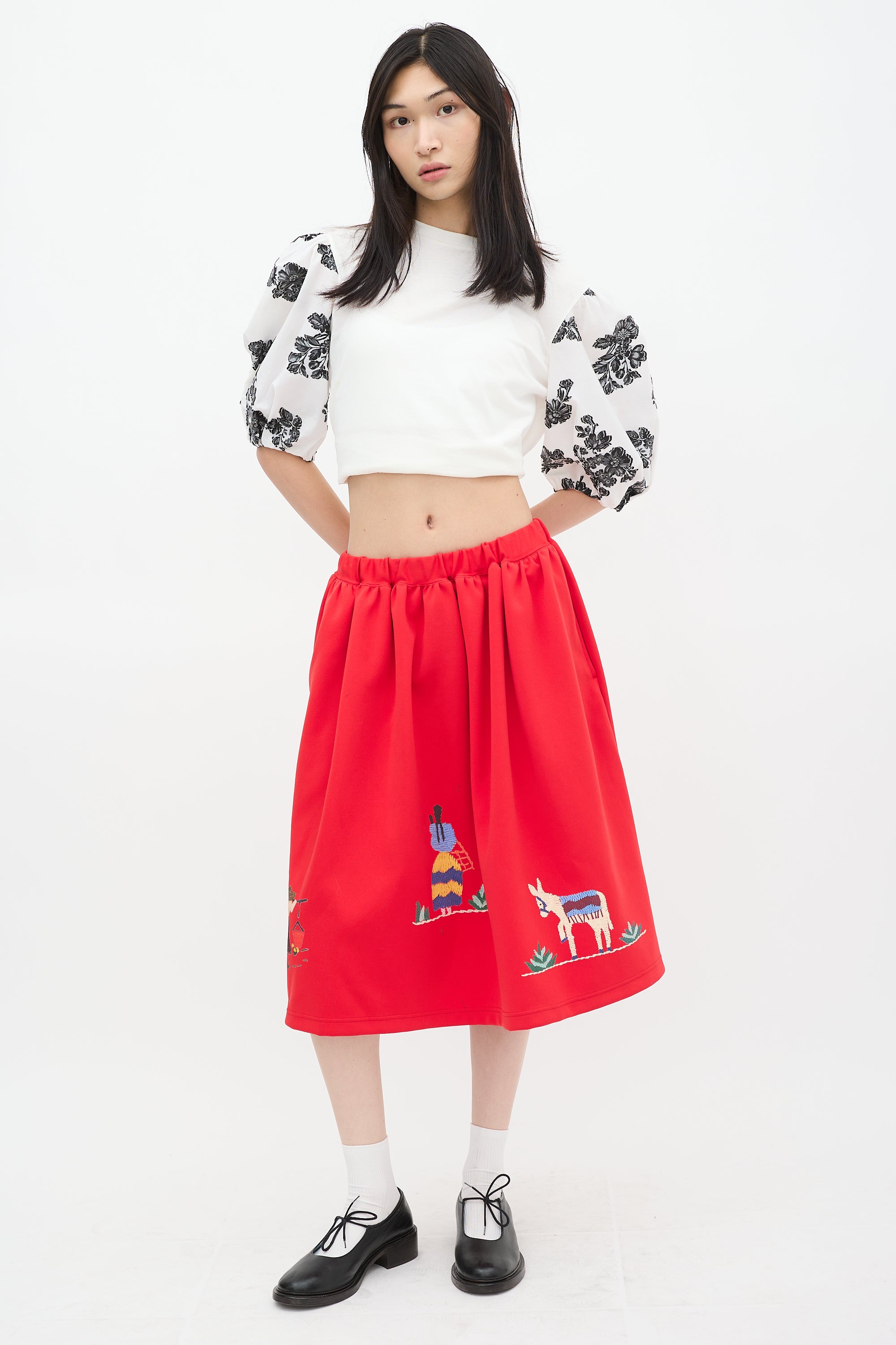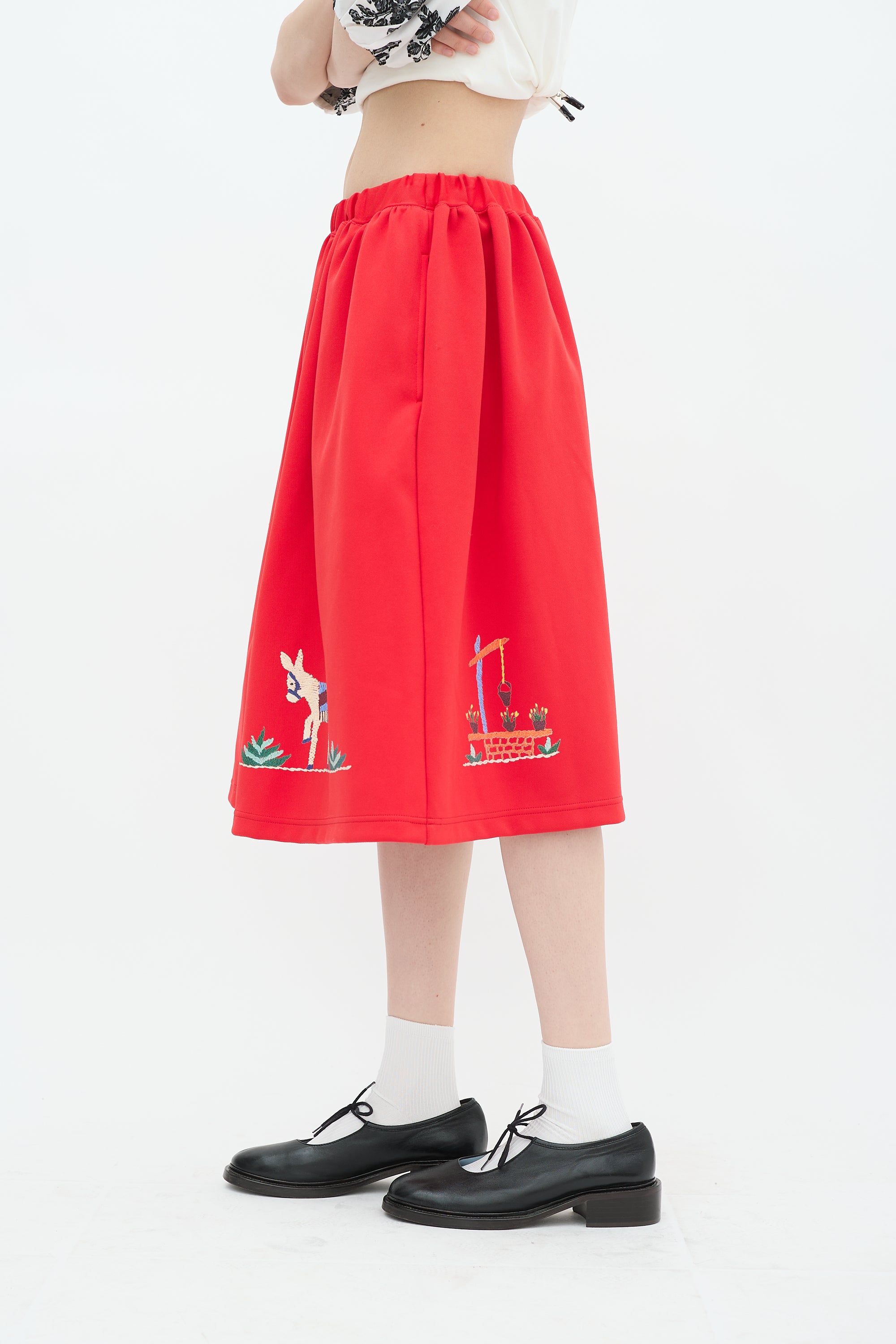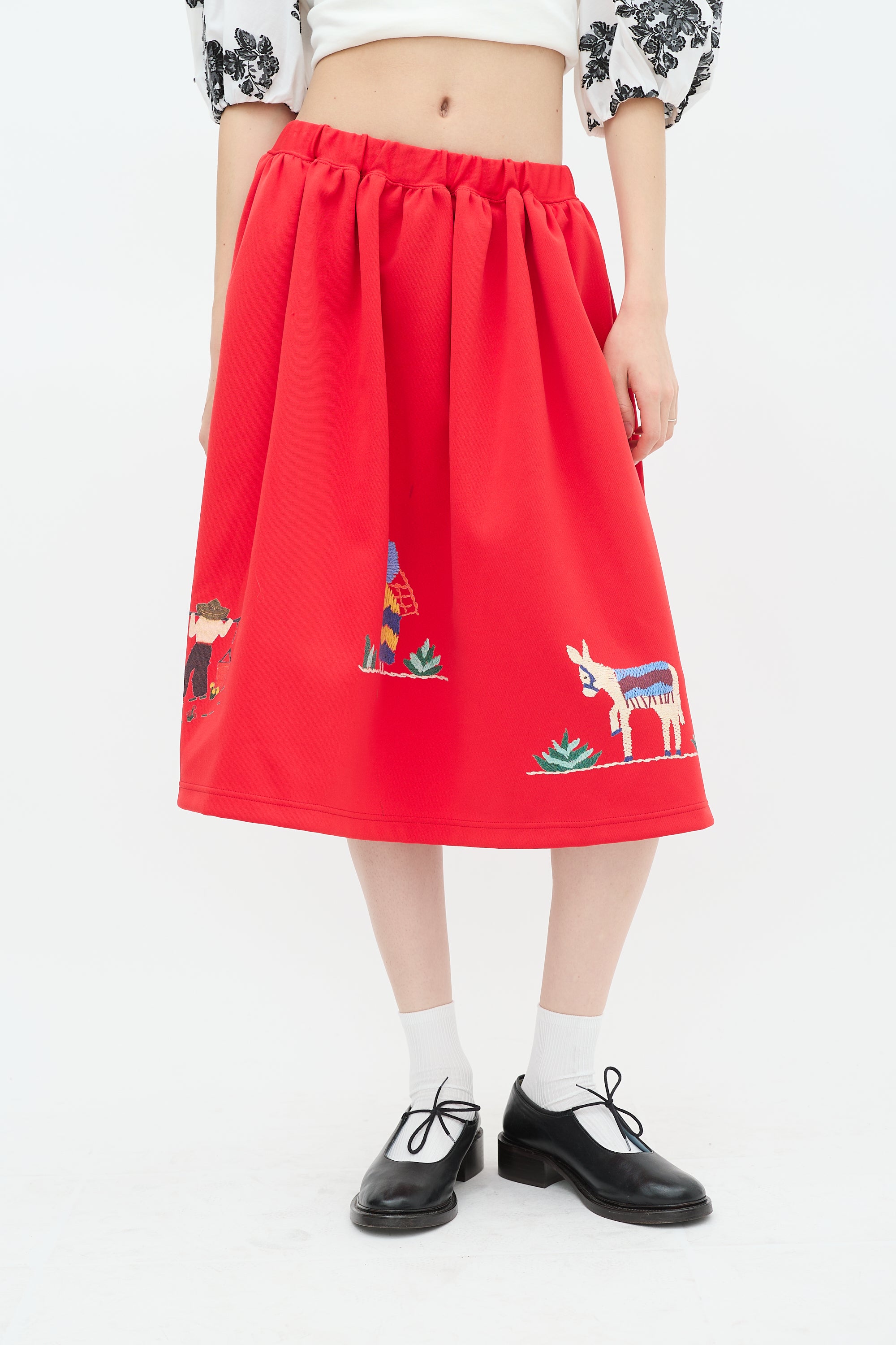 Pre-owned Comme des Garçons Girl Fall/Winter 2021 red midi skirt featuring an elasticized waist with interior drawstring, in seam pockets, A-line cut, and printed figure and animal motif graphics throughout lower.