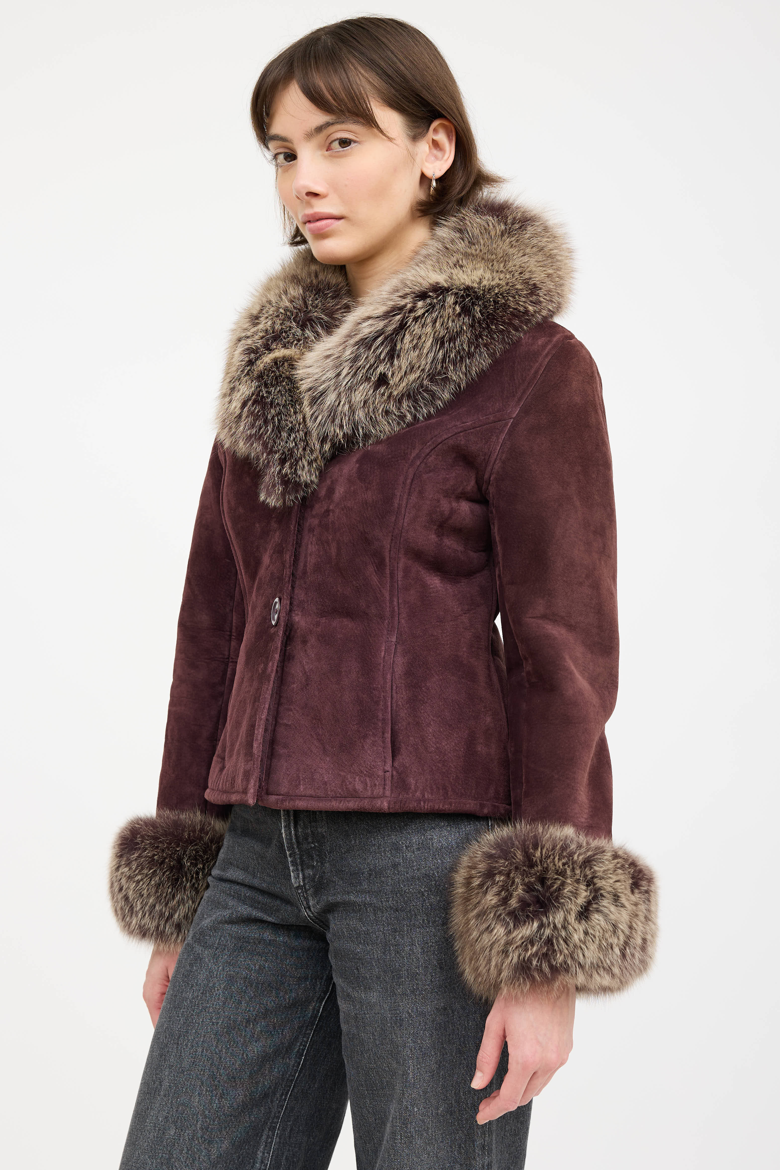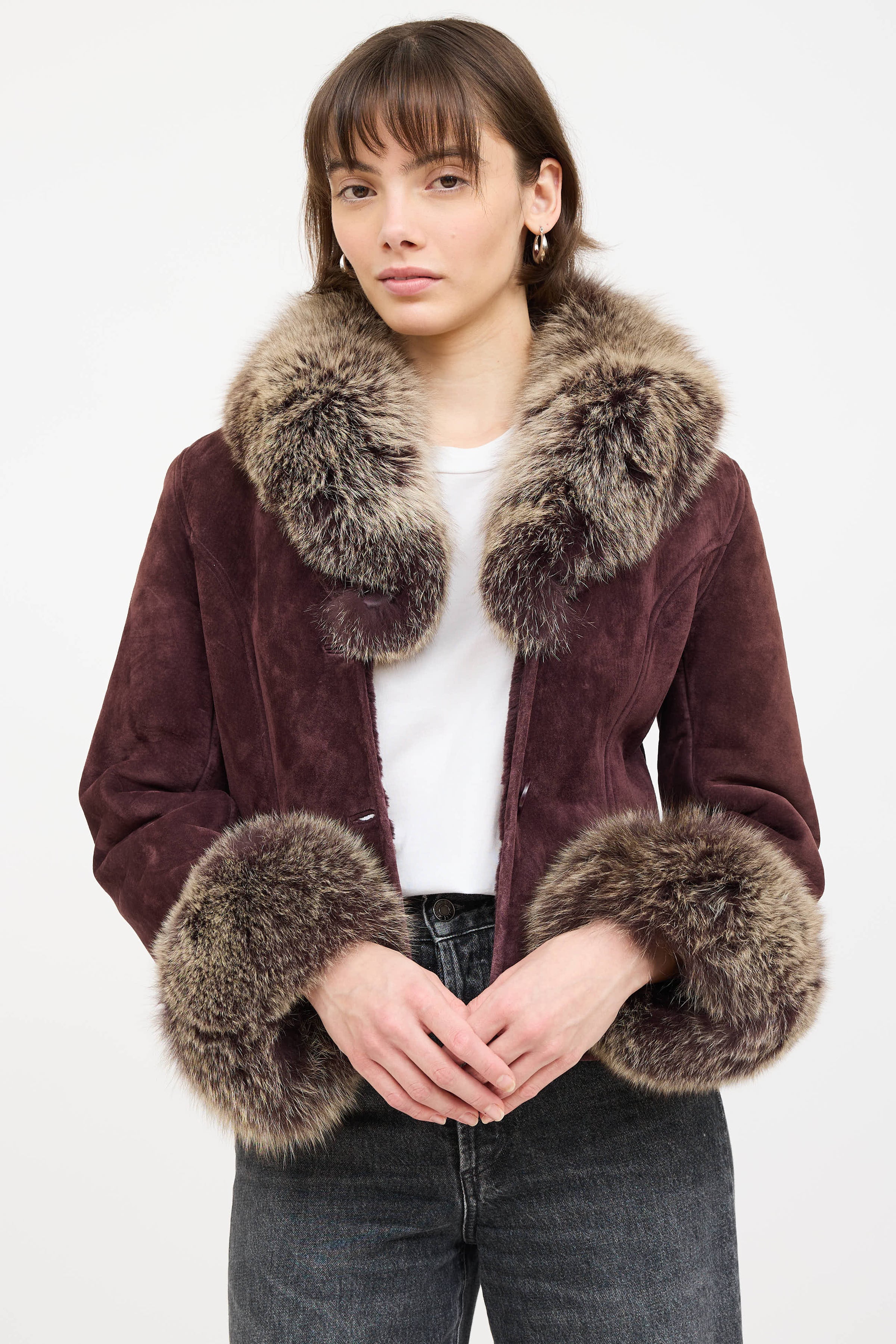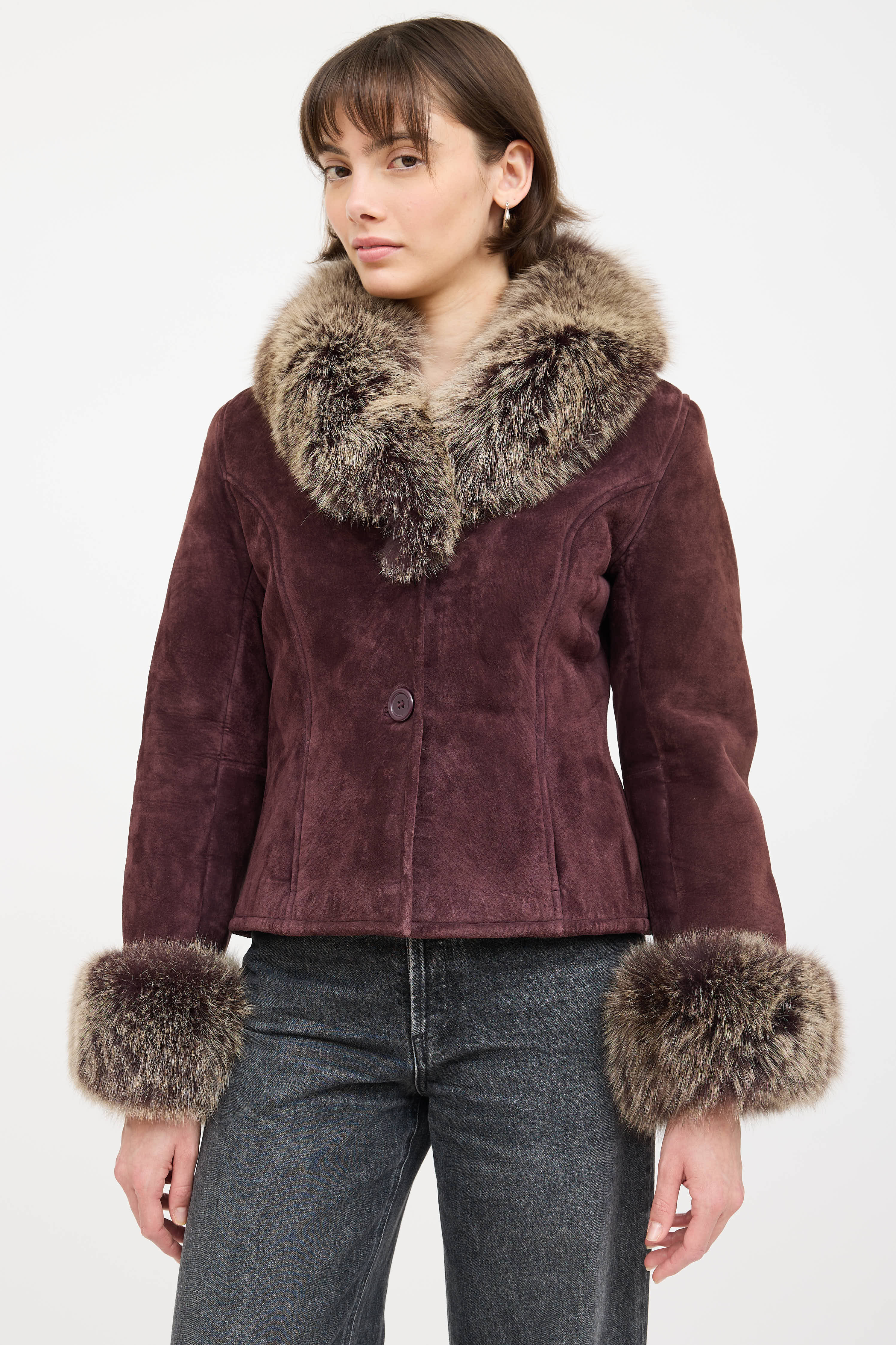 Pre-owned Danier burgundy suede jacket featuring shawl collar with removable brown fox fur trim, long sleeves, two slip pockets at hip, and button up closure. Lined.