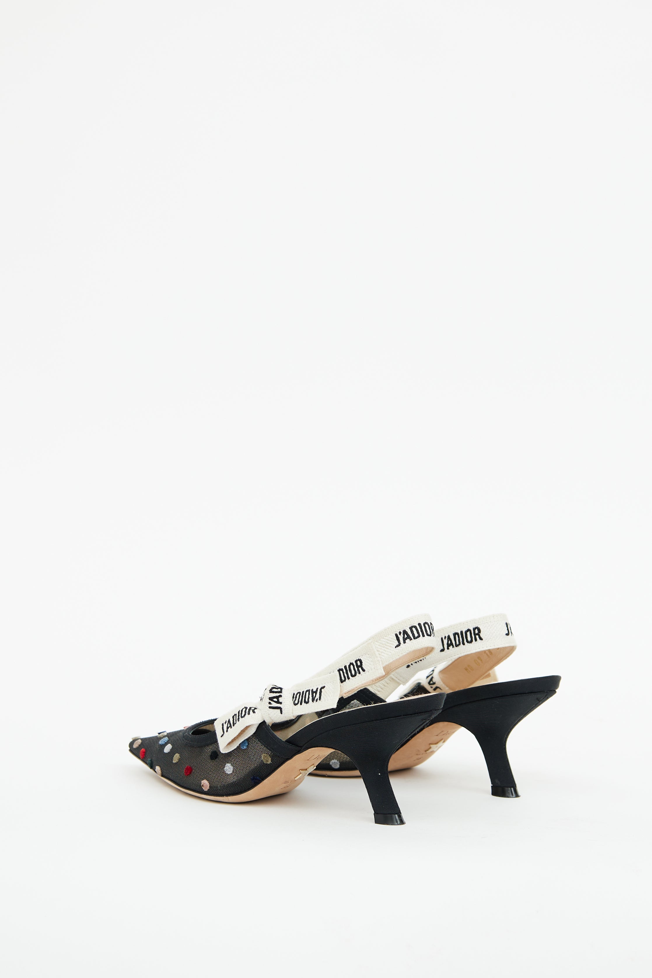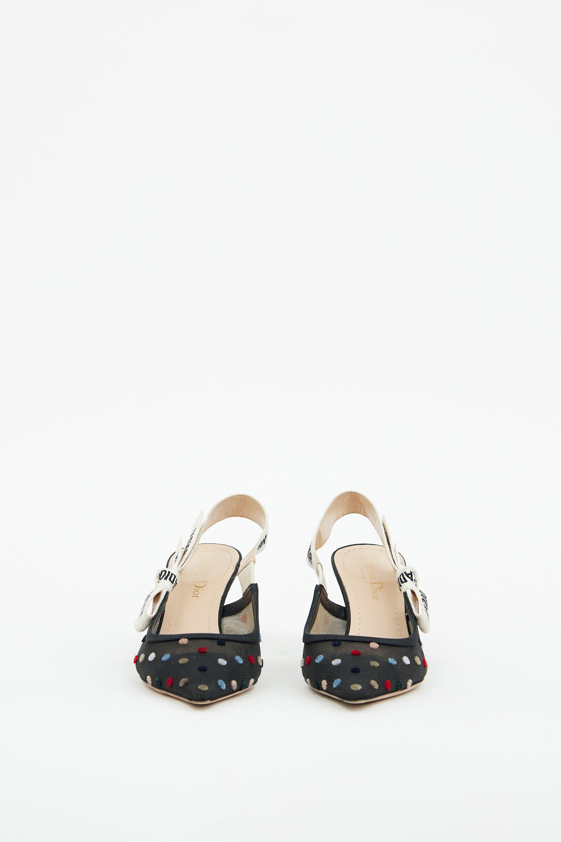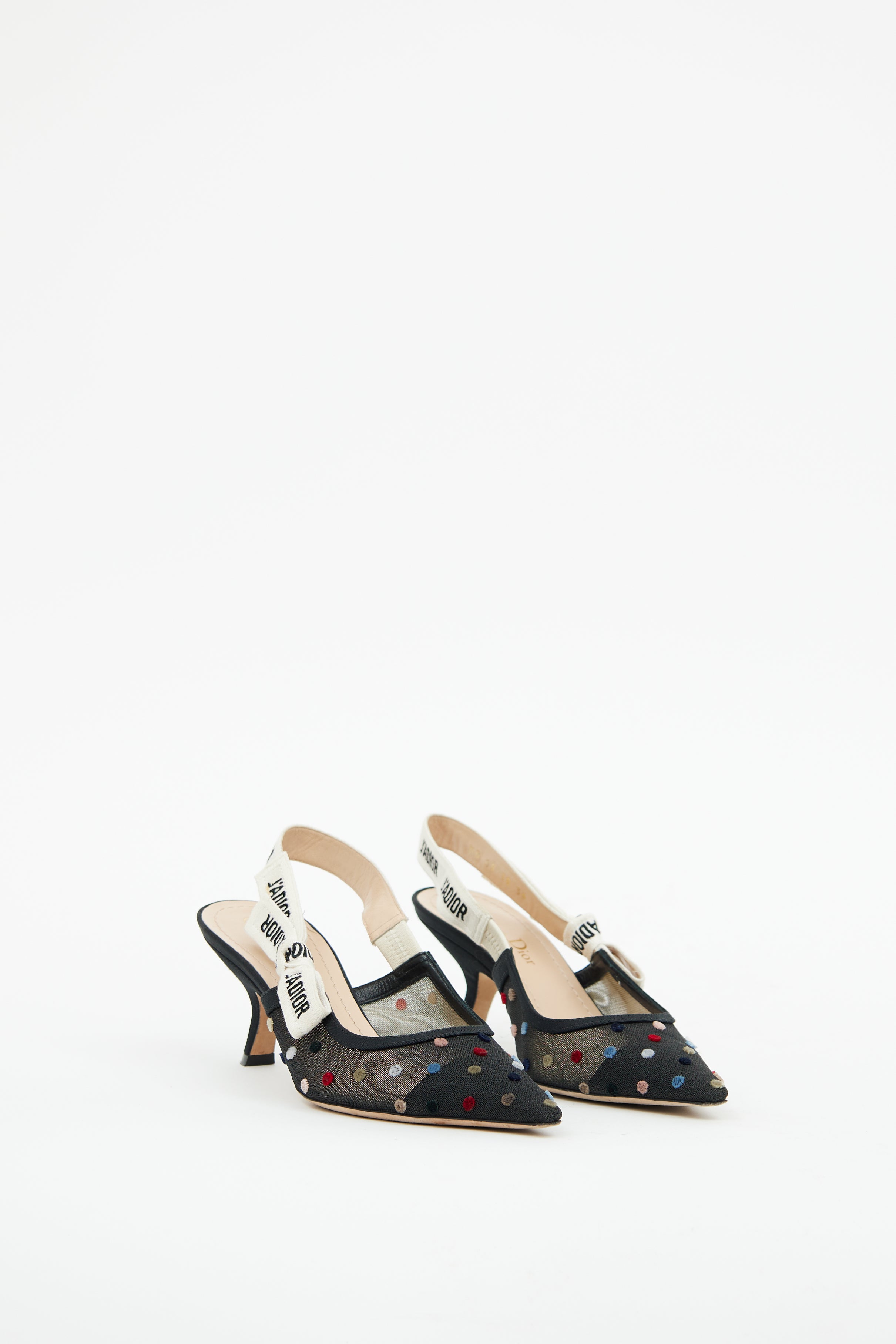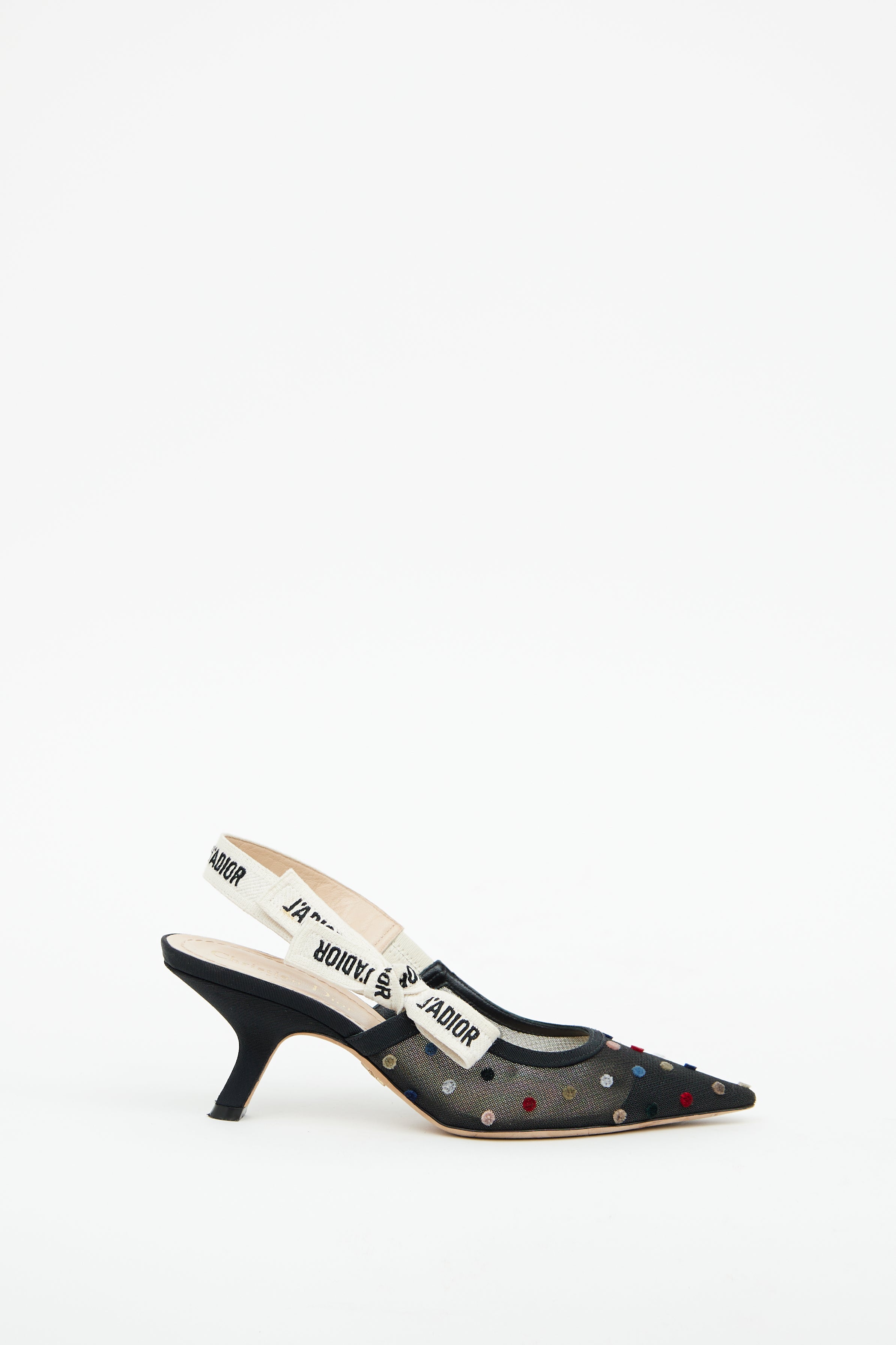 Pre-owned Dior slingback heel featuring pointed toe, navy sheer mesh uppers, grosgrain elasticated ankle strap with printed 'J'Adior' text logo, kitten heel and multicolour embroidered mesh dots throughout.