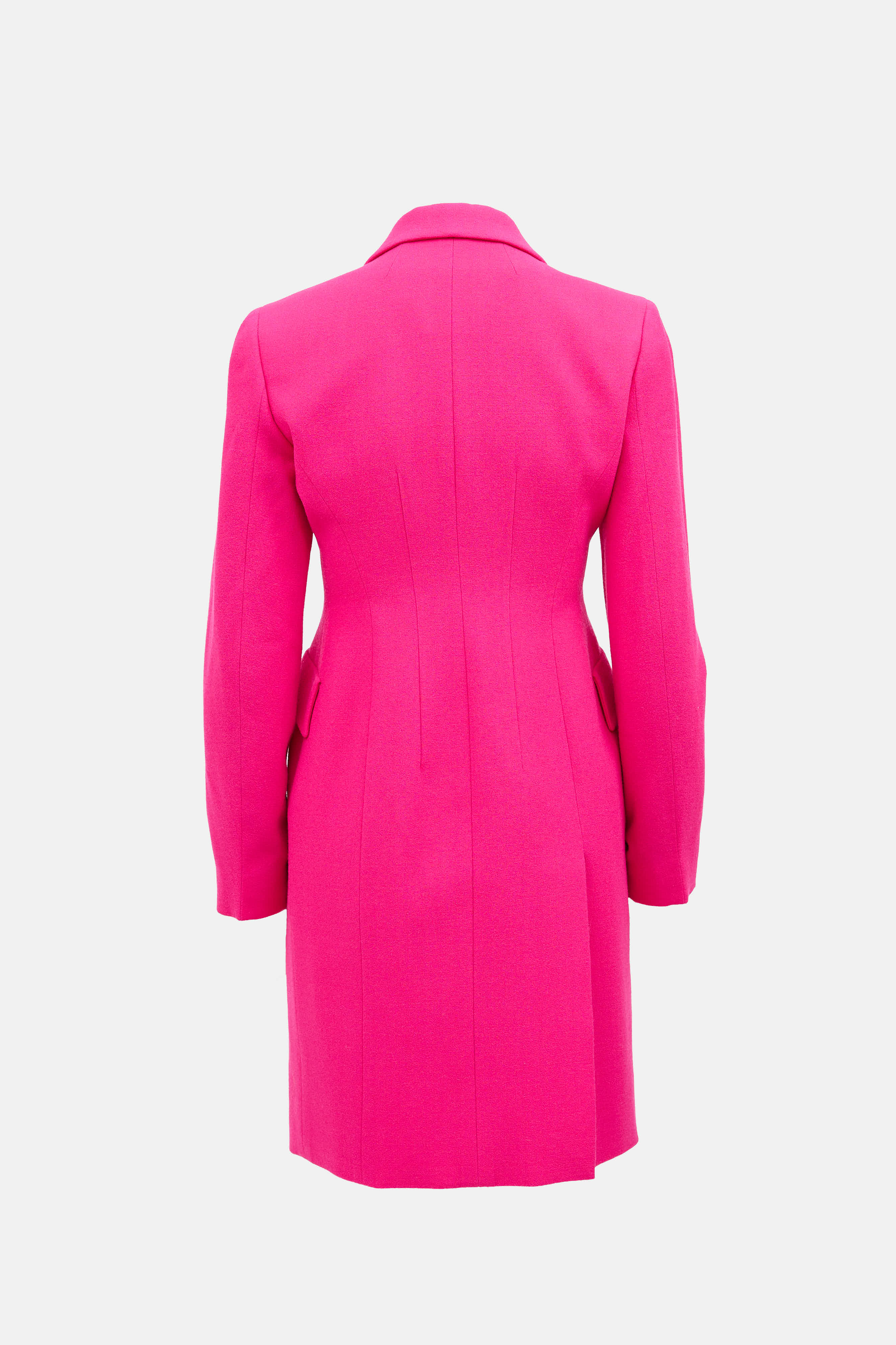Pre-owned Dior pink wool structured coat featuring notched lapel collar, decorative welt pocket and flaps at front, singular button front, slit pockets at side, and slits at hemline. Lined.