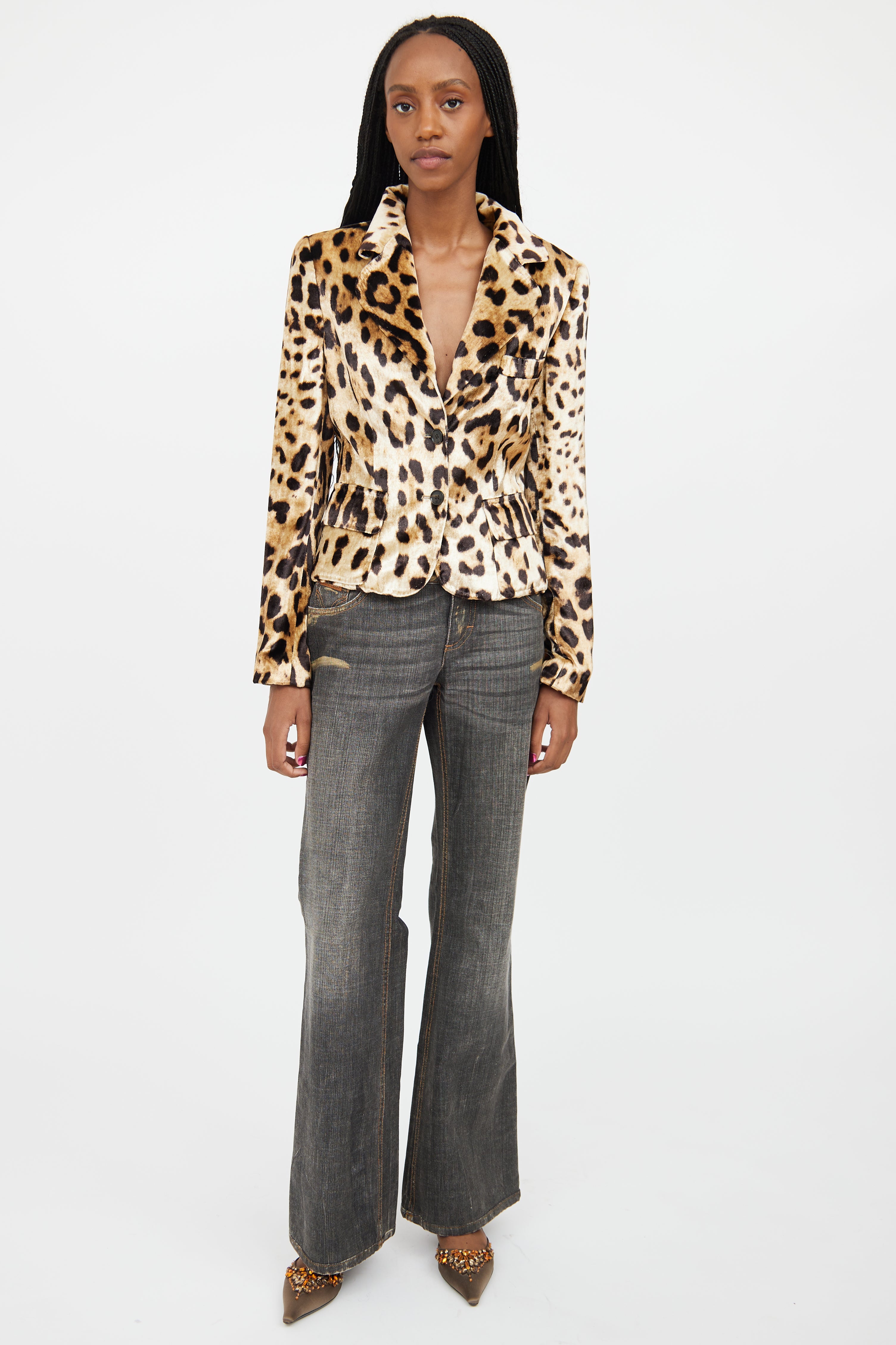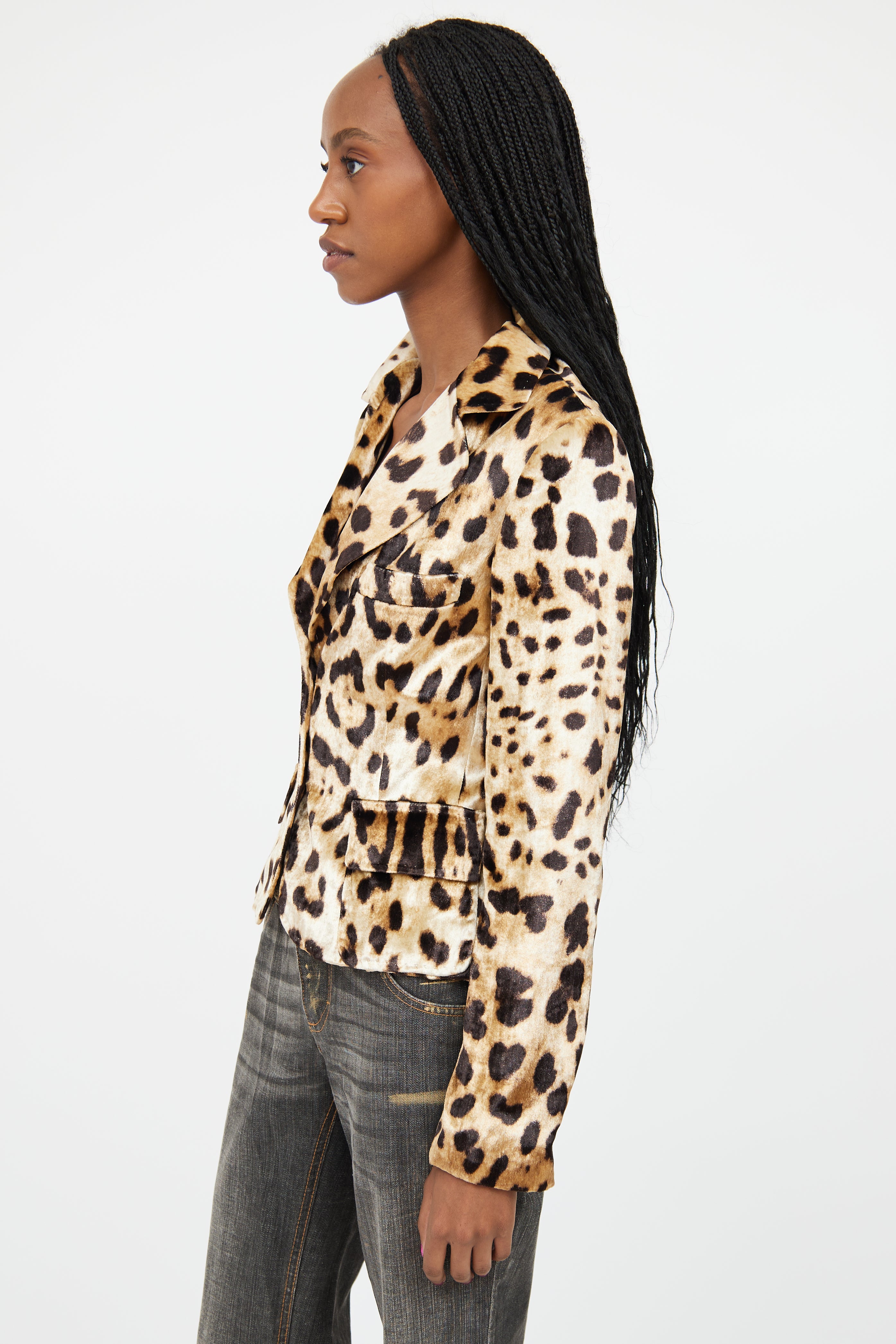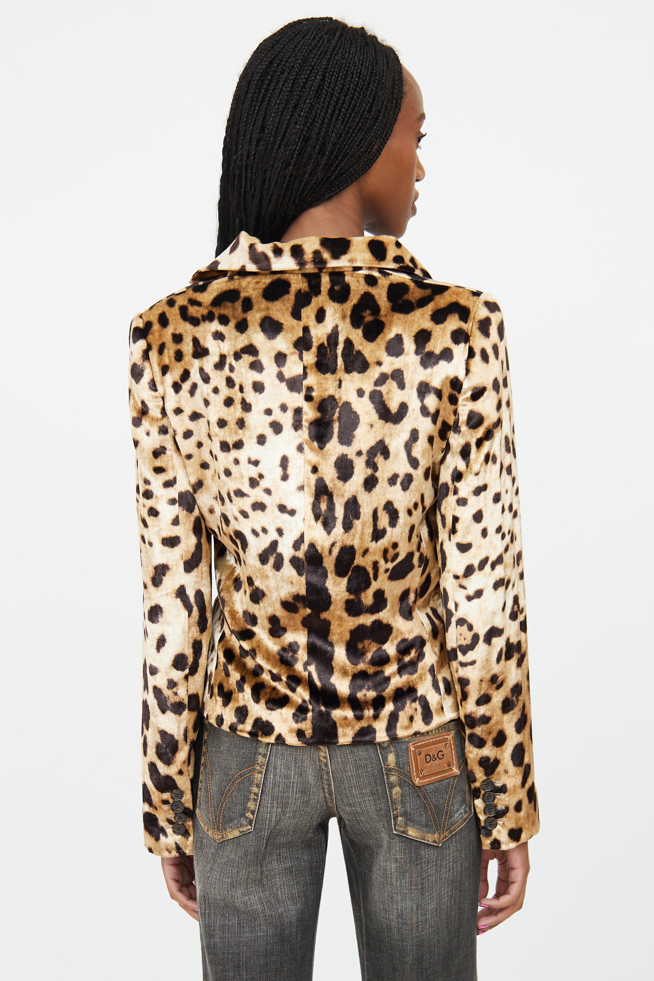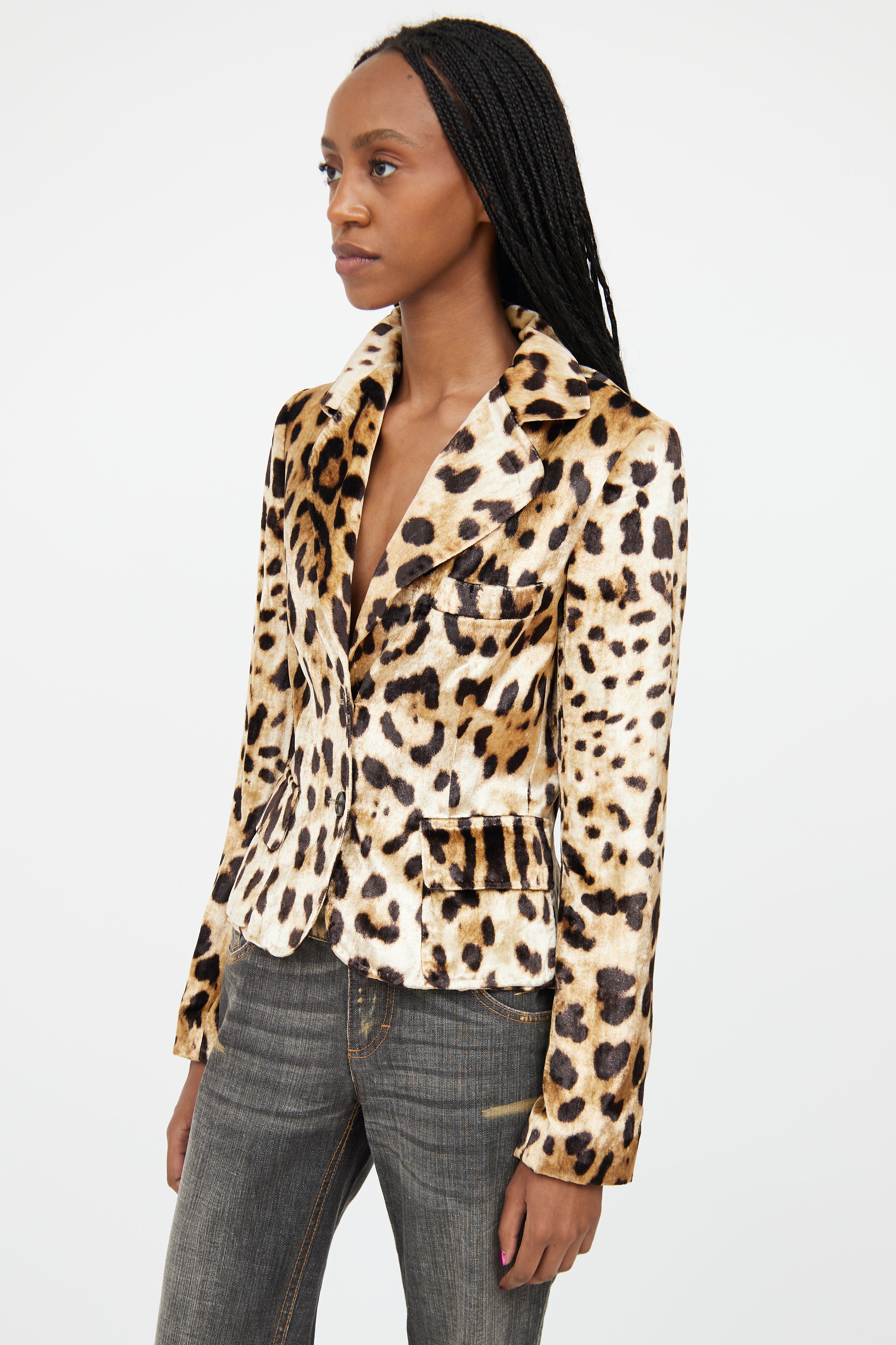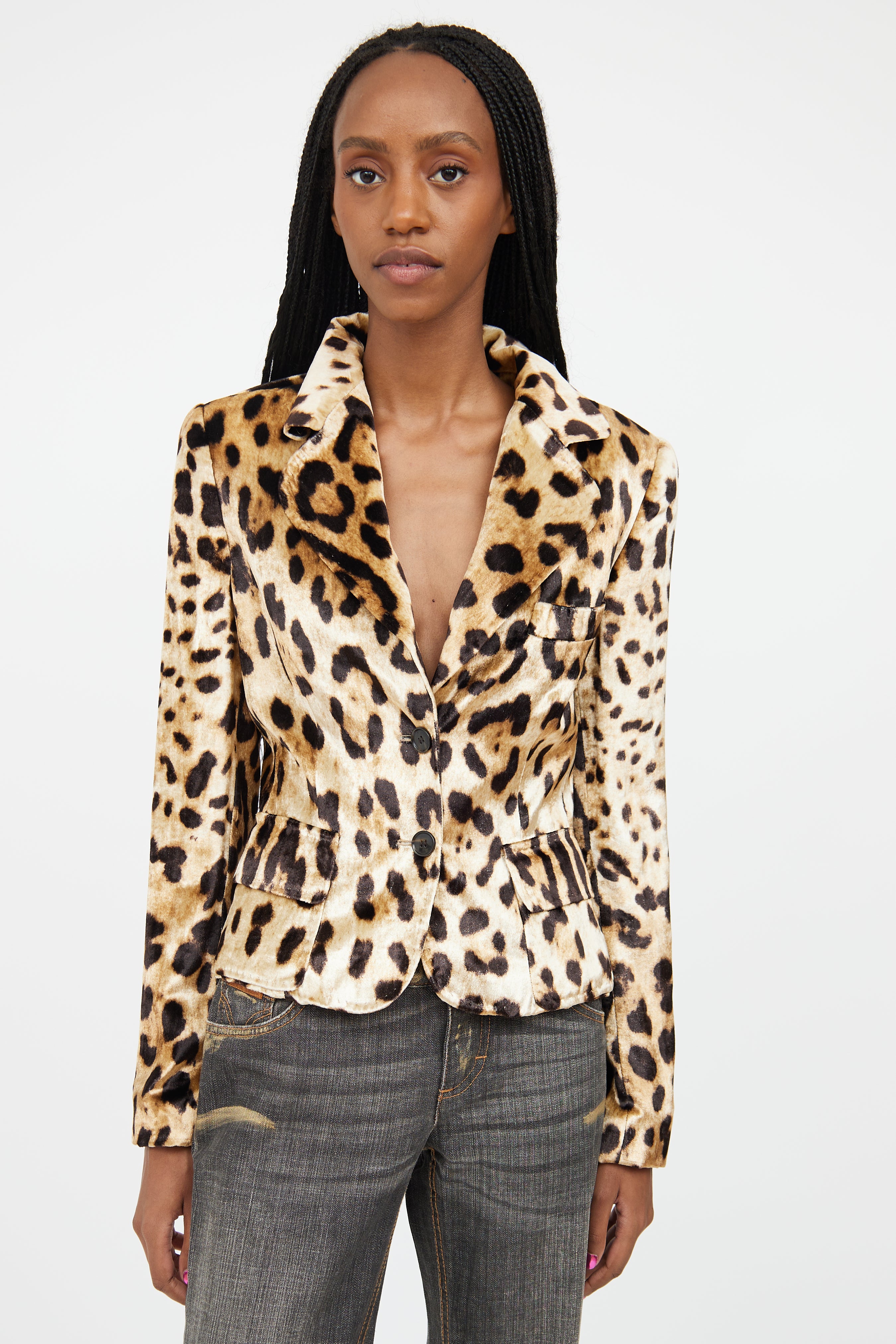 Pre-owned Dolce & Gabbana beige velour blazer featuring a tonal leopard pattern throughout, notched lapel, long sleeves with buttoned cuffs, one welt pocket at chest, two flap pockets at hip, and button up closure. Lined.