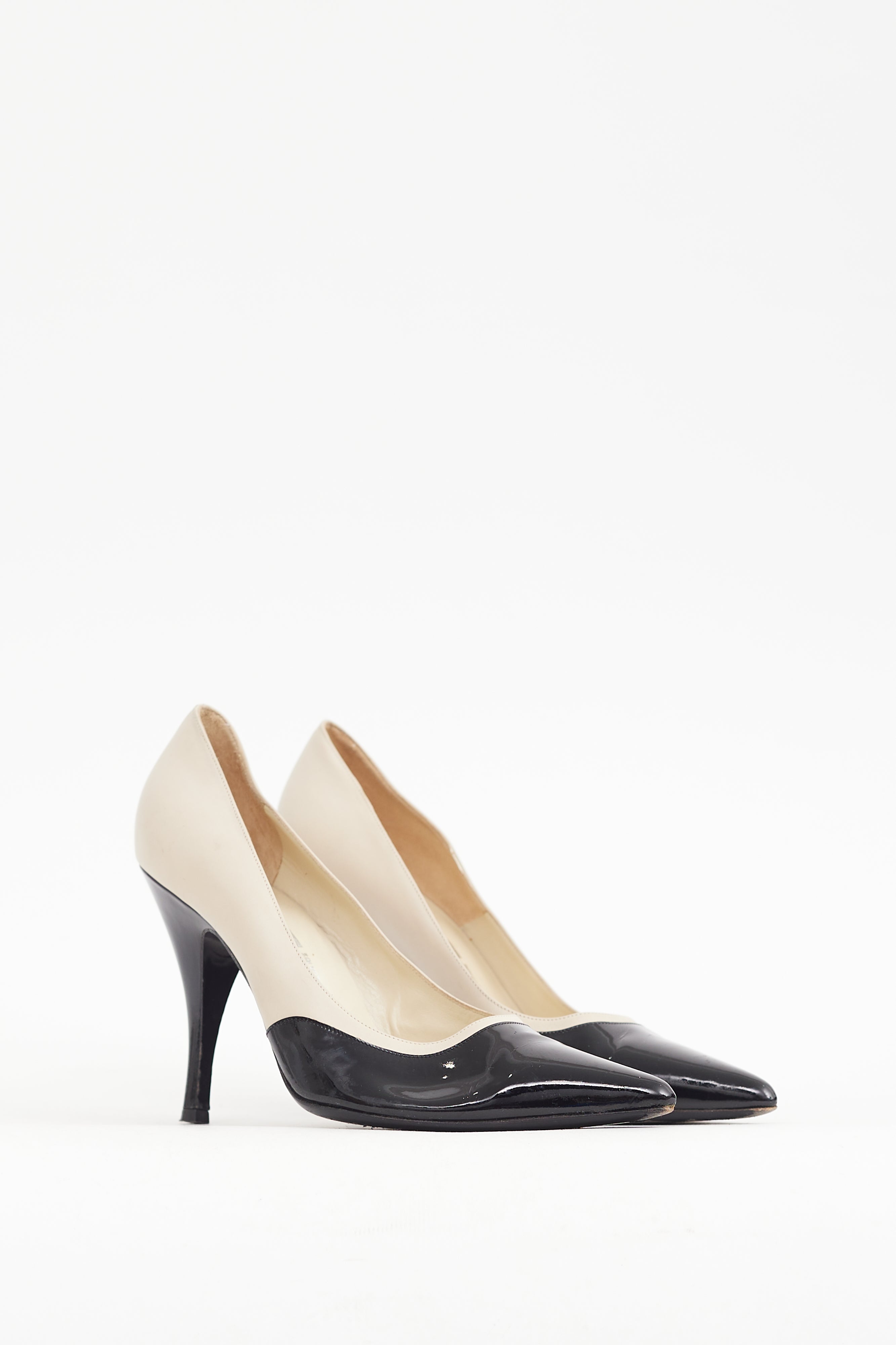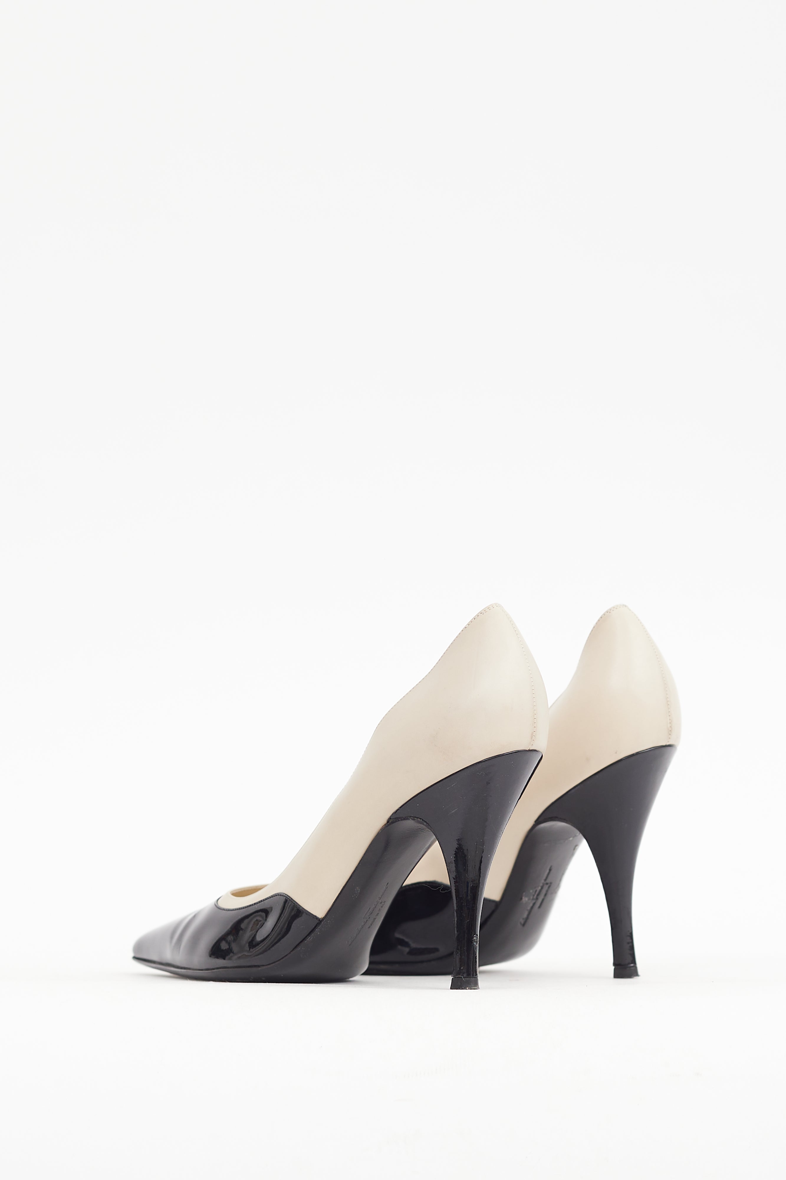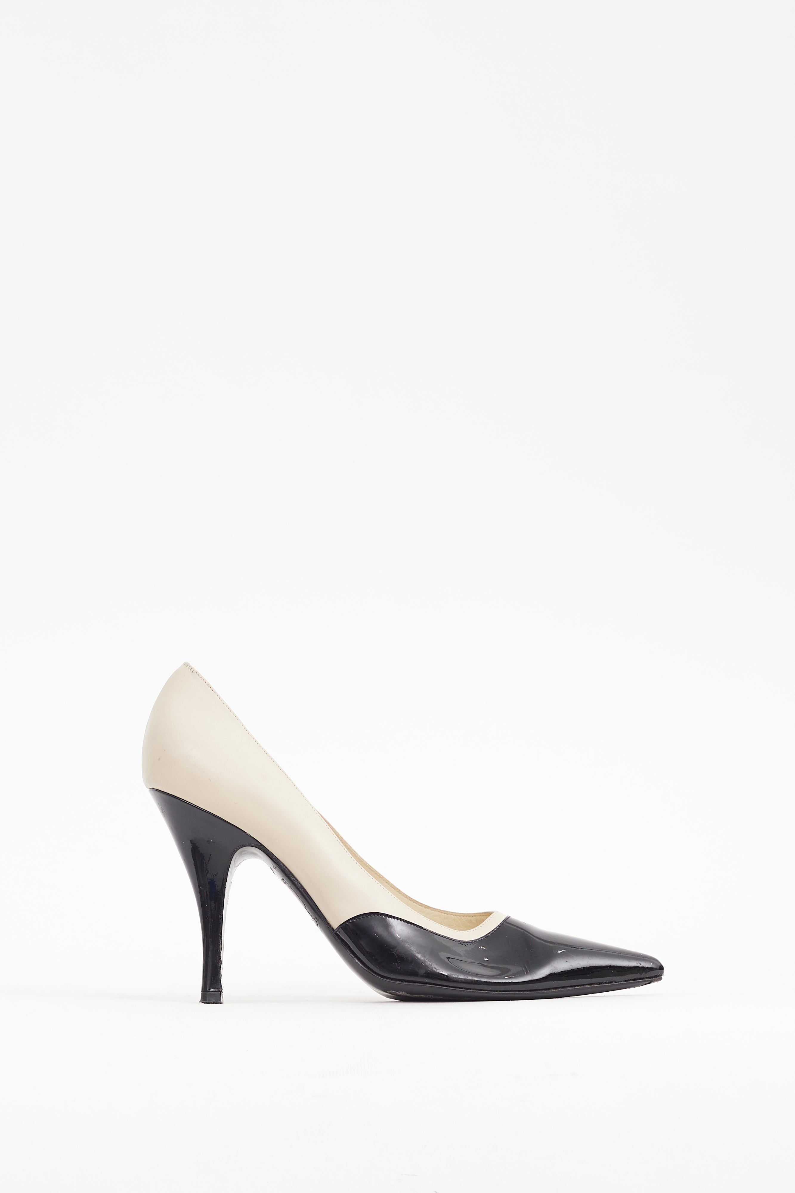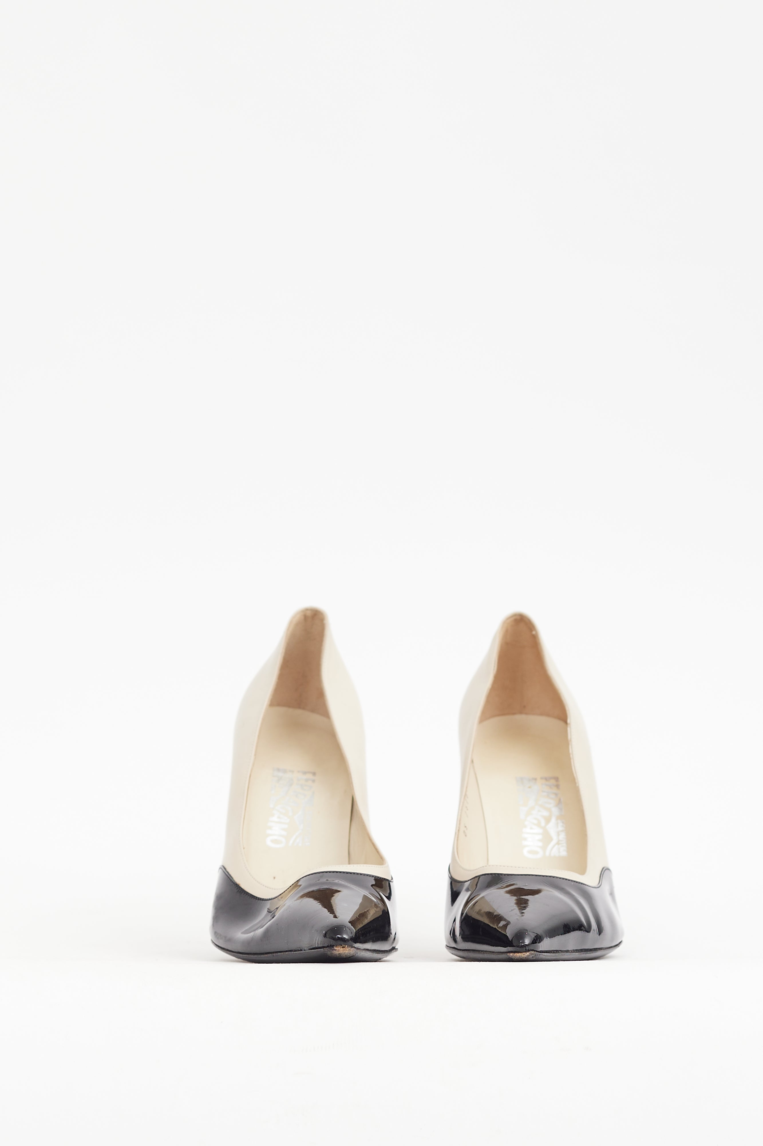 Pre-owned Salvatore Ferragamo heels featuring a pointed toe, cream leather body, black patent leather panel at vamp, and a covered stiletto heel.
