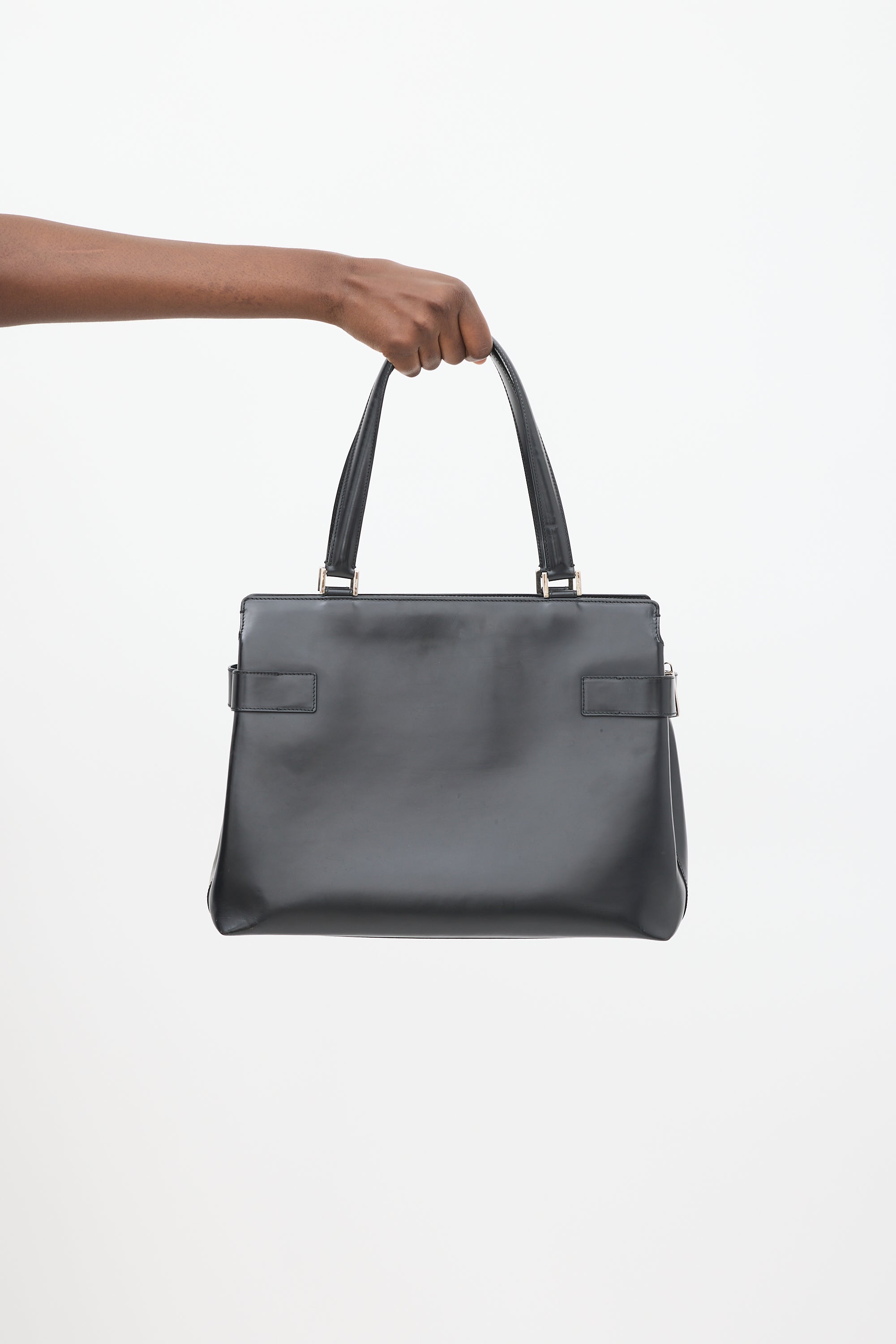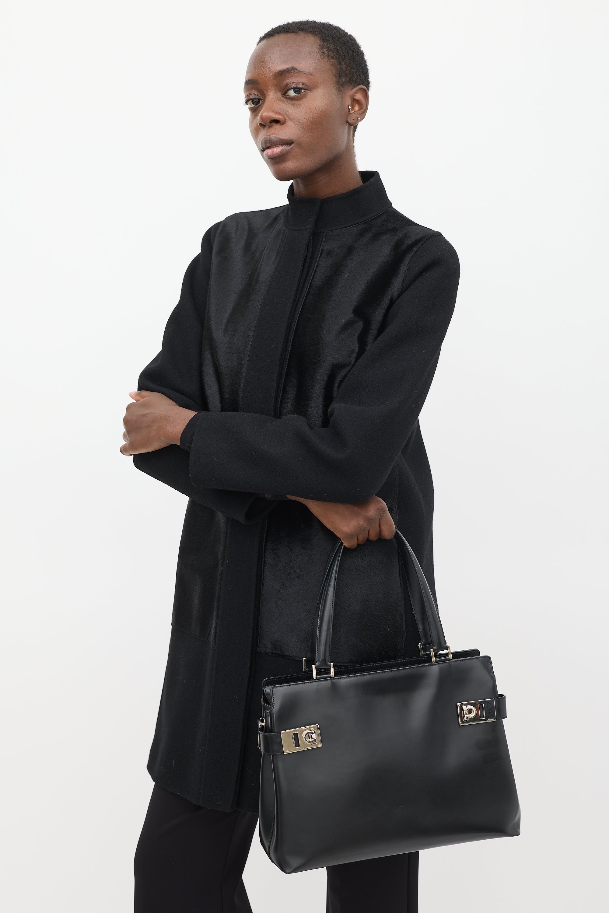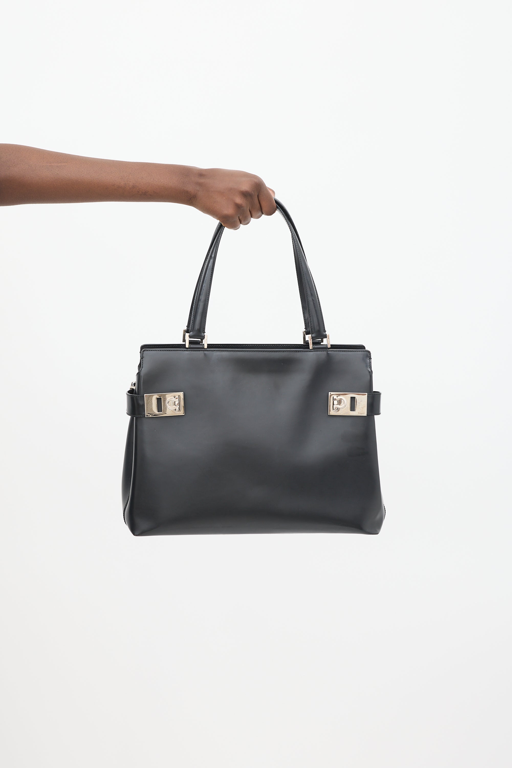 Pre-owned Ferragamo black leather tote featuring two top handles, one main compartment with two slip pockets and one zip pocket, silver tone Gancio latch hardware at front, and top zip closure.
