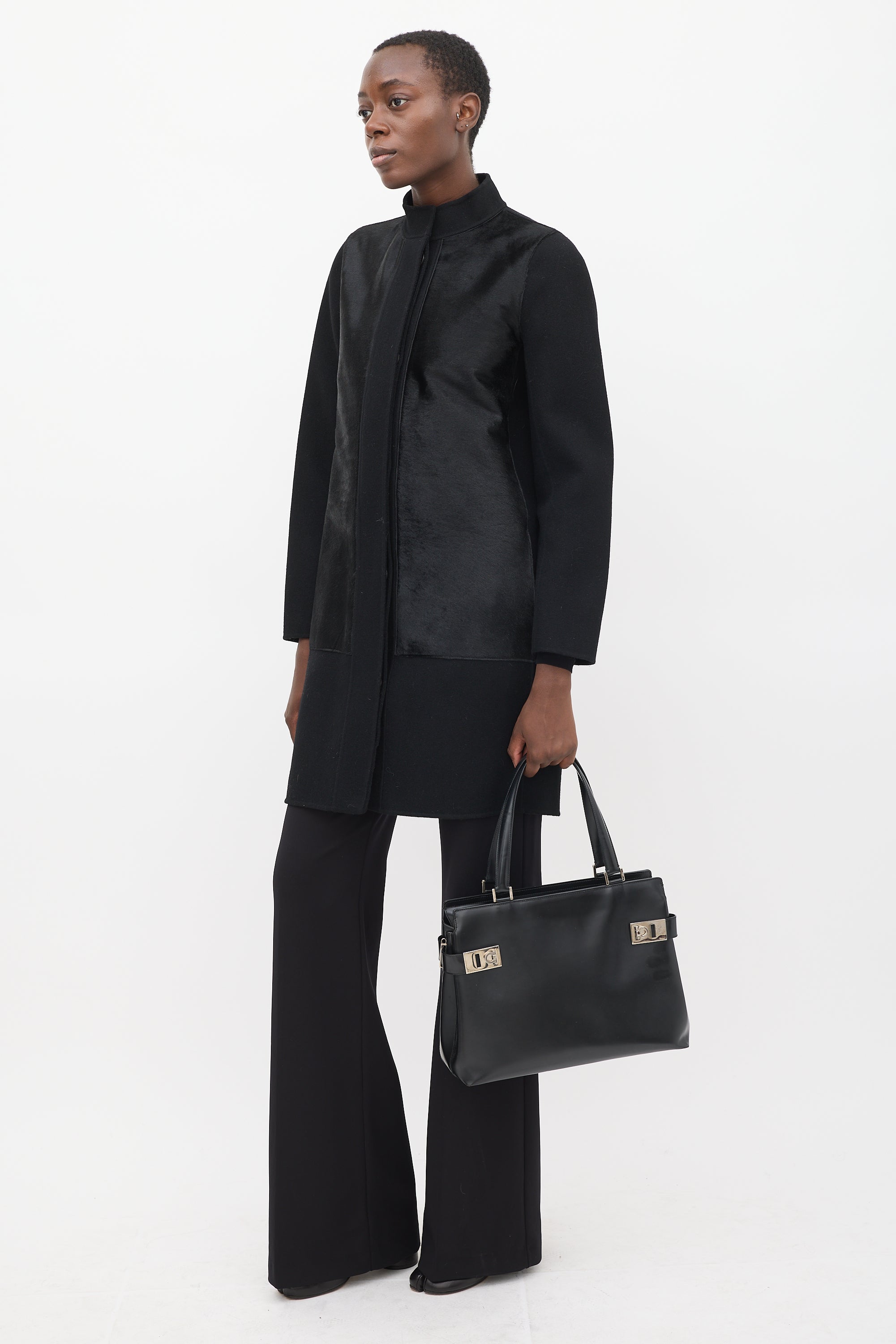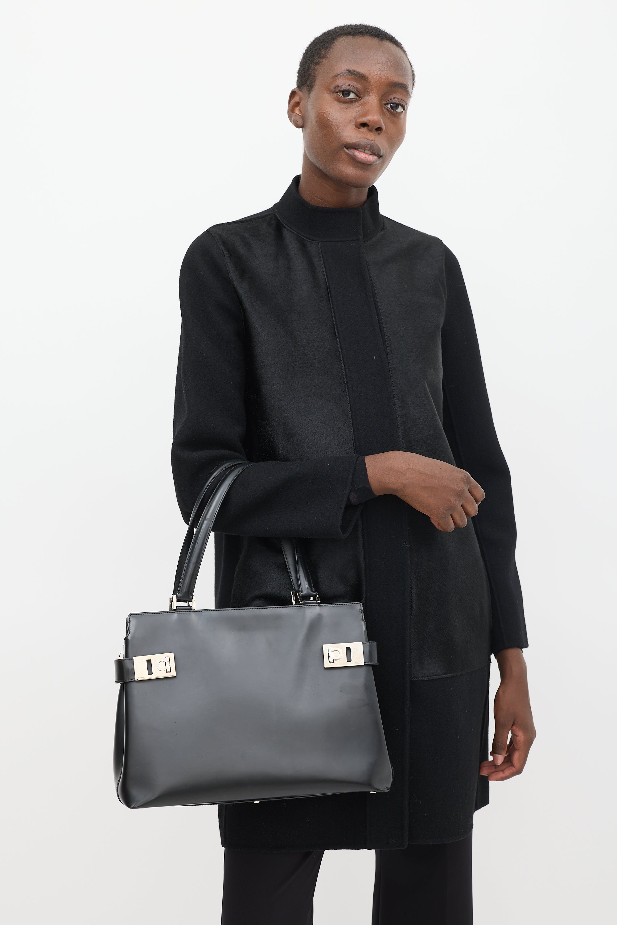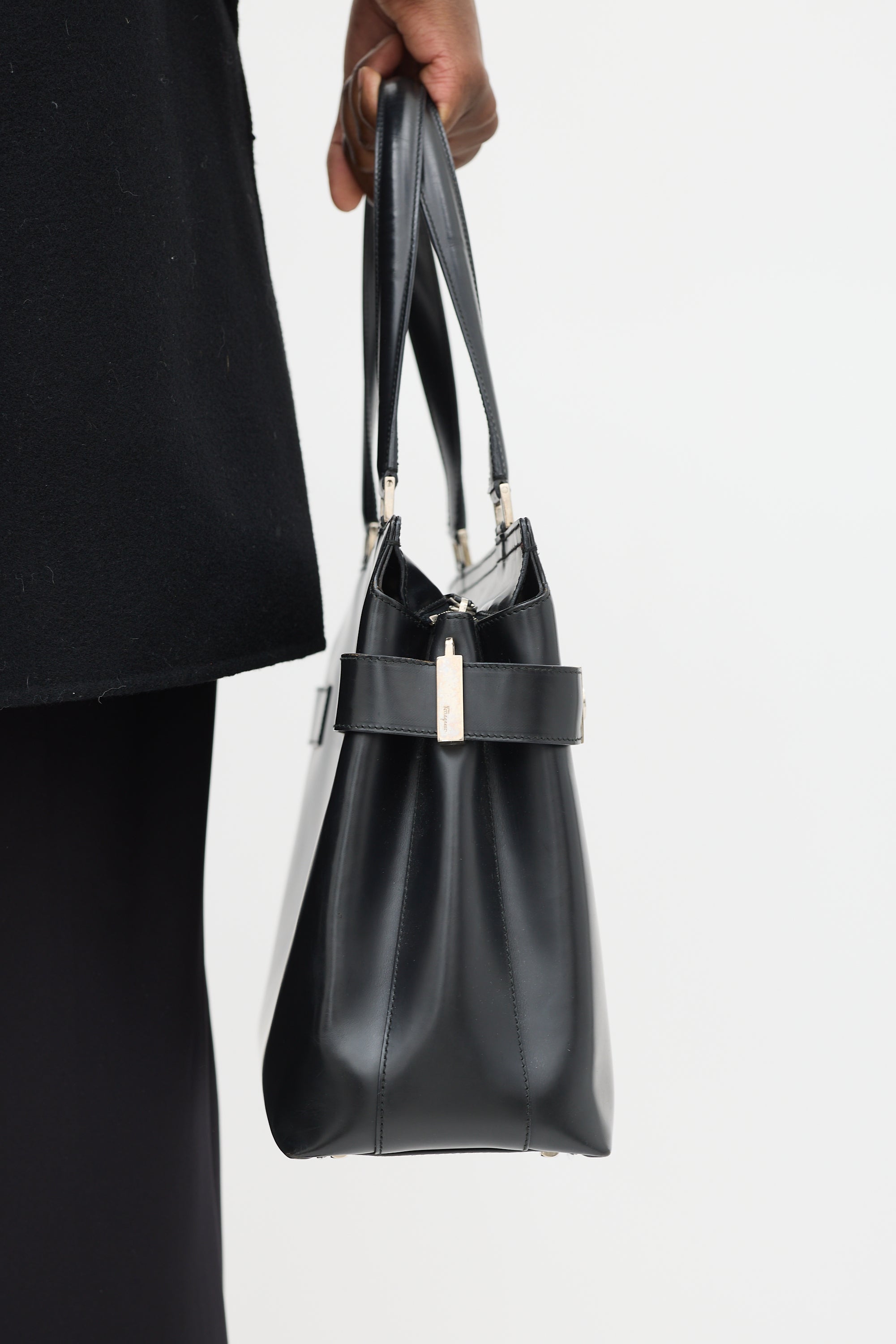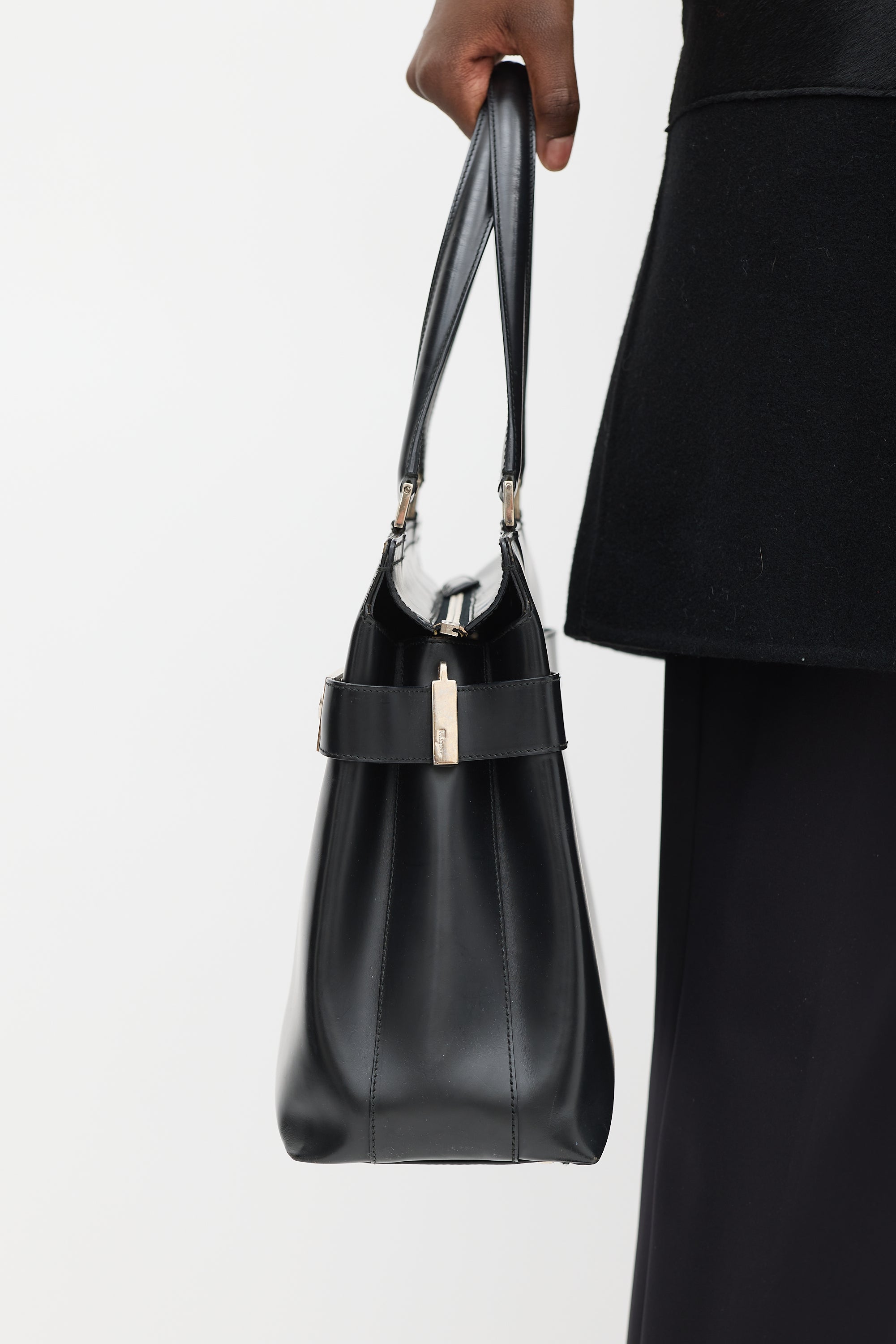 Pre-owned Ferragamo black leather tote featuring two top handles, one main compartment with two slip pockets and one zip pocket, silver tone Gancio latch hardware at front, and top zip closure.
