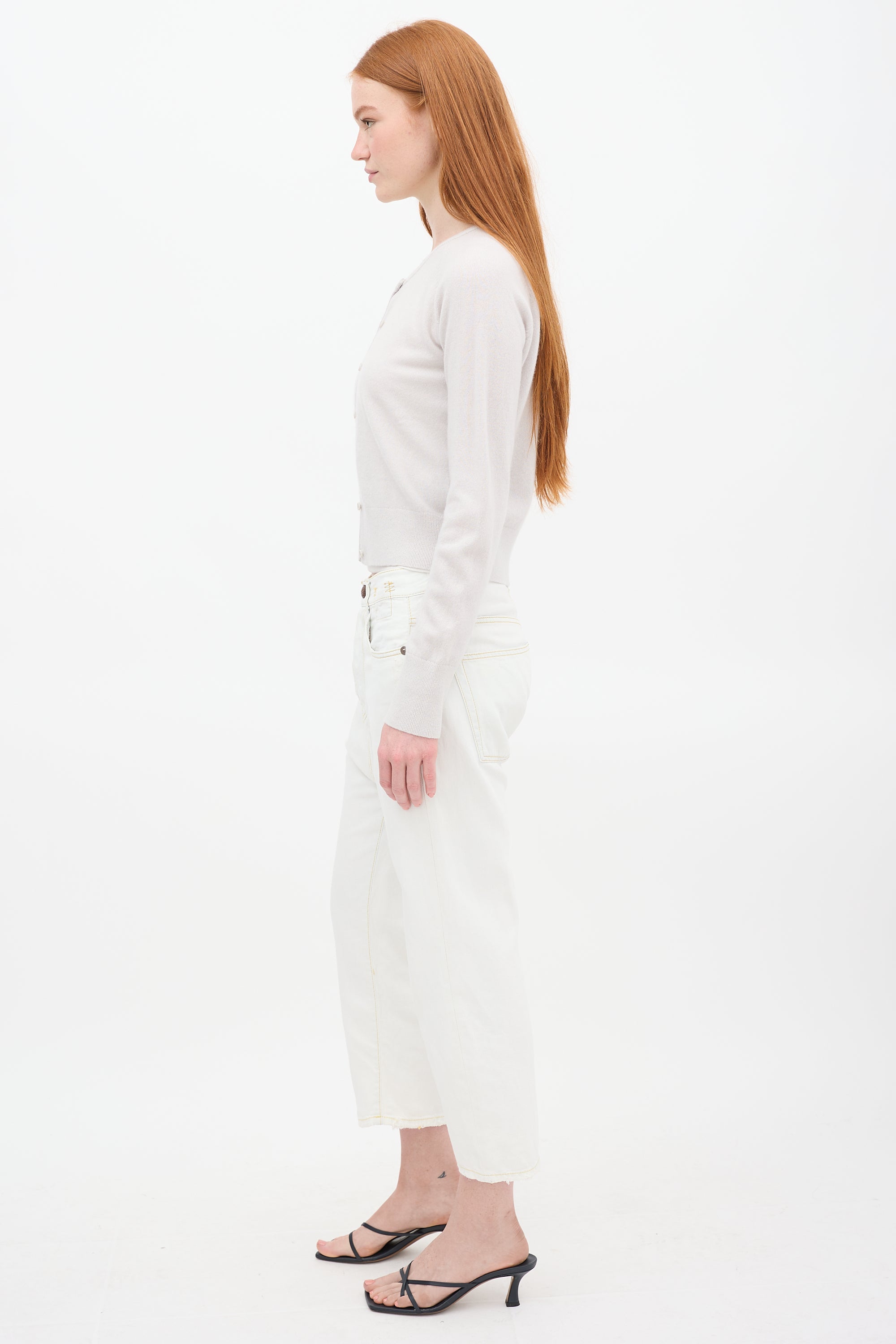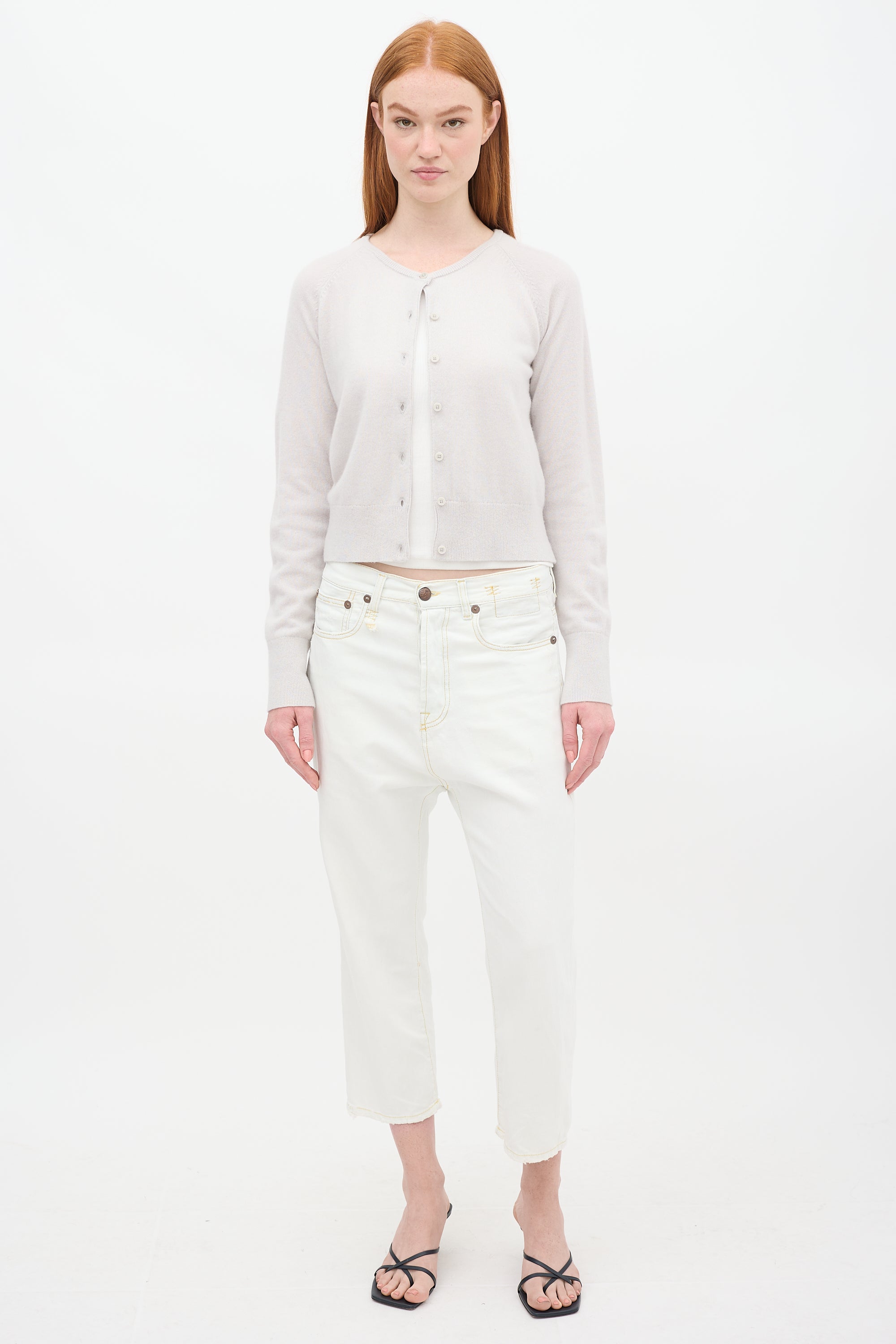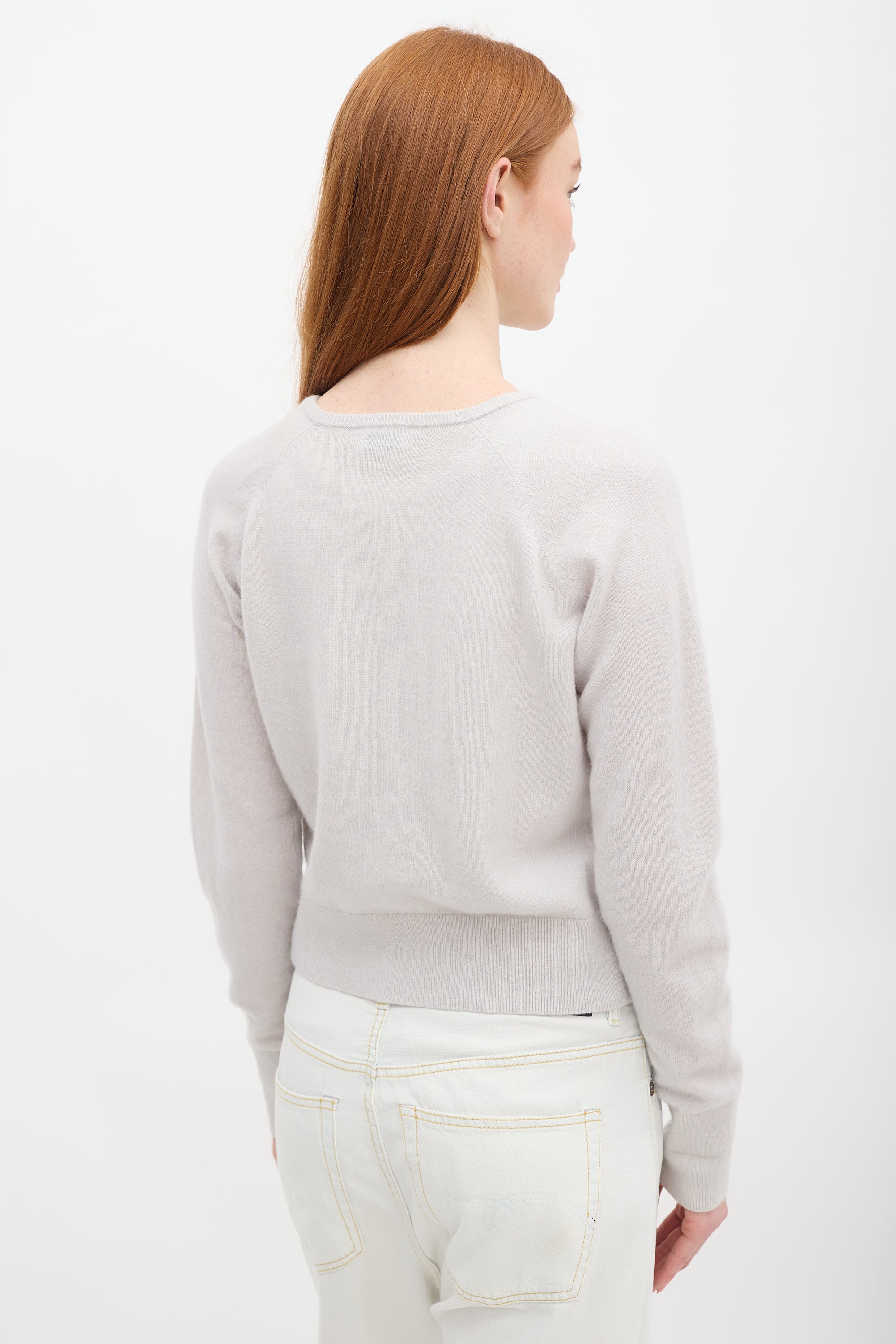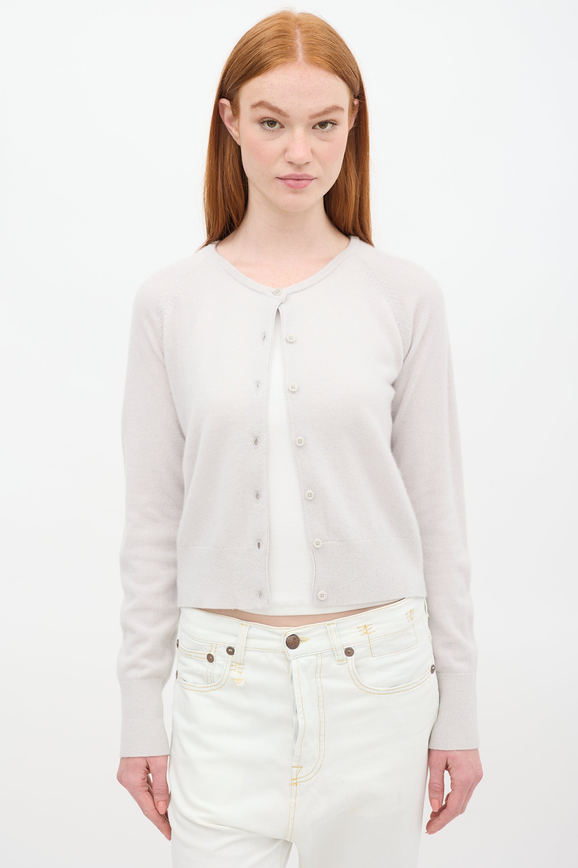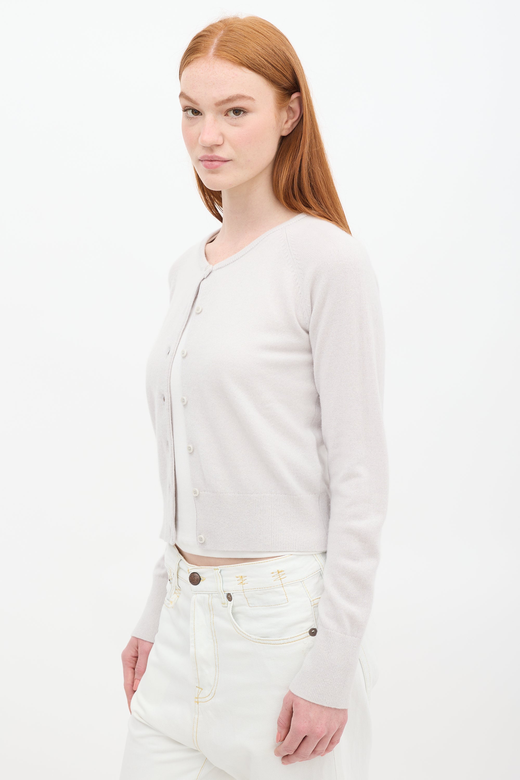 Pre-owned Filippa K light grey cashmere knit cardigan featuring round neckline, button up front, and ribbing at neck, hem, and cuffs.
