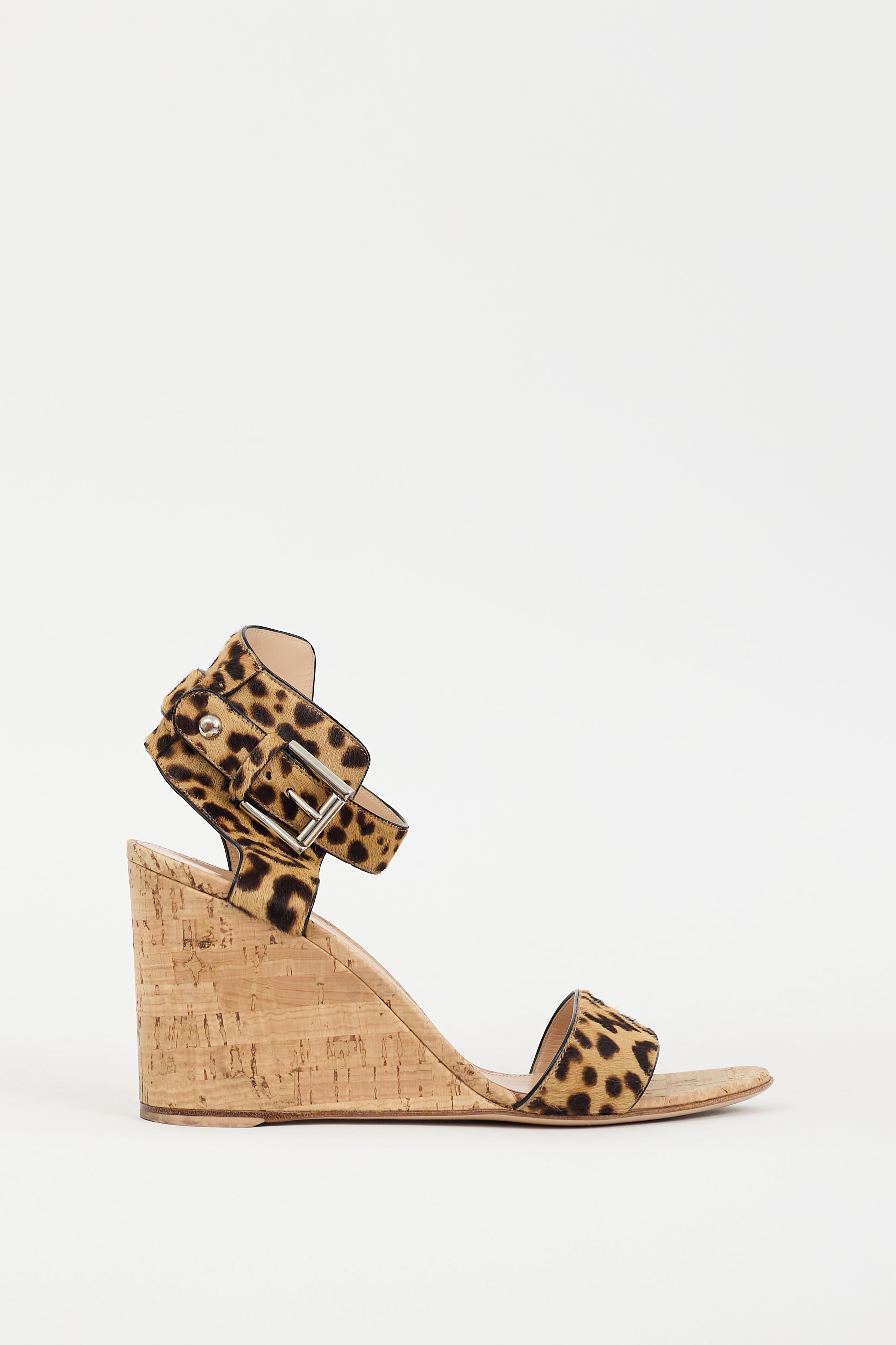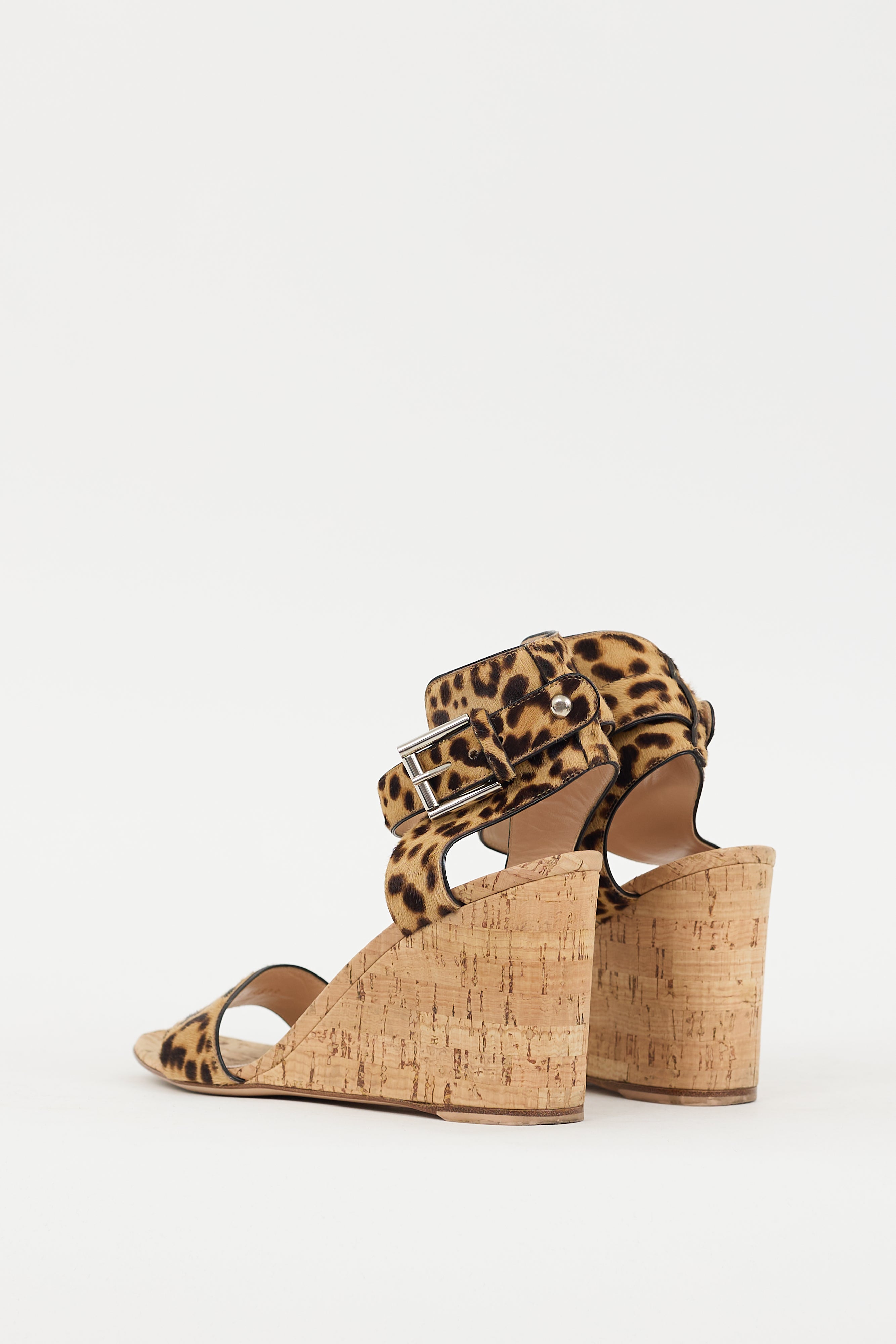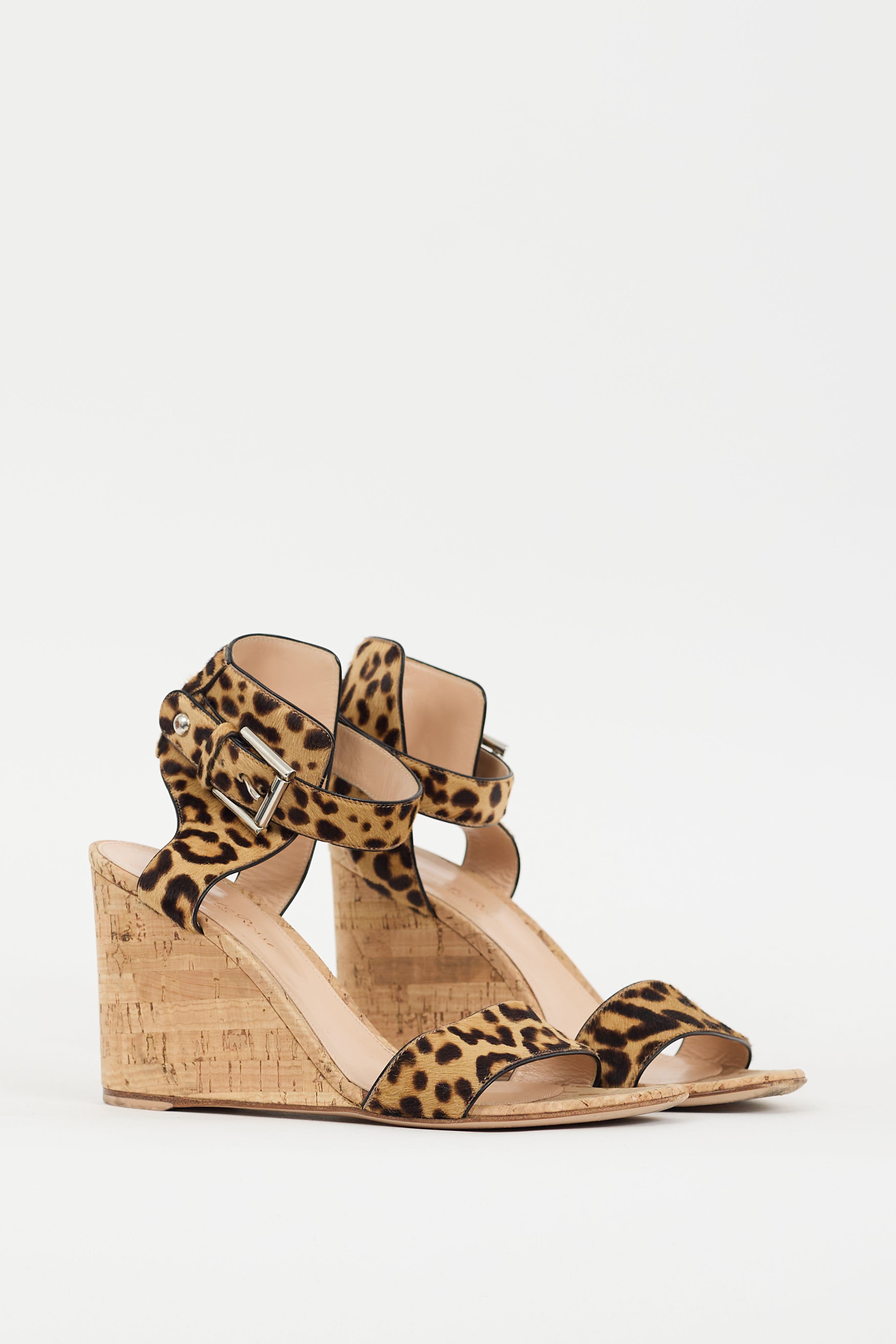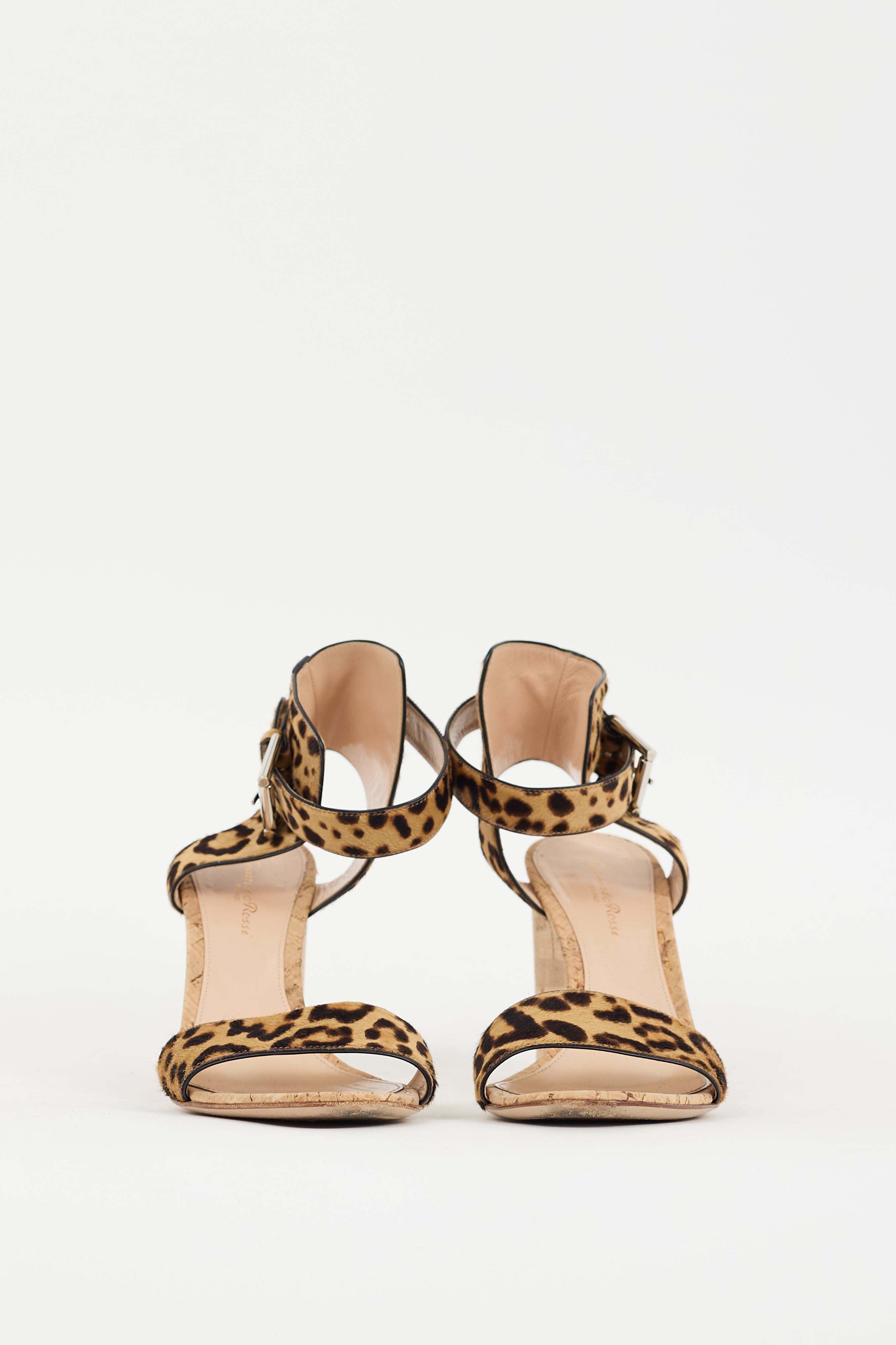 Pre-owned Gianvitto Rossi brown sandals featuring open rounded toe, ankle strap with buckle closure, cheetah print pony hair upper, and cork wedge heel.