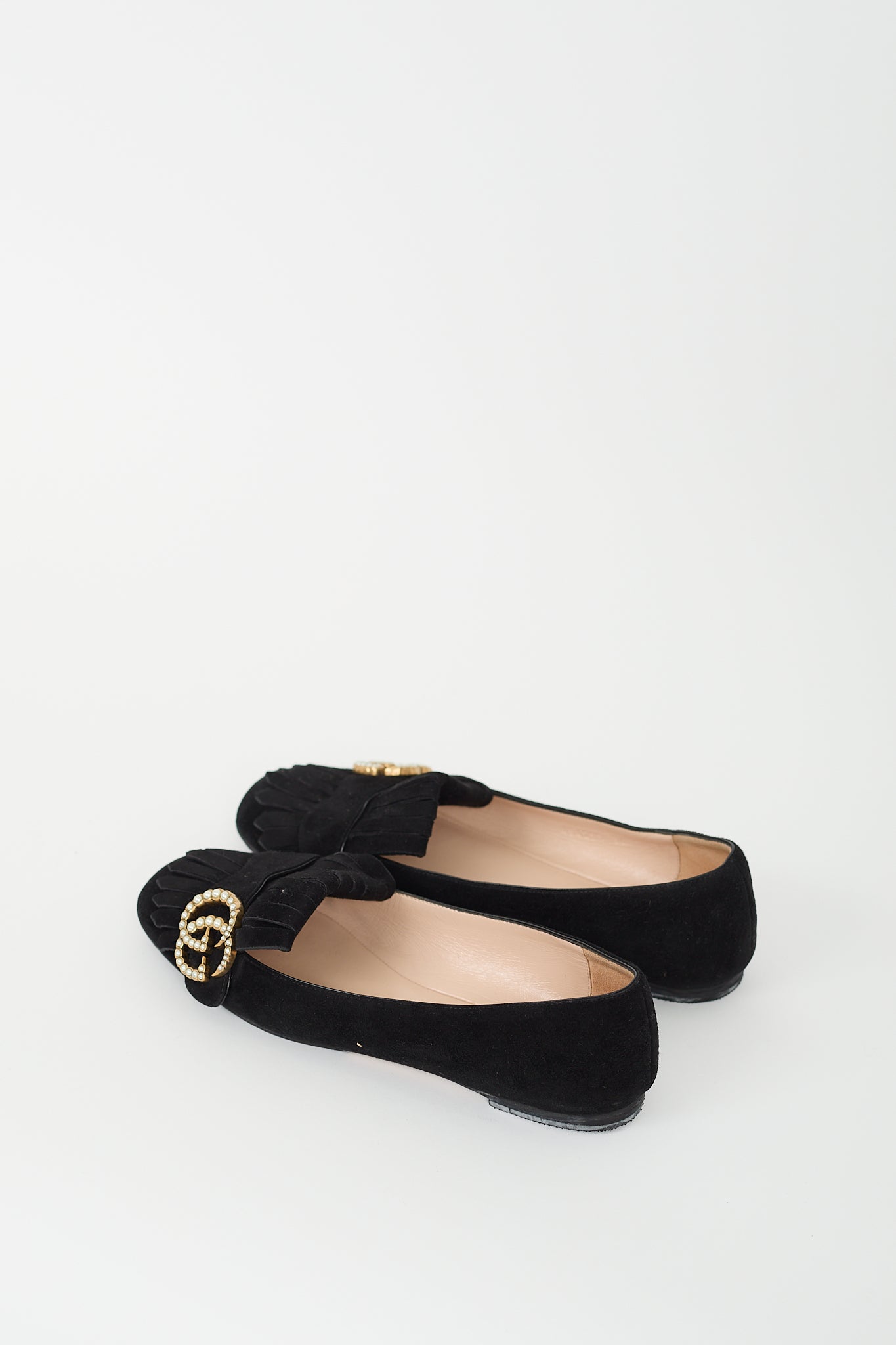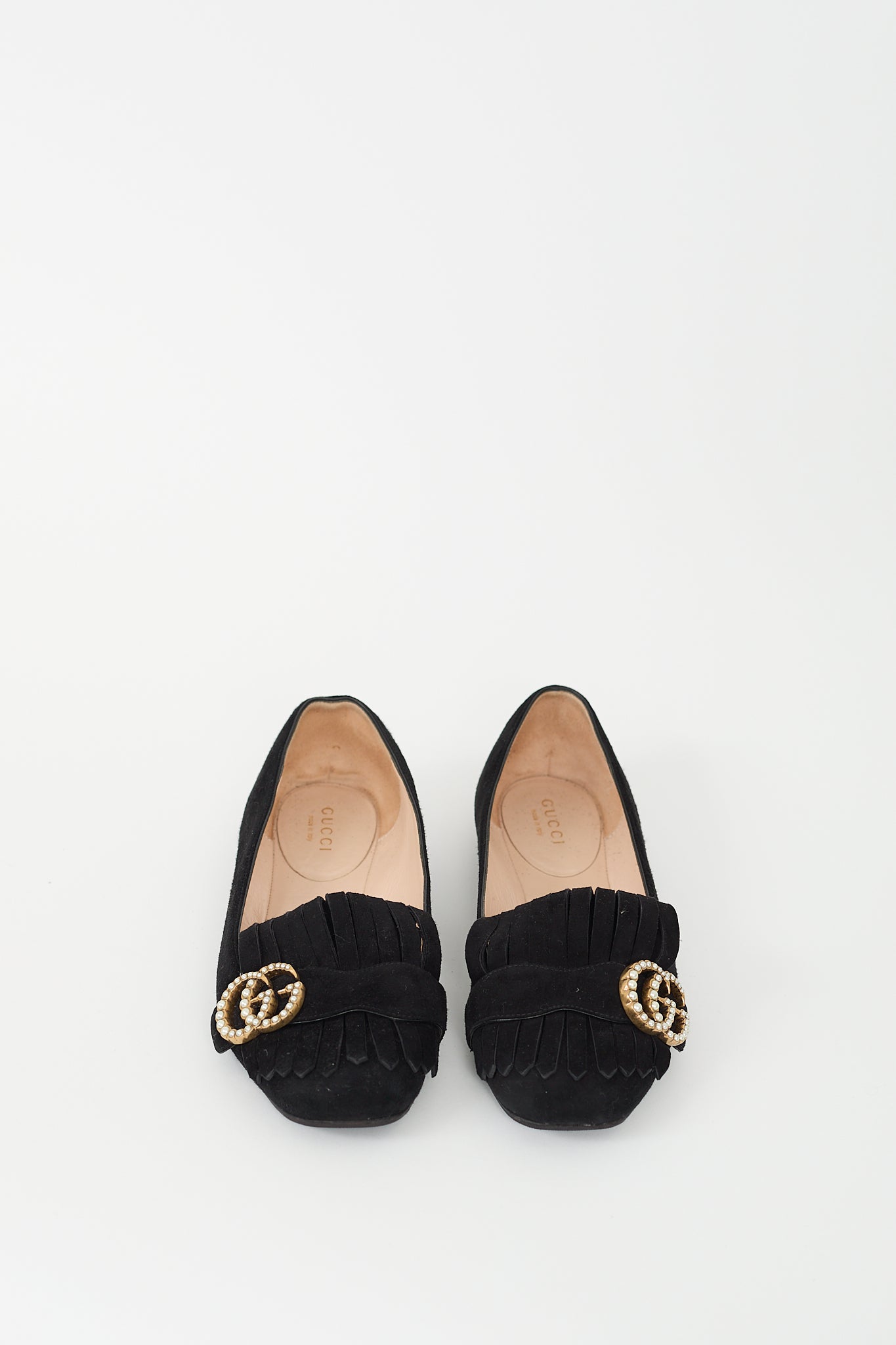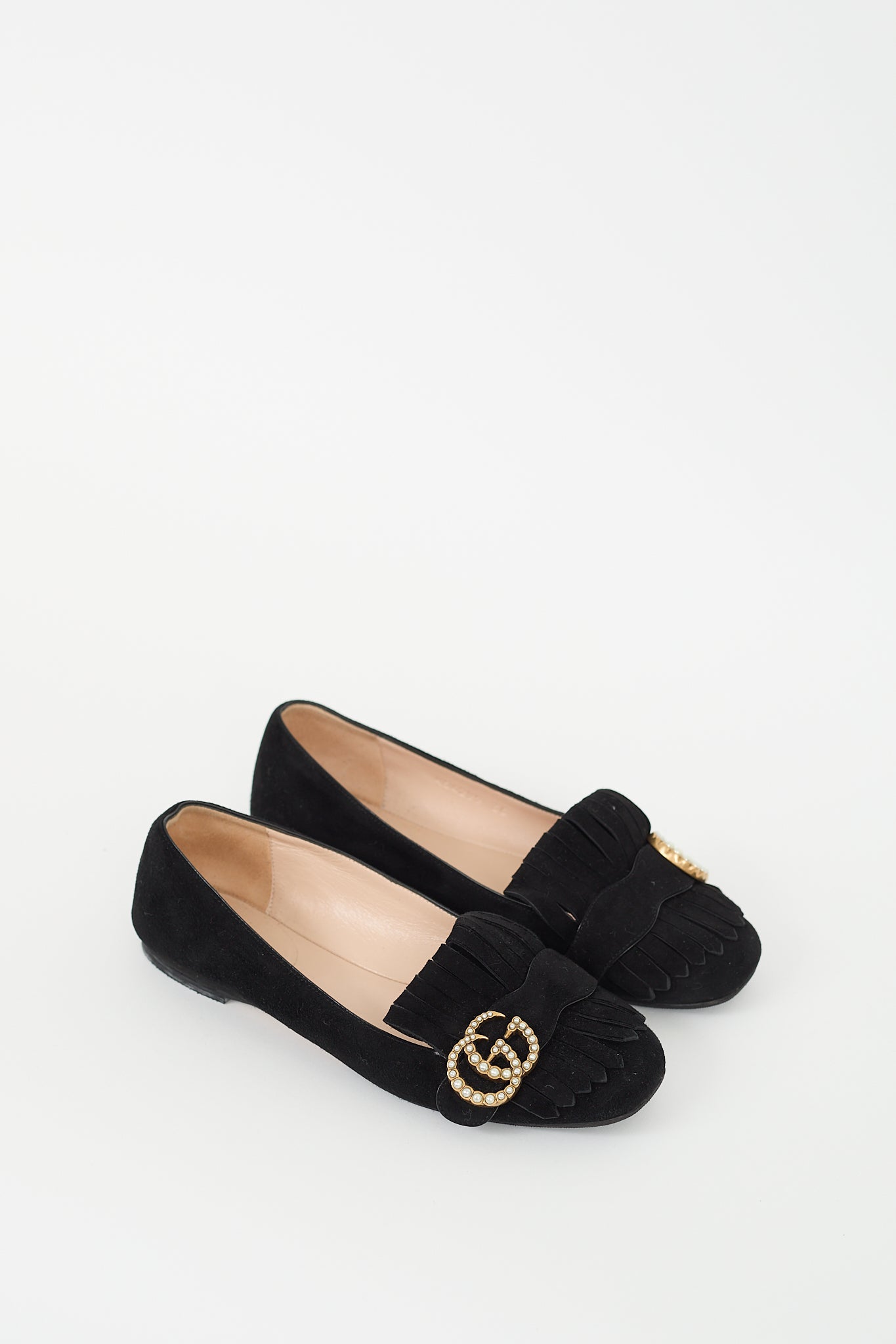Pre-owned Gucci black suede Marmont flats featuring rounded square toe, fringe at front, gold tone and faux pearl Double G logo at vamp, and slip on entry. Comes with original dust bag.