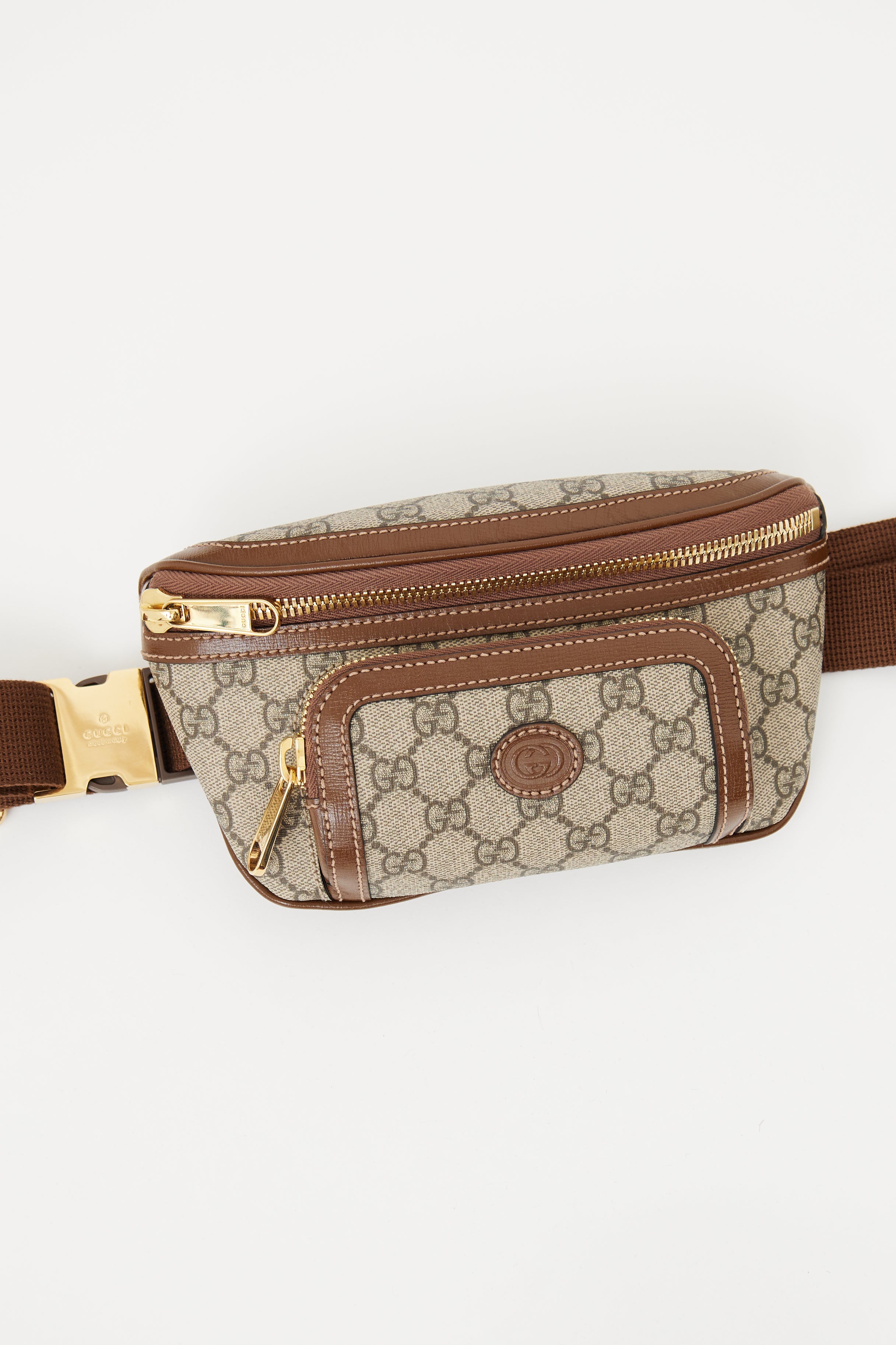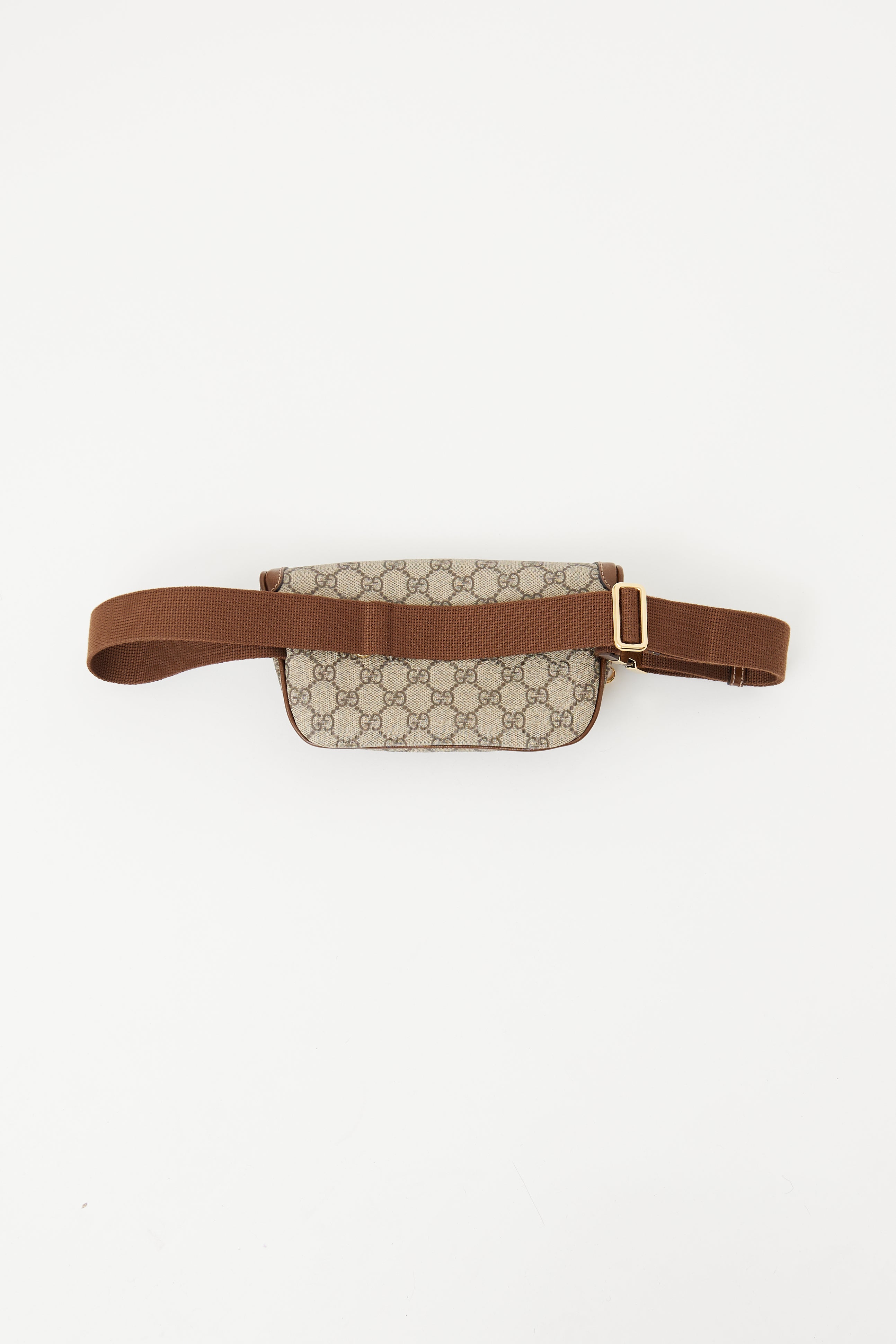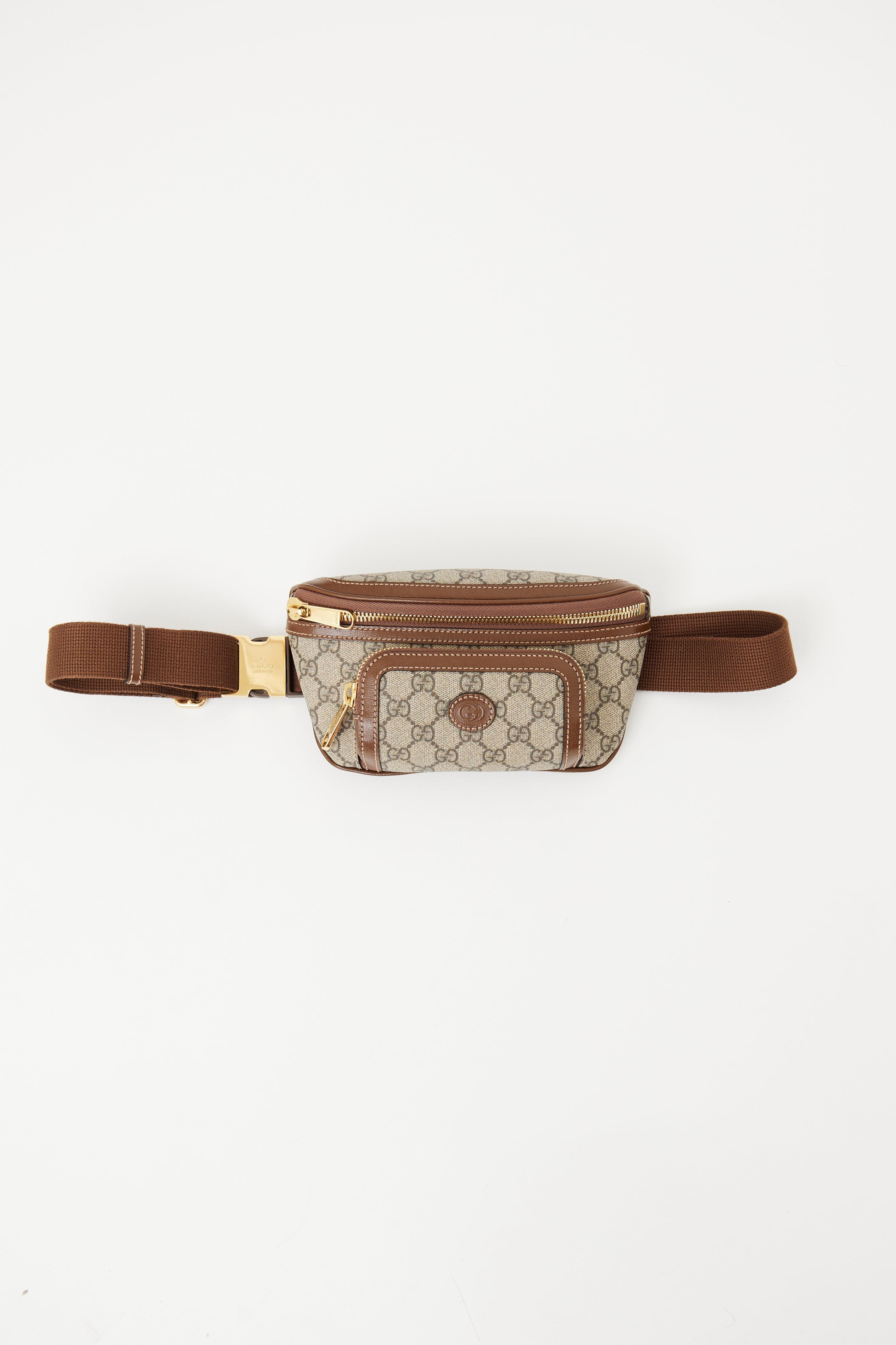 Pre-owned Gucci brown leather and beige monogram belt bag featuring brown leather trim, gold tone hardware, three zip compartments, brown embossed logo at front, brown grosgrain adjustable belt strap with buckle closure.