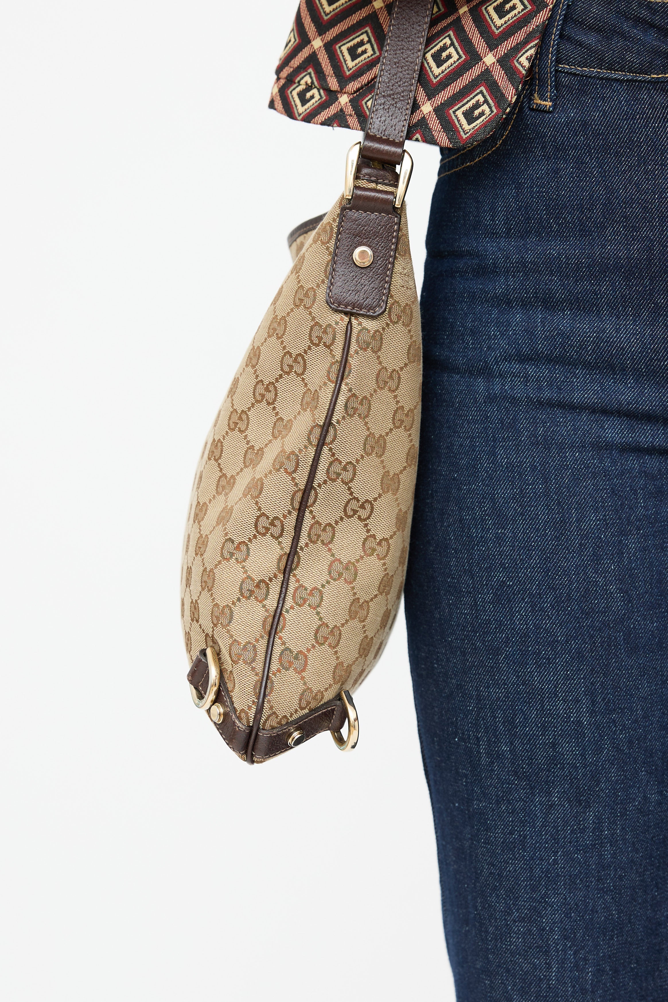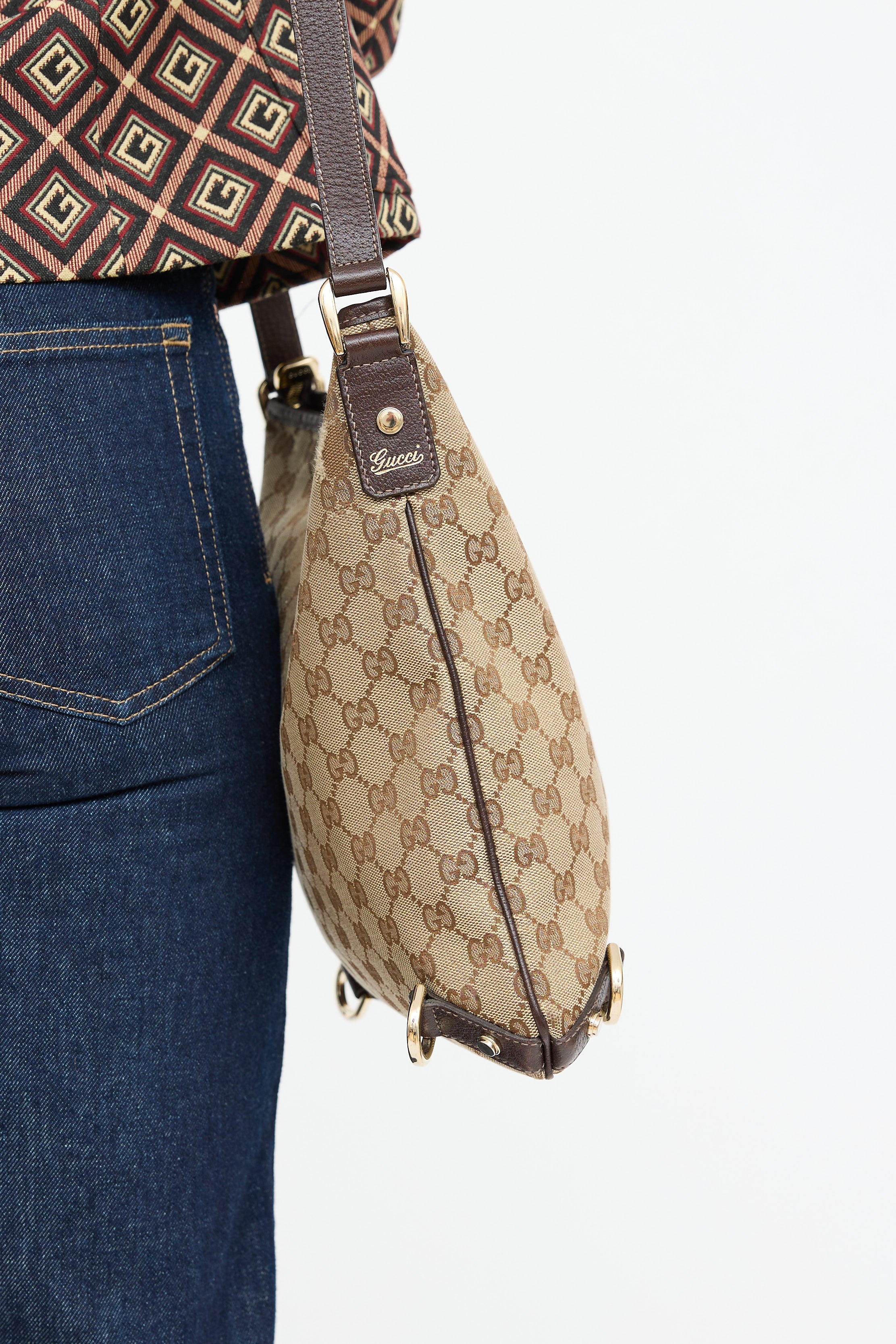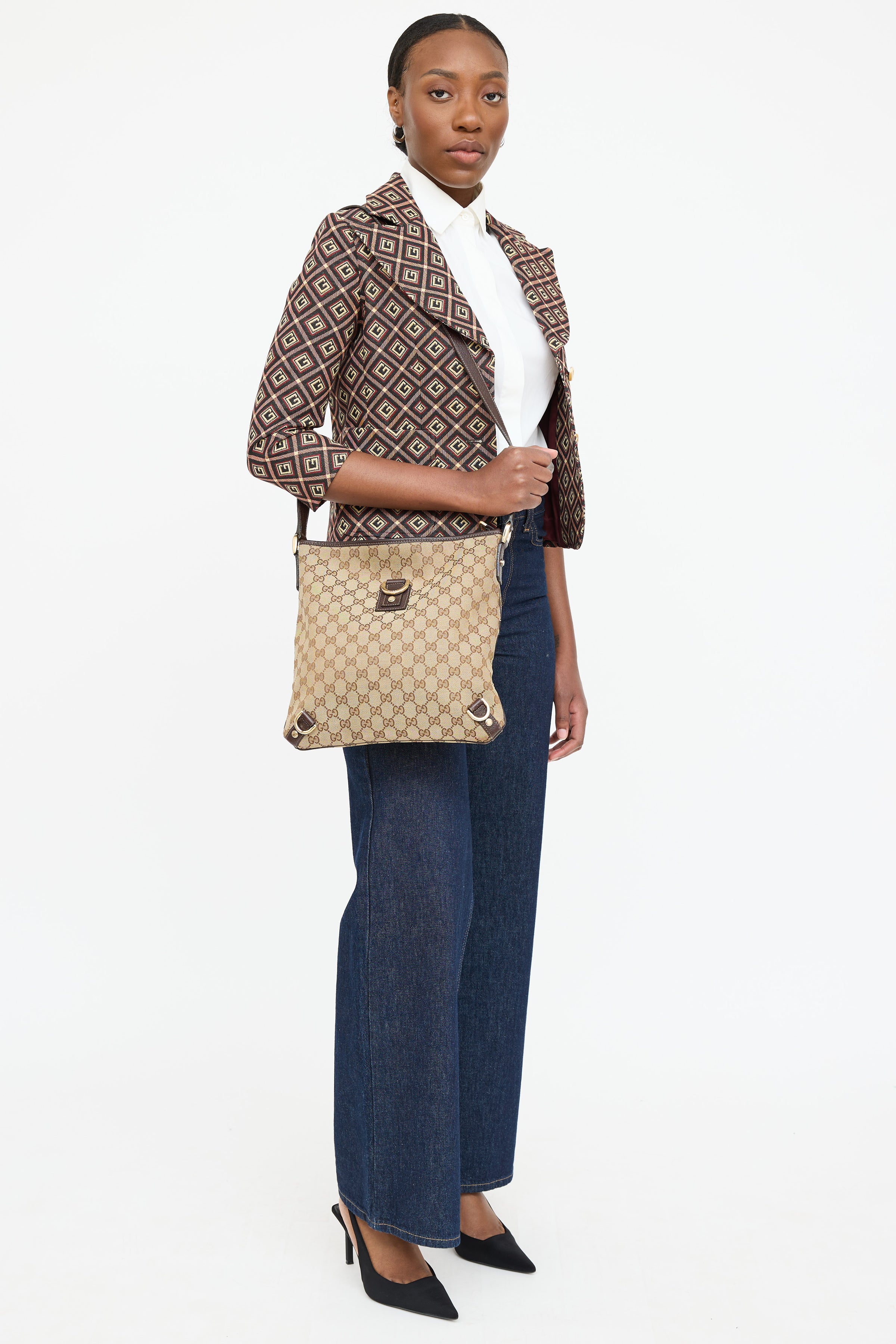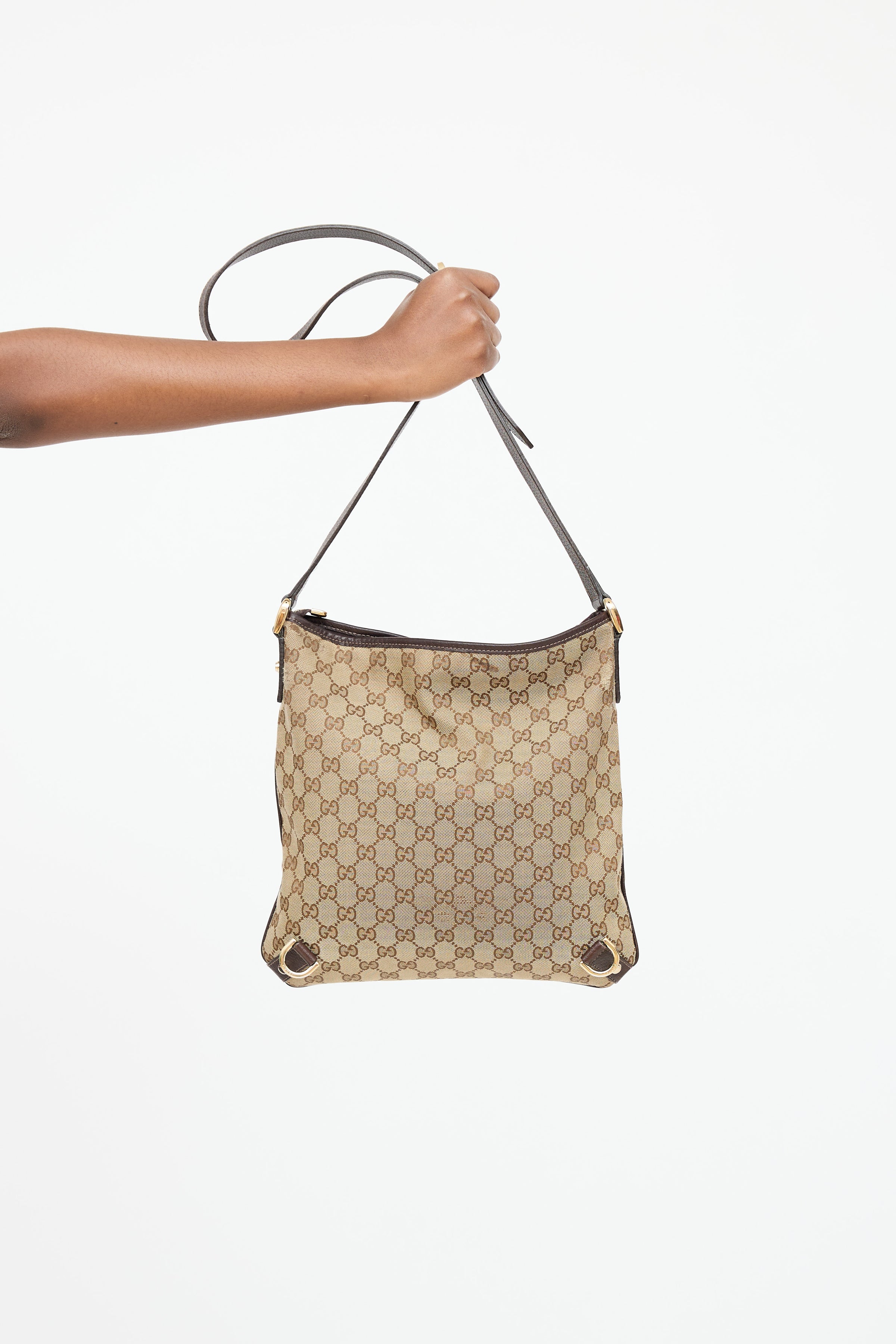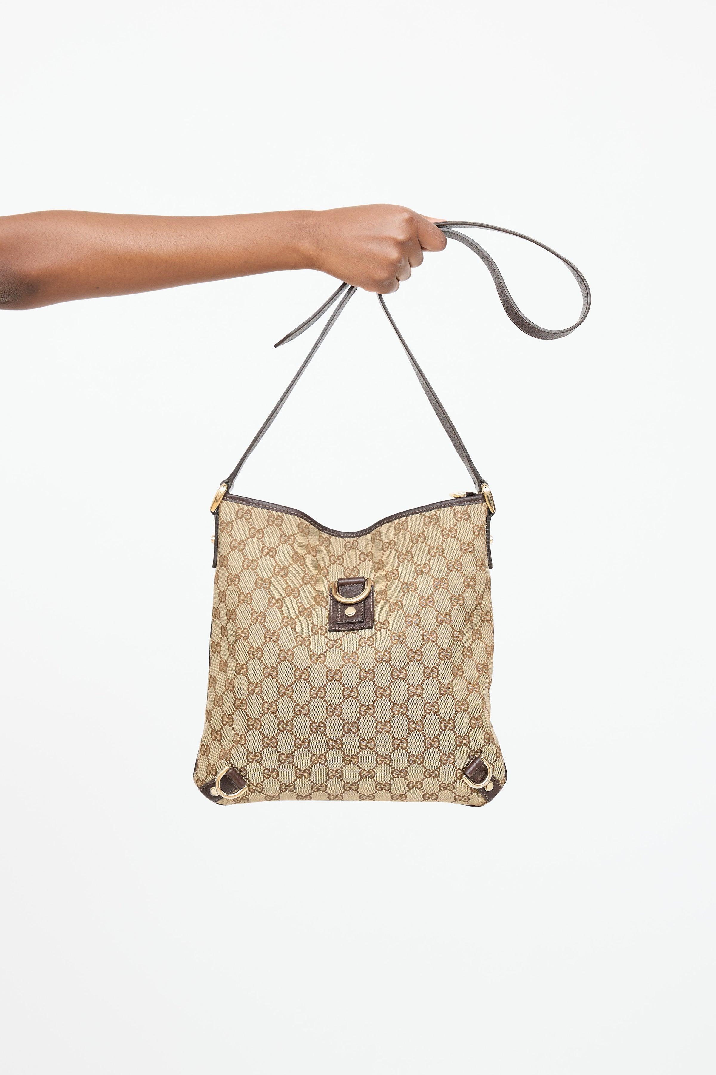 Pre-owned Gucci beige & brown canvas Abbey crossbody bag featuring single flat shoulder strap, contrast stitching, canvas monogram, leather patch with d ring on front, rolled edge trim, strap detail along bottom and zip closure top with pull tab. Canvas lined interior with single slip pocket and single zip pocket.