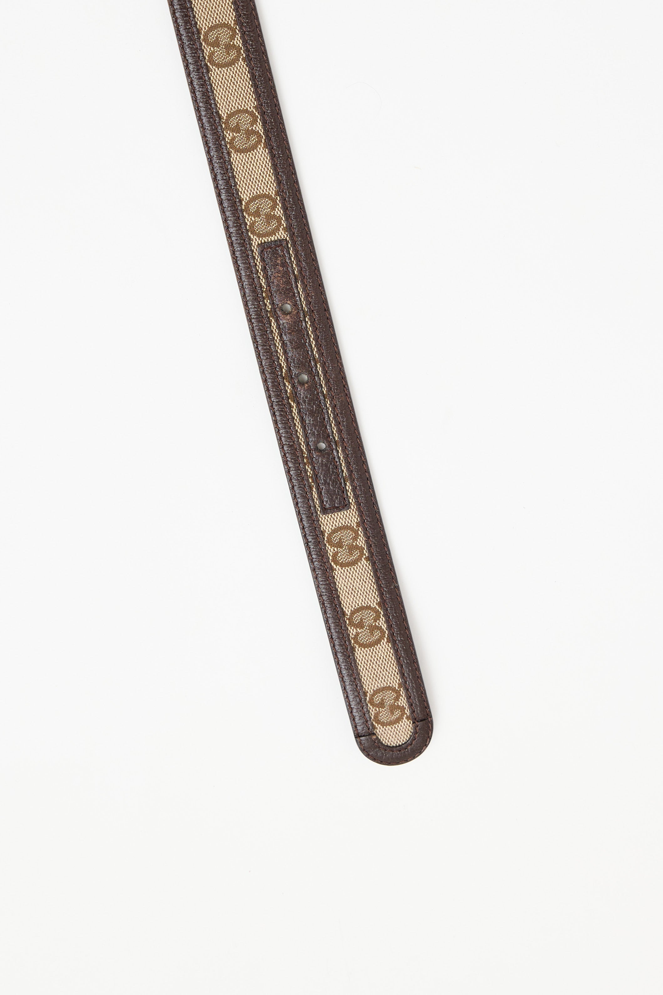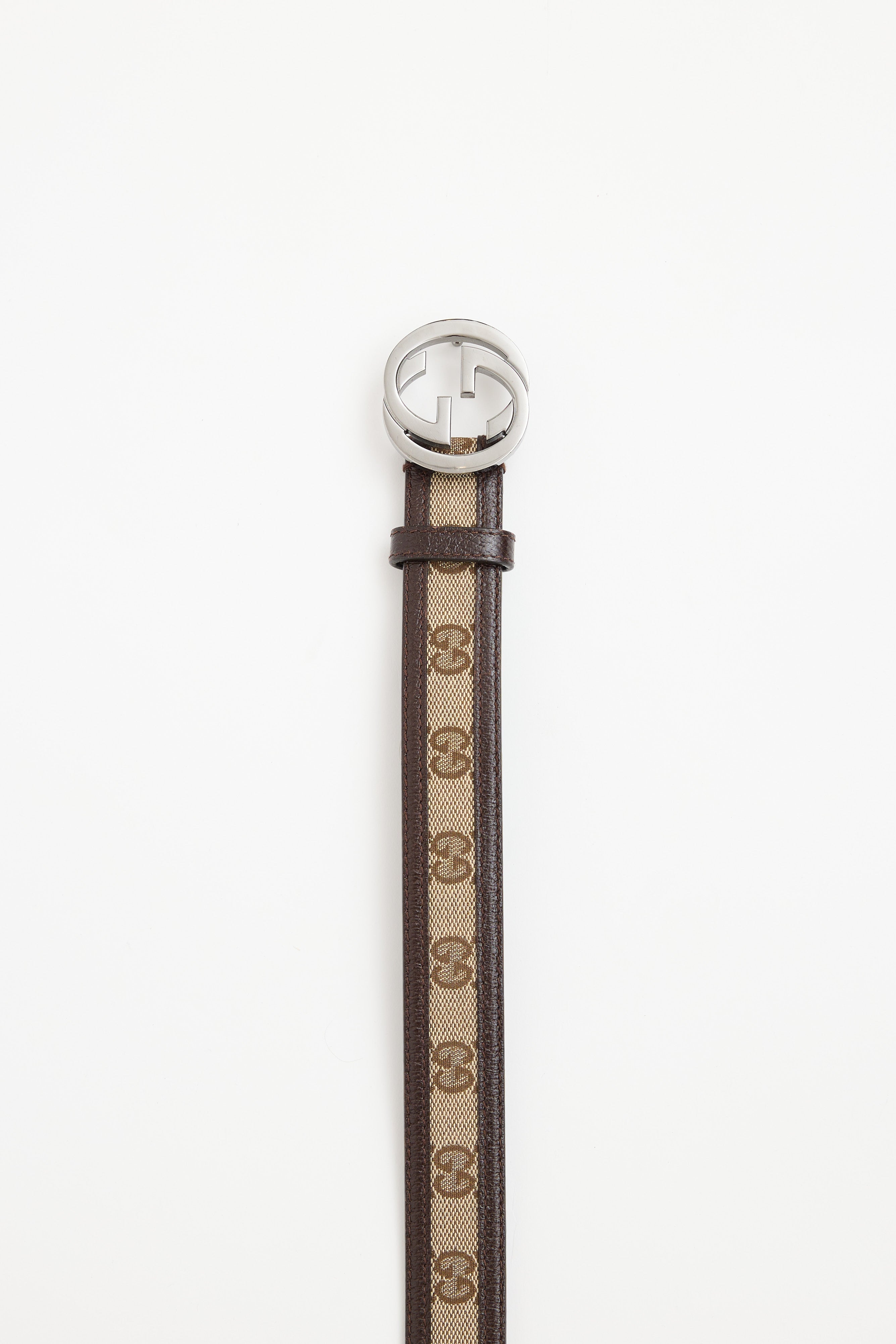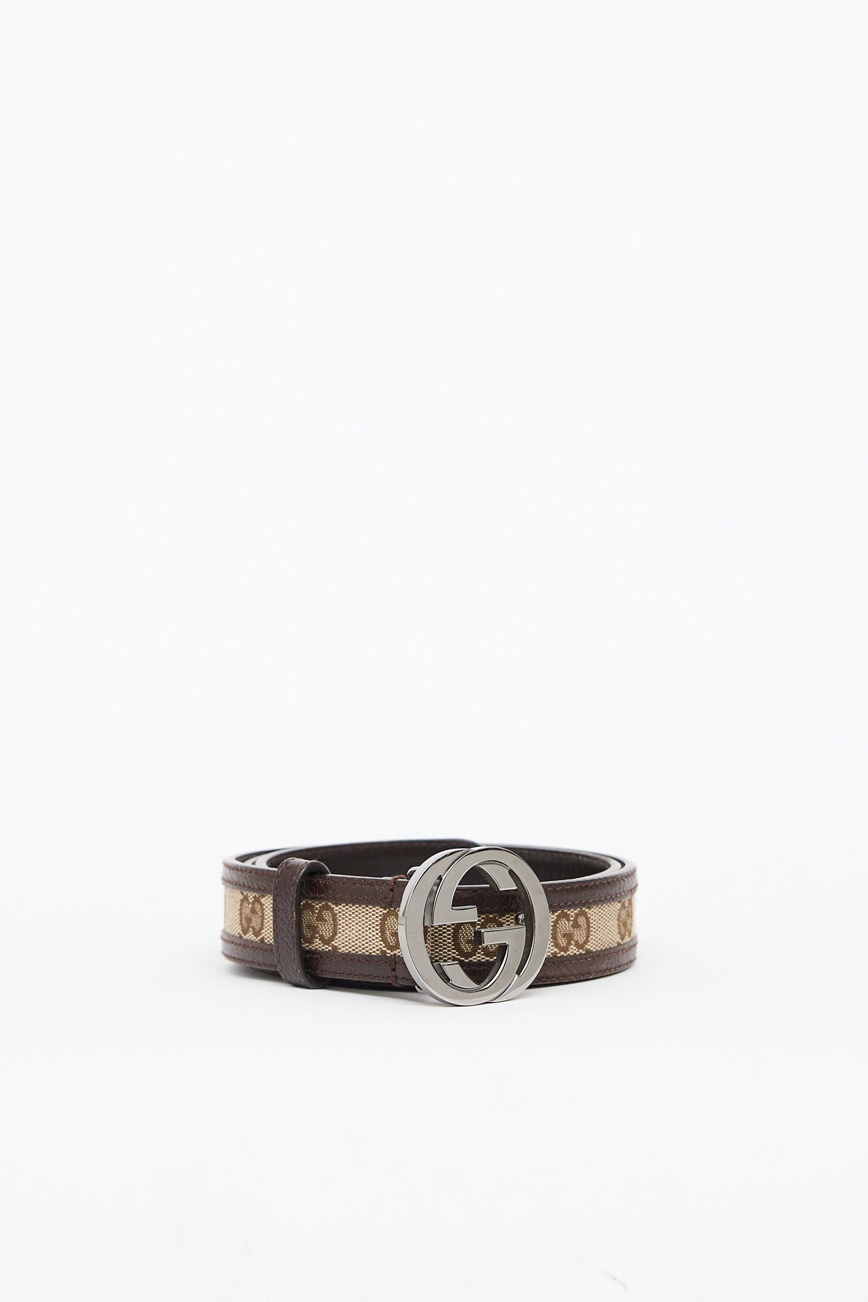 Pre-owned Gucci brown belt featuring canvas with monogram print, leather trim, silver tone hardware and GG logo buckle.