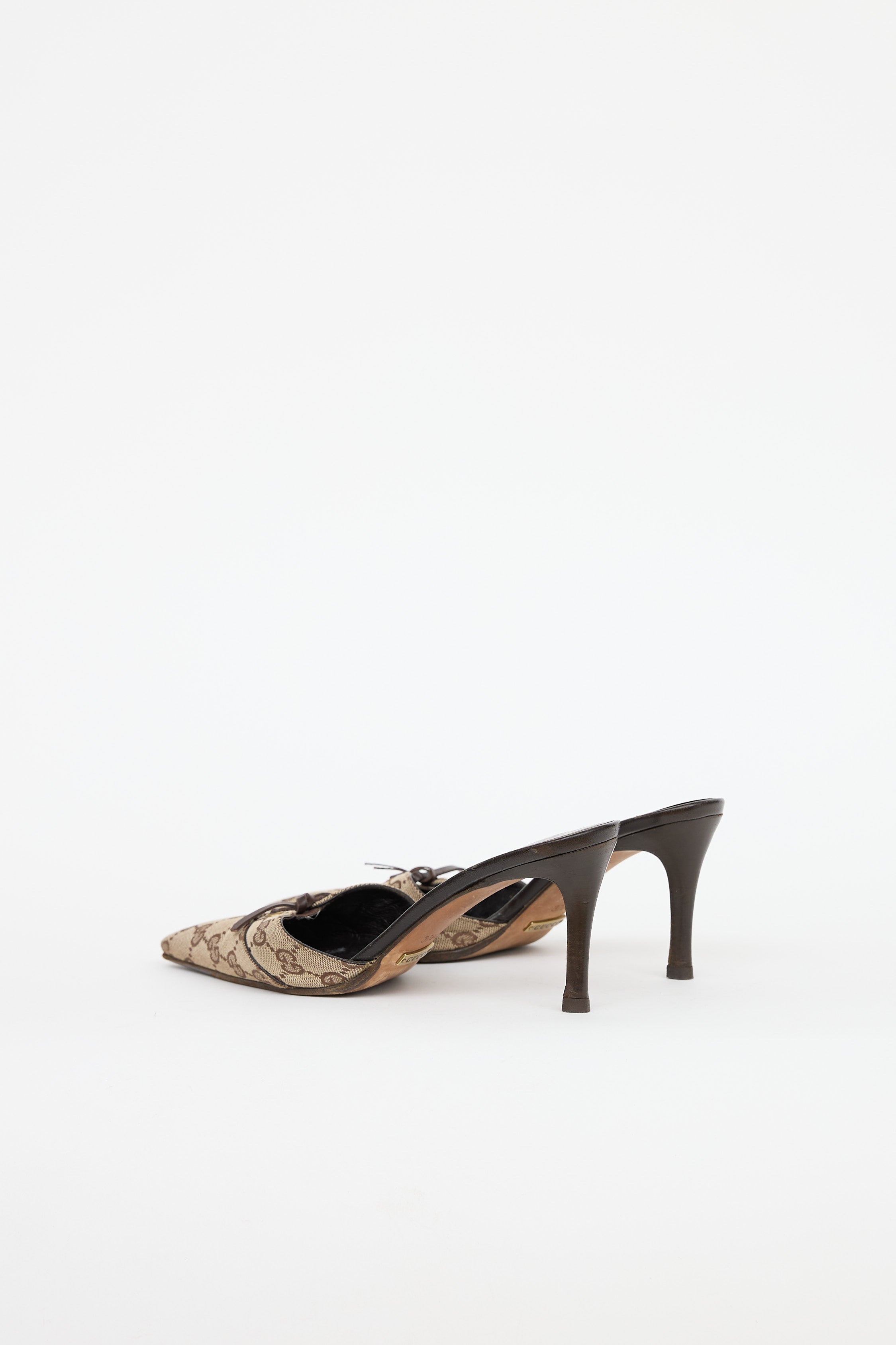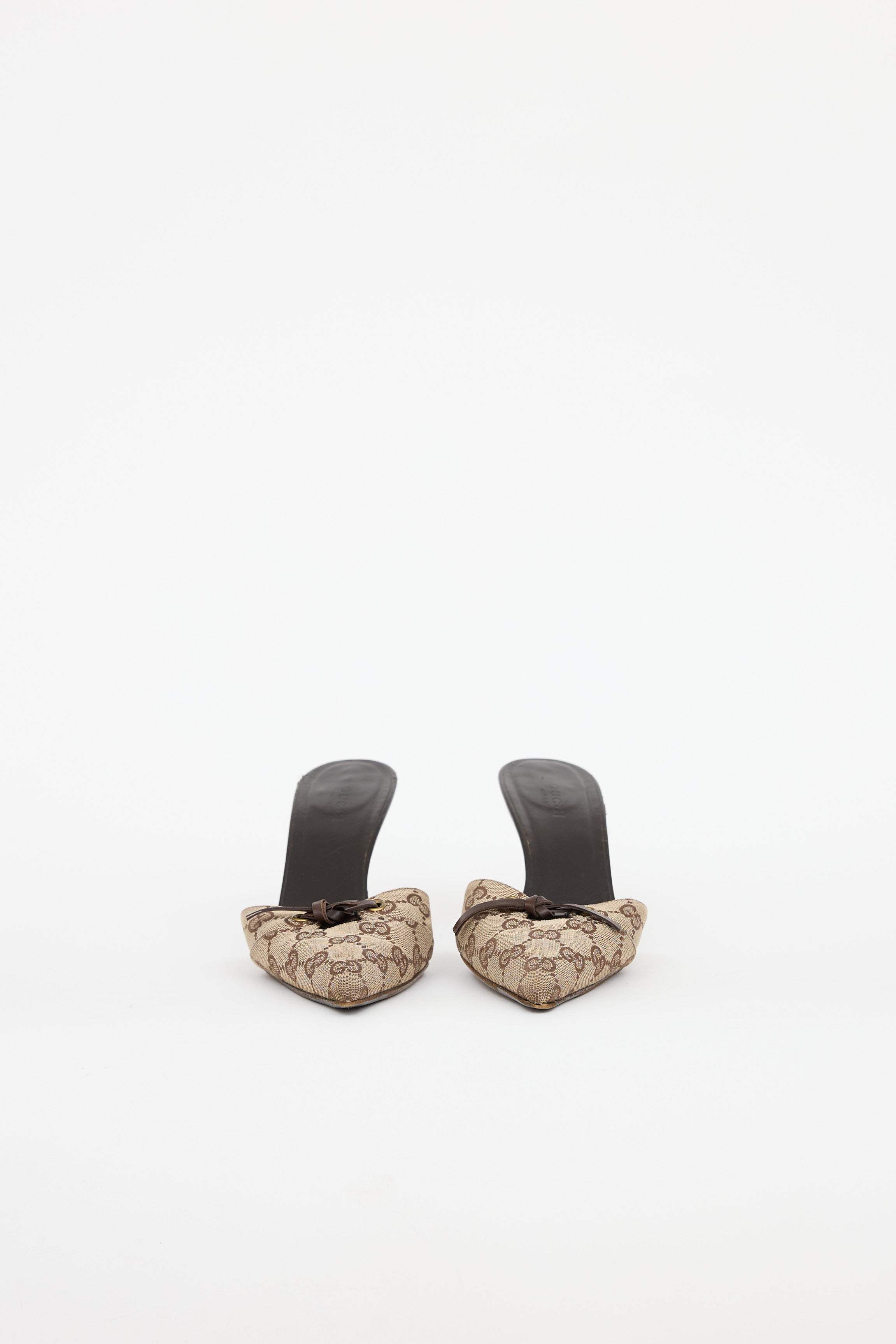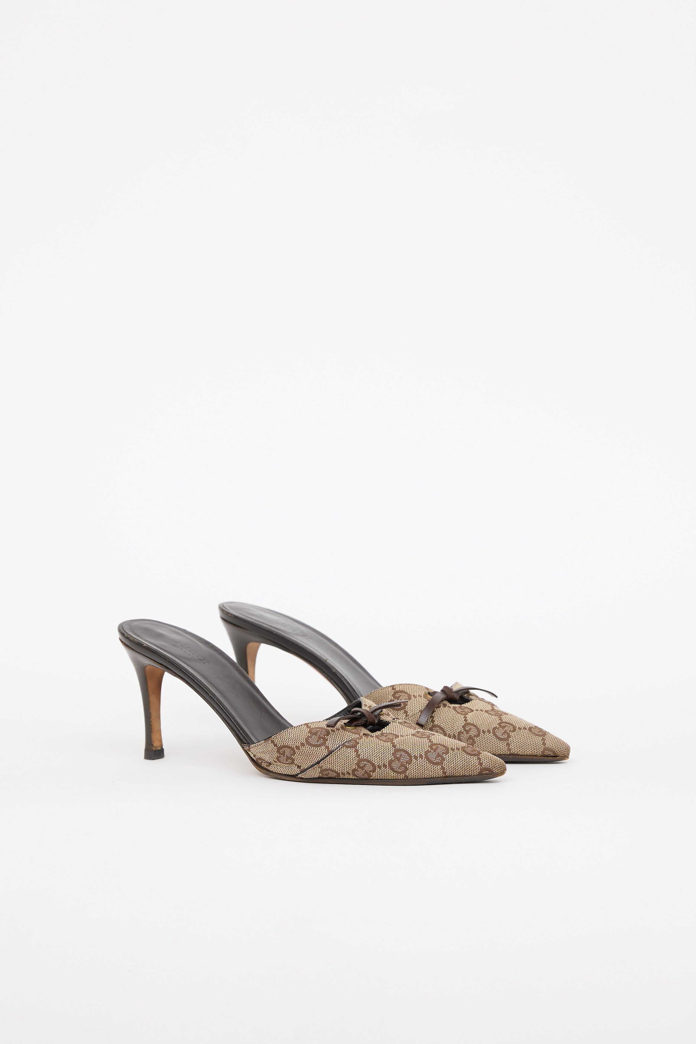 Pre-owned Gucci brown GG Canvas monogram mules featuring pointed toe, brown leather bow at vamp, and covered heel.