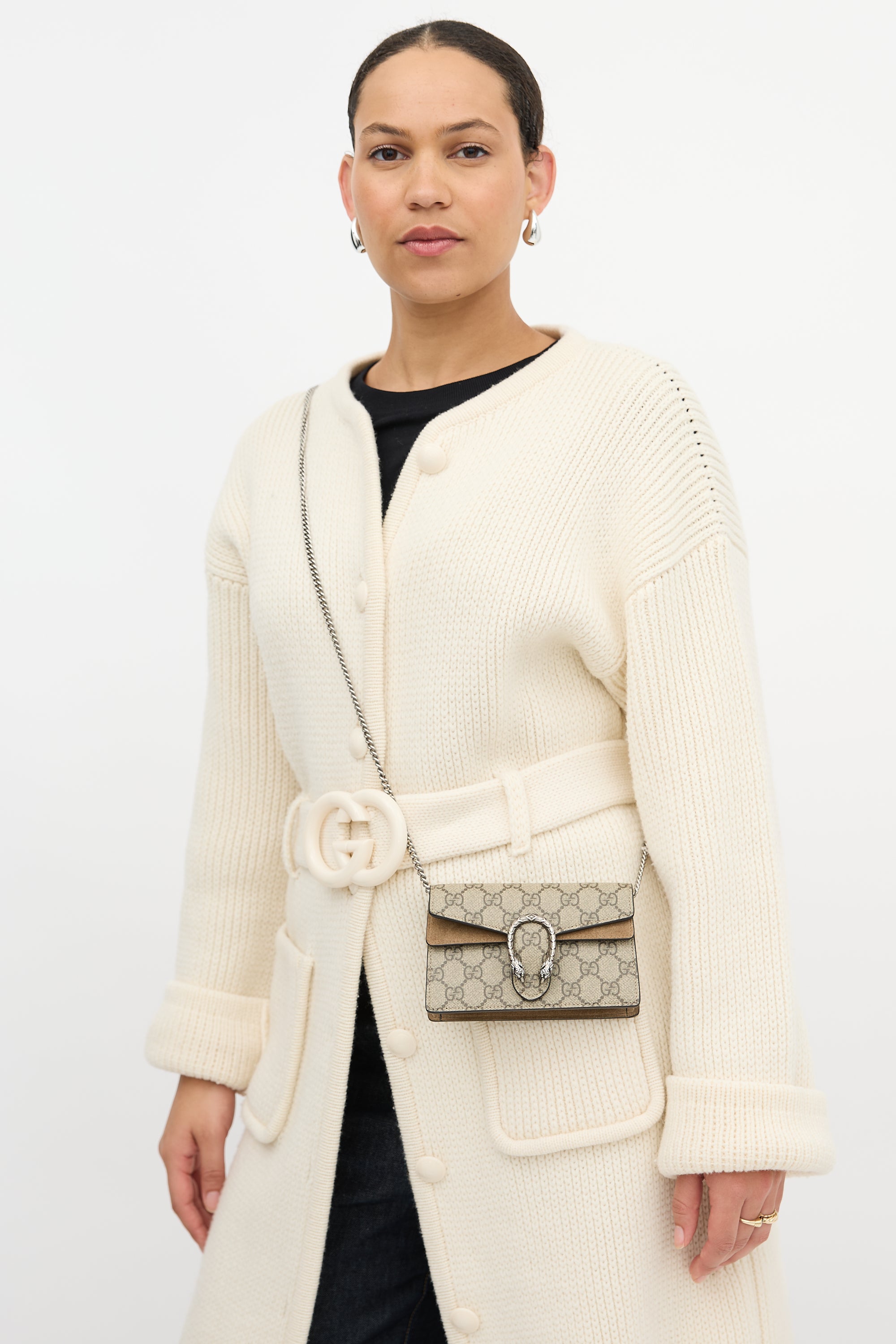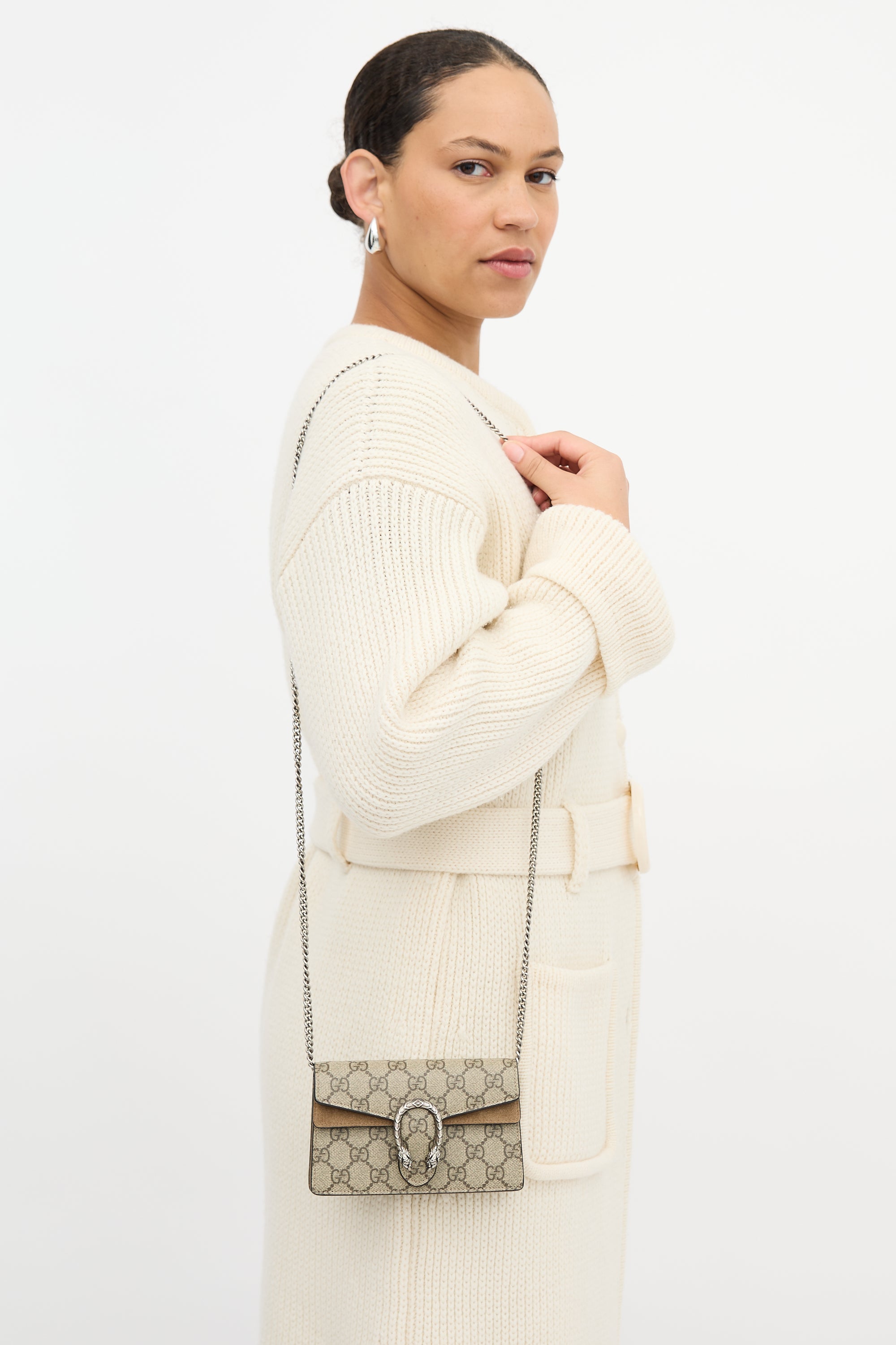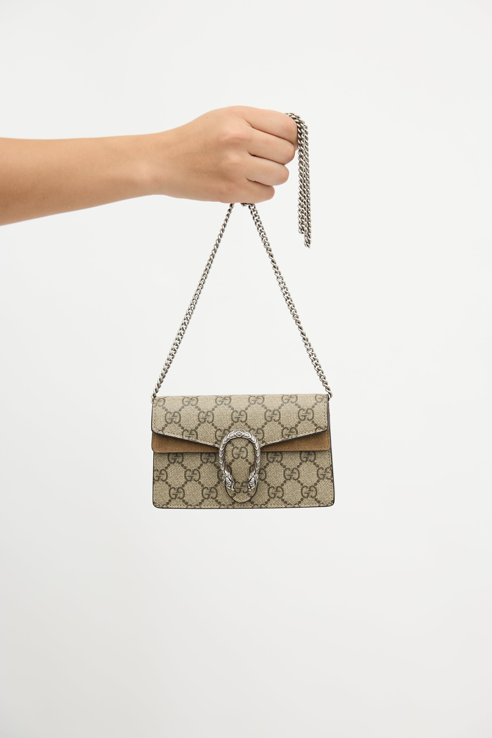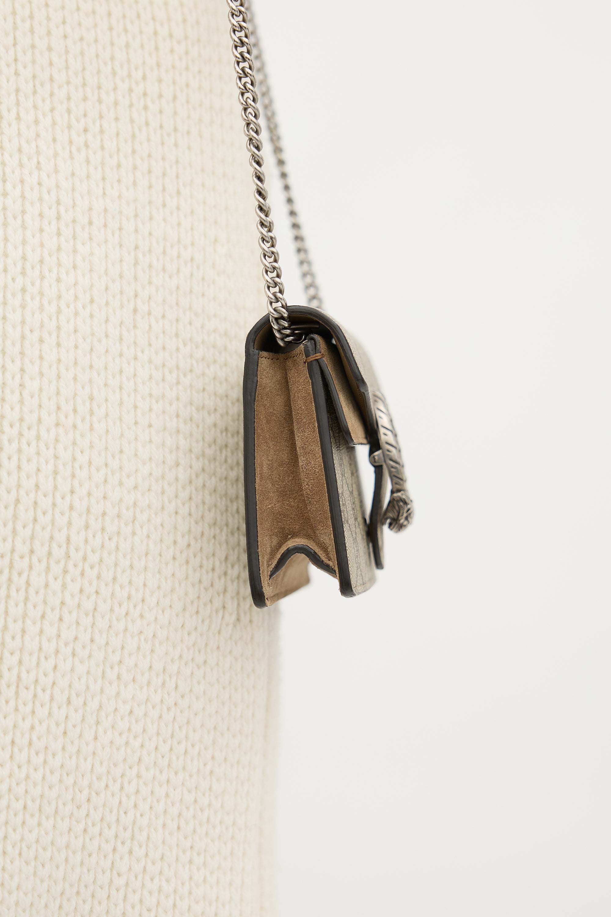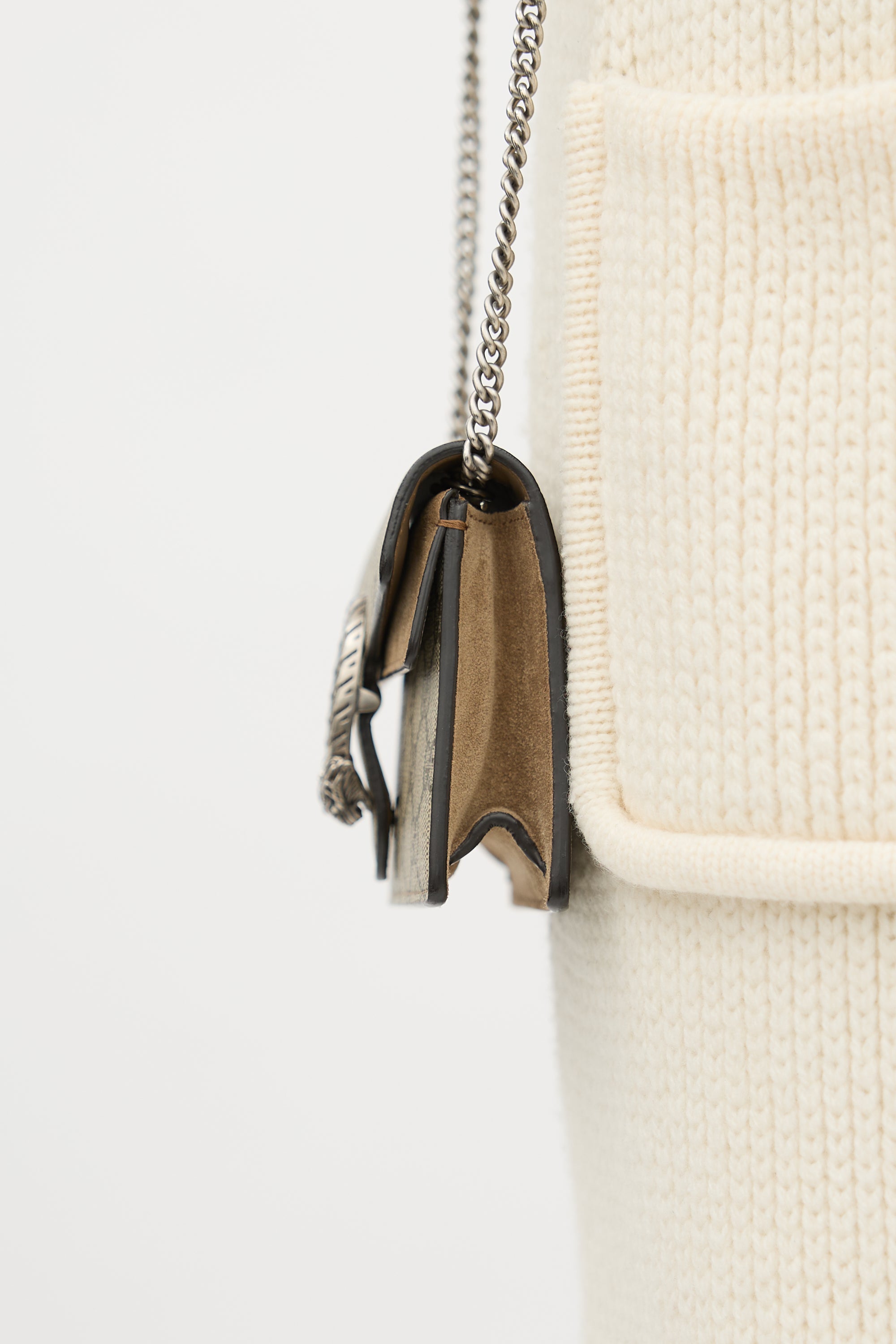 Pre-owned Gucci beige Dionysus mini bag in GG Supreme monogram coated canvas, silver tone hardware, chain link shoulder strap, top flap with tiger head hardware, snap button closure, under flap pocket with brown suede trim, lobster clasp interior keychain, and one main compartment. Comes with original dust bag and box.
