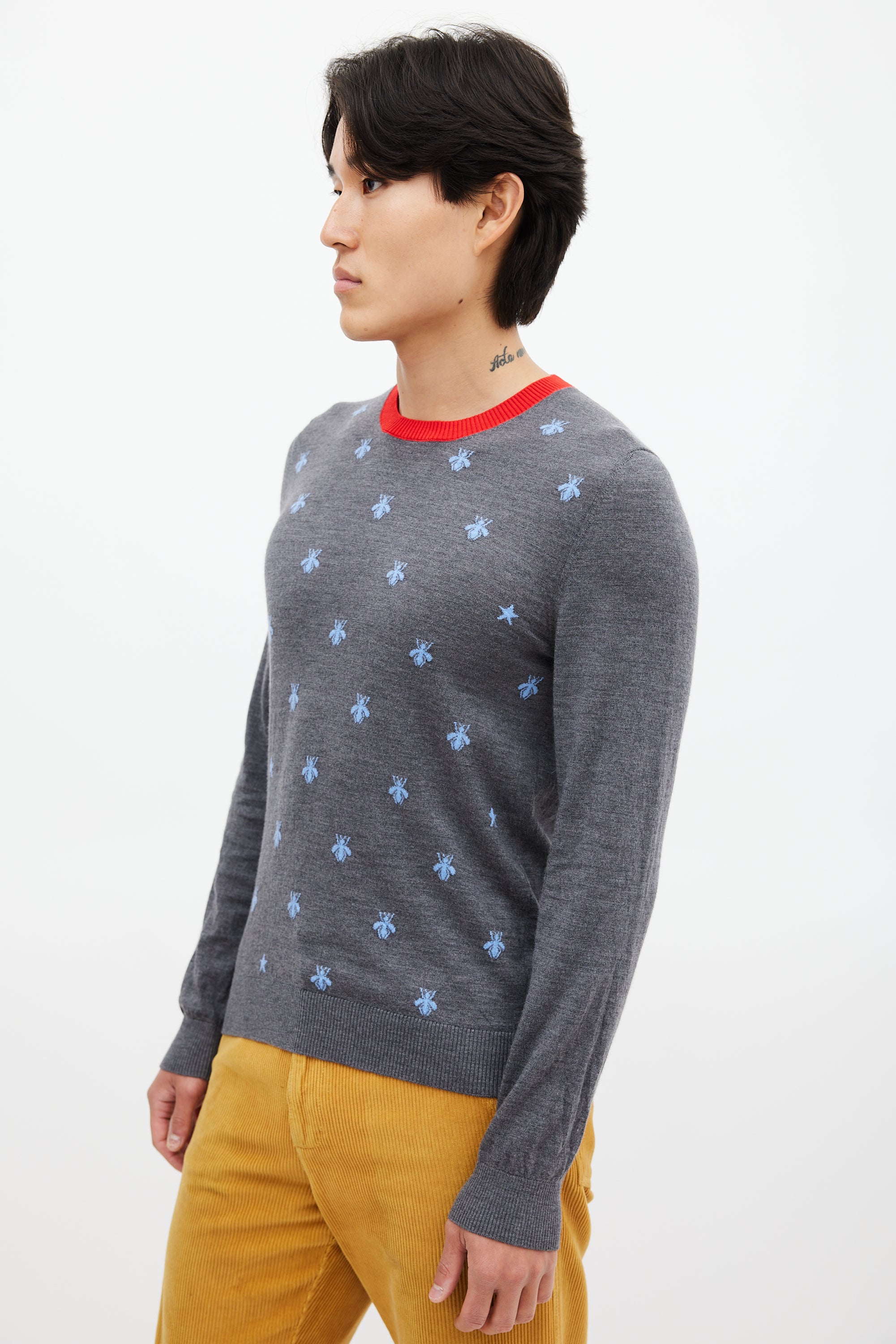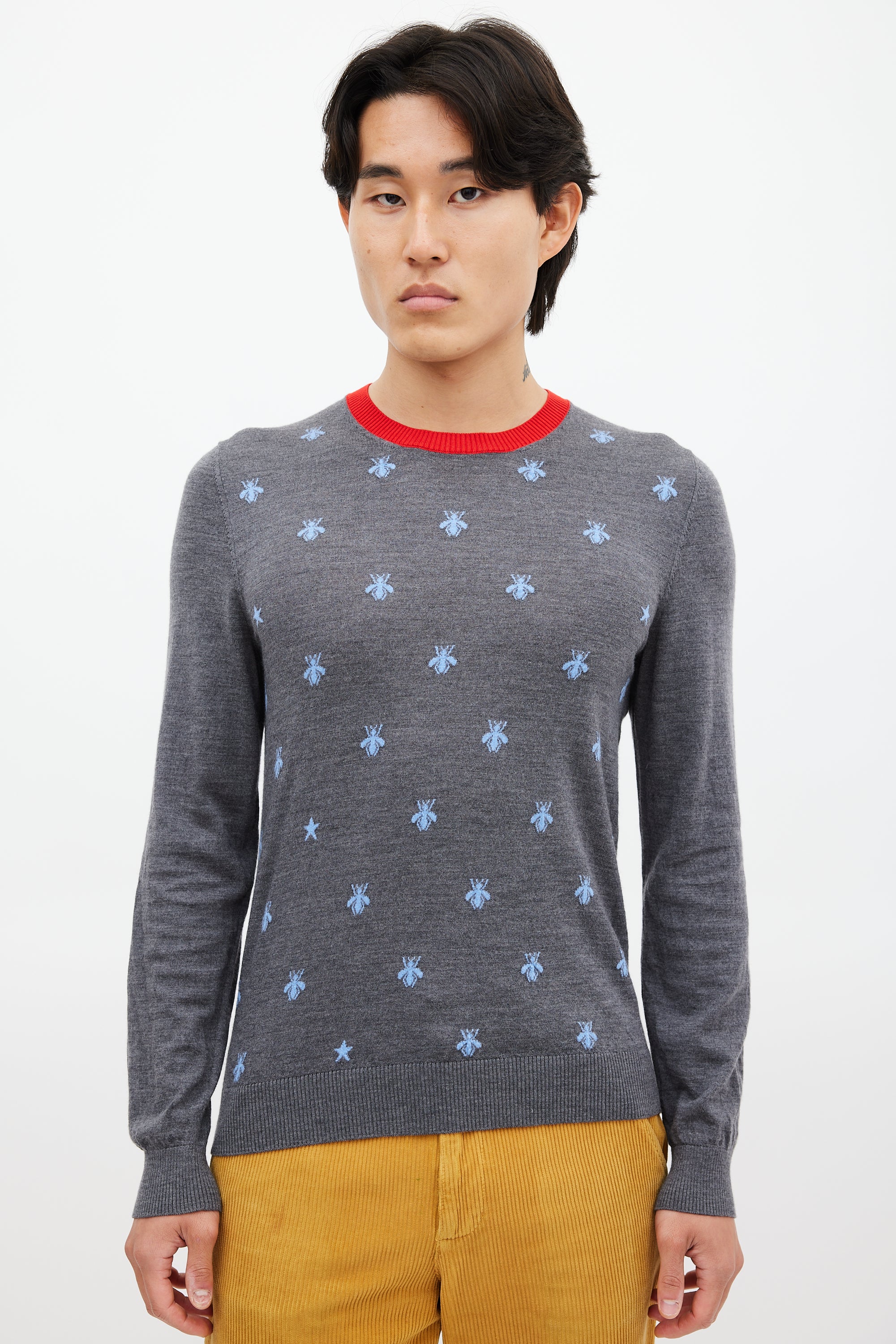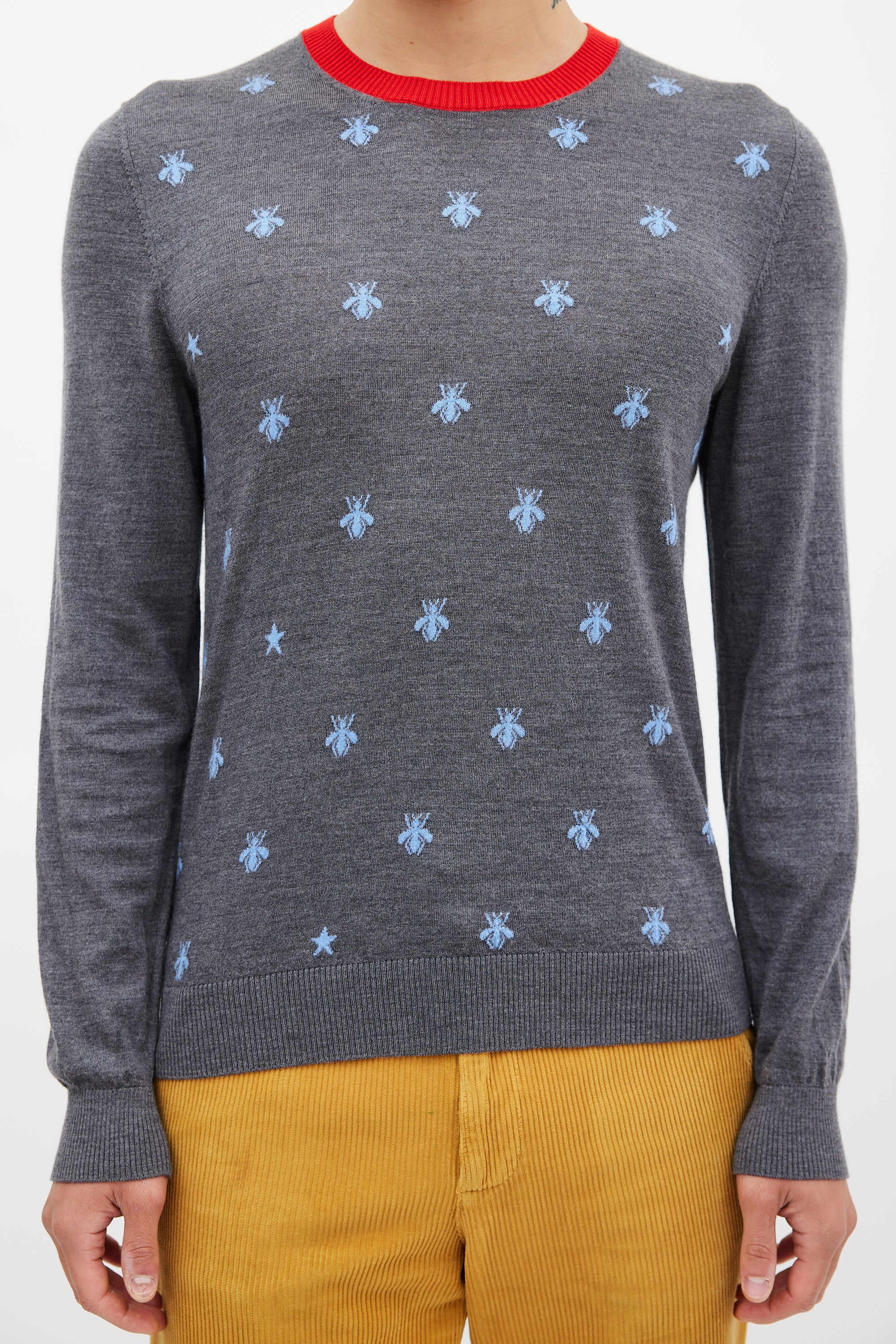 Pre-owned Gucci grey knit sweater featuring a blue bee pattern throughout, red round neckline, long sleeves, and ribbed hem.