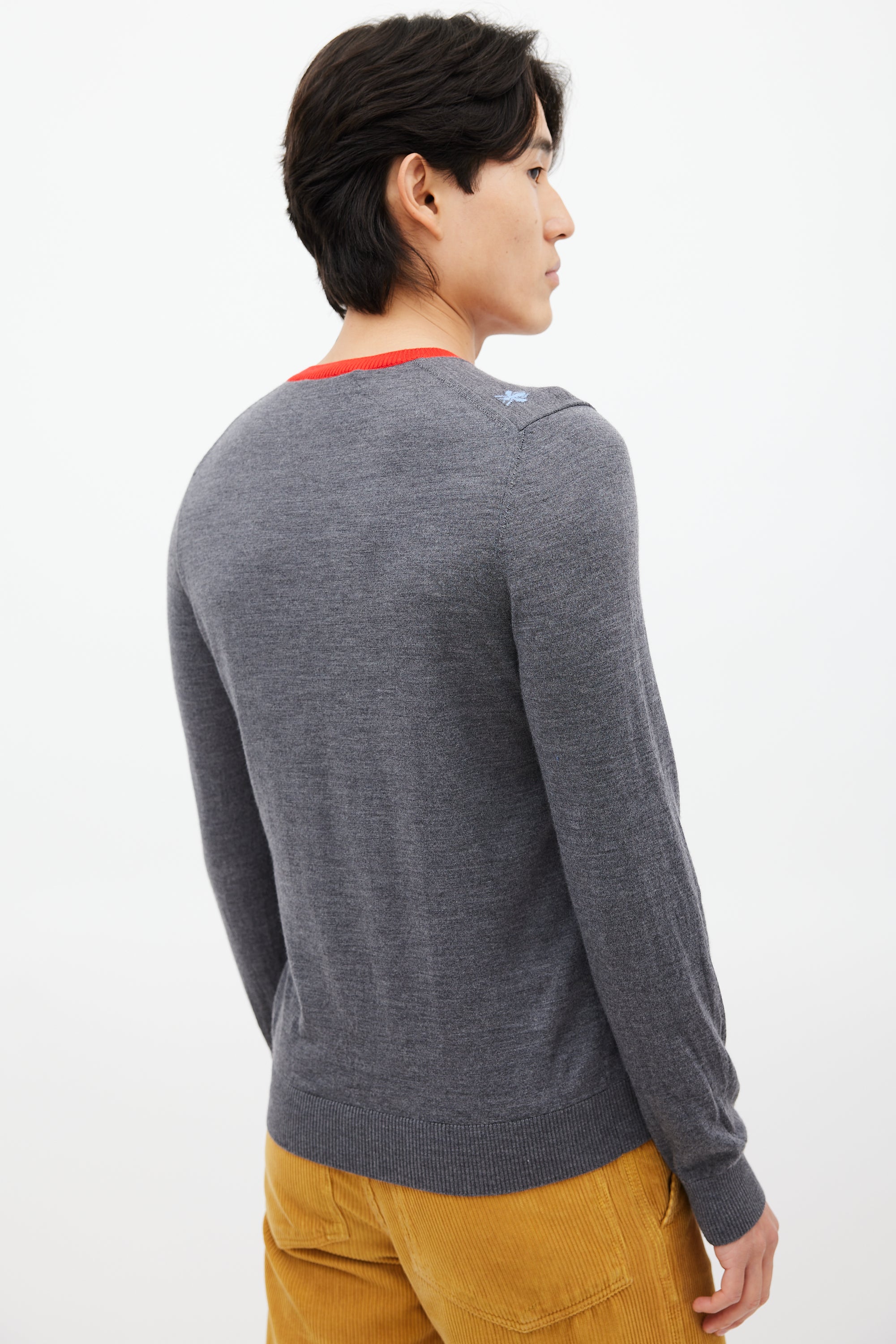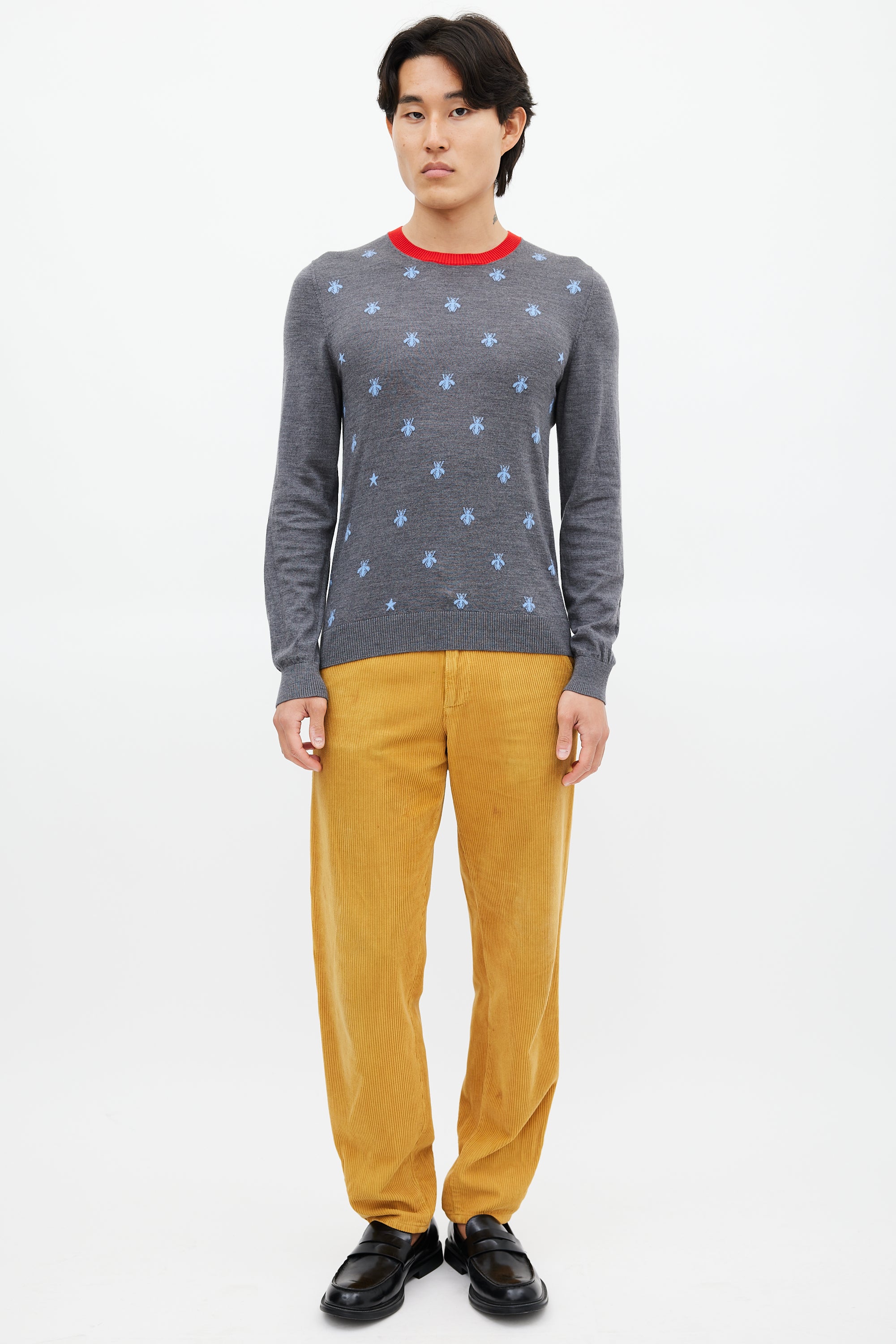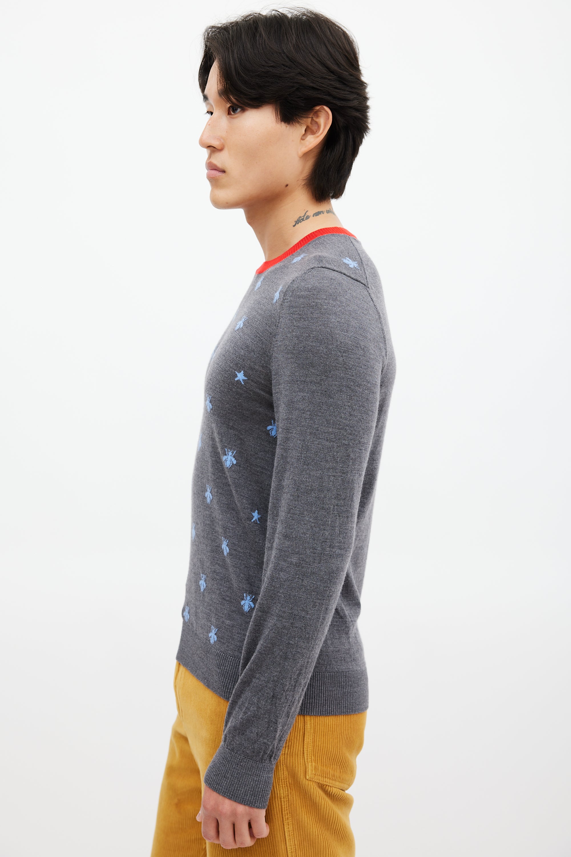 Pre-owned Gucci grey knit sweater featuring a blue bee pattern throughout, red round neckline, long sleeves, and ribbed hem.