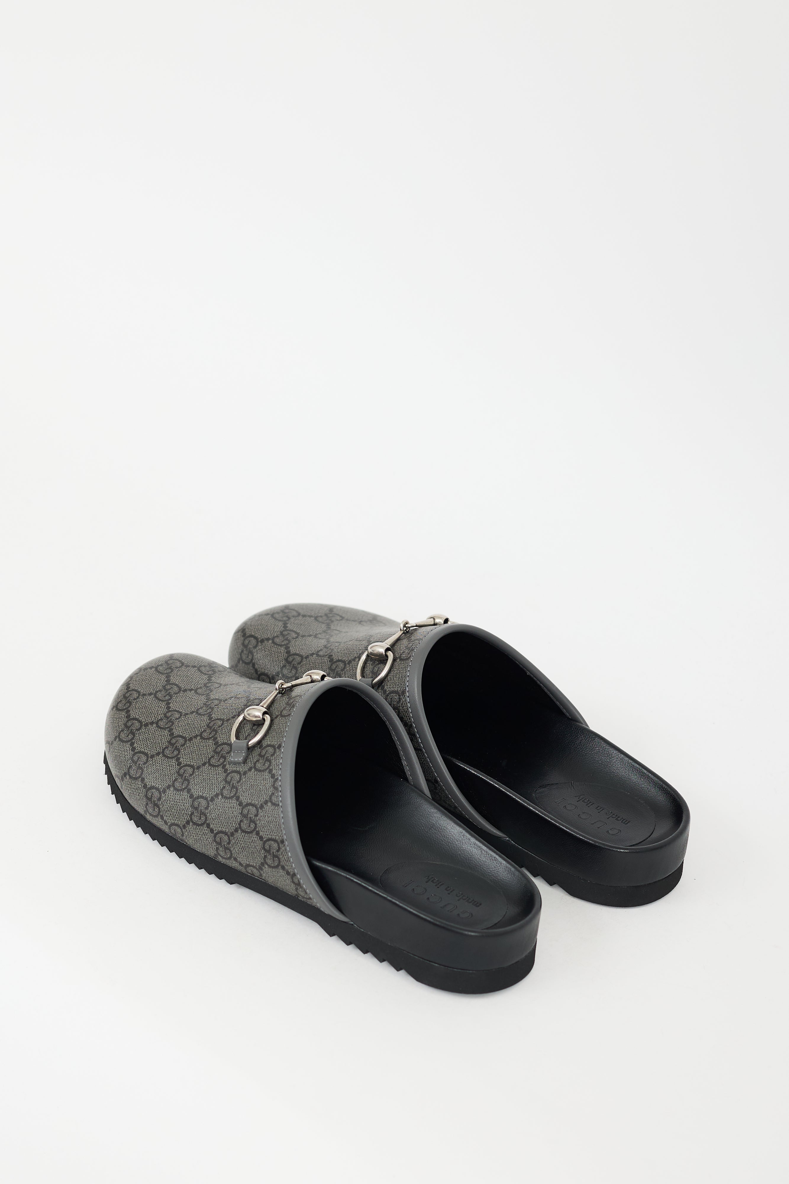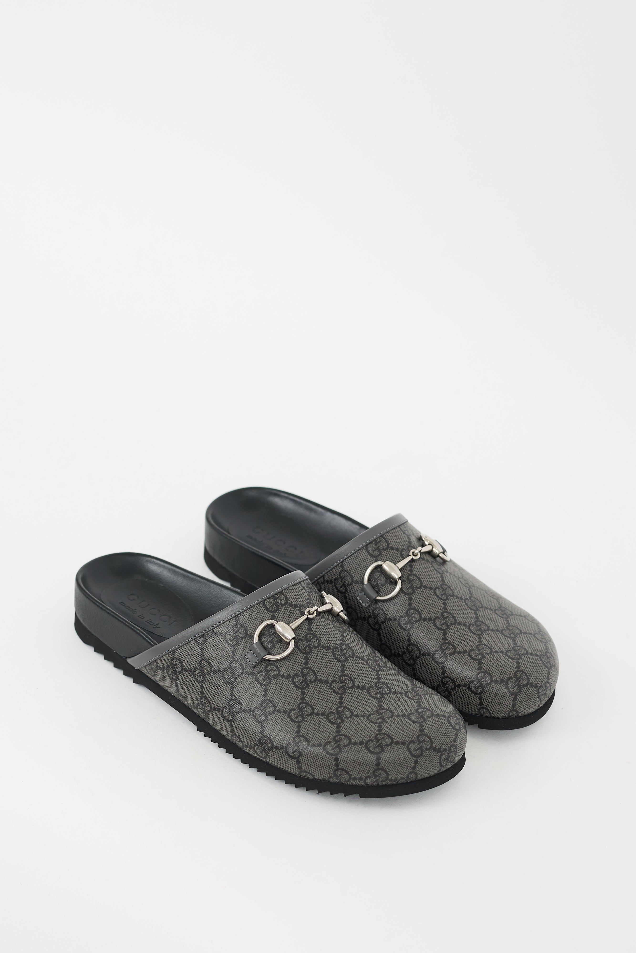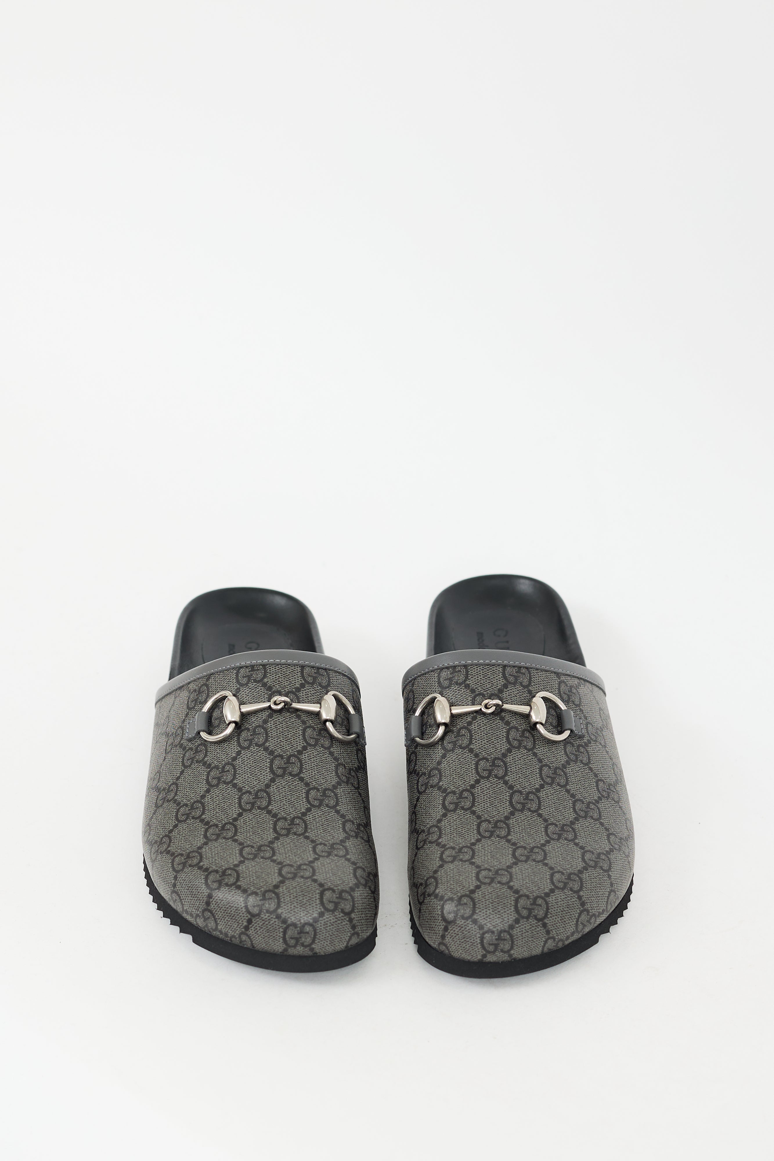 Pre-owned Gucci grey mules featuring a rounded toe, GG Supreme Canvas upper, silver tone Horsebit hardware at vamp, leather footbed, and treaded rubber outsole. Comes with original box and dustbags.
