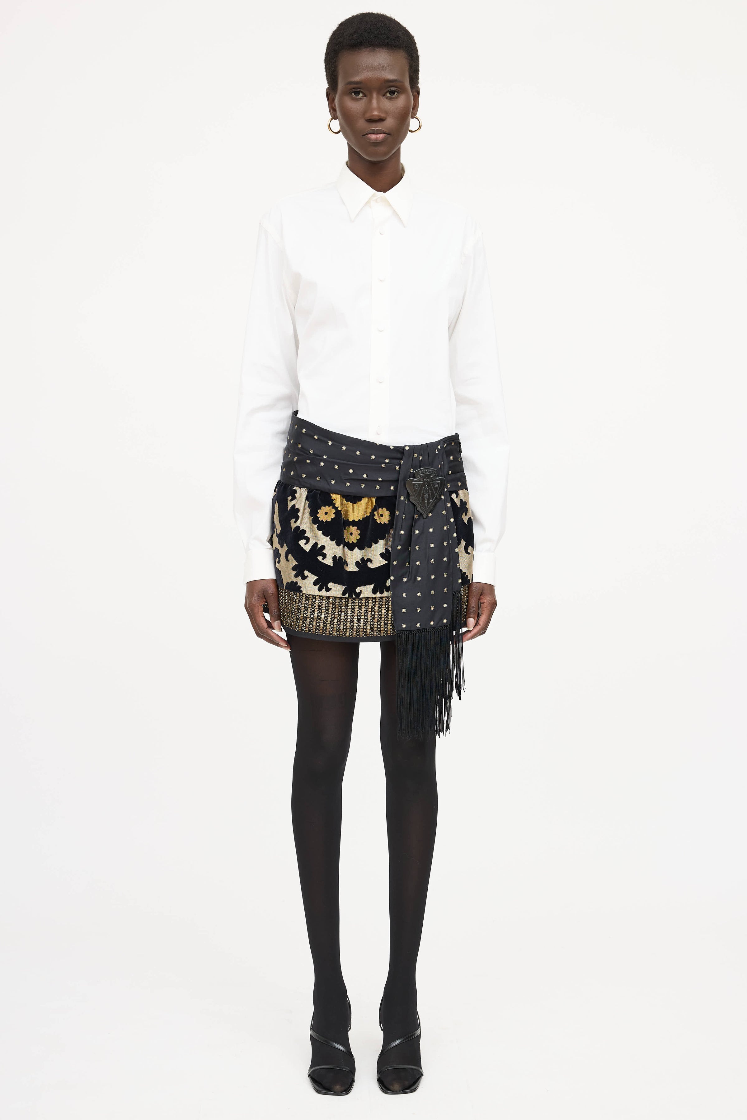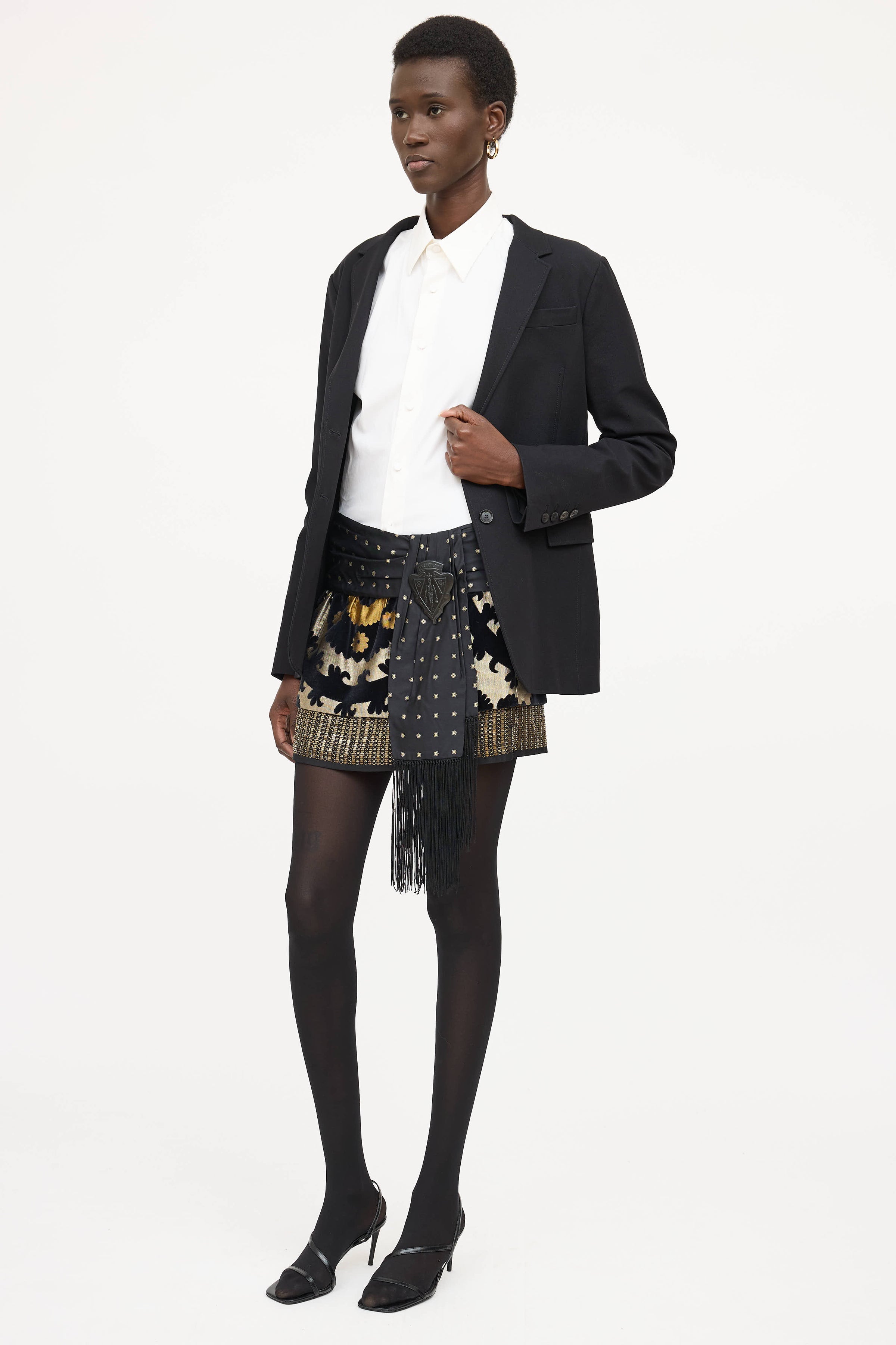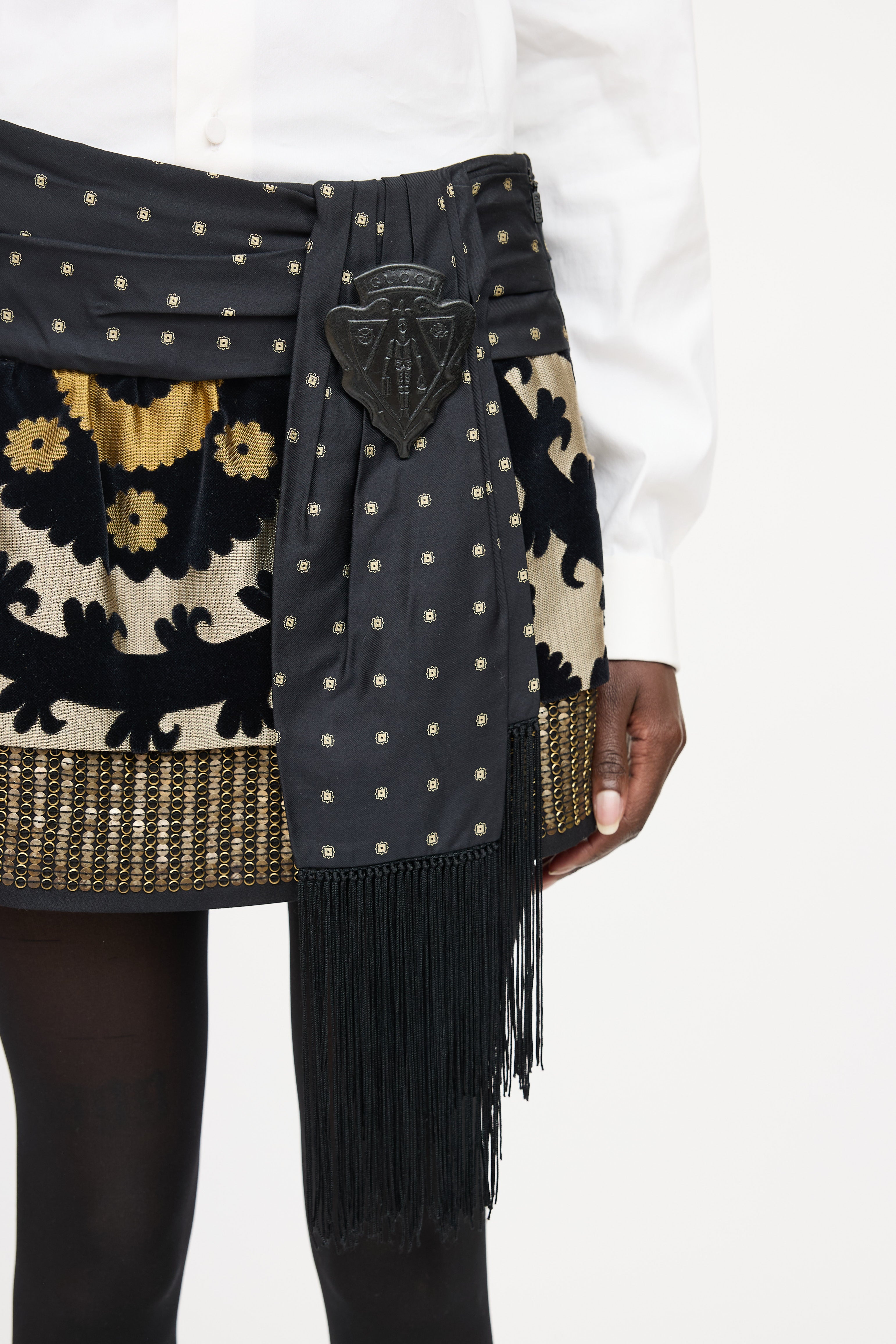 Pre-owned Gucci black and gold mini skirt featuring layered velvet floral brocade, attached gathered waist tie with fringed edge, removable leather emblem pin at hip, gold tone chain link.