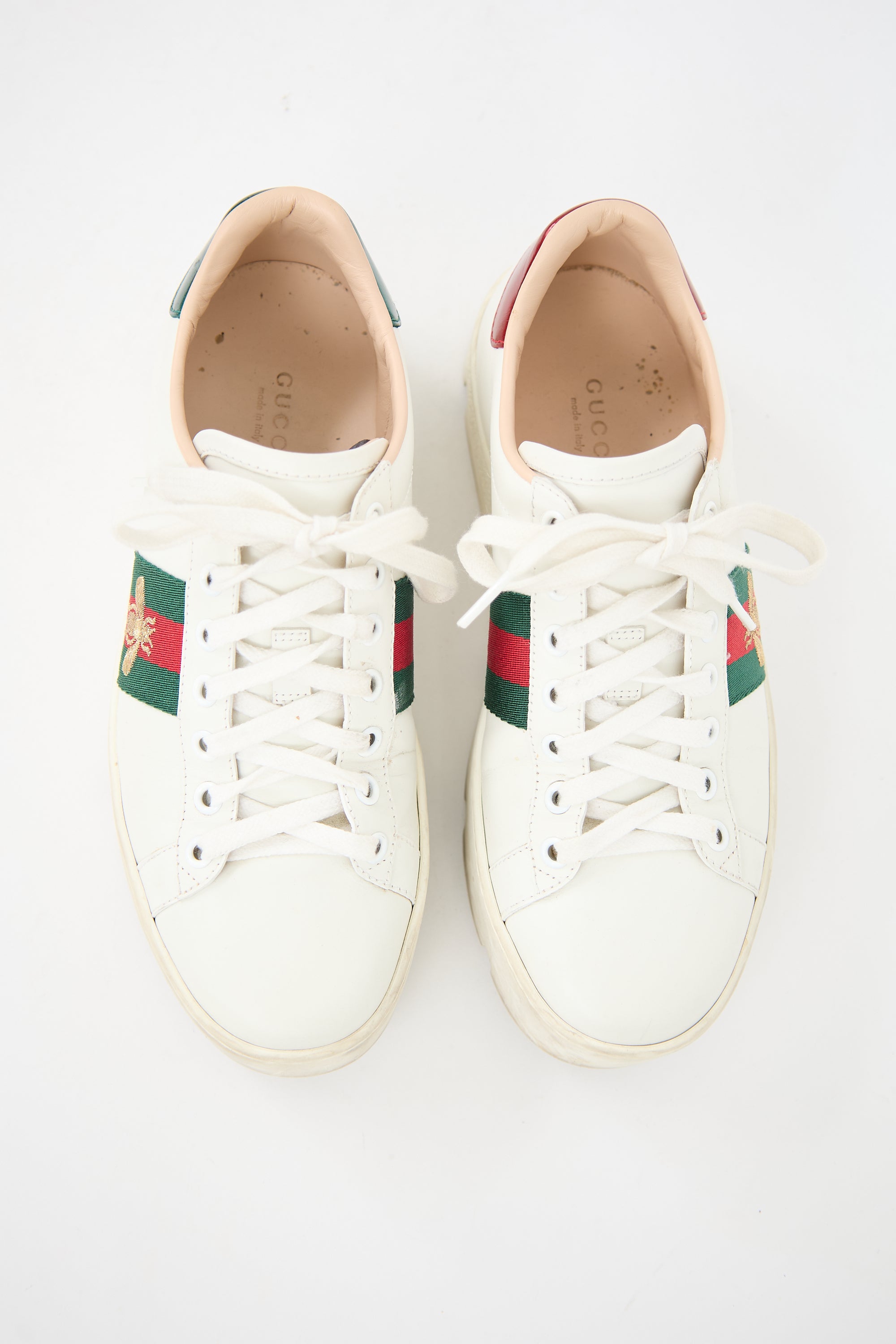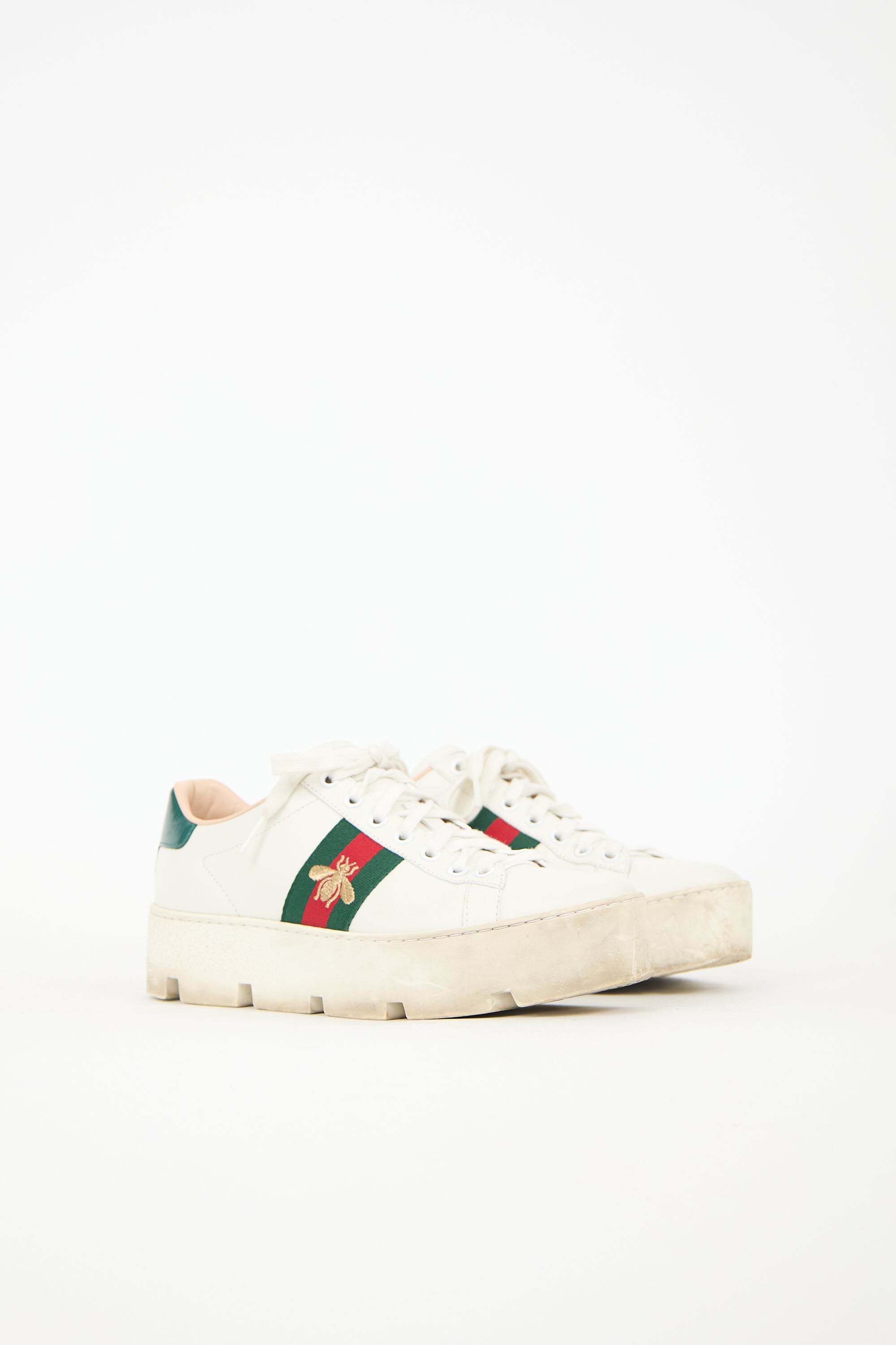 Pre-owned Gucci white leather Ace sneakers featuring rounded toe, lace up front, signature Web stripe at sides, gold tone embroidered bee at outer sides, metallic red leather left heel counter, metallic green leather right heel counter, and white treaded platform sole.