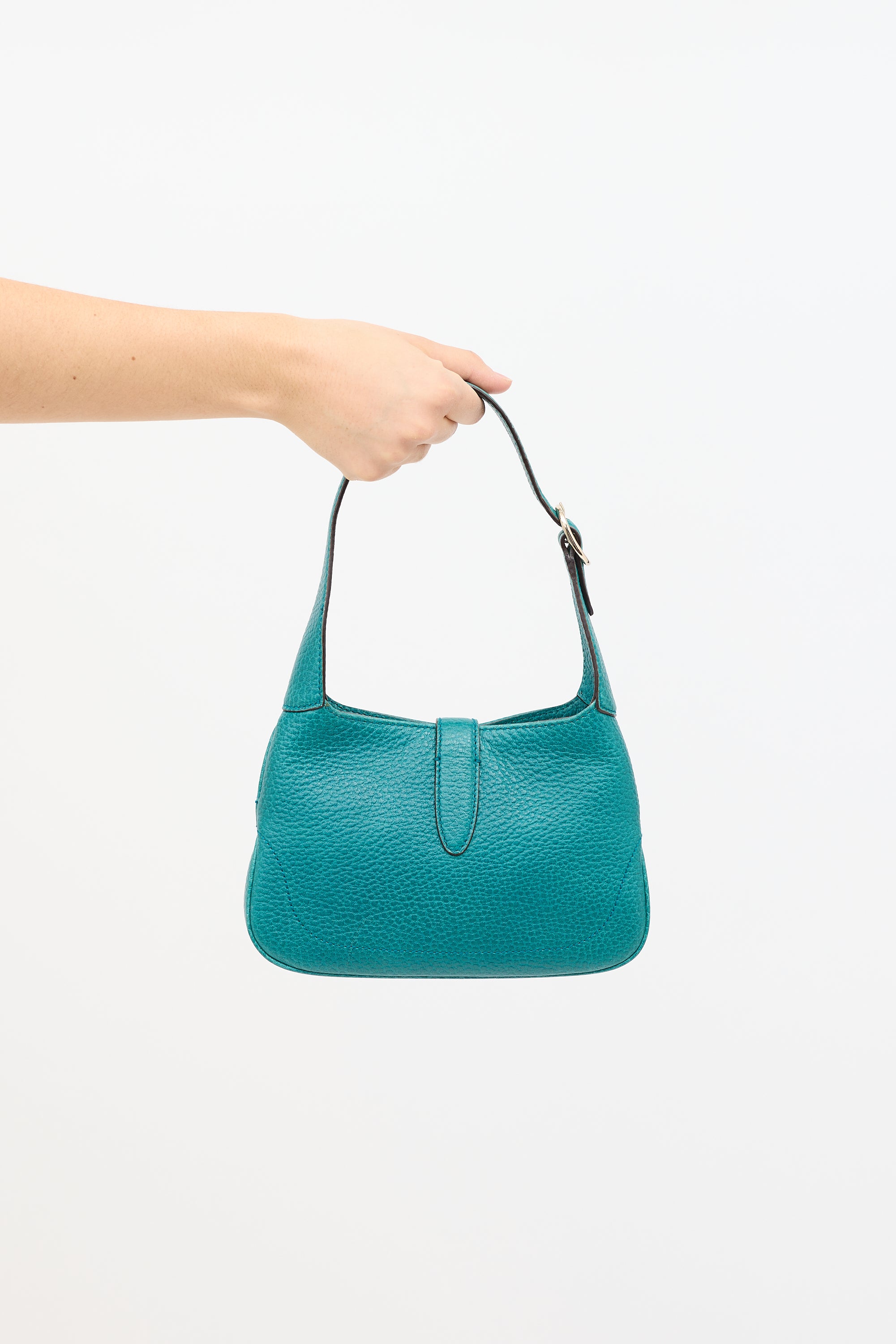 Pre-owned Gucci teal mini Jackie 1961 shoulder bag featuring pebbled leather, tonal stitching, silver tone hardware, single adjustable shoulder strap with stamped logo at under side, top strap with signature bamboo motif piston push lock closure, and one lined main compartment with one zip pocket. Comes with original dust bag.