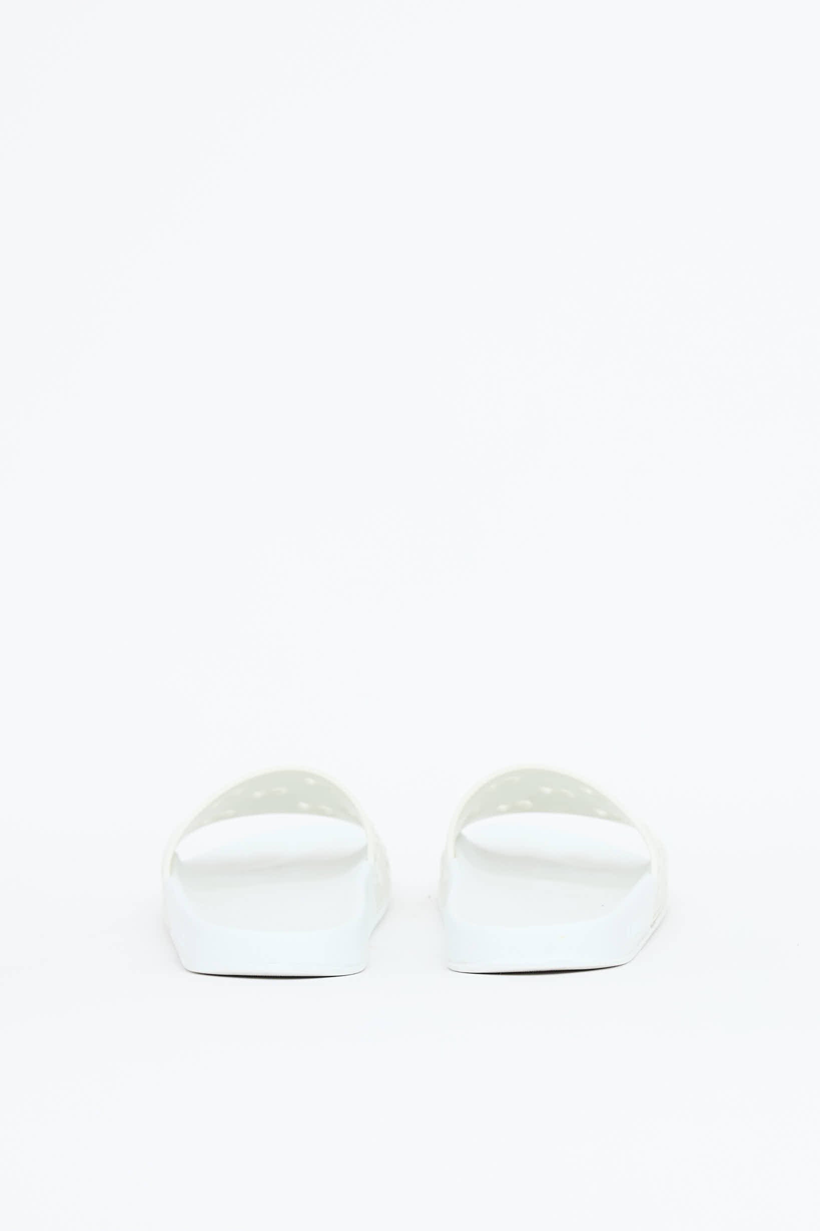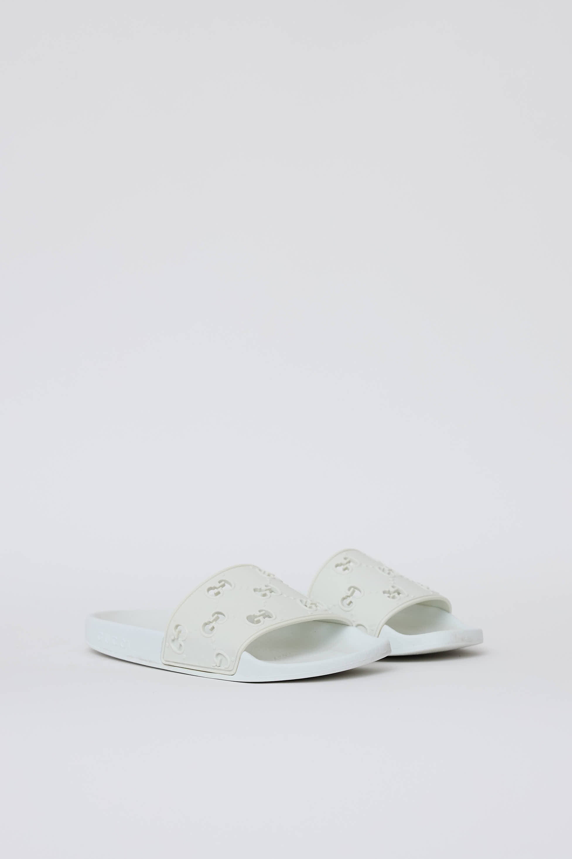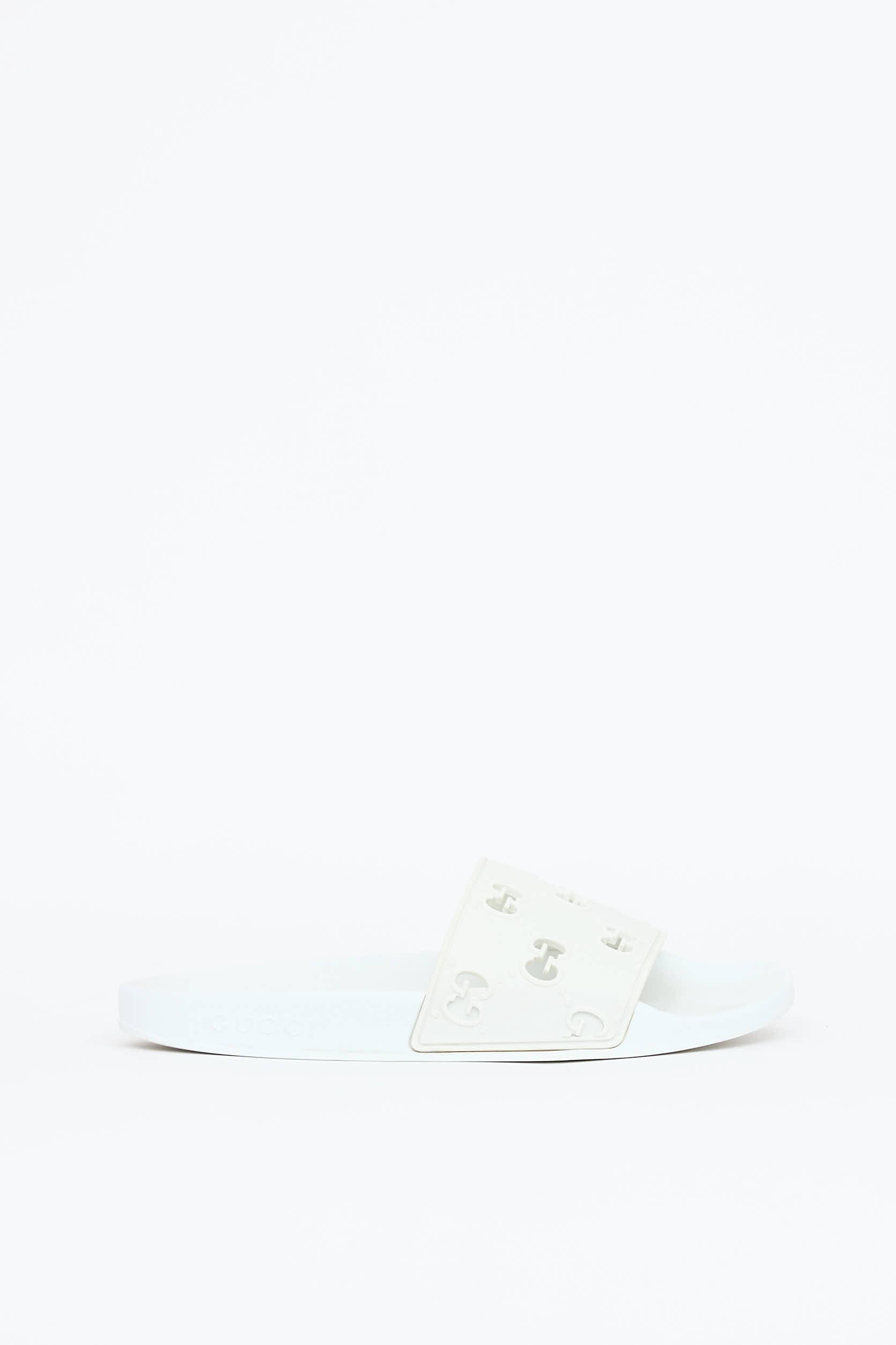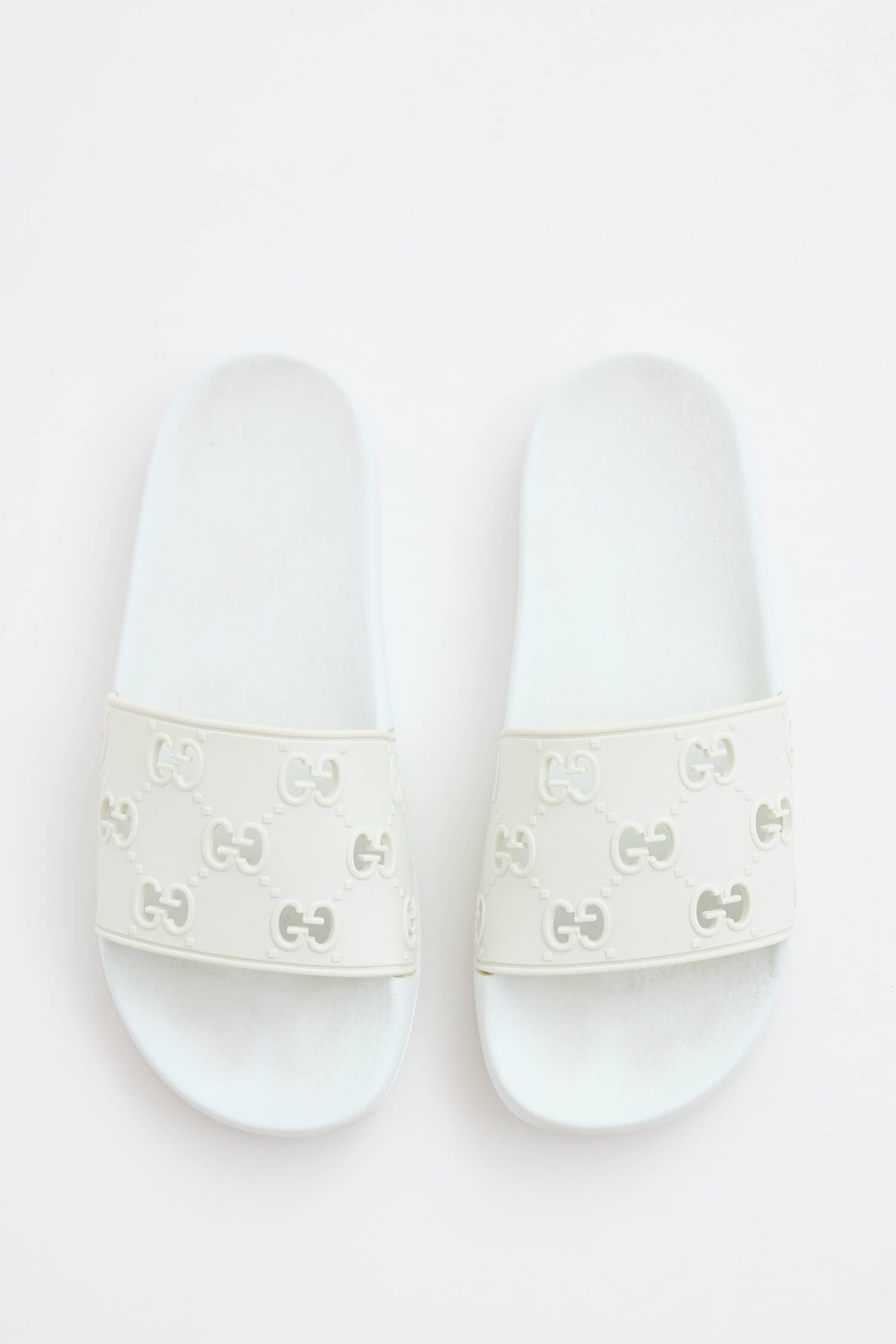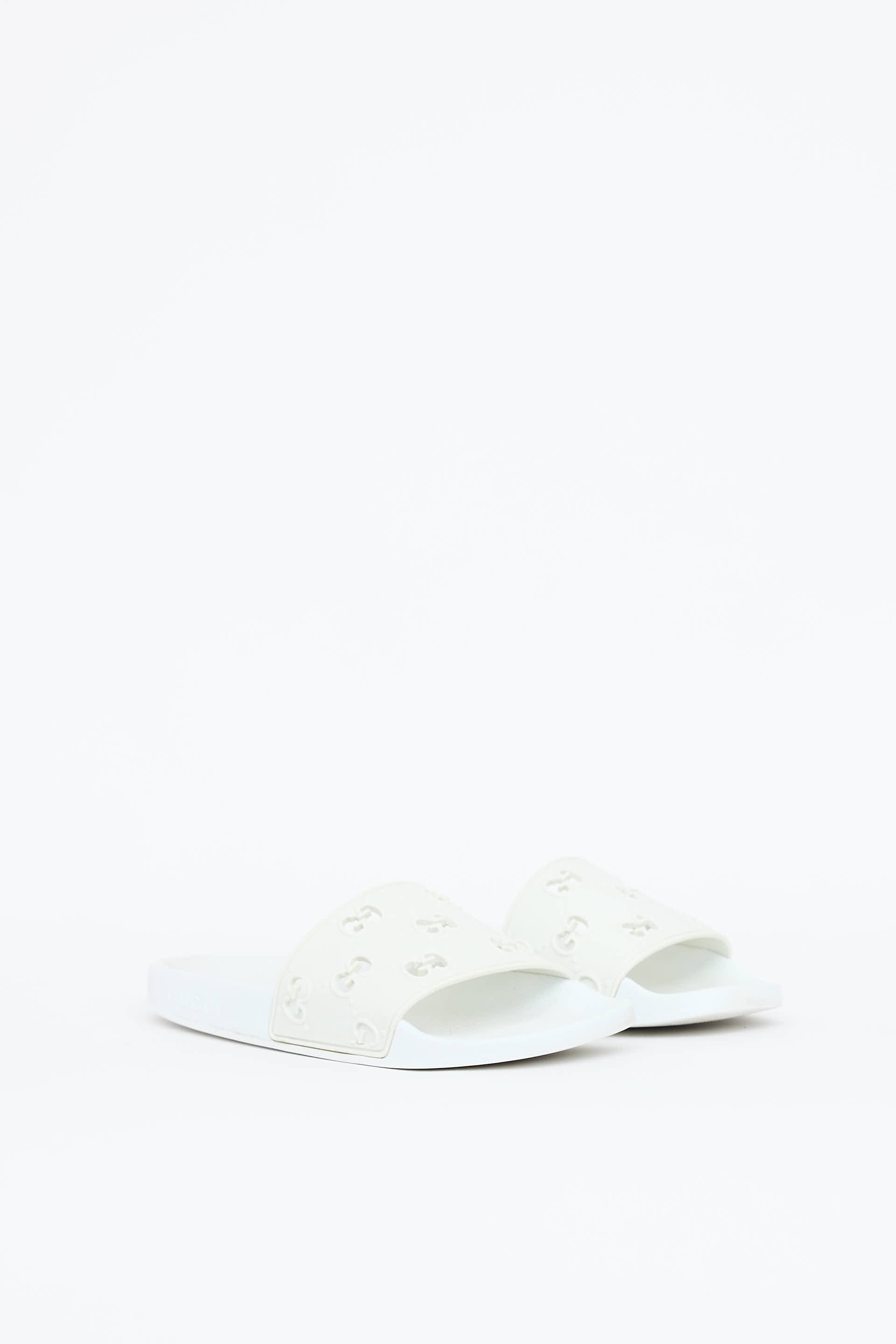 Pre-owned Gucci white rubber slides featuring an open rounded toe, strap across vamp with perforated GG monogram, and embossed logo at midsole.