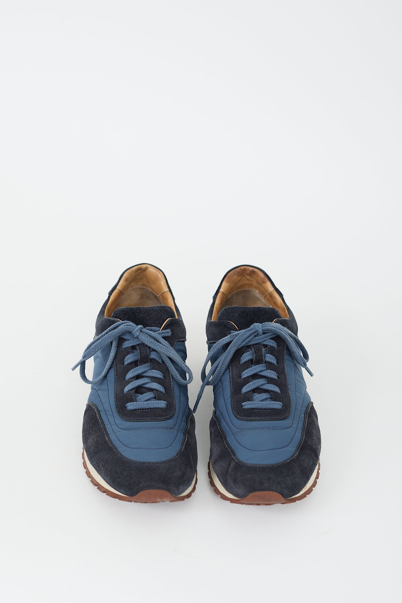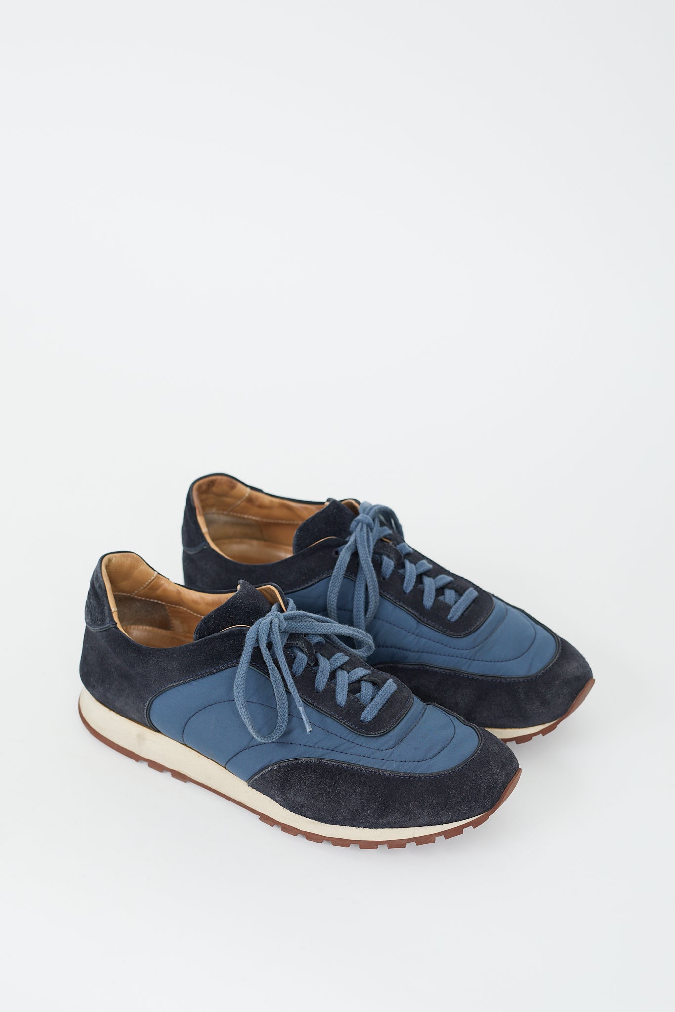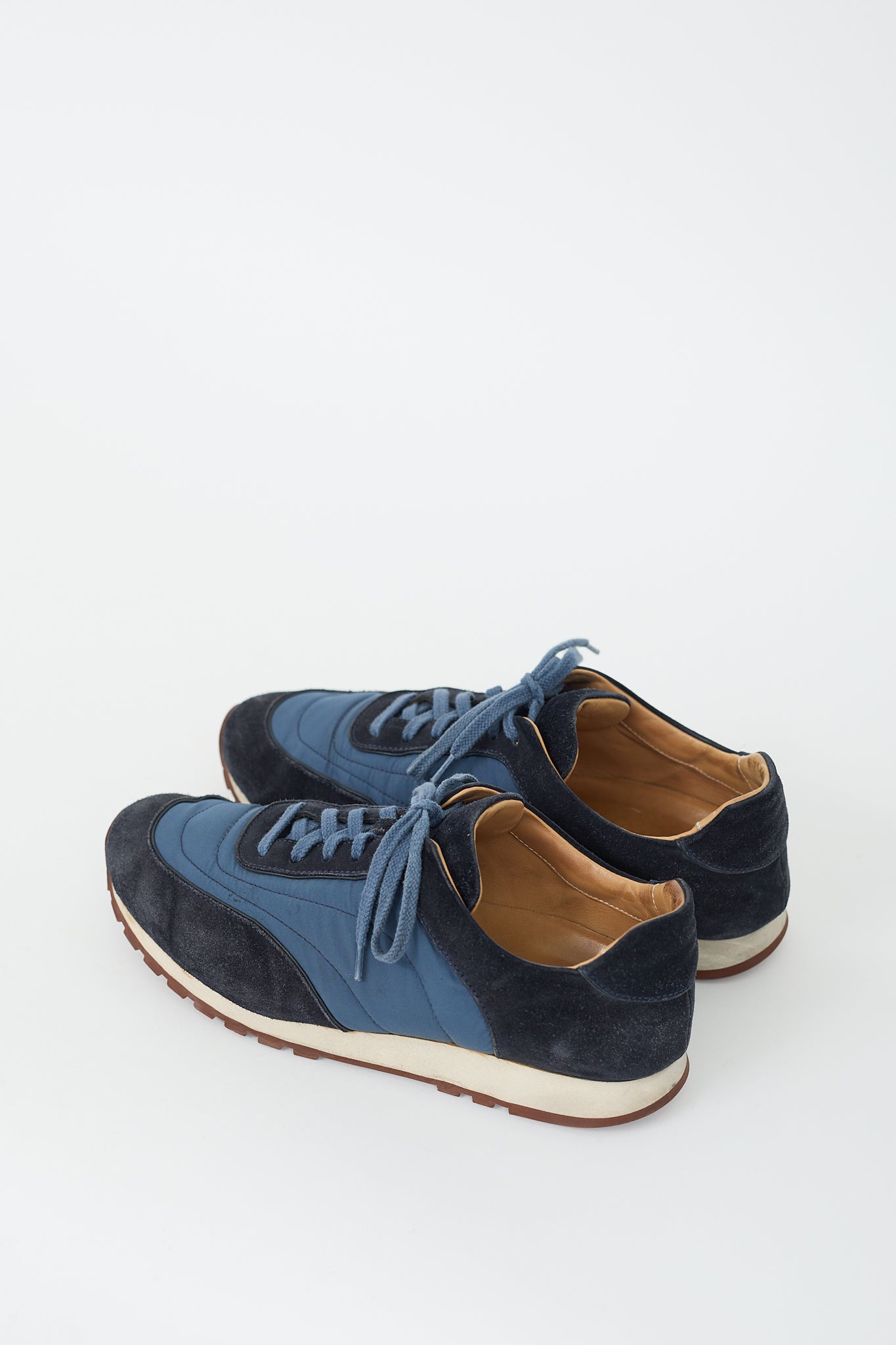 Pre-owned Loro Piana blue suede and nylon sneakers featuring rounded toe, tonal stitching throughout, lace up front, and leather insole.