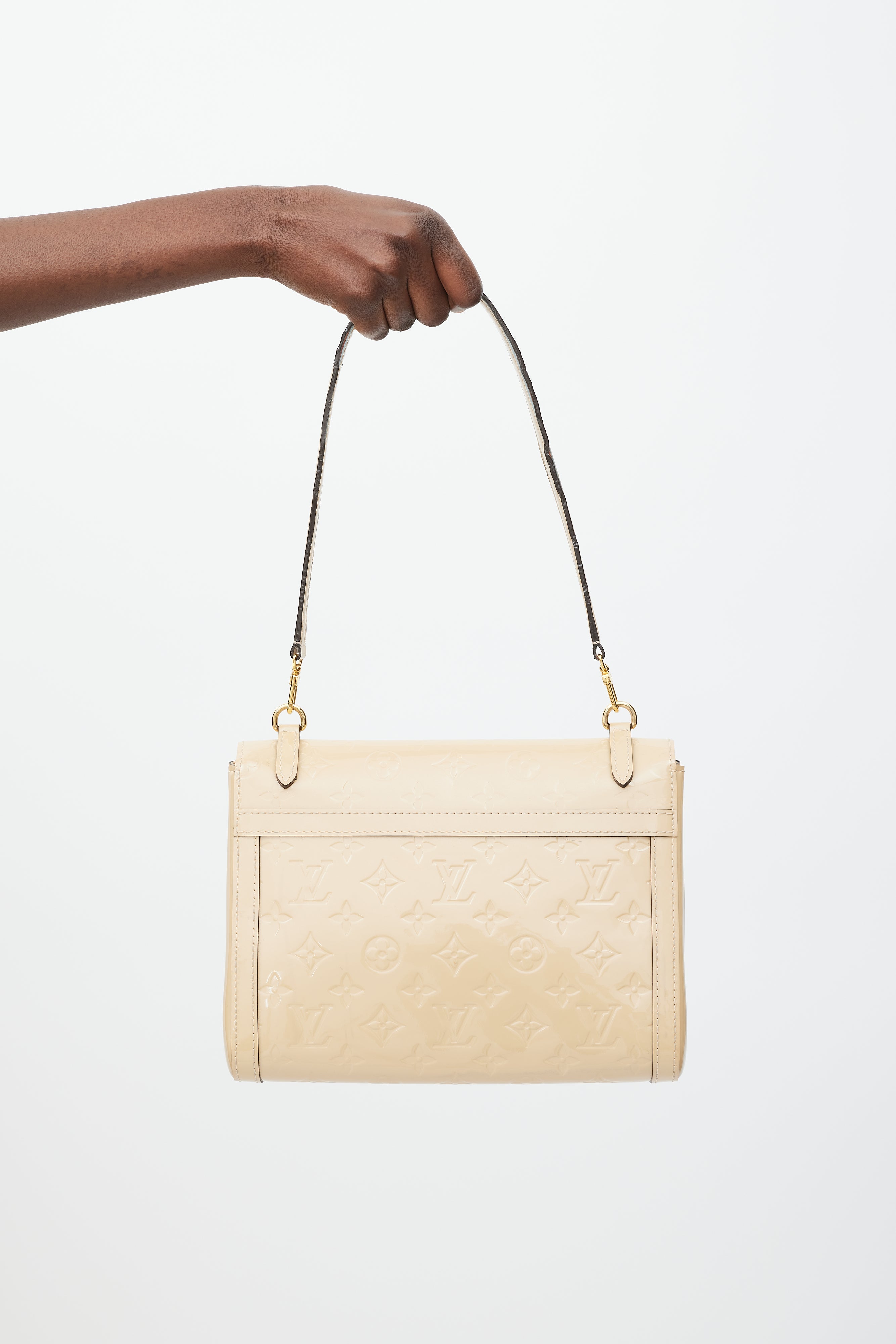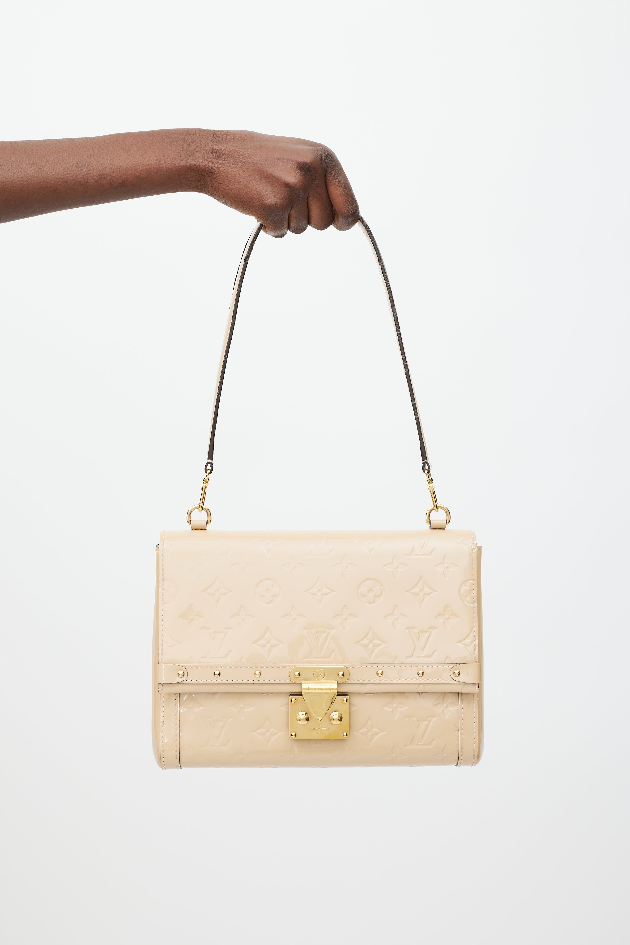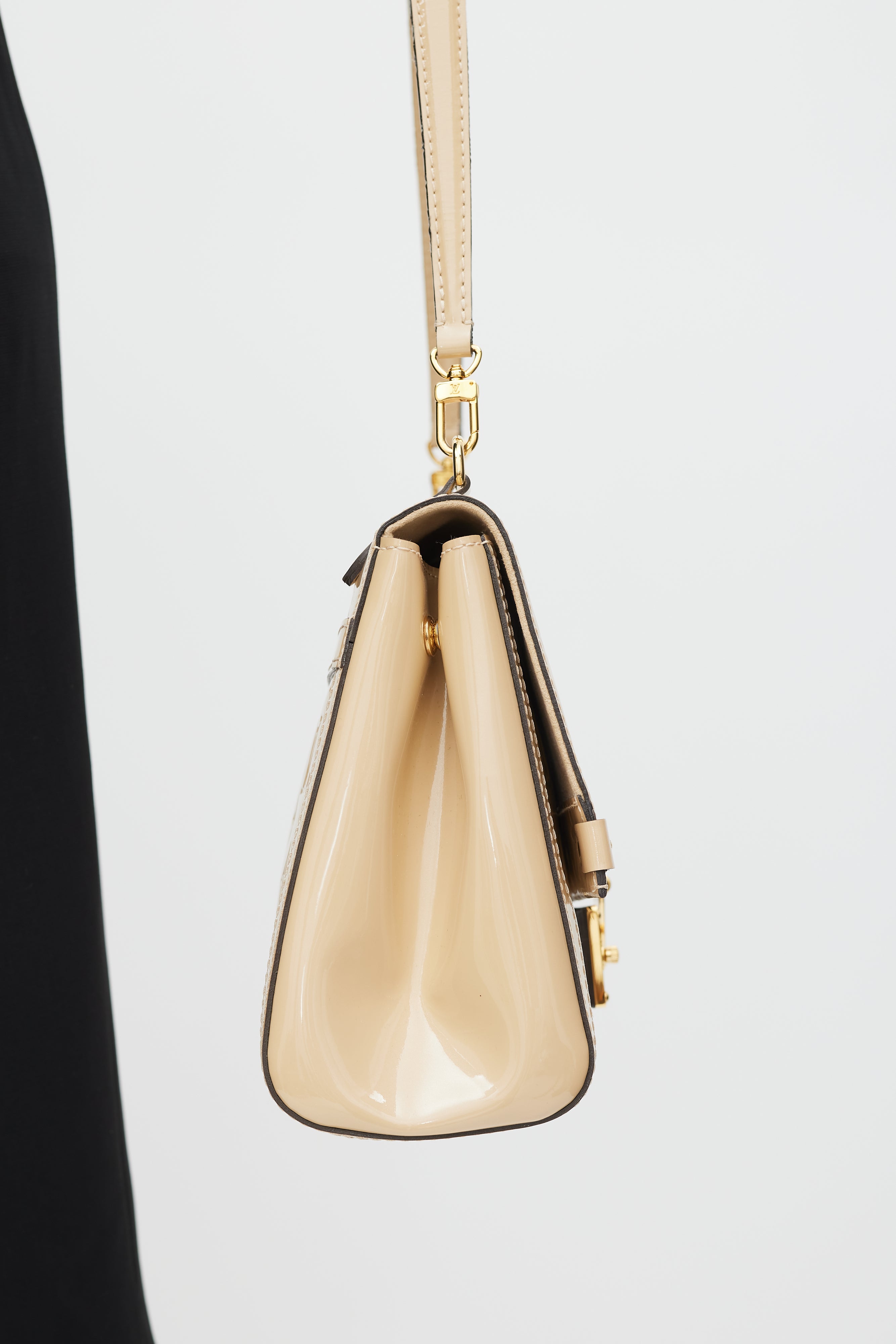 Pre-owned Louis Vuitton 2015 beige Venice Dune shoulder bag featuring signature Monogram Vernis leather, gold tone hardware, detachable shoulder strap, front flap with studded trim and pinch lock closure, and one lined main compartment with one zip pocket and two slip pockets. Comes with original dust bag.