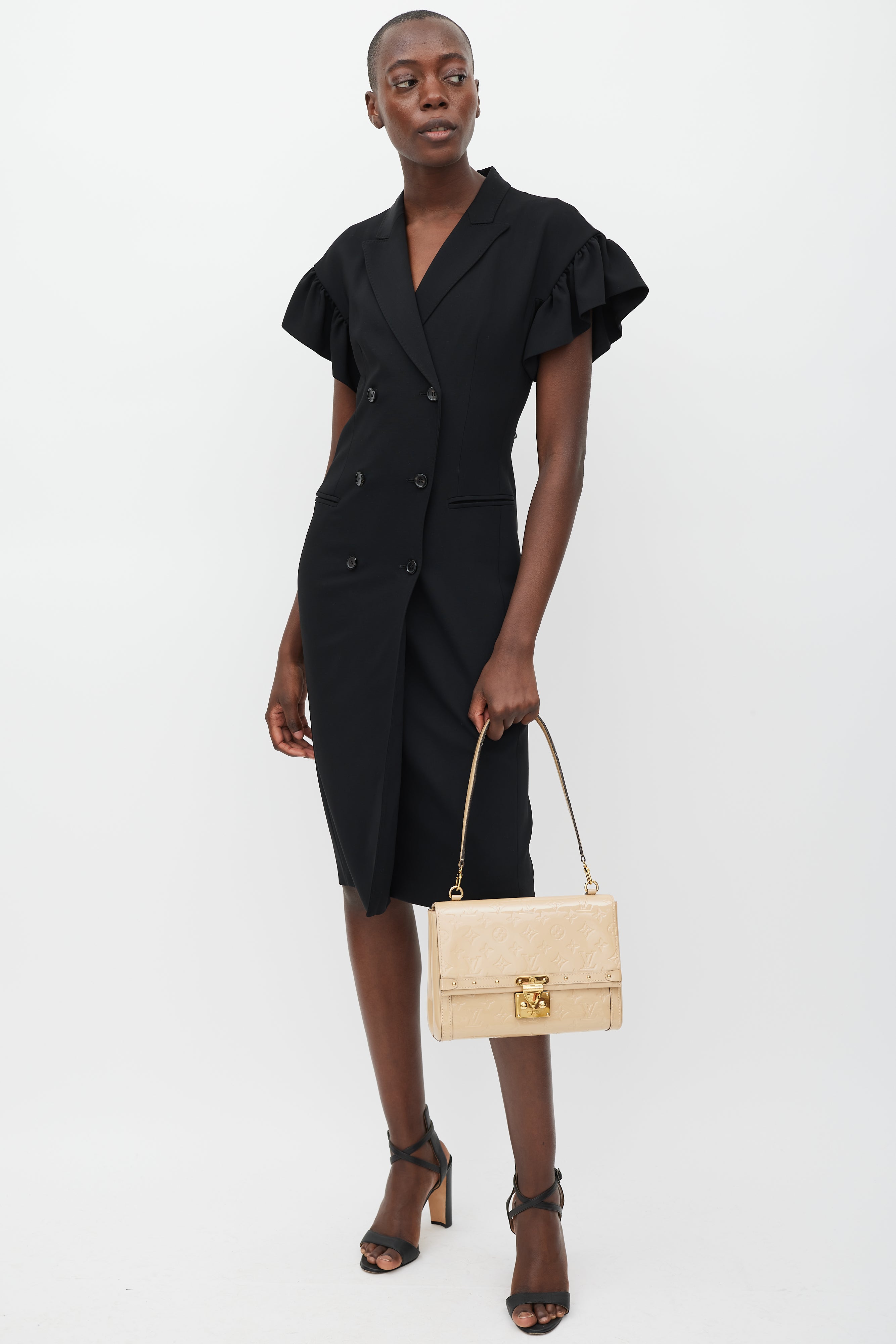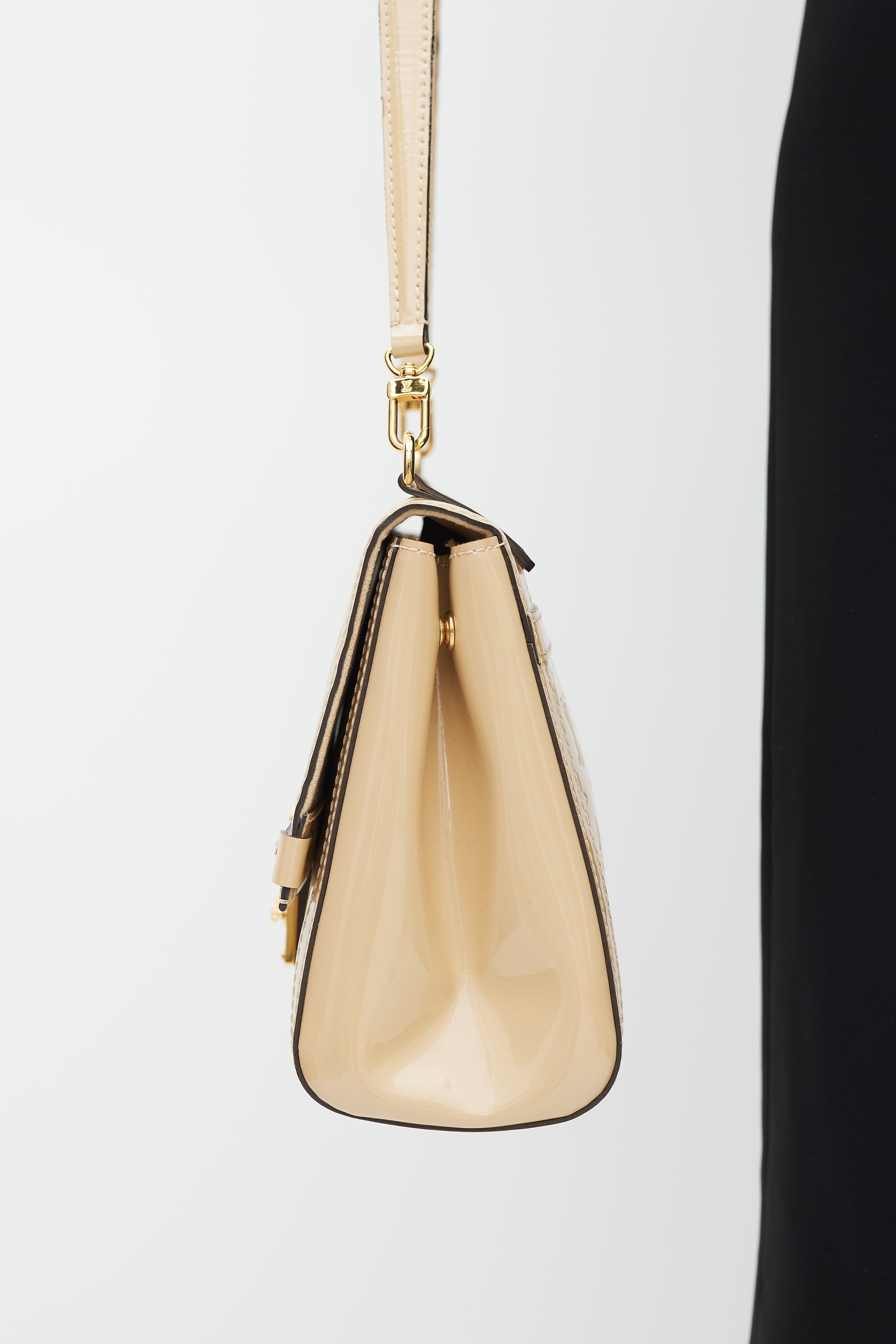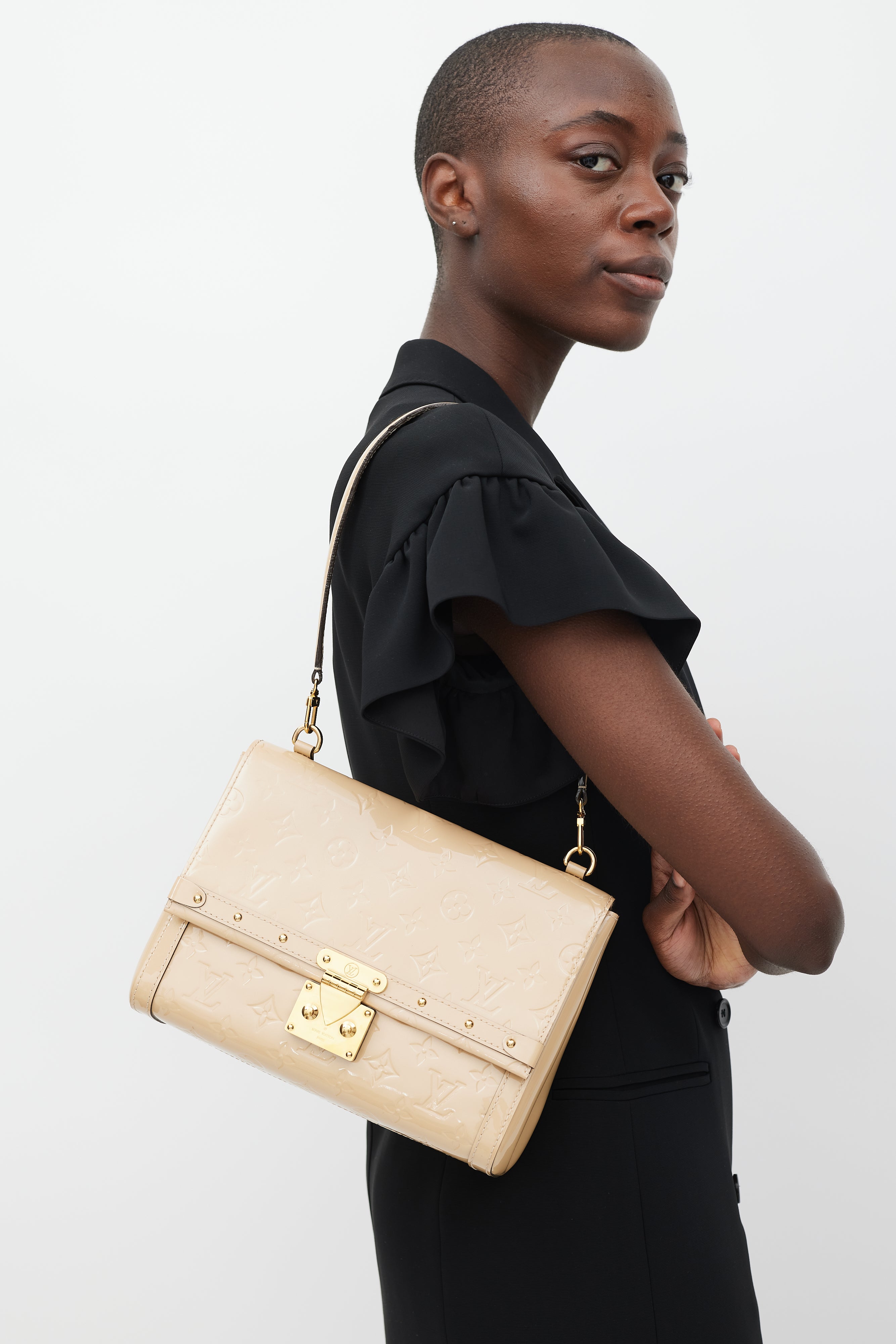 Pre-owned Louis Vuitton 2015 beige Venice Dune shoulder bag featuring signature Monogram Vernis leather, gold tone hardware, detachable shoulder strap, front flap with studded trim and pinch lock closure, and one lined main compartment with one zip pocket and two slip pockets. Comes with original dust bag.