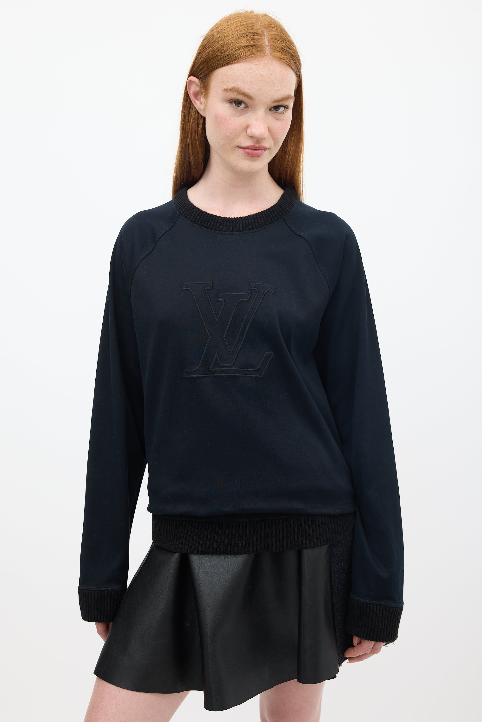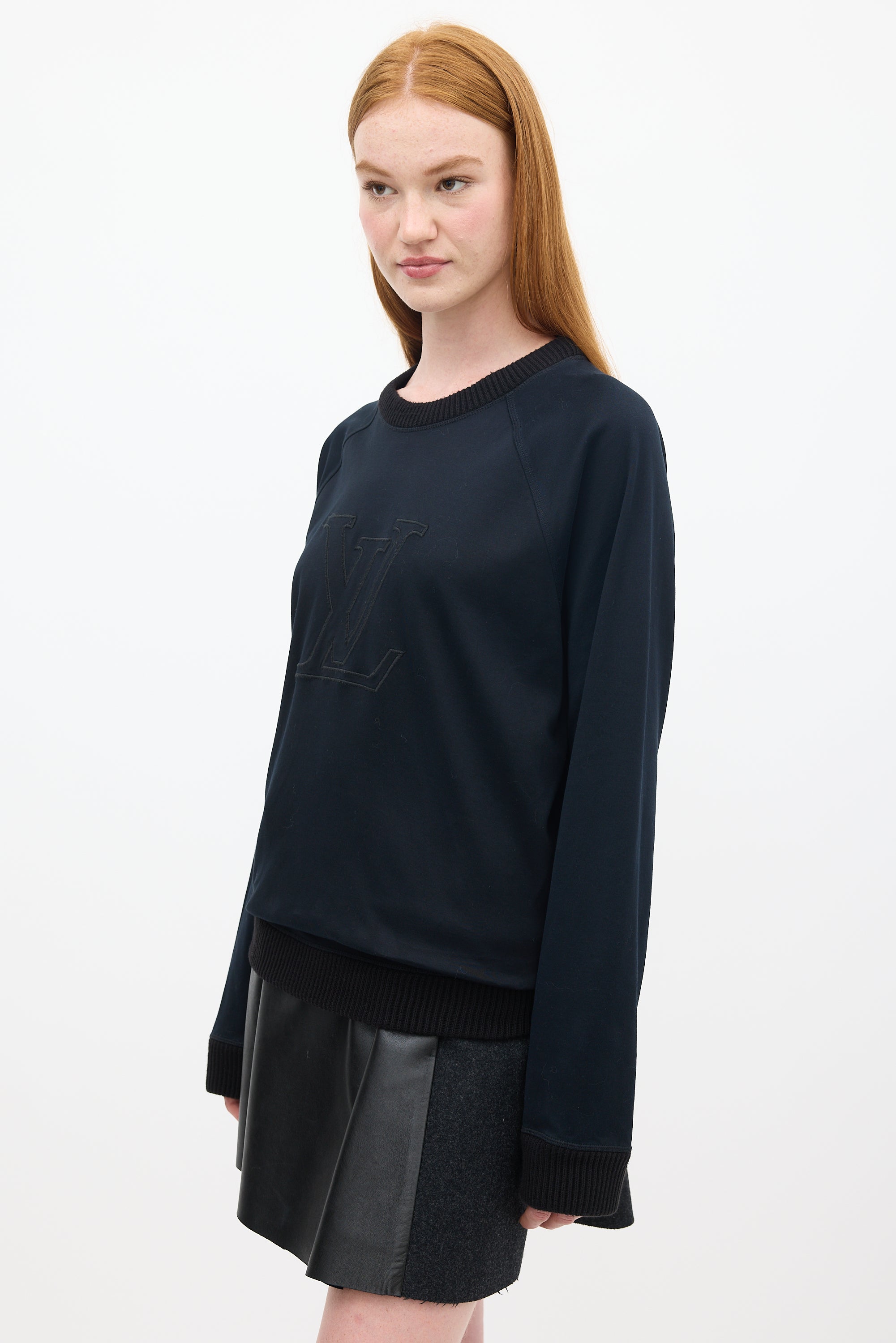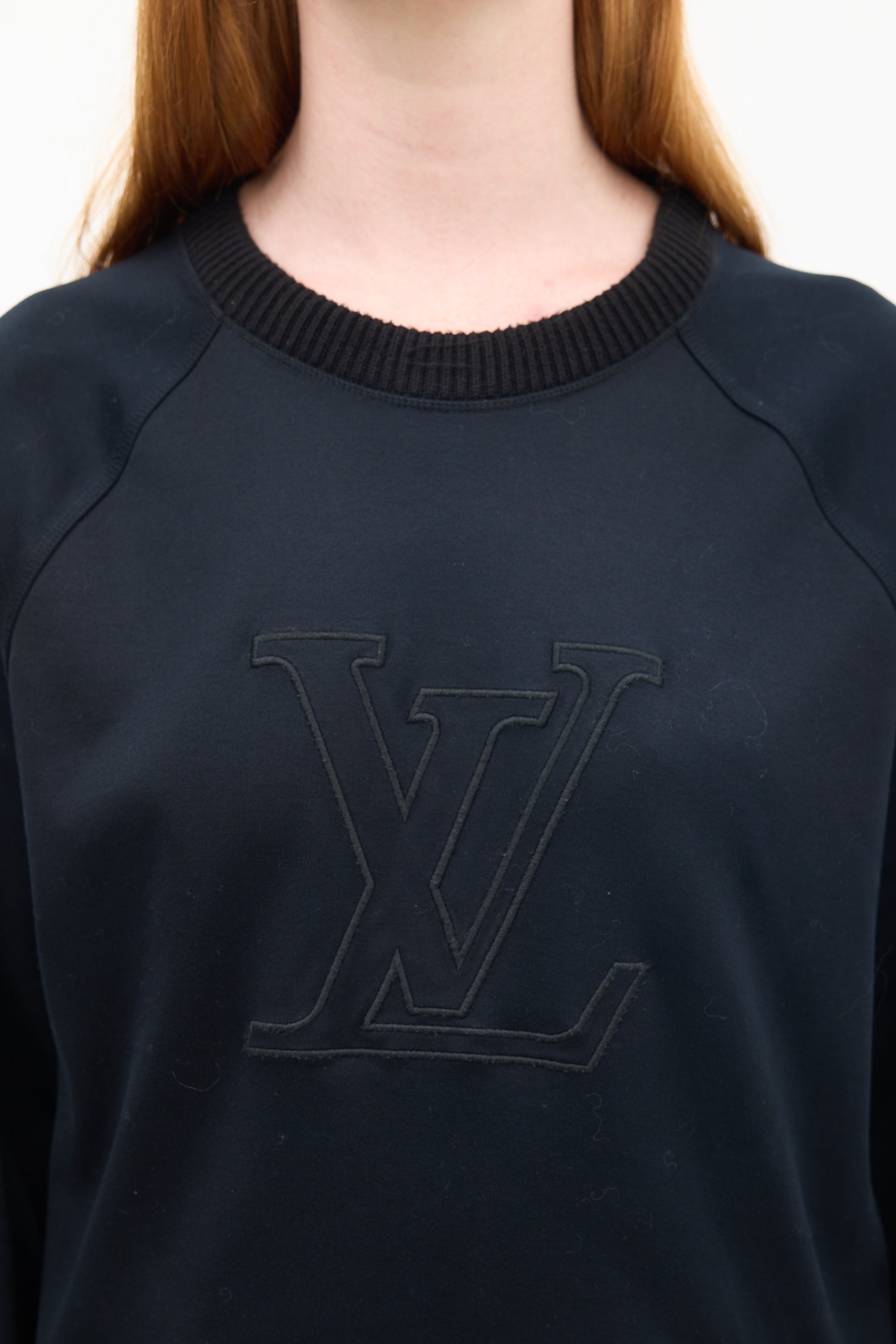 Pre-owned Louis Vuitton black cotton crewneck sweater featuring front embroidered monogram logo, even hem, long sleeves, and contrast ribbing at neck, hem, and cuffs. Clipped to fit model.