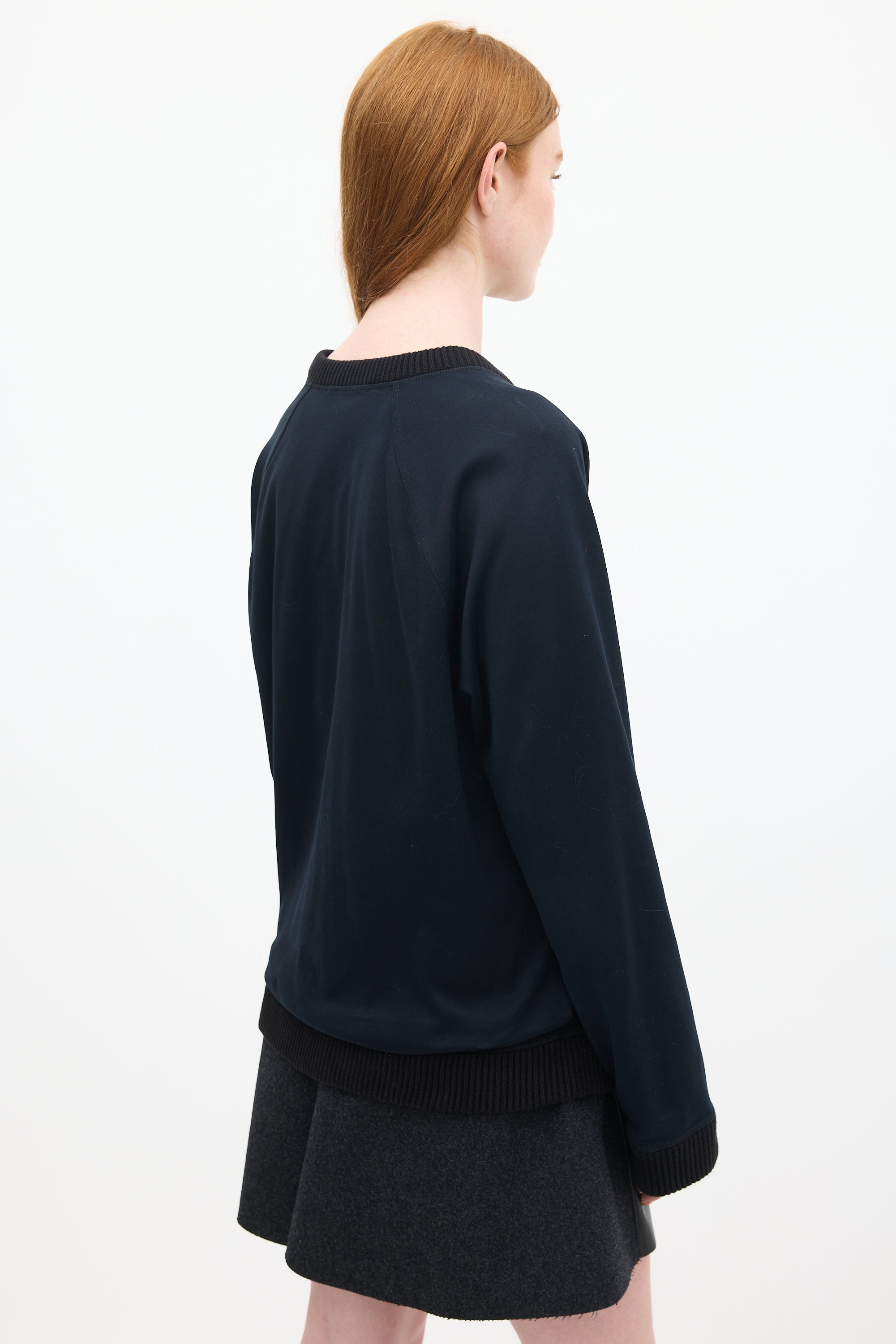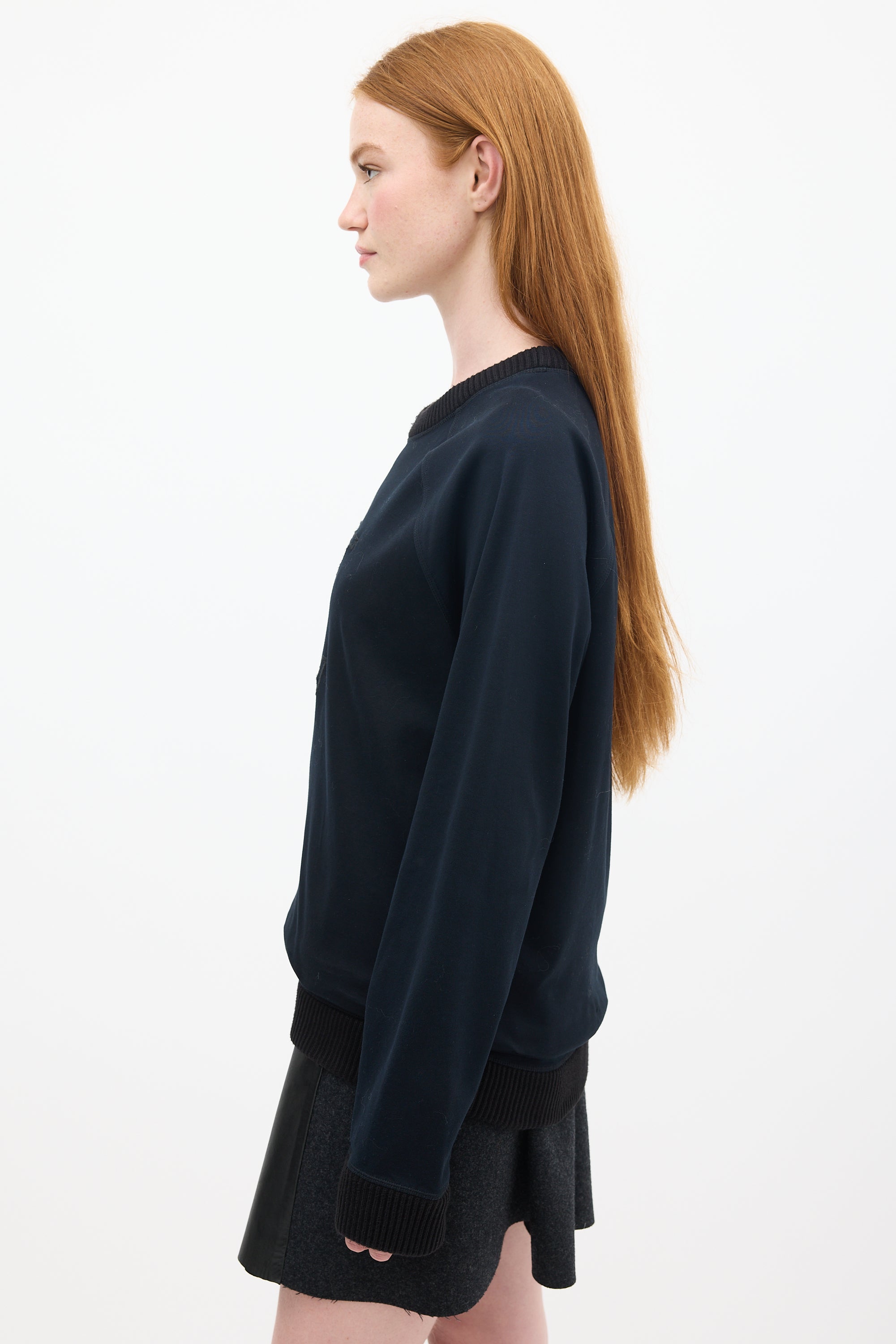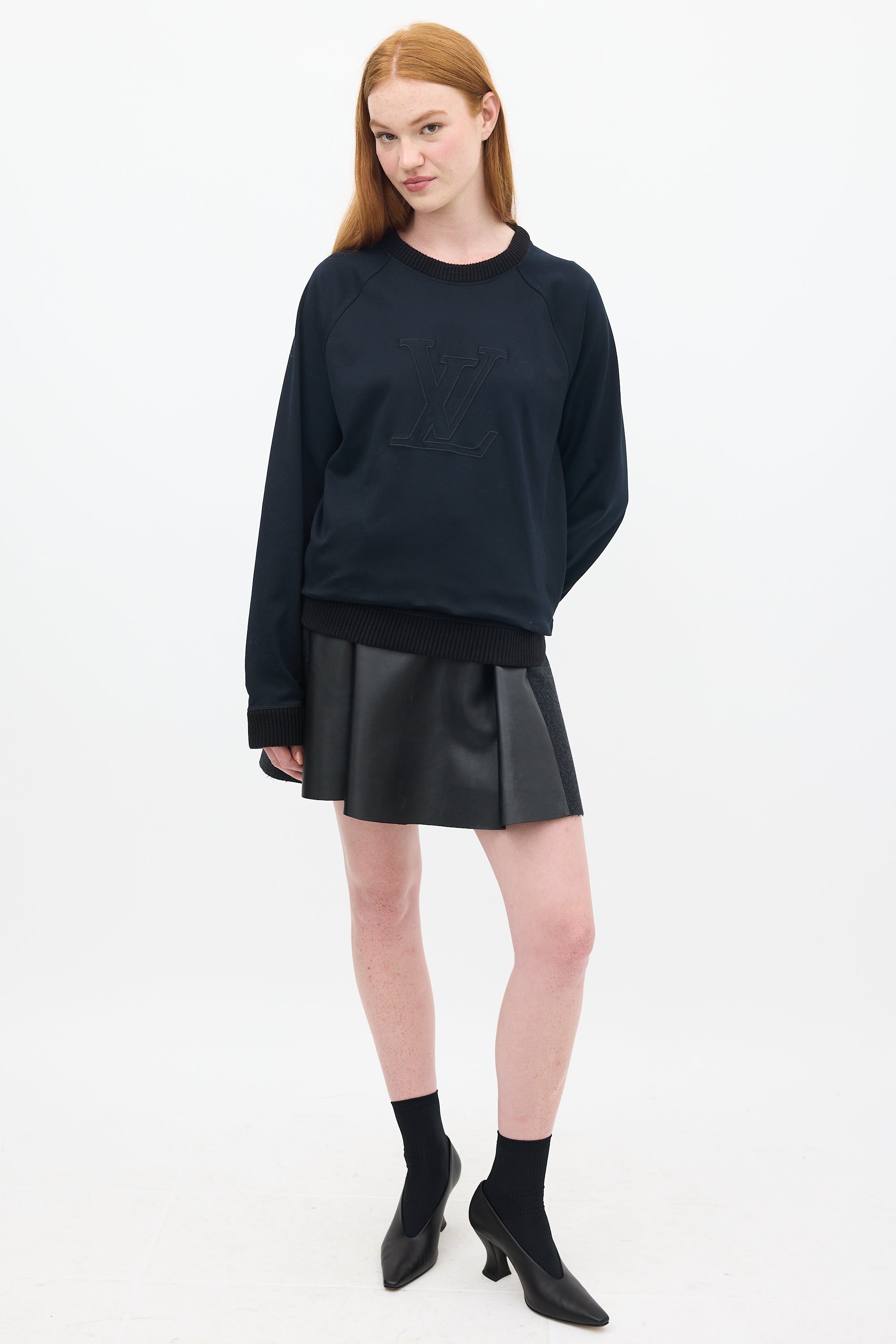 Pre-owned Louis Vuitton black cotton crewneck sweater featuring front embroidered monogram logo, even hem, long sleeves, and contrast ribbing at neck, hem, and cuffs. Clipped to fit model.