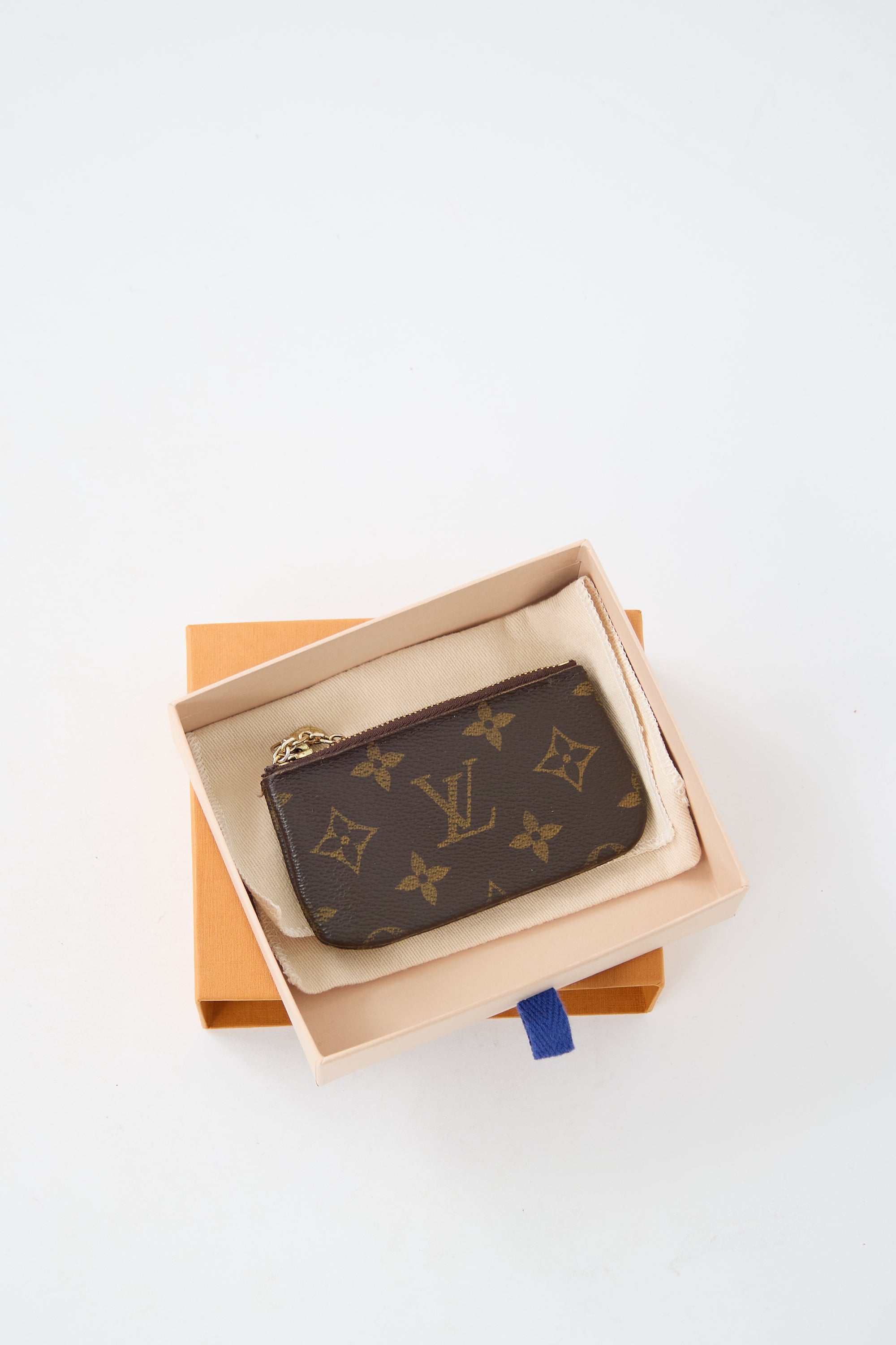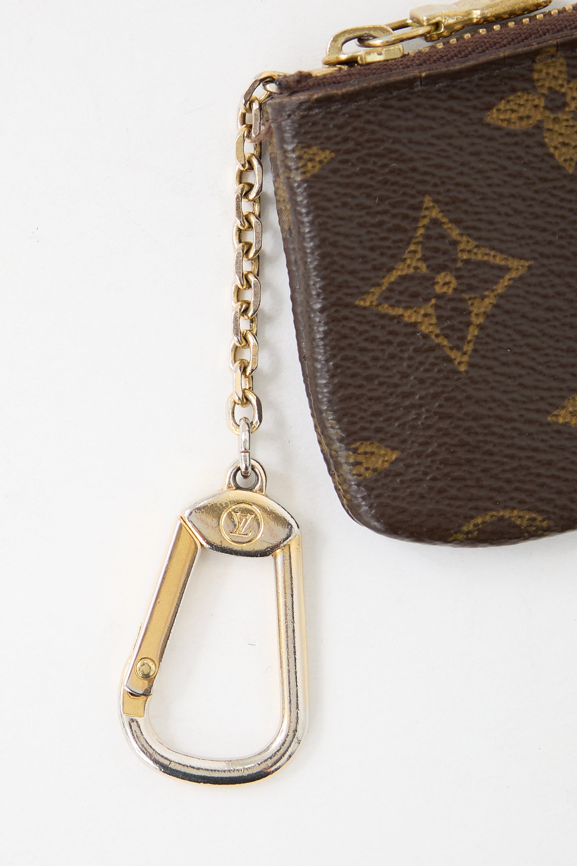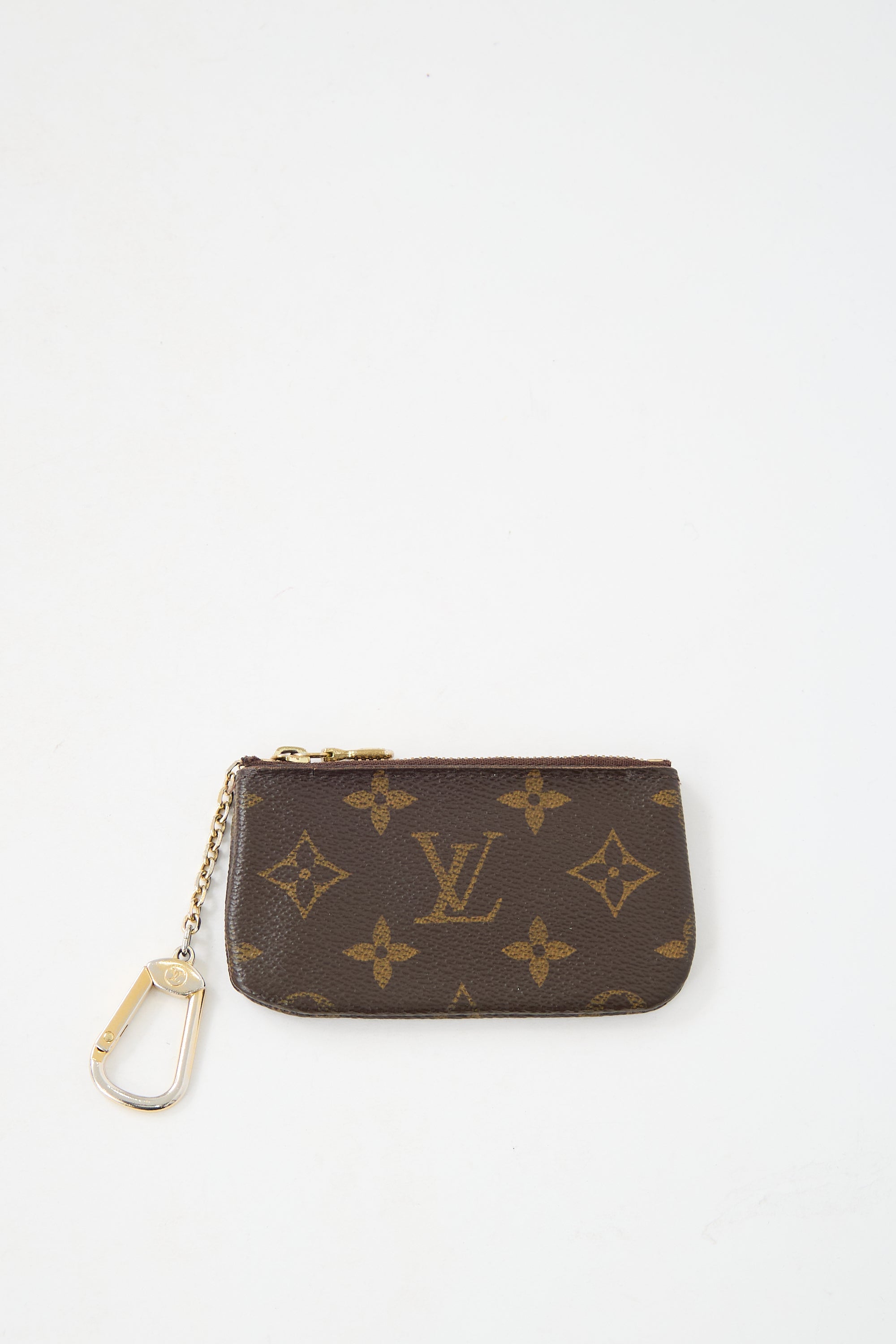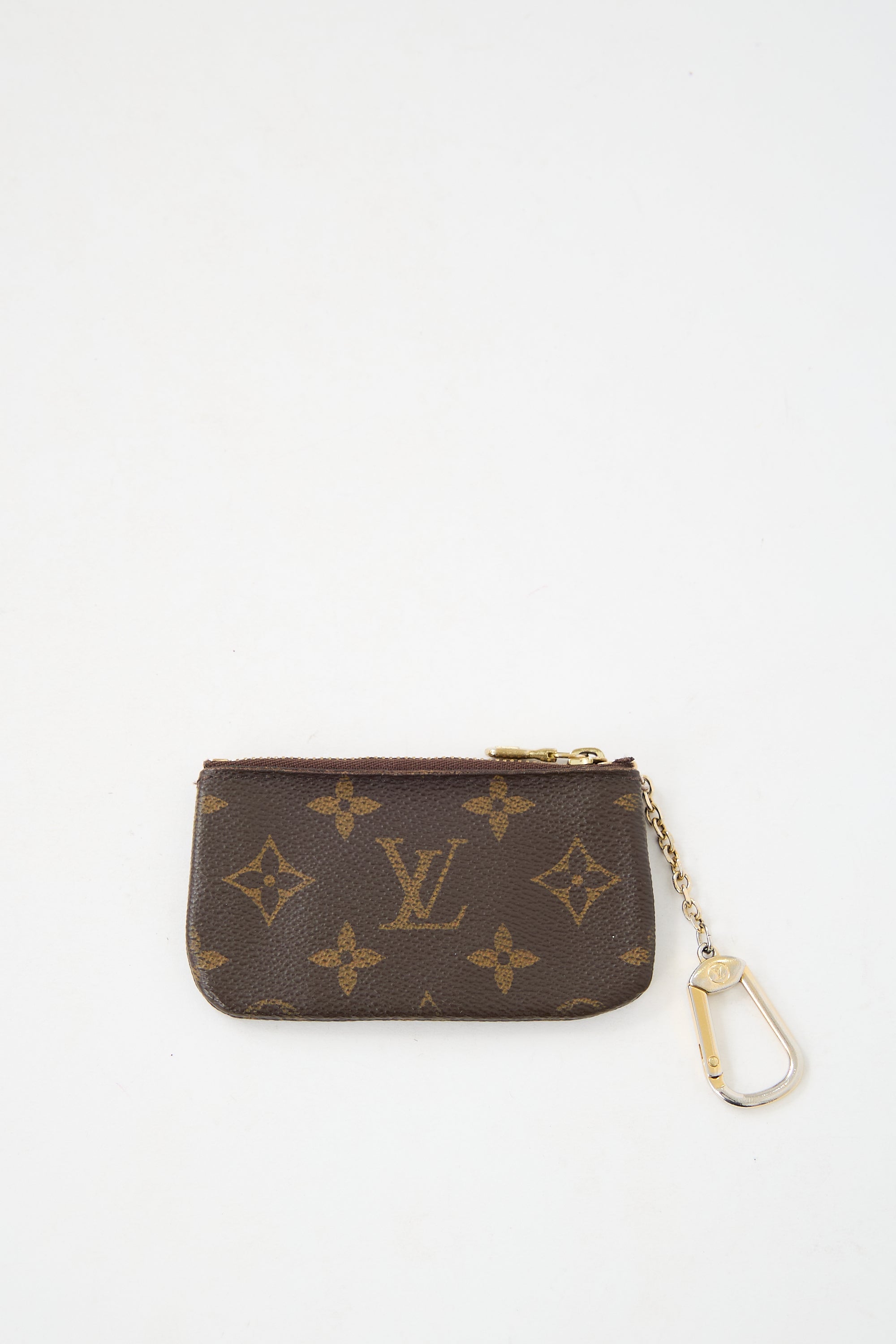 Pre-owned Louis Vuitton brown leather pouch featuring LV monogram coated canvas, gold tone hardware, top zip closure, metal keychain, and one lined main compartment. Includes original dust bag and box. Entrupy certificate included.
