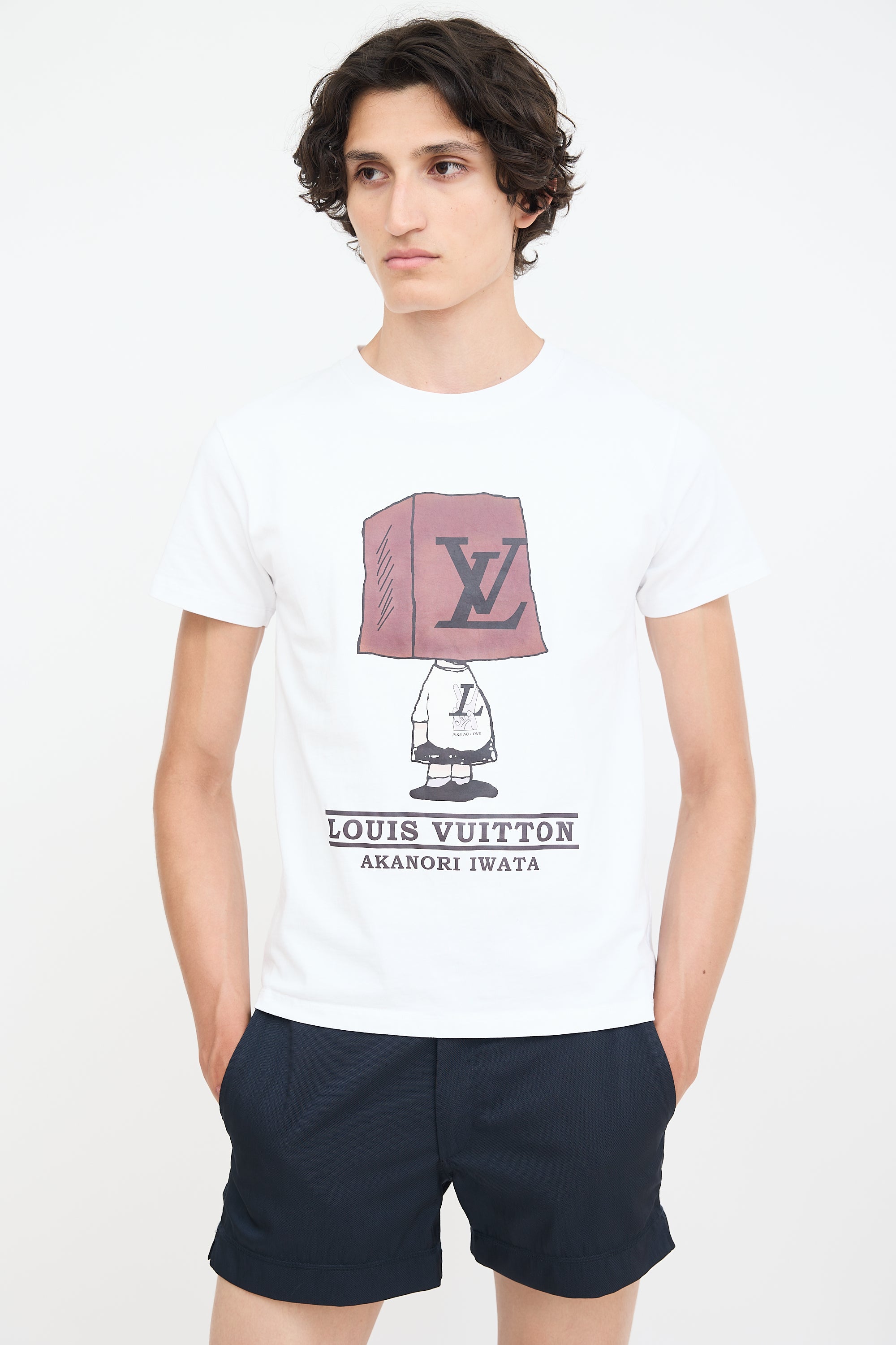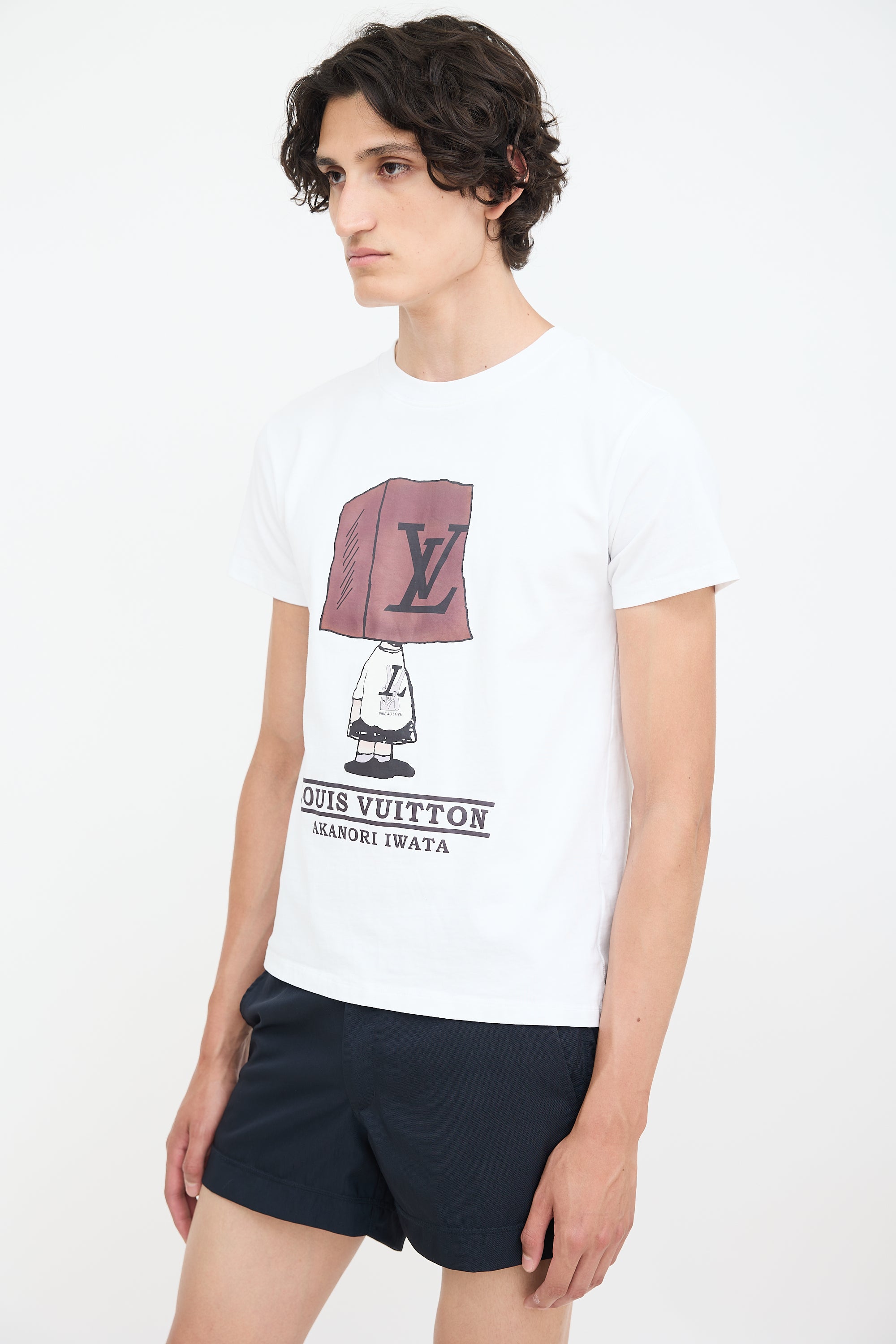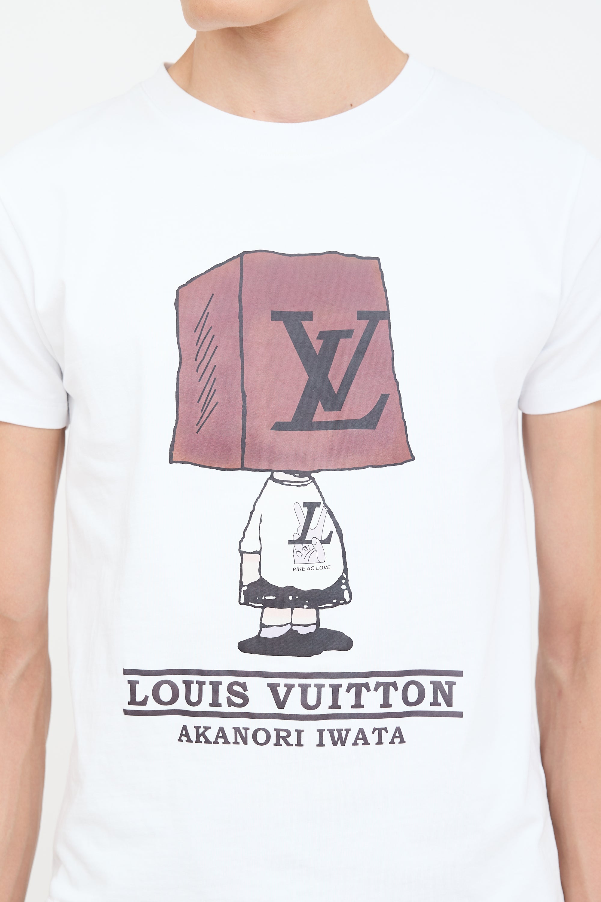 Pre-owned Louis Vuitton white T-shirt featuring a round neckline, even hem, short sleeves, multicolour Akanori Iwata graphic front, and label at back neck.