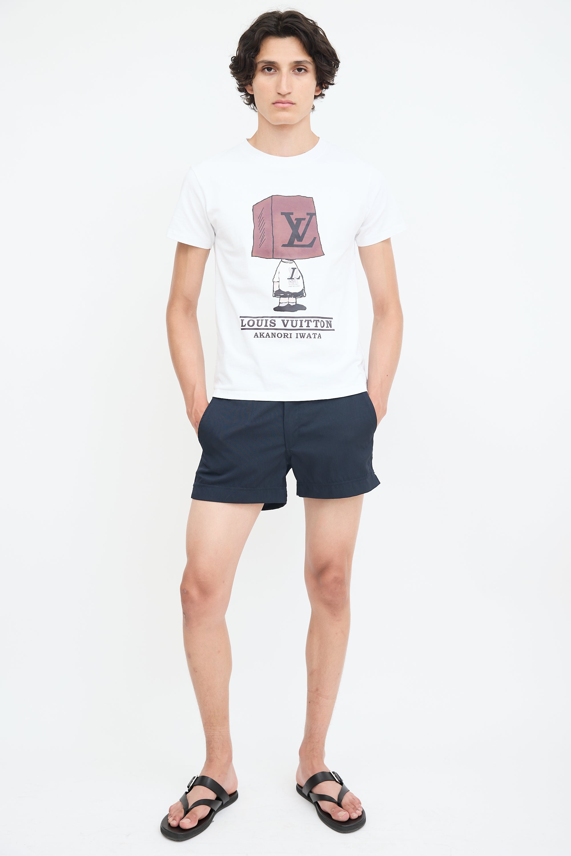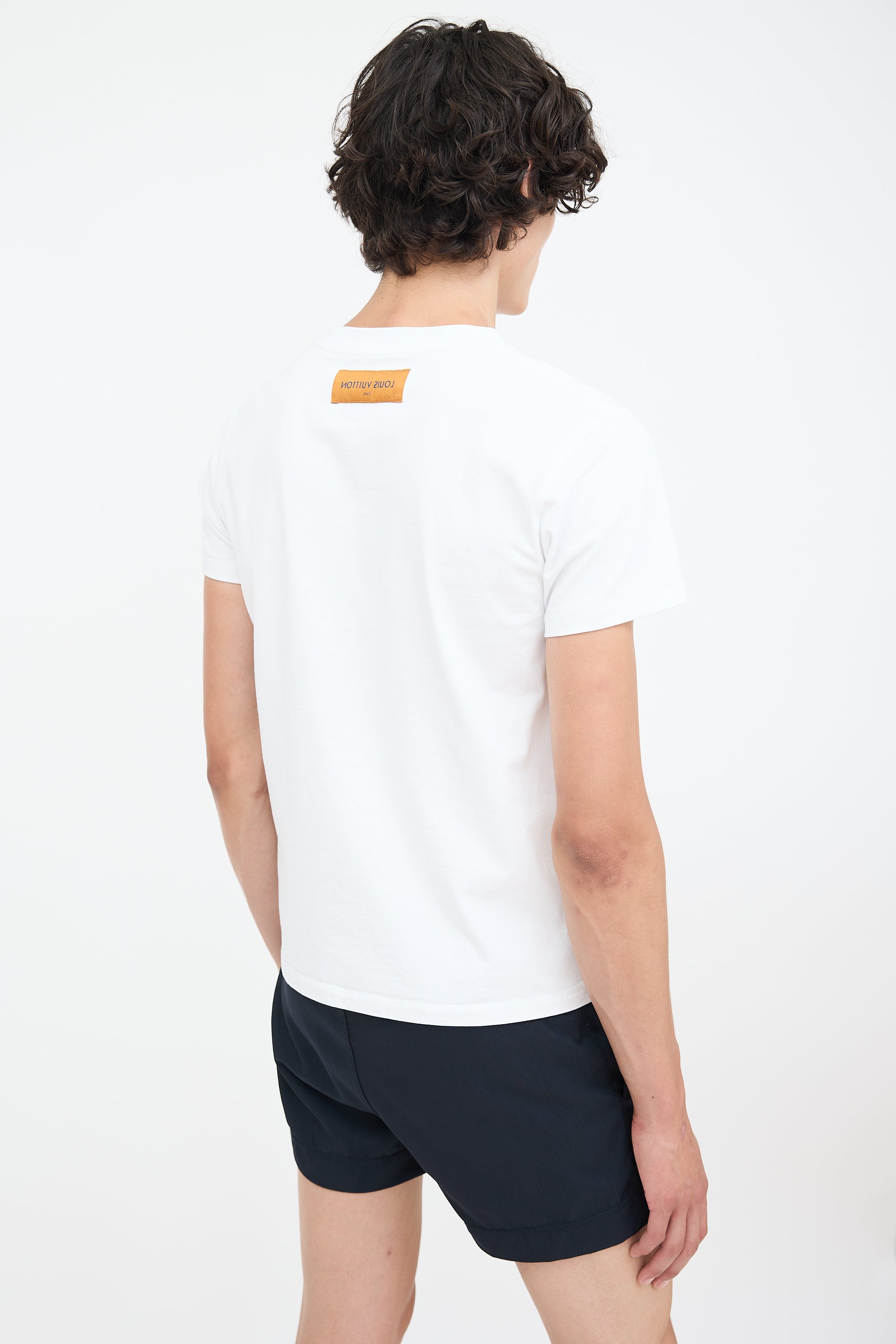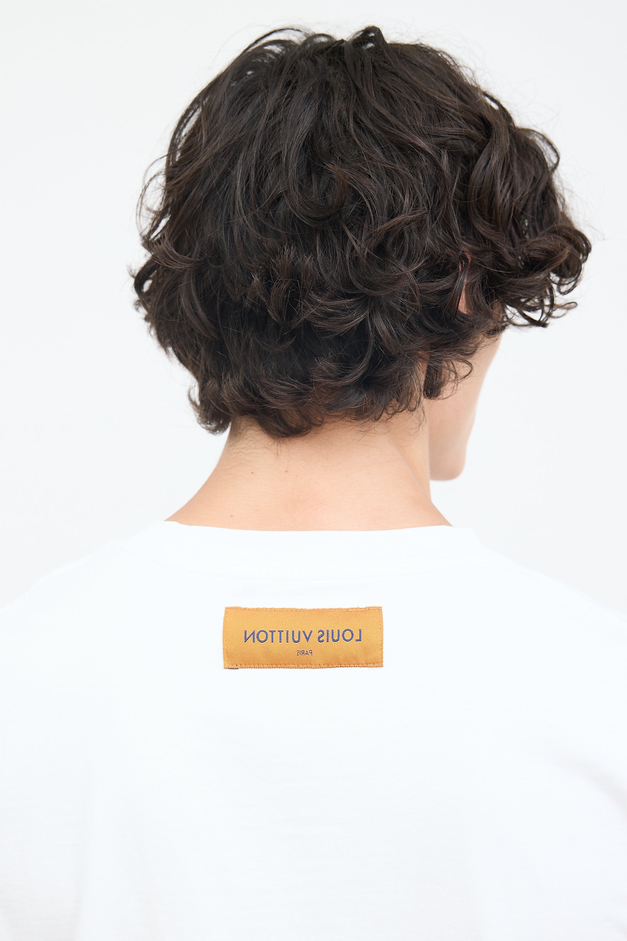 Pre-owned Louis Vuitton white T-shirt featuring a round neckline, even hem, short sleeves, multicolour Akanori Iwata graphic front, and label at back neck.