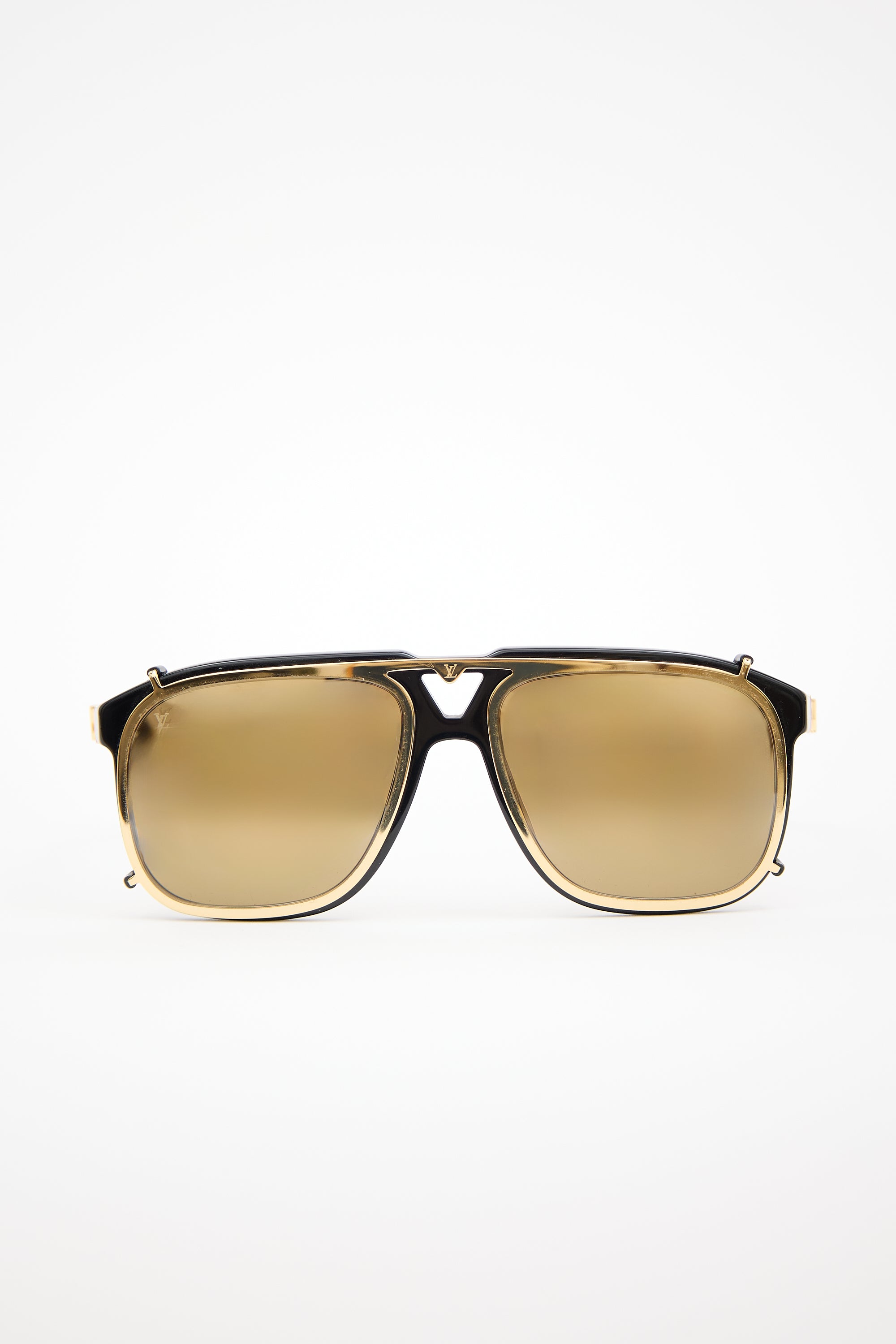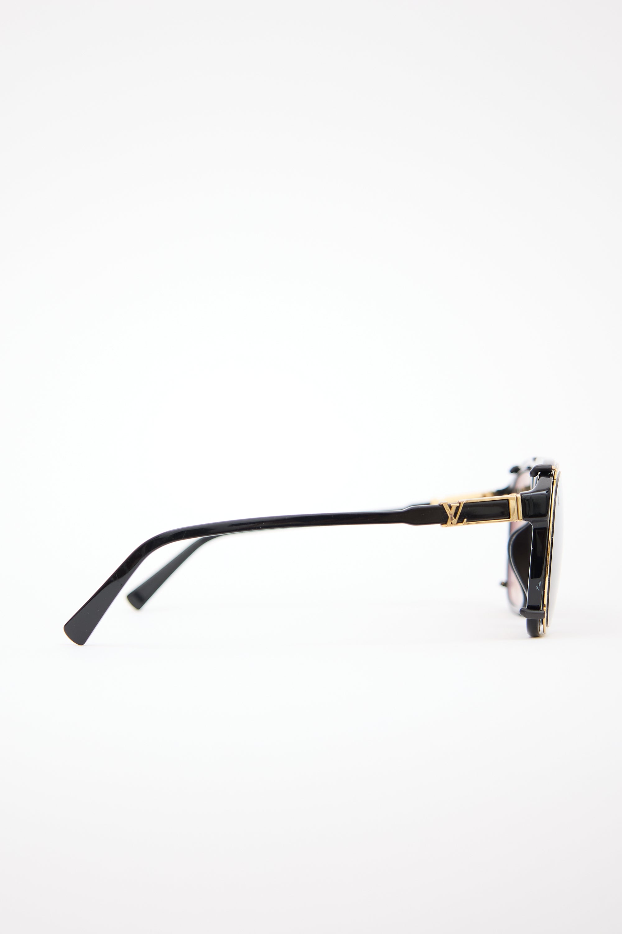 Pre-owned Louis Vuitton black Z1085E Satellite sunglasses featuring detachable brown tinted lenses, clear lenses, acetate Aviator frame, and gold tone LV logo hardware at temples.