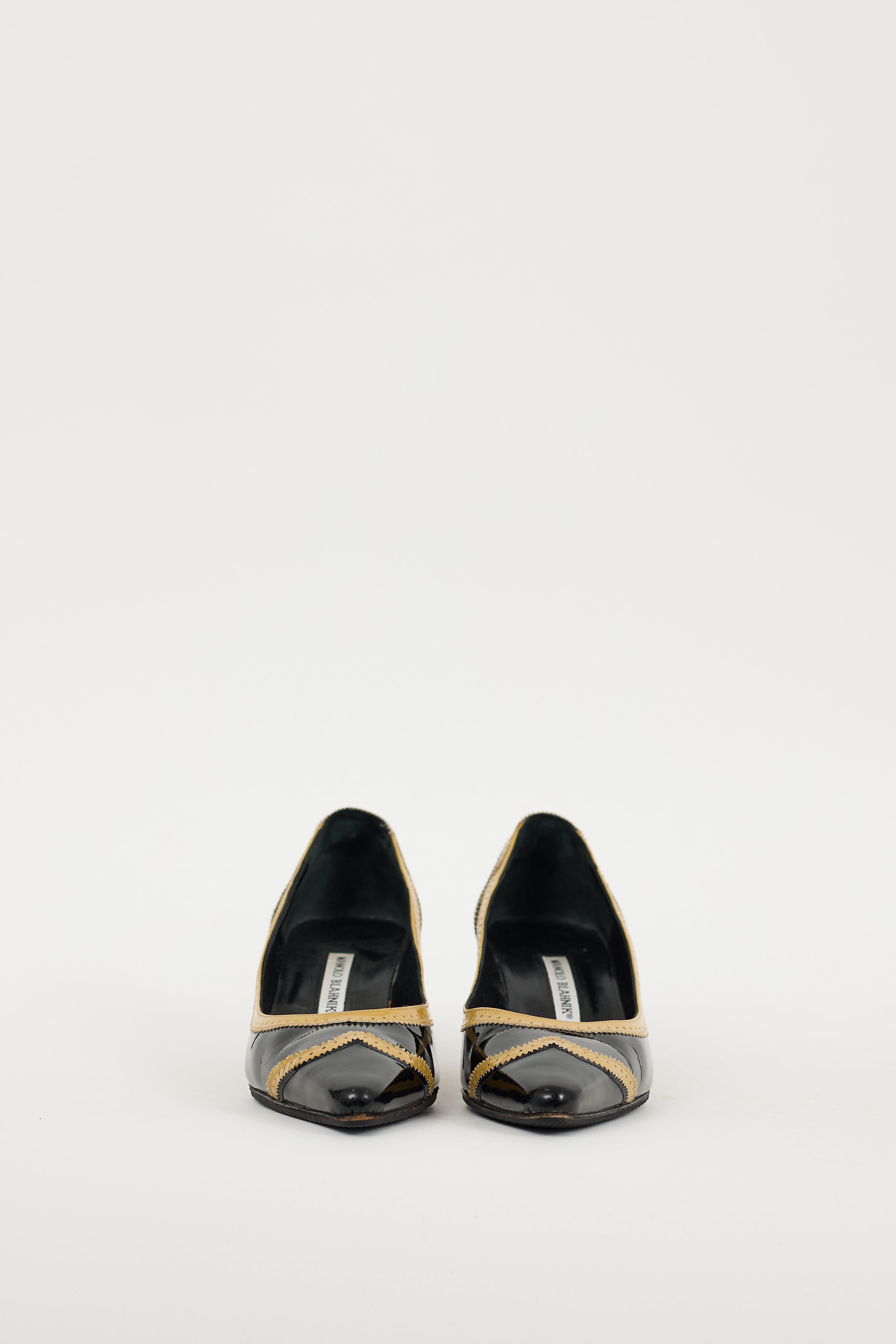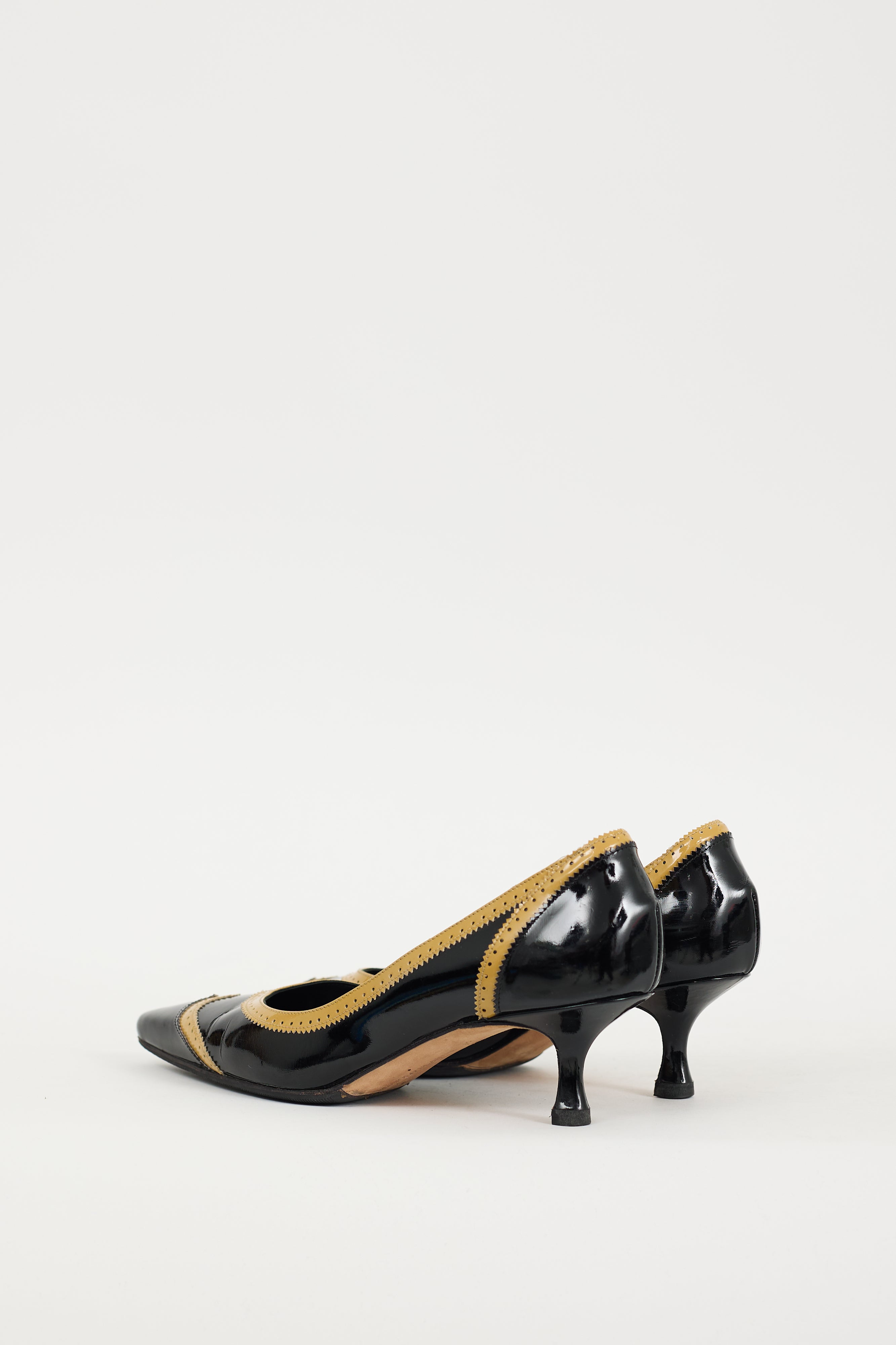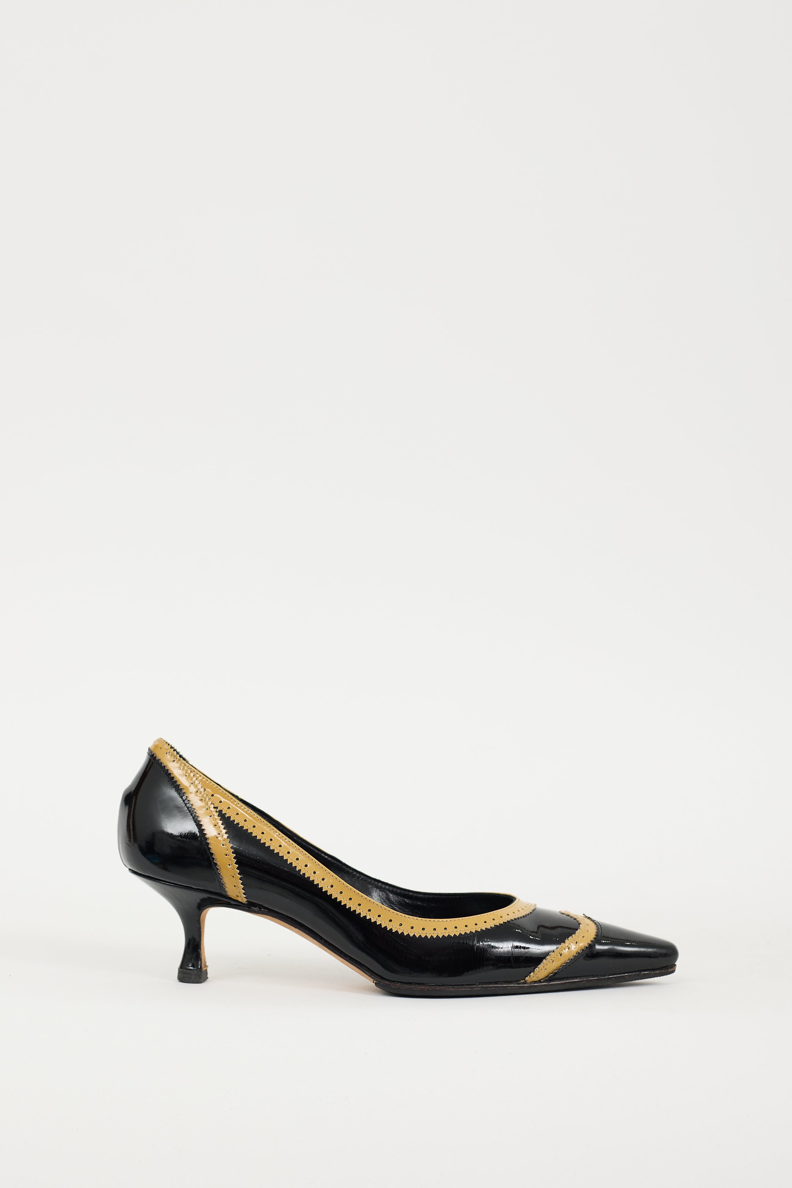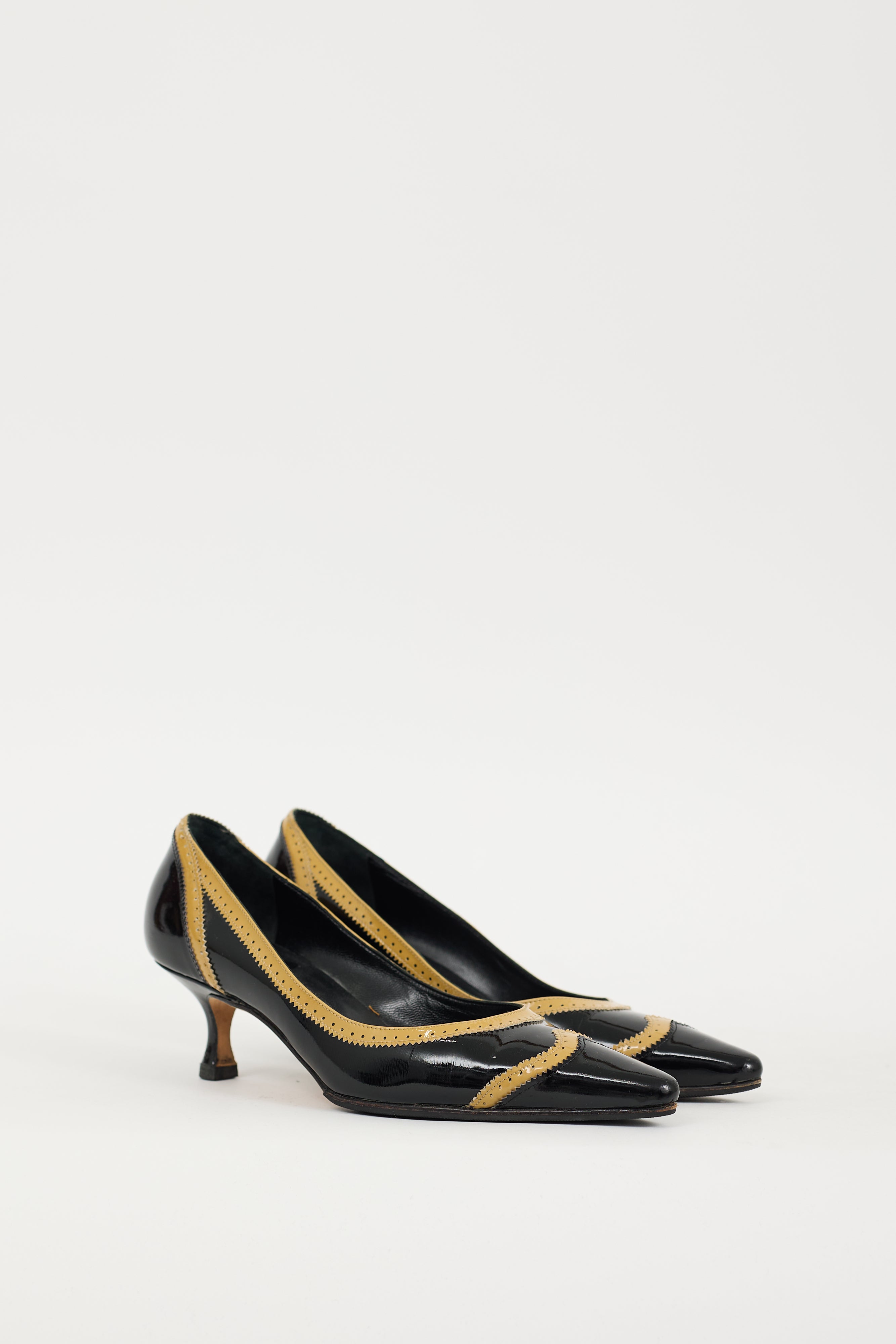 Pre-owned Manolo Blahnik black patent leather heels featuring beige perforated brogue detailing, pointed toe, wrapped kitten heel, and slip on entry.