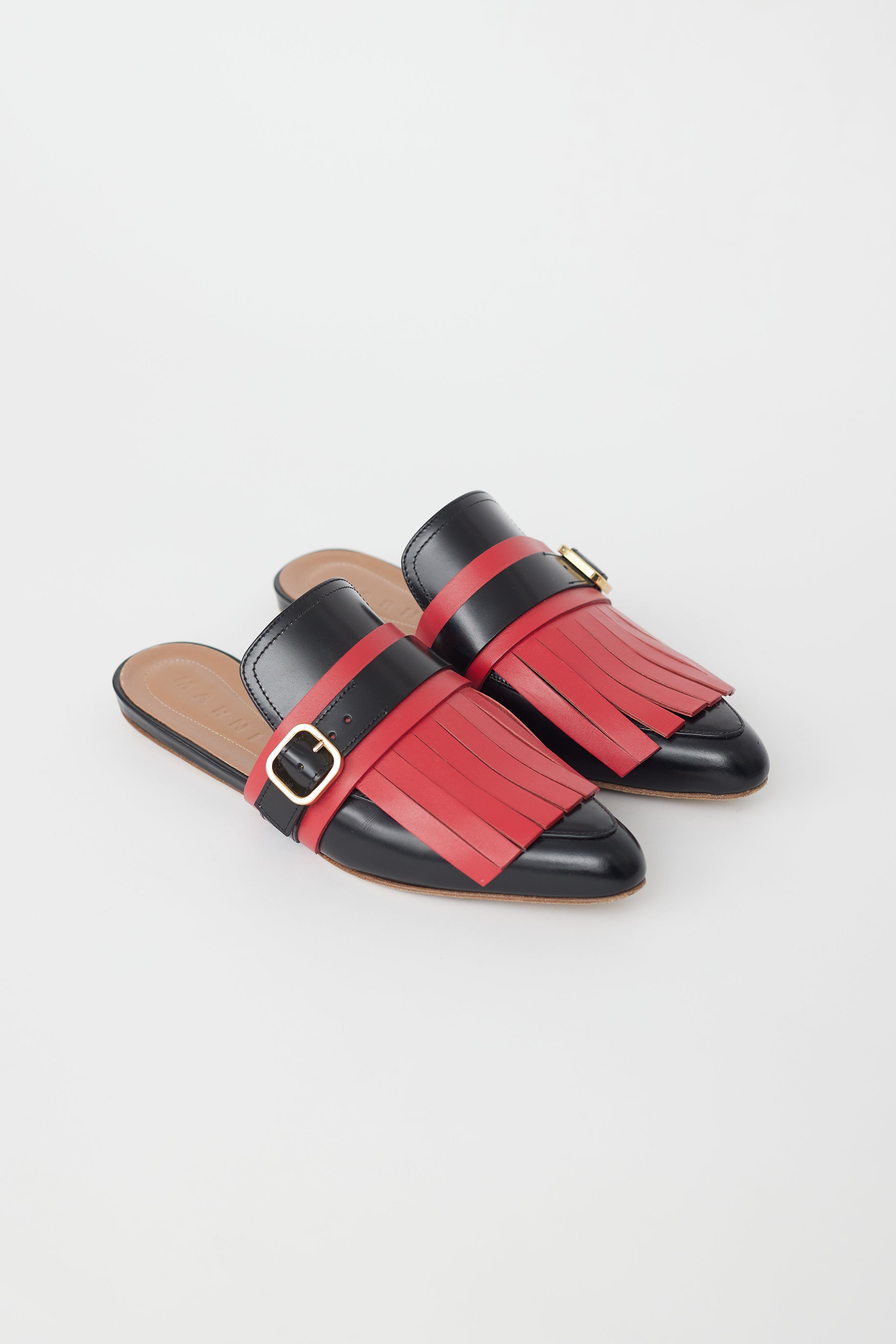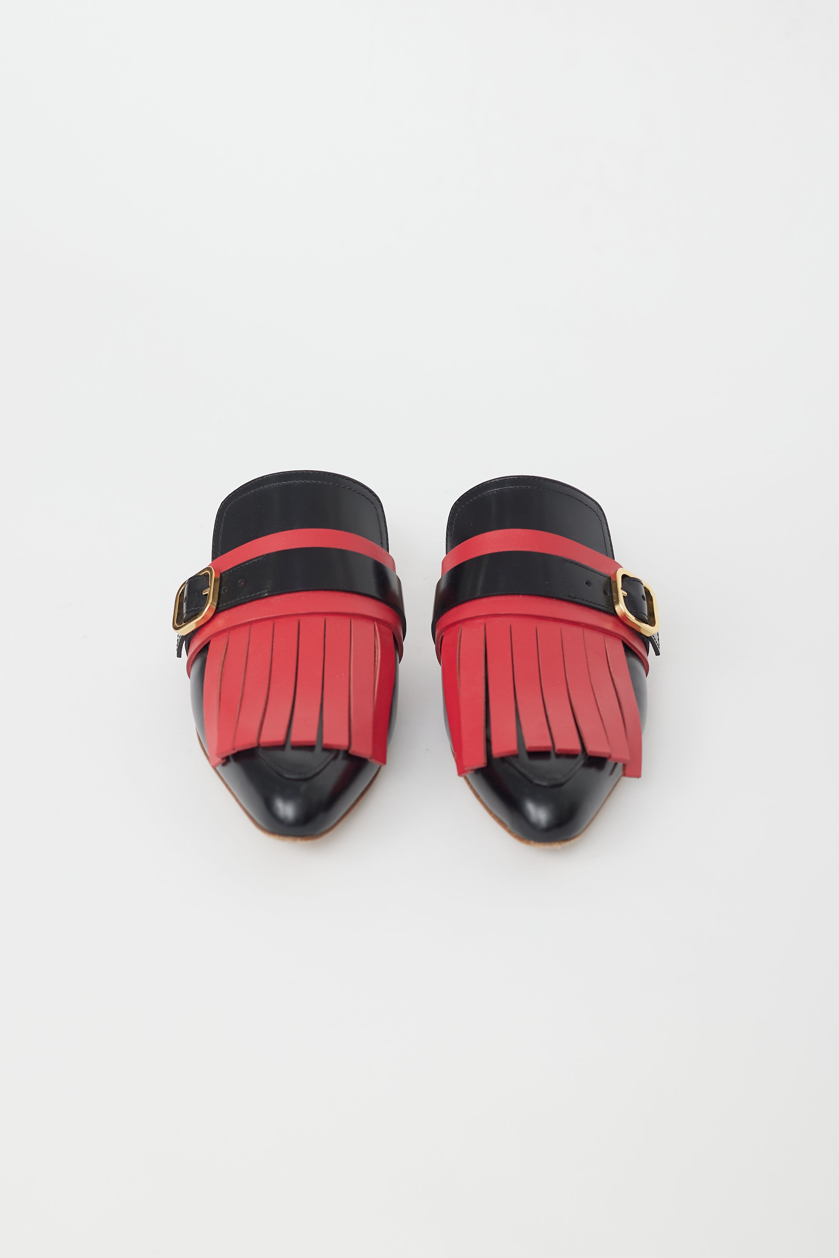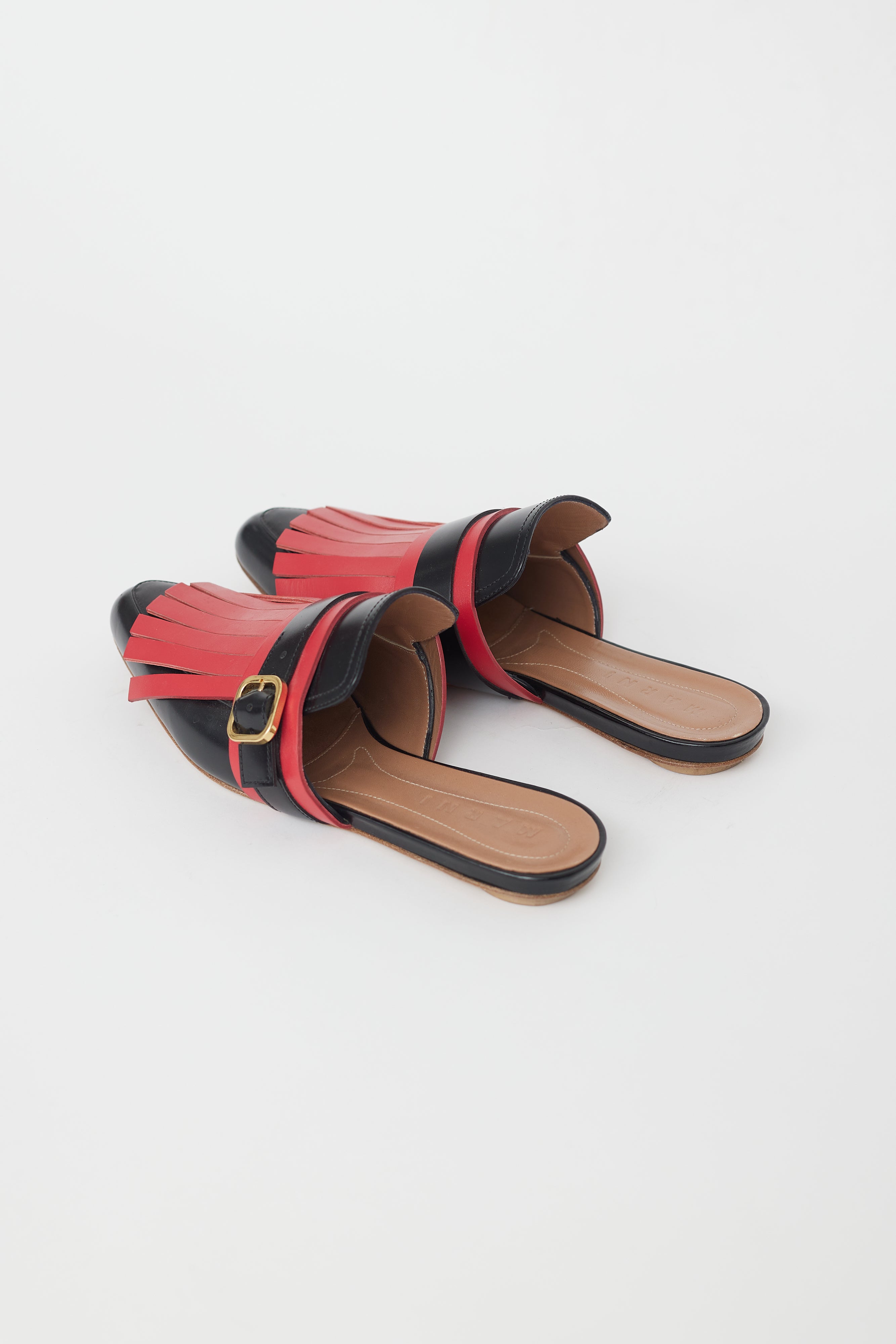 Pre-owned Marni black and red mules featuring pointed toe, red kiltie fringe at front, strap with buckle fastening, and leather insole.