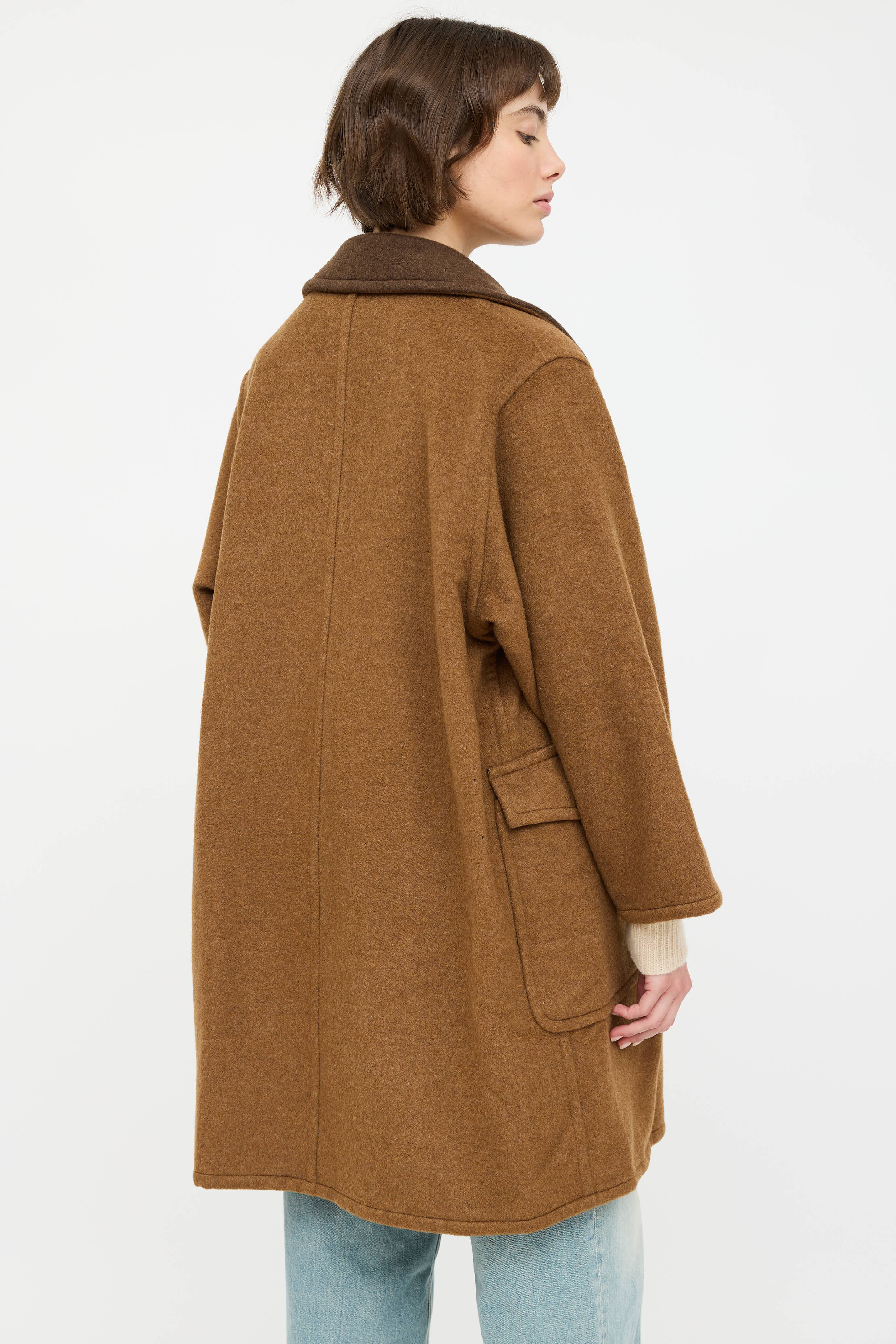 Pre-owned Max Mara brown cashmere coat featuring a pointed collar, long sleeves, two flap pockets at hip, and open front.