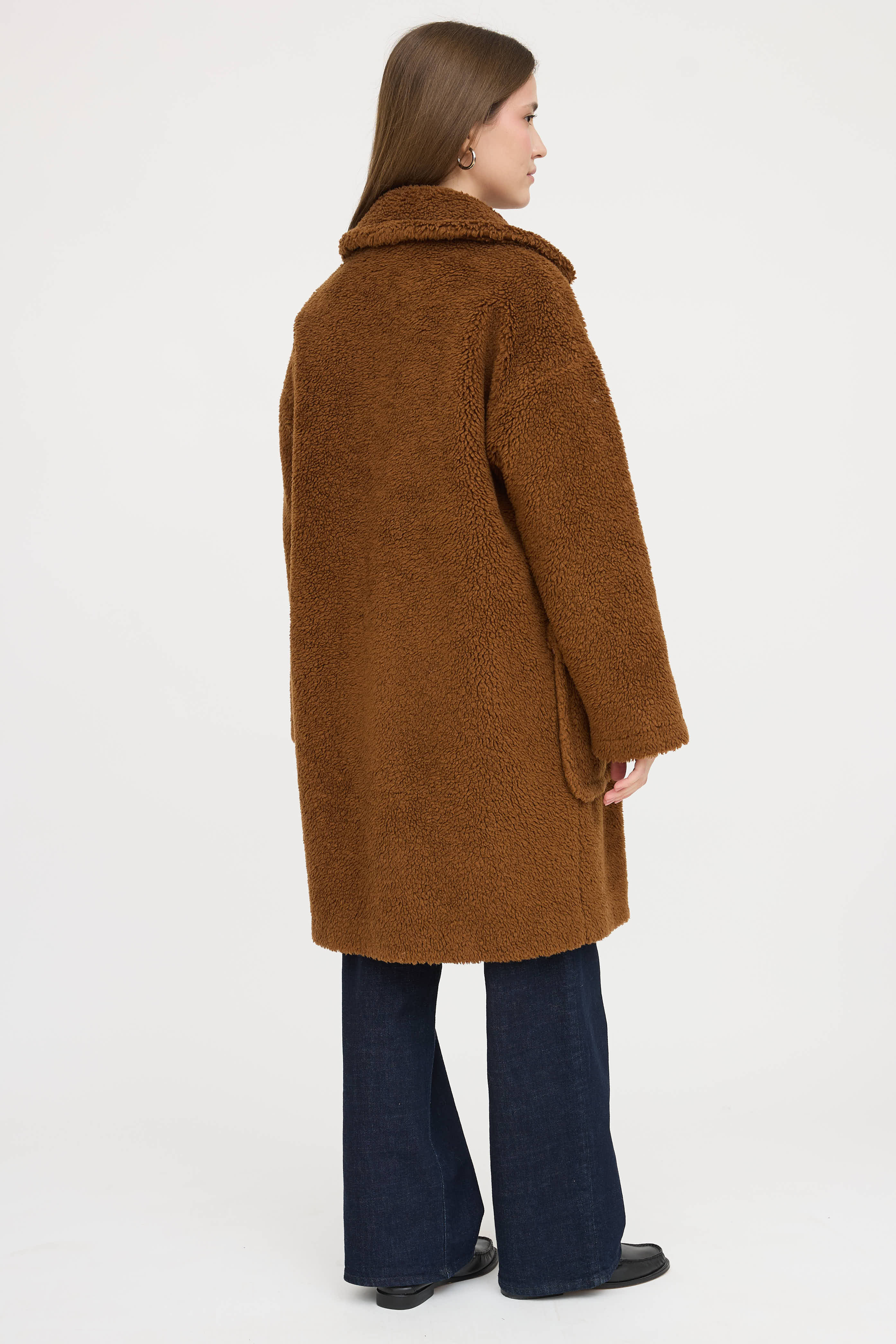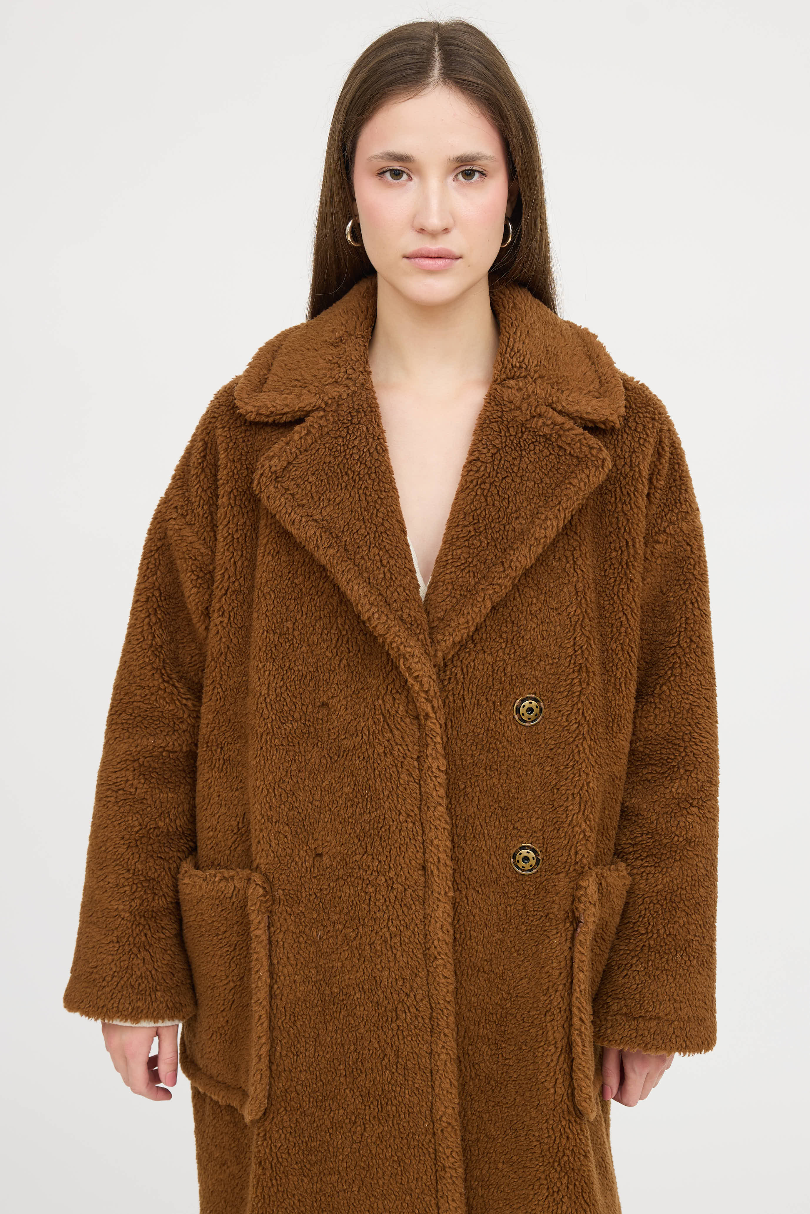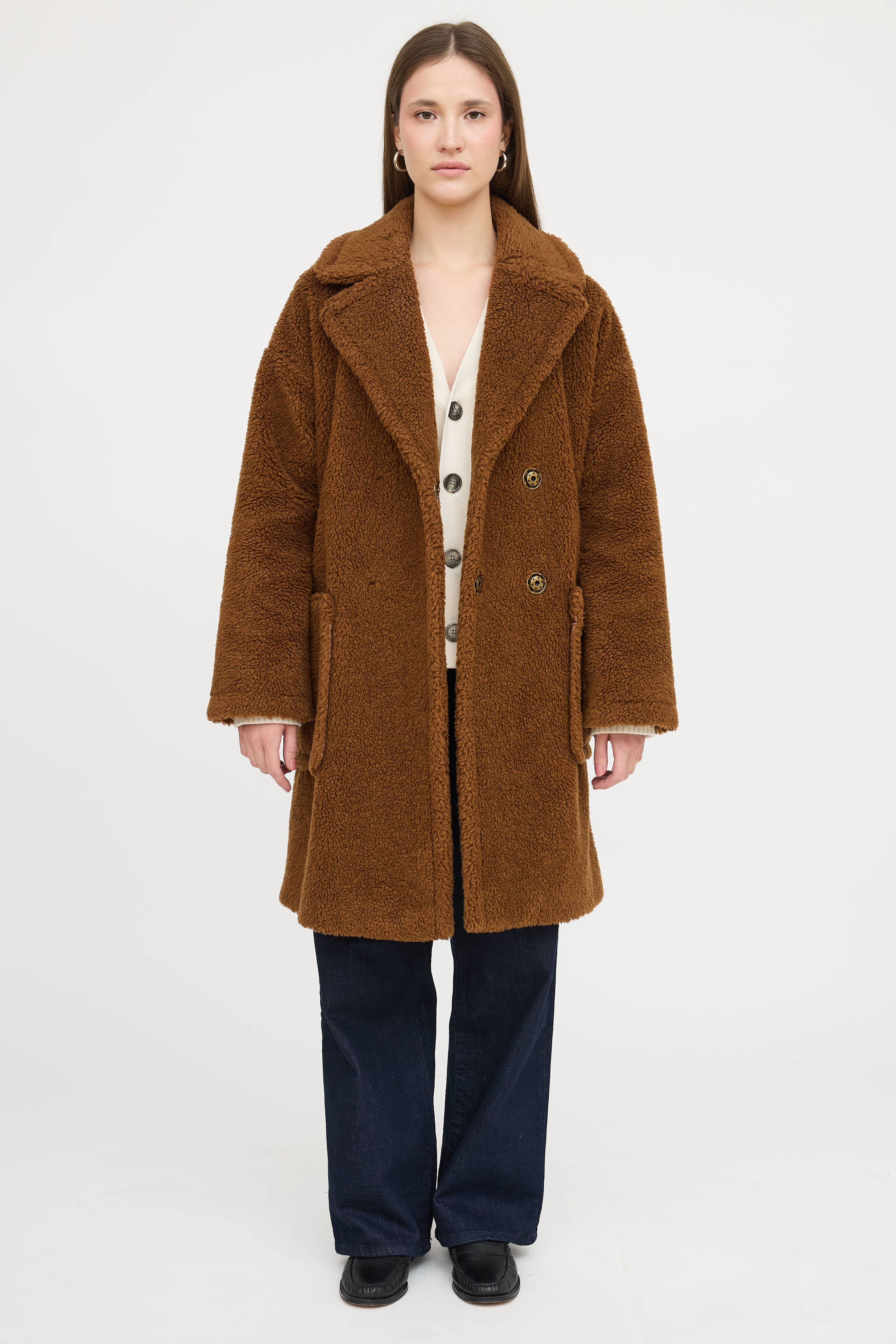 Pre-owned Max Mara brown long sleeve teddy coat featuring rounded notch lapel collar, patch pockets at front, and snap pockets at front. Lined.