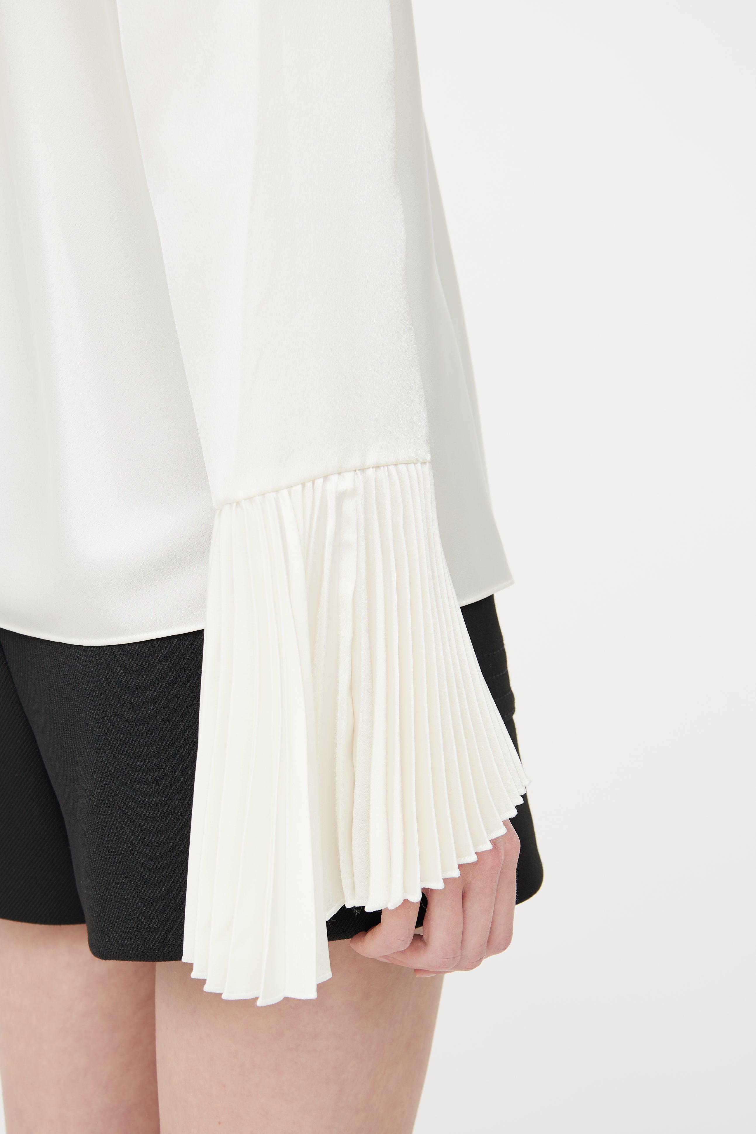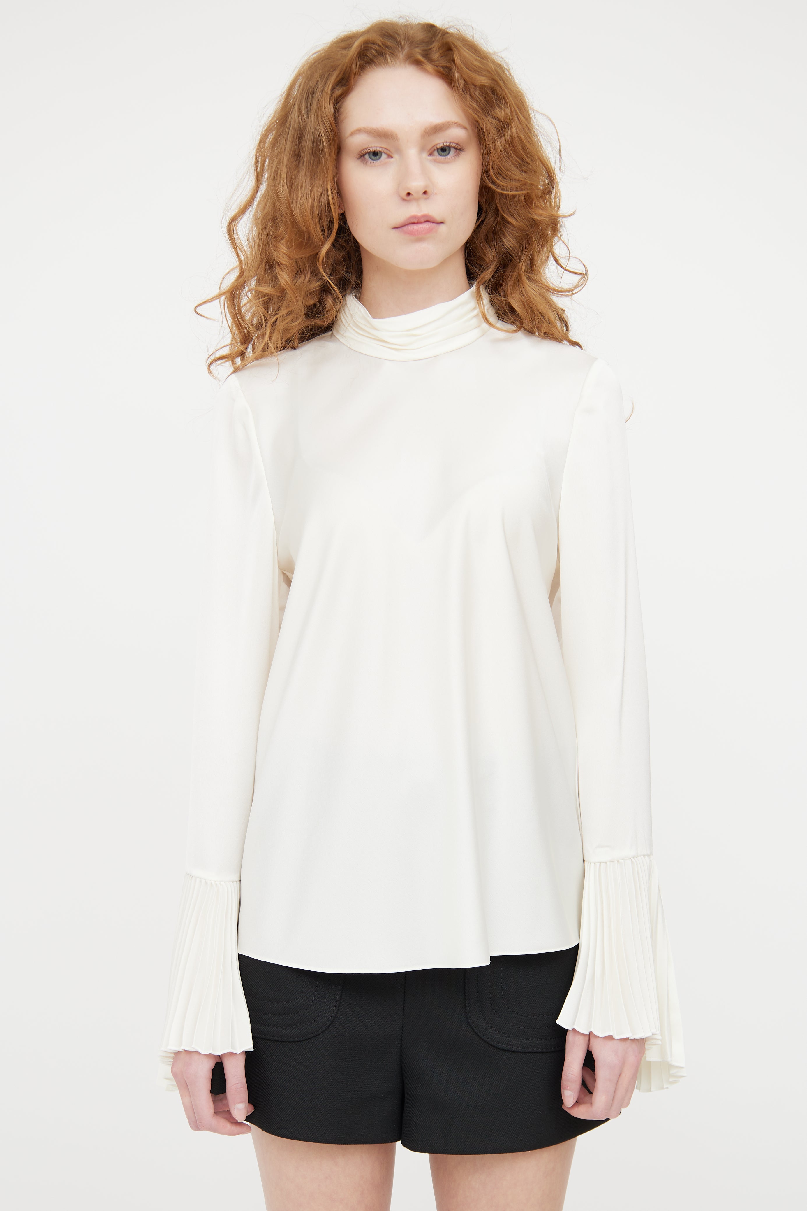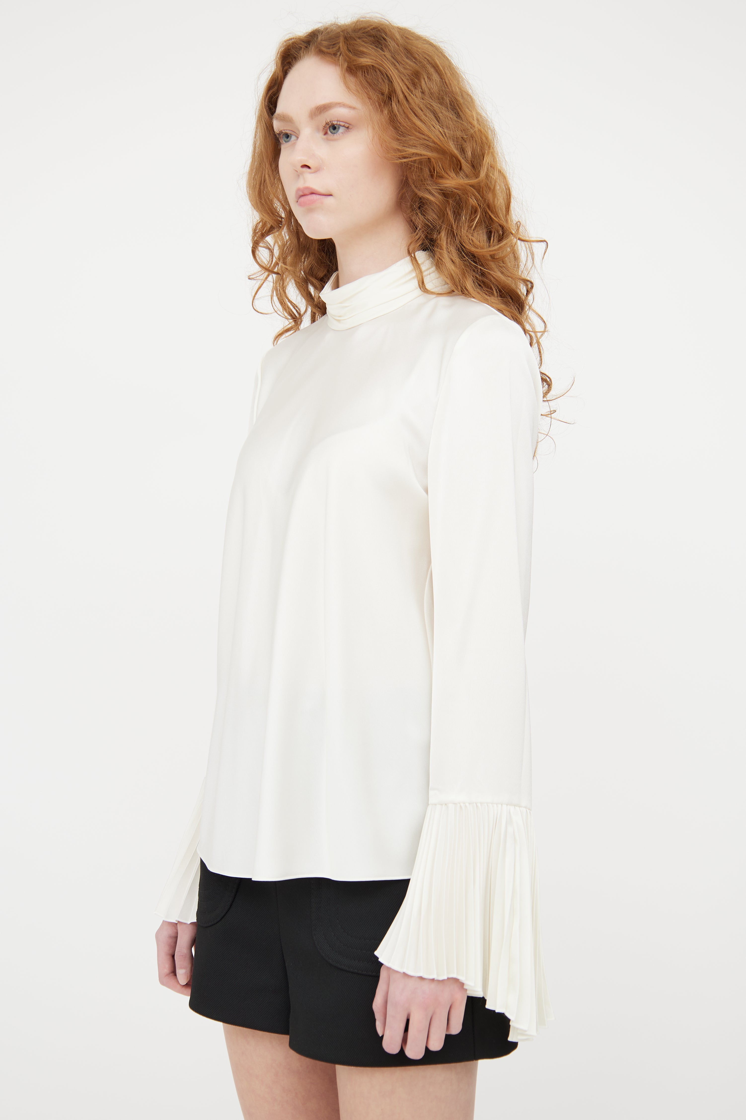 Pre-owned ME+EM cream satin top featuring a round gathered neckline, long sleeves with pleated flared cuffs, and faux pearl button closure.