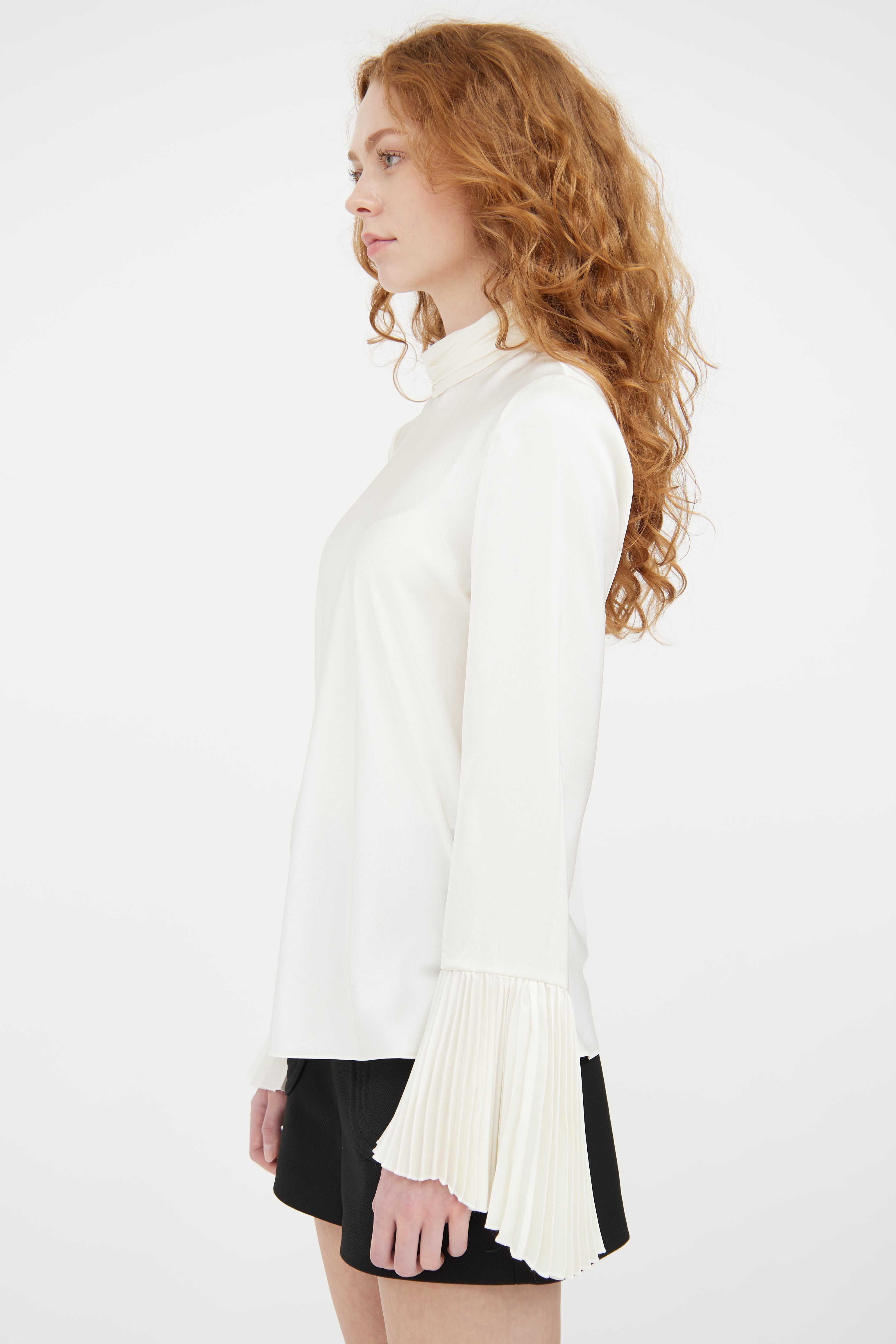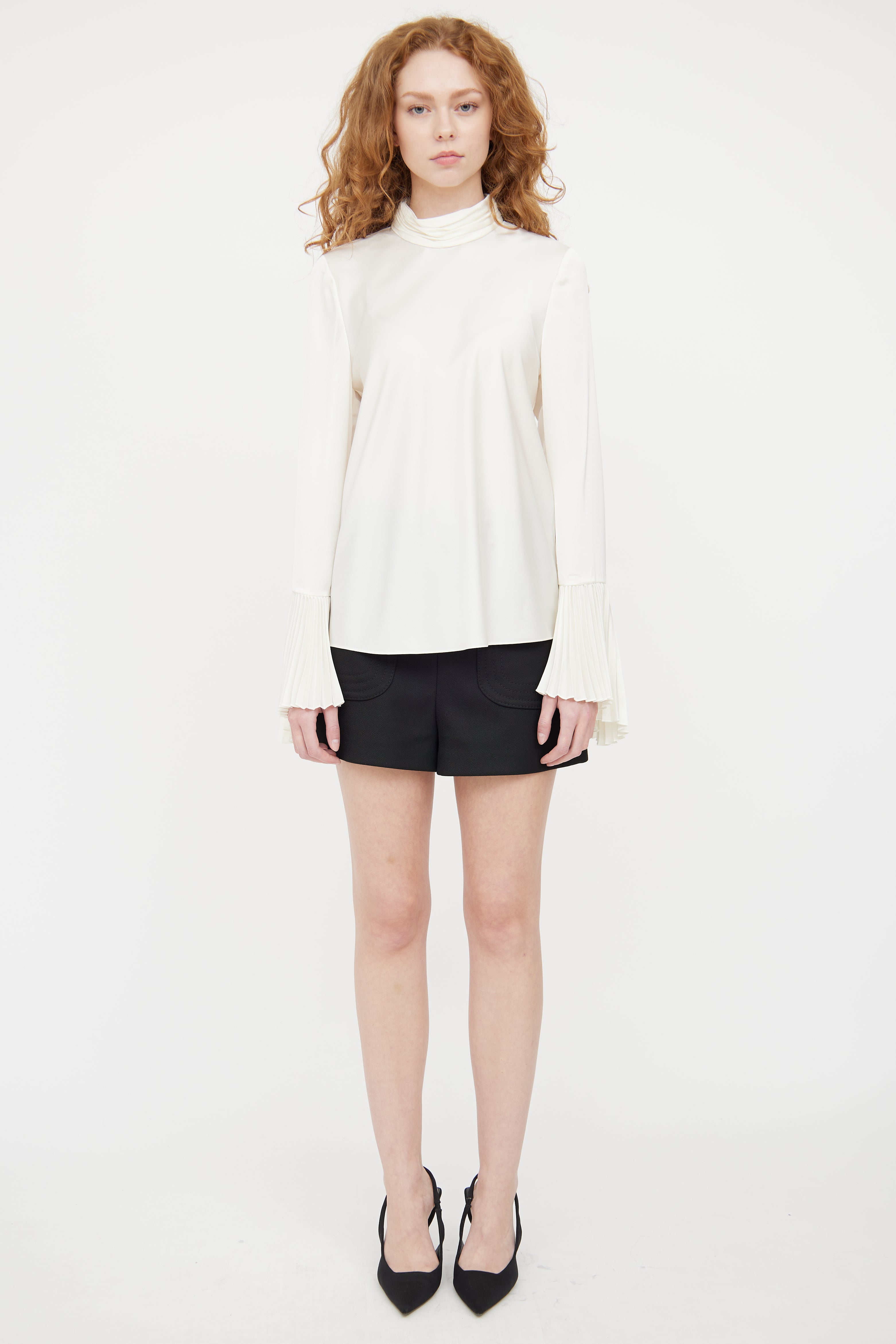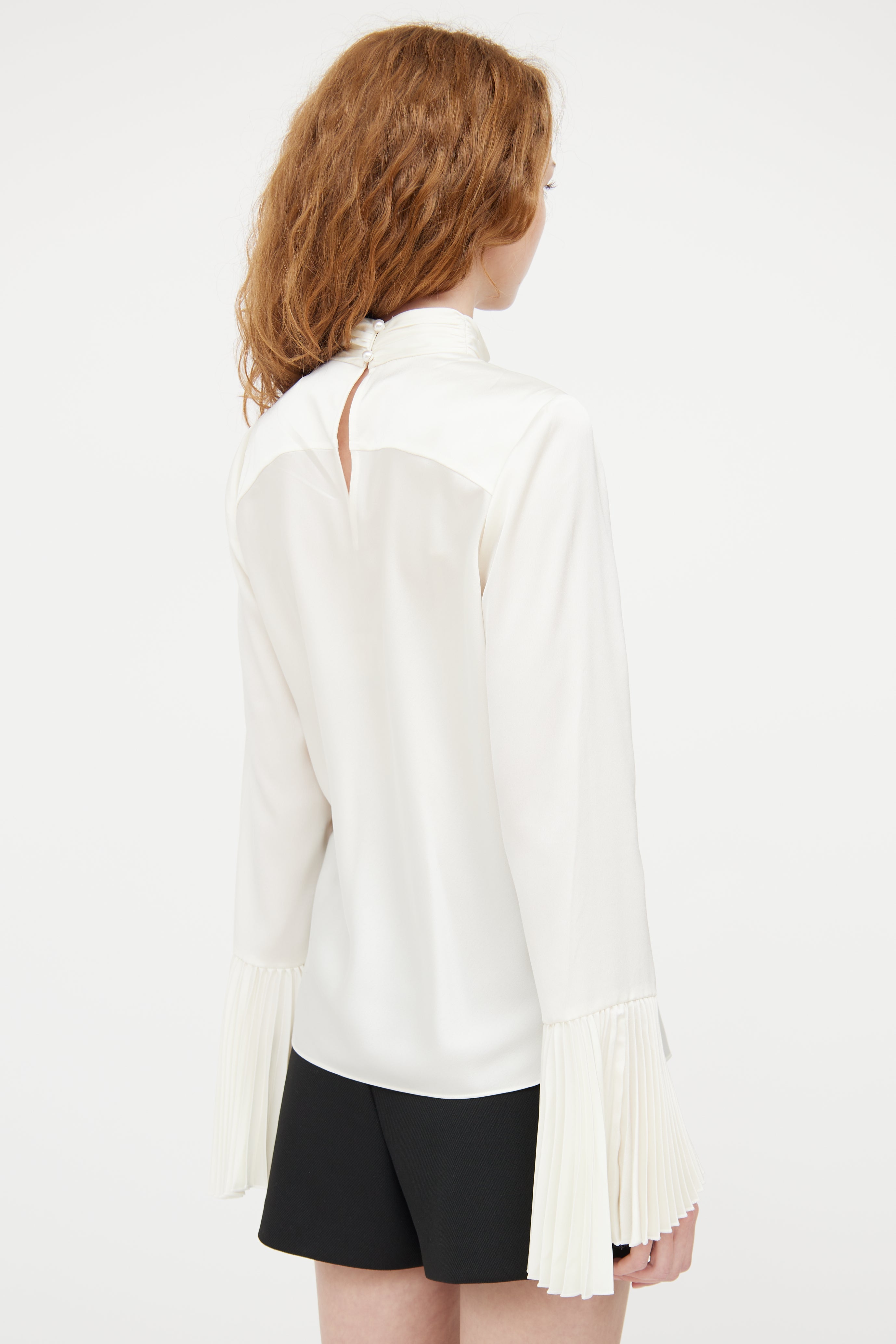 Pre-owned ME+EM cream satin top featuring a round gathered neckline, long sleeves with pleated flared cuffs, and faux pearl button closure.