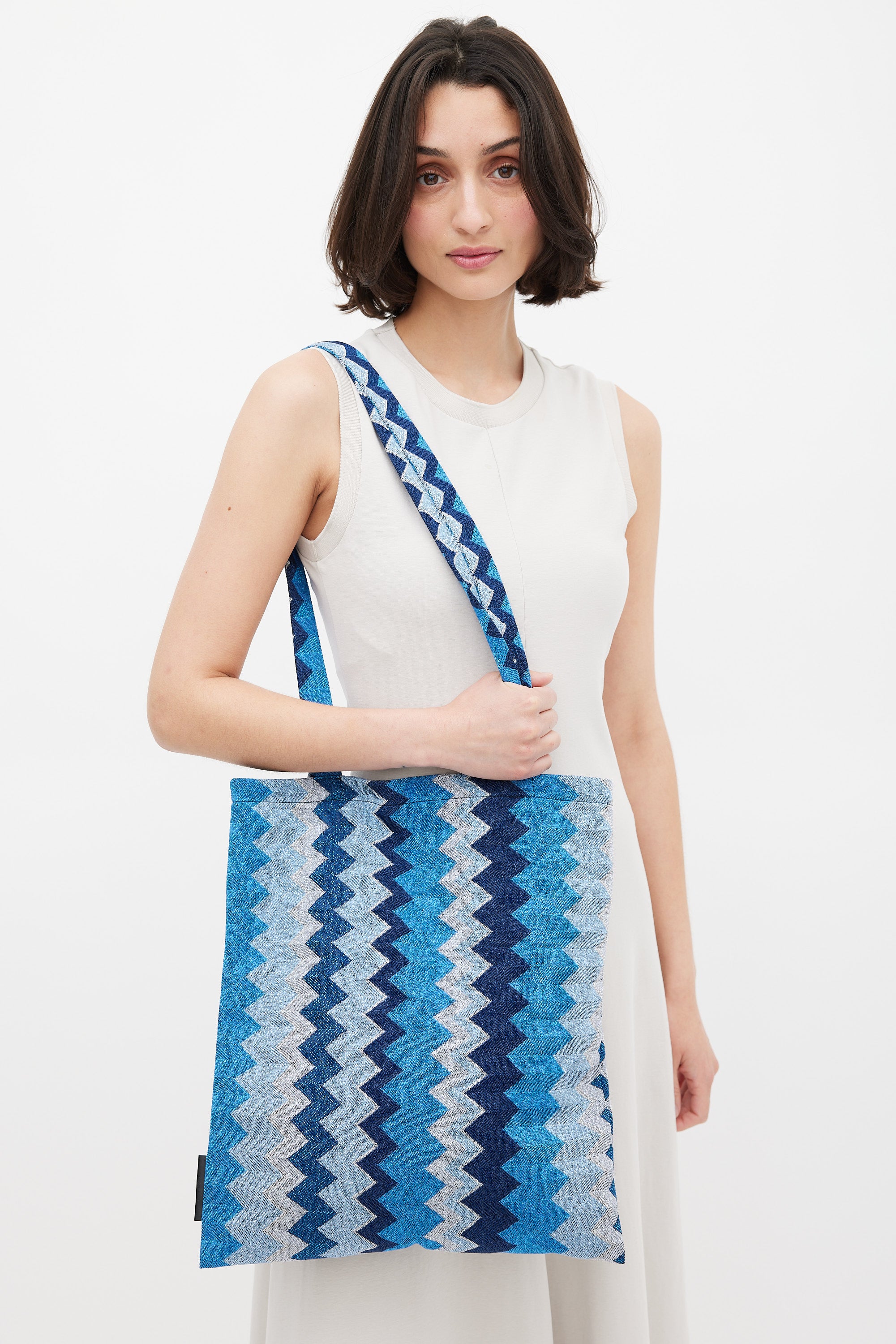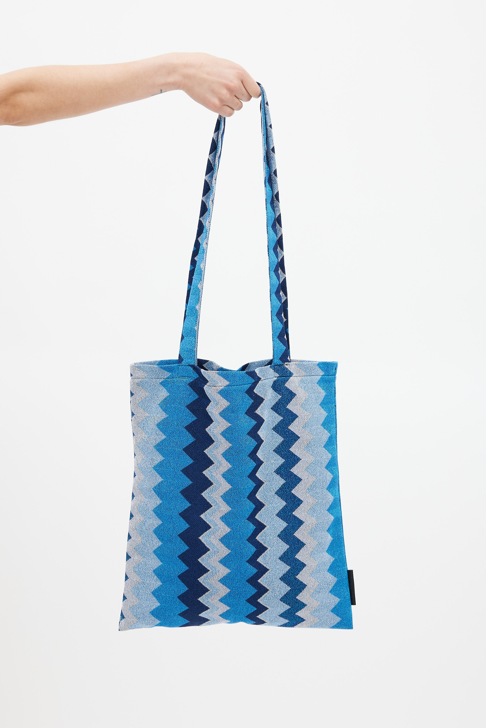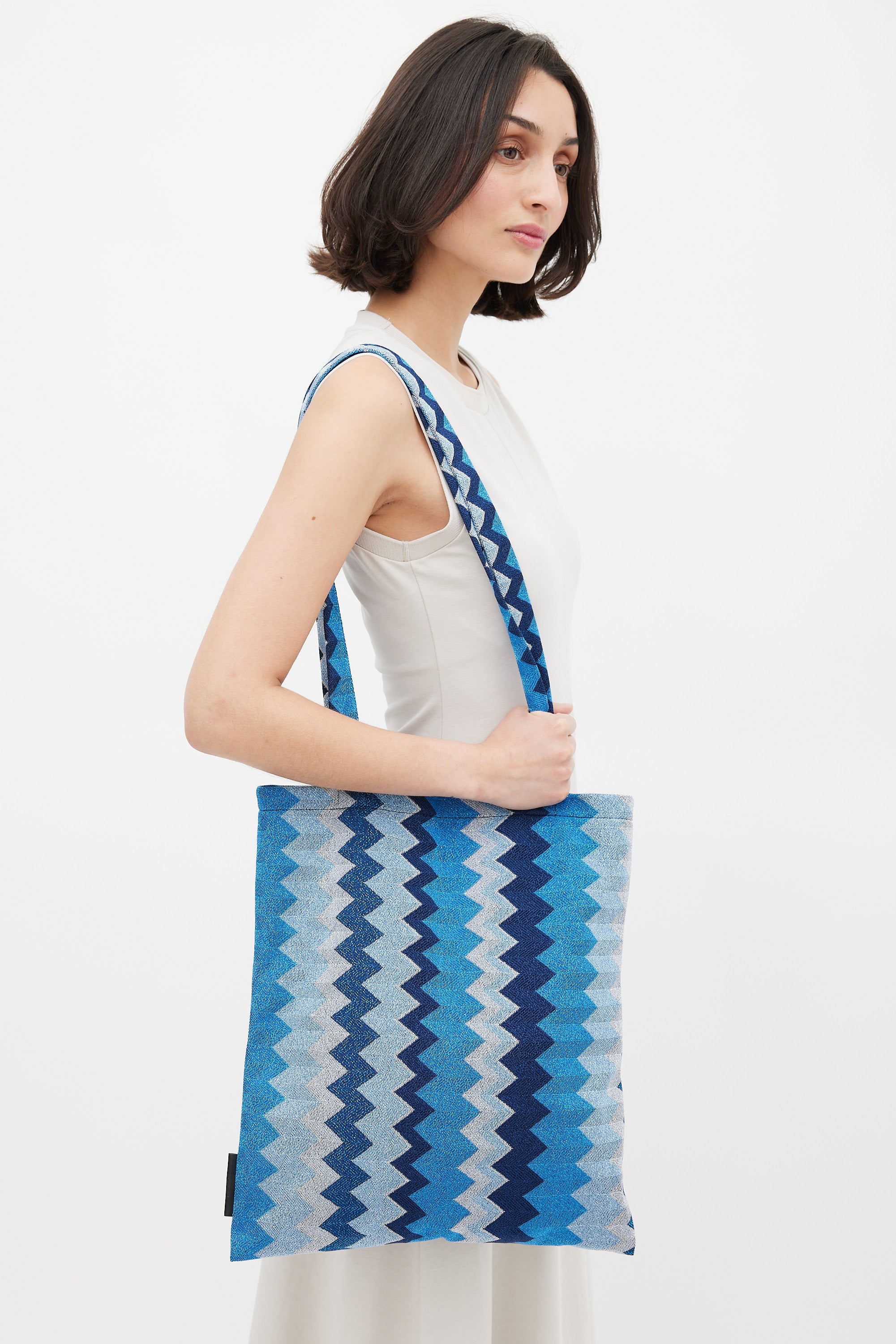 Pre-owned Missoni blue tote bag featuring dual flat top handle, zigzag pattern with metallic threading throughout, open top, and one main compartment with single slip pocket.
