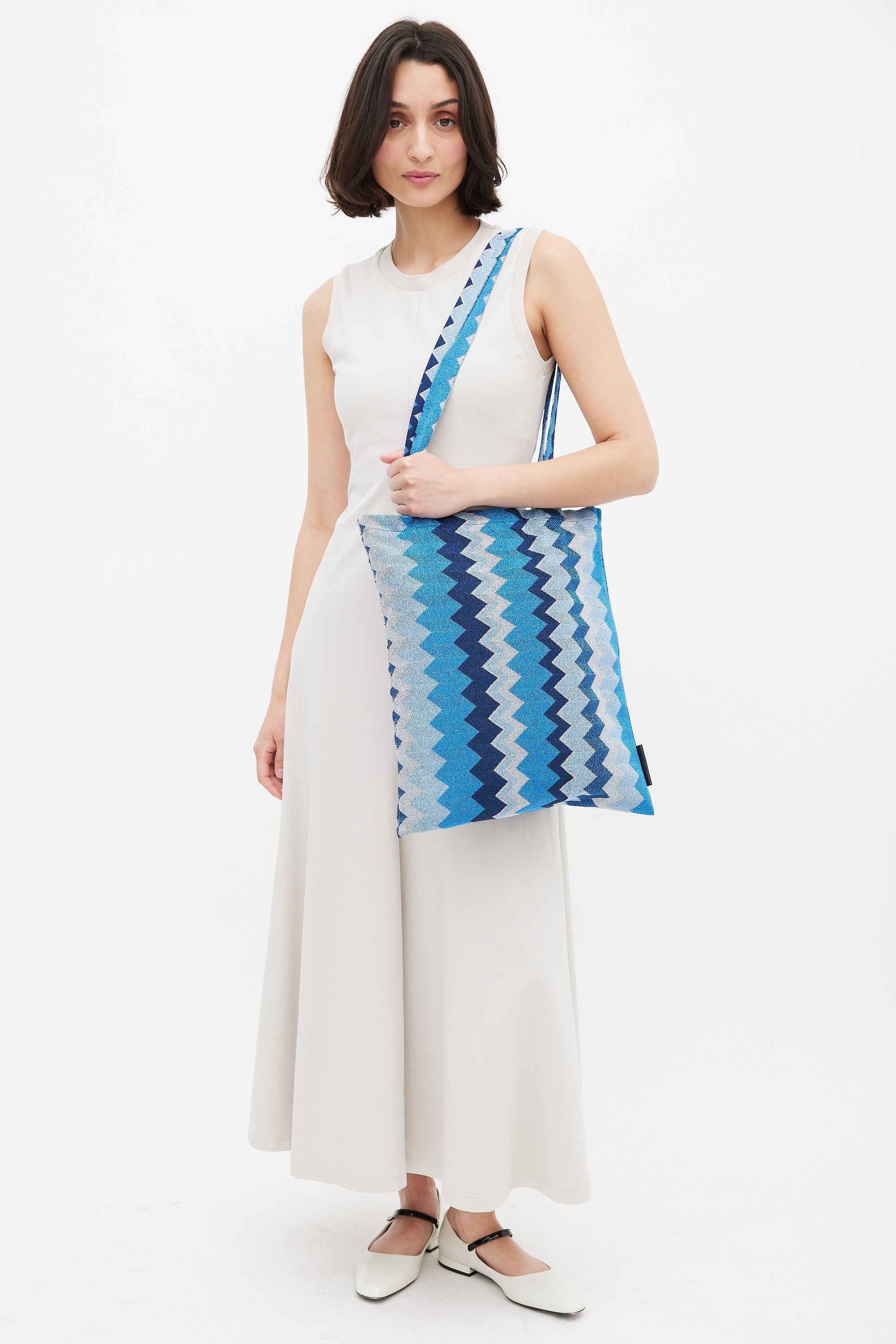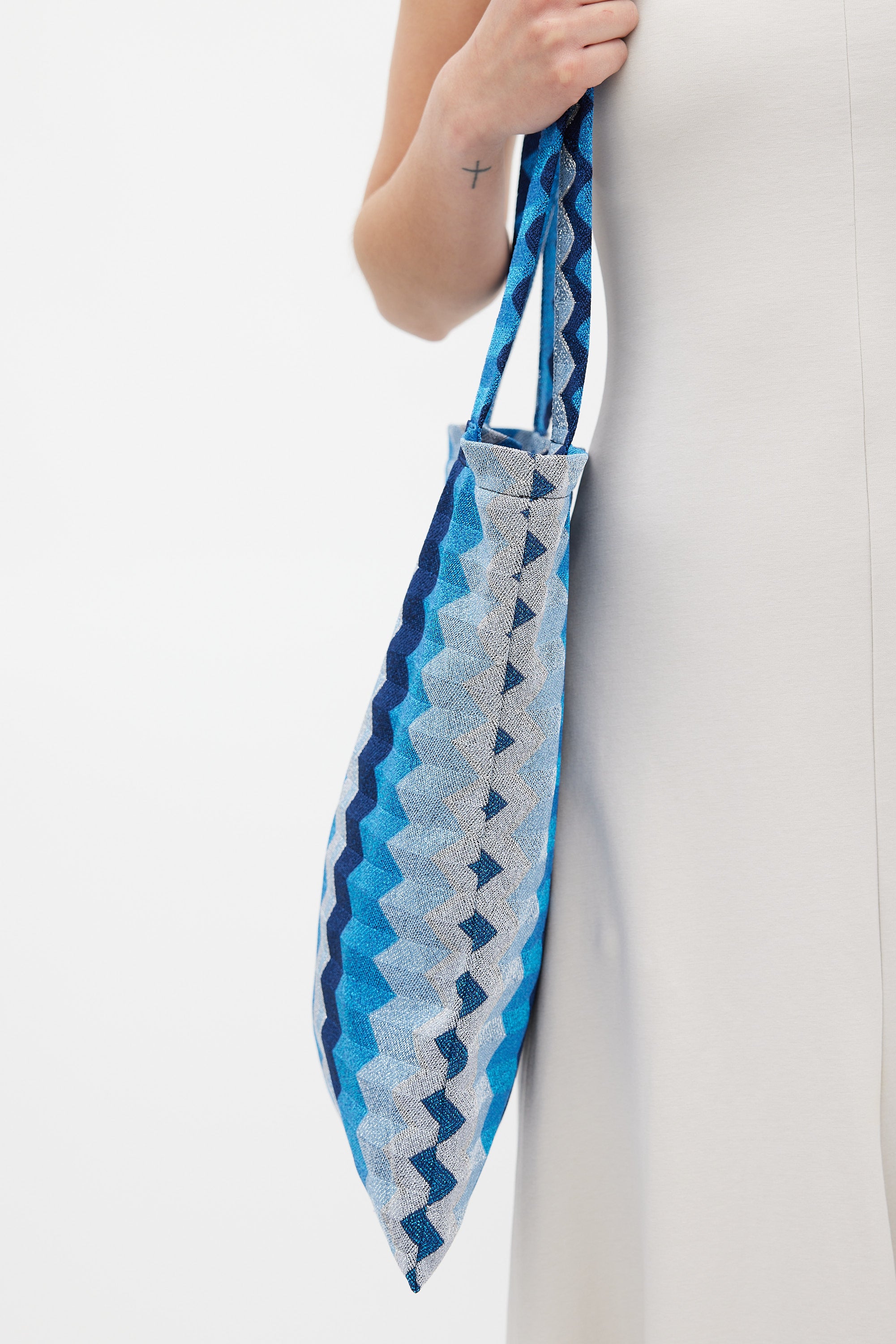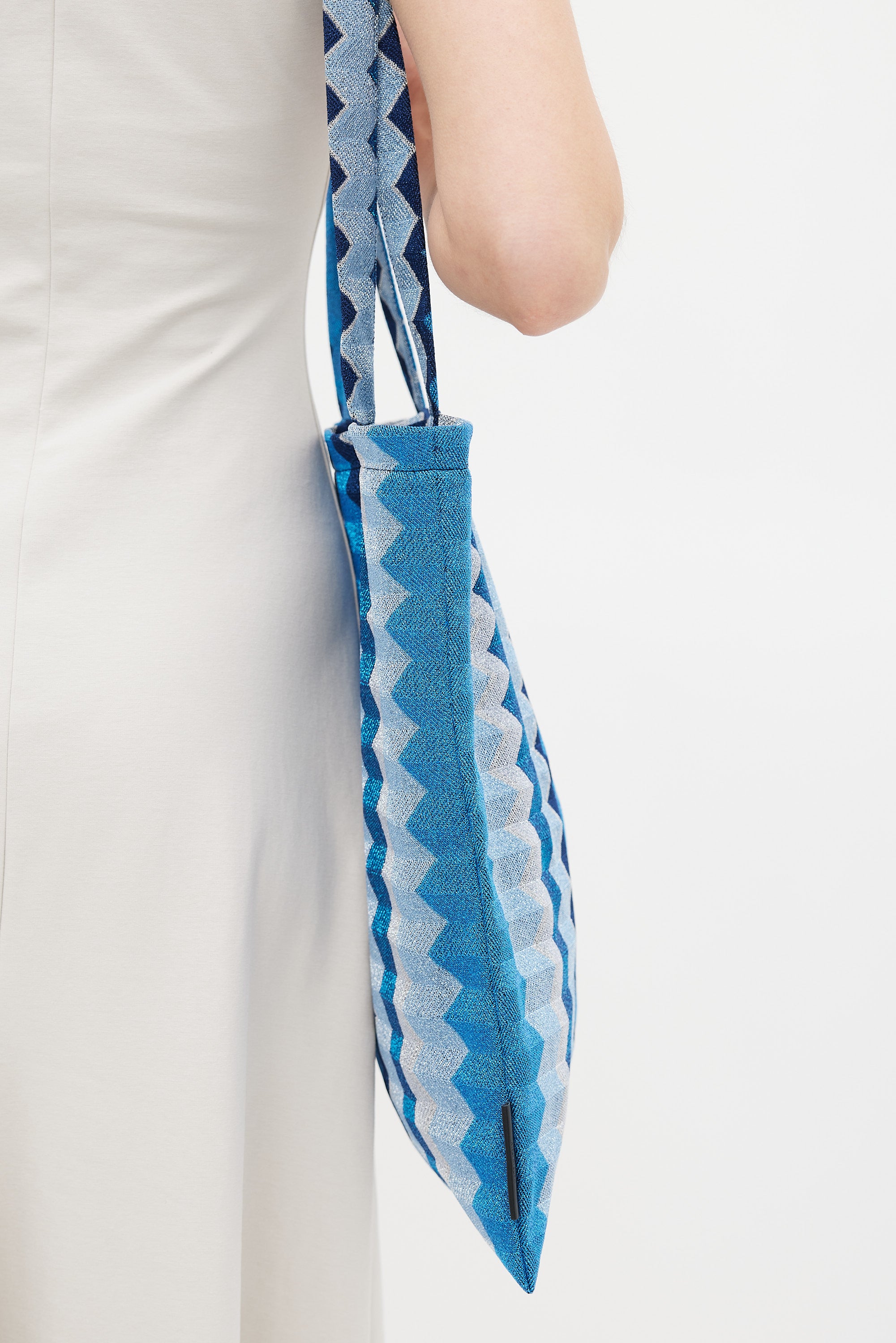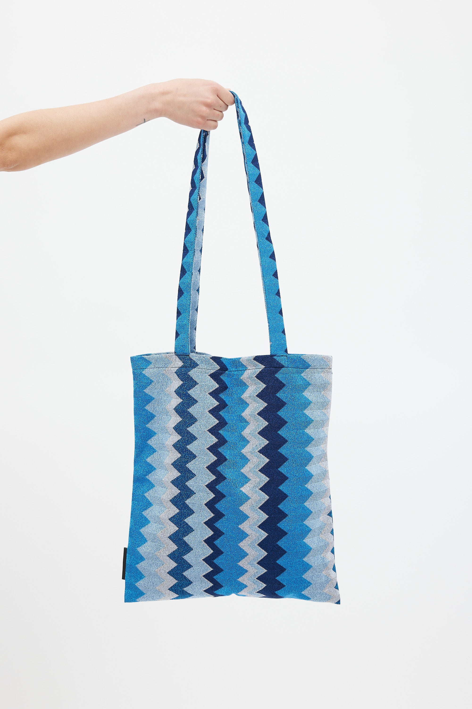 Pre-owned Missoni blue tote bag featuring dual flat top handle, zigzag pattern with metallic threading throughout, open top, and one main compartment with single slip pocket.