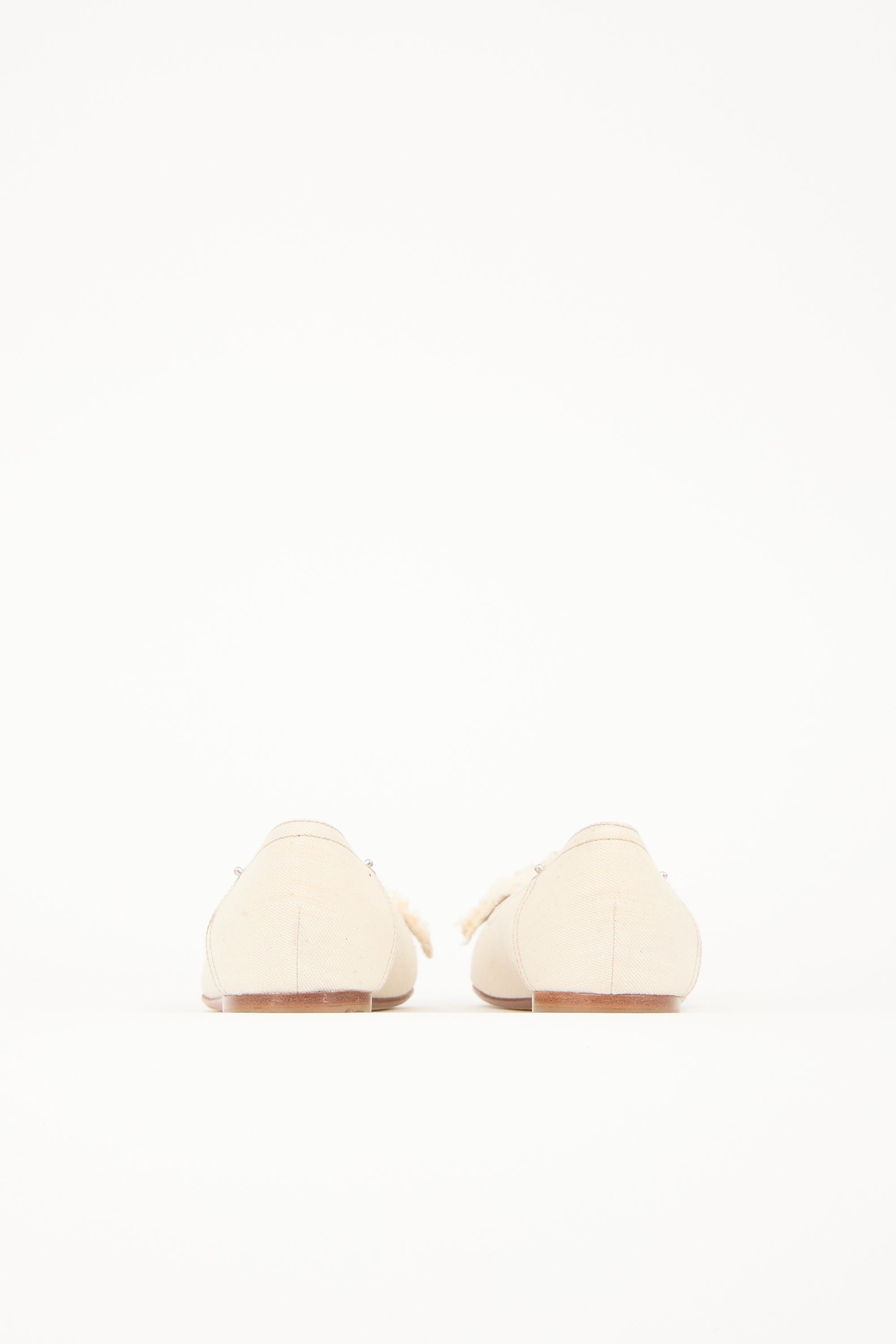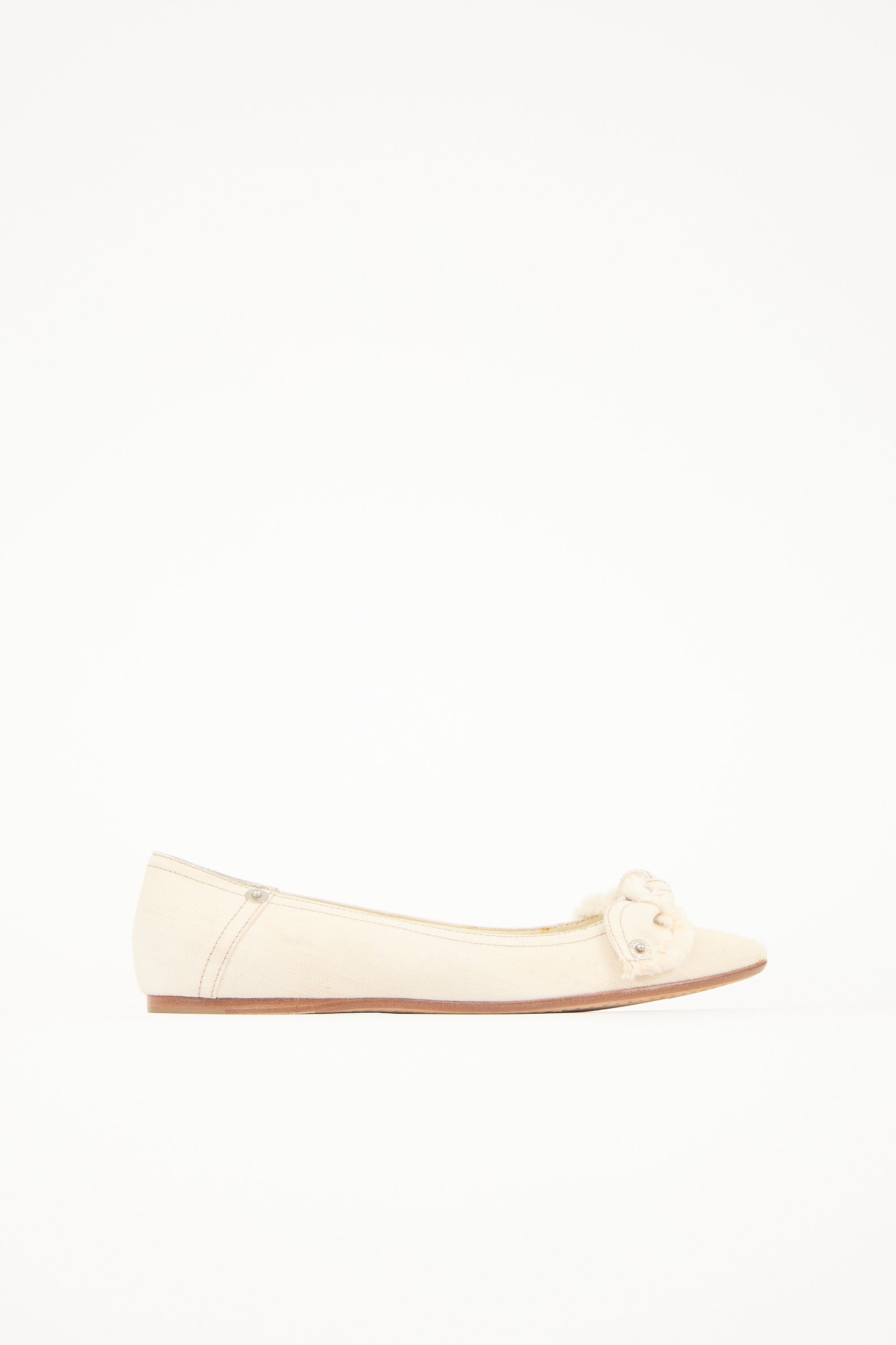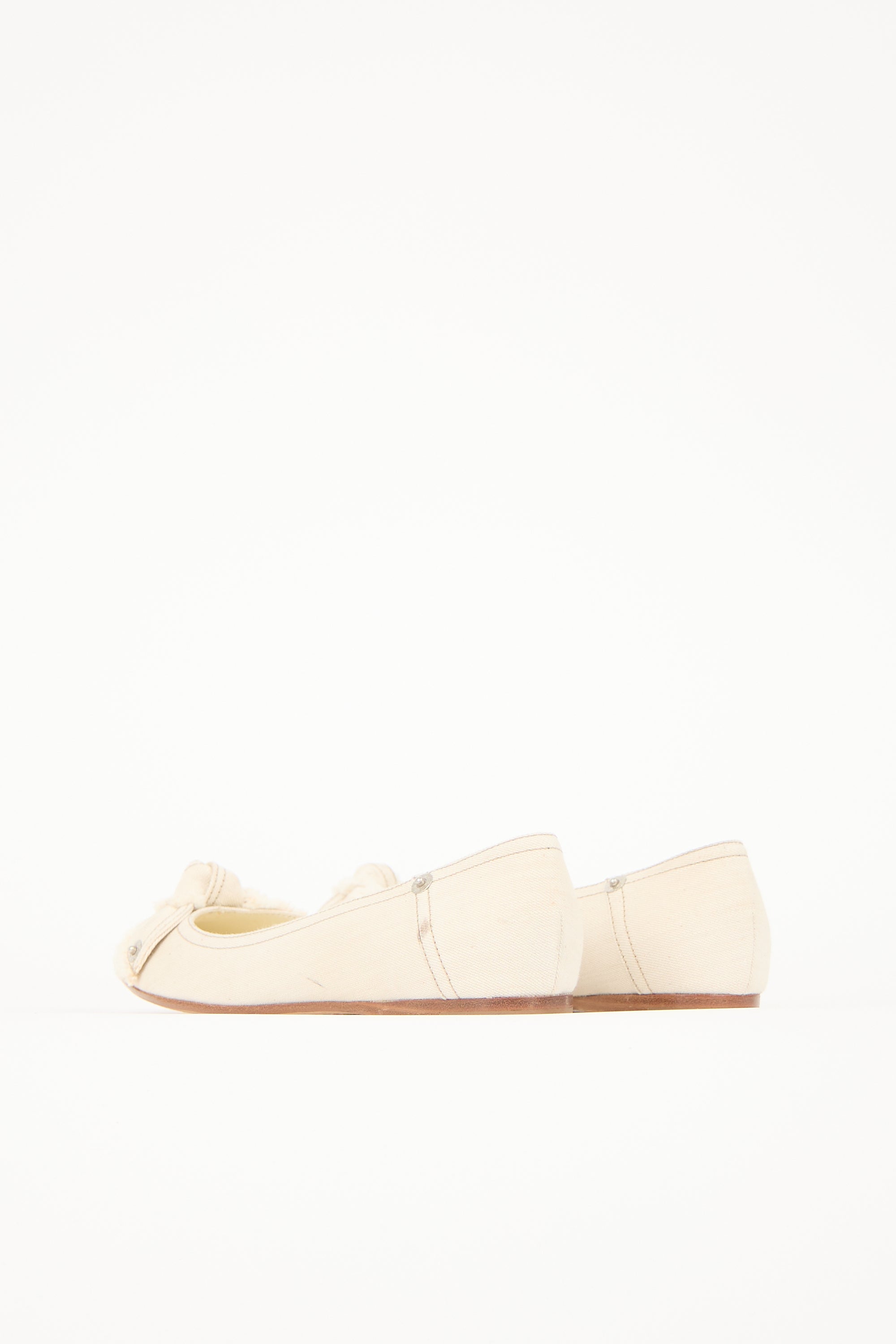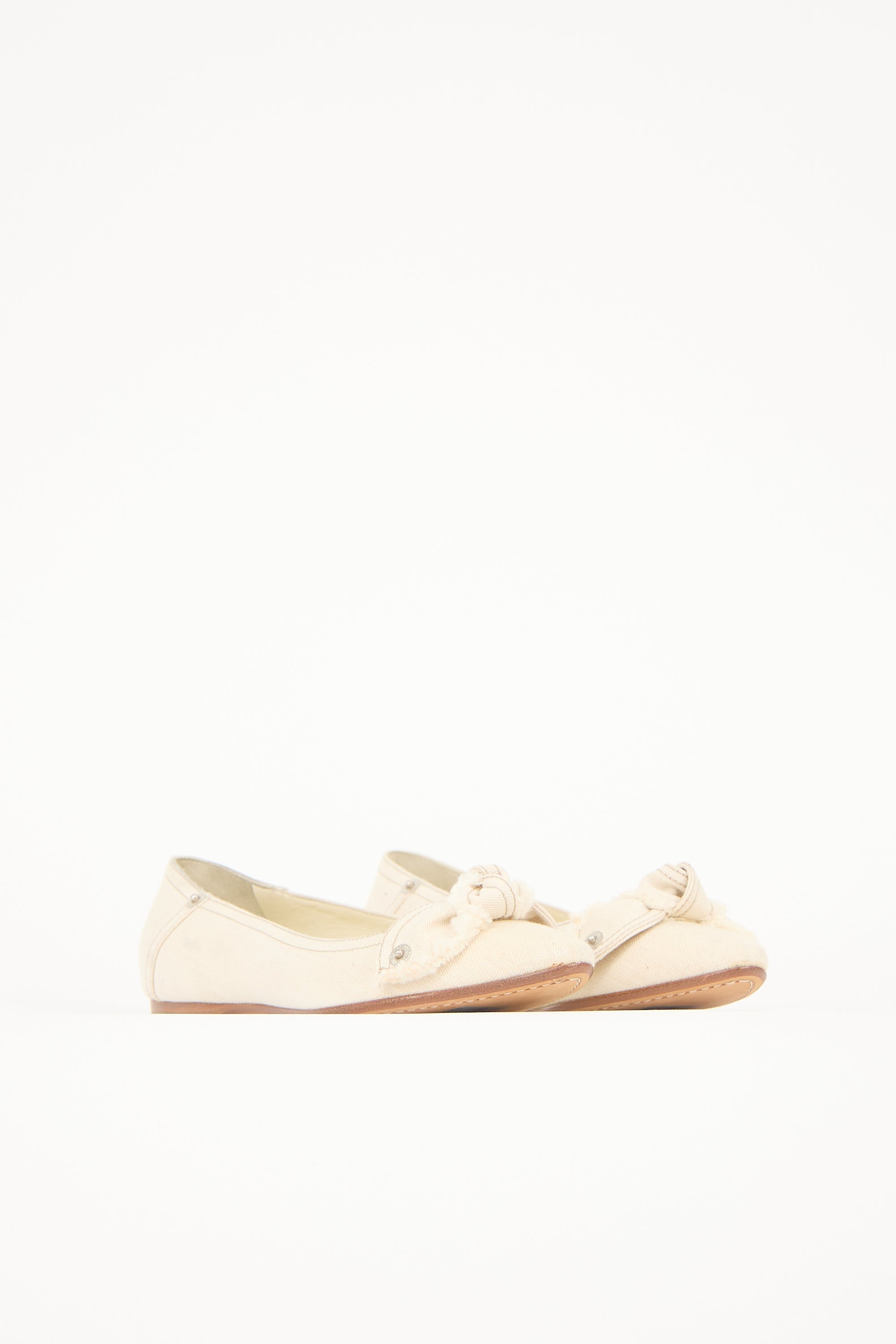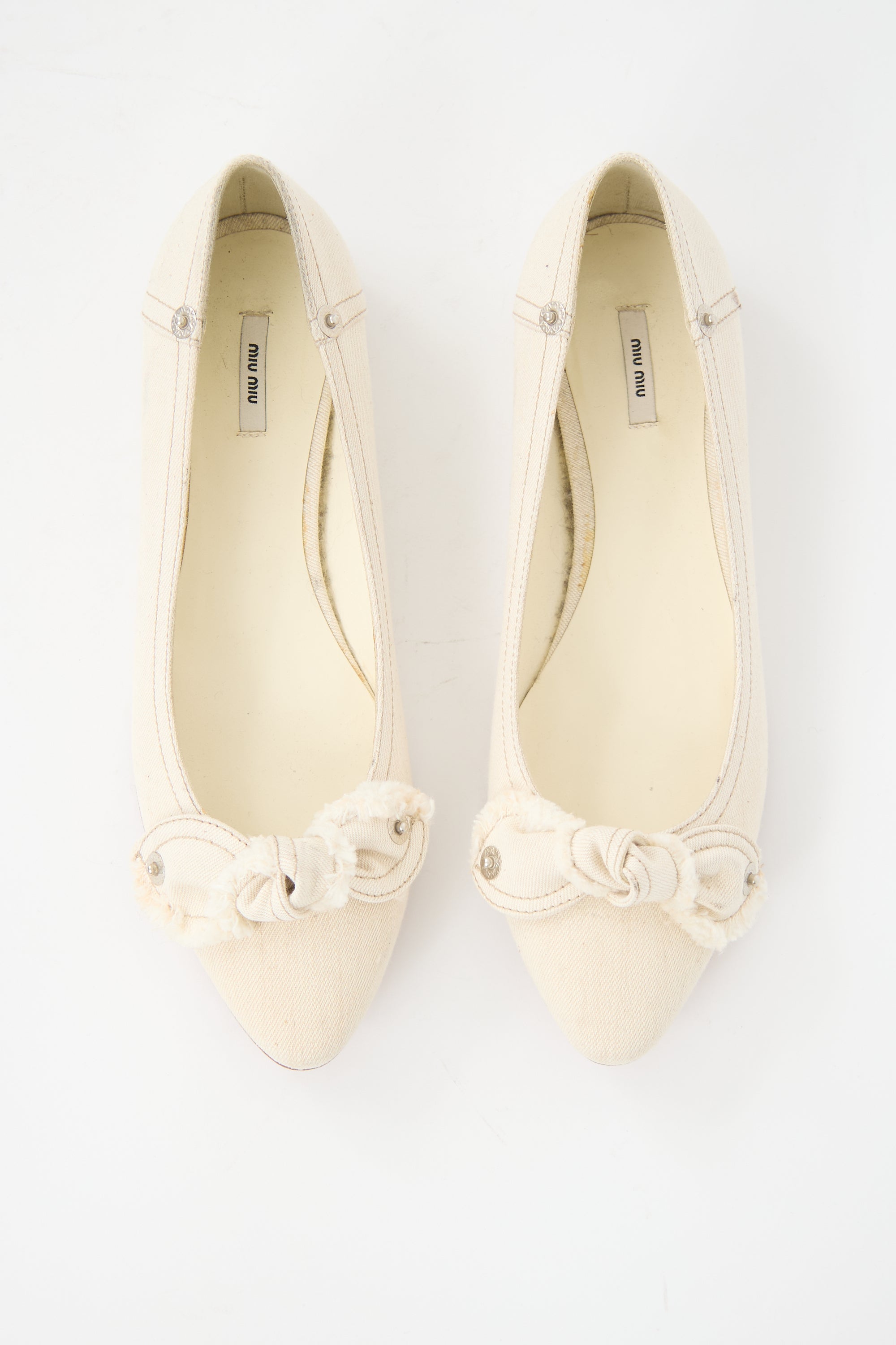Pre-owned Miu Miu cream denim flats featuring an almond toe, bow detail at vamp with raw trim, silver tone hardware embellishments throughout, and slip on entry.