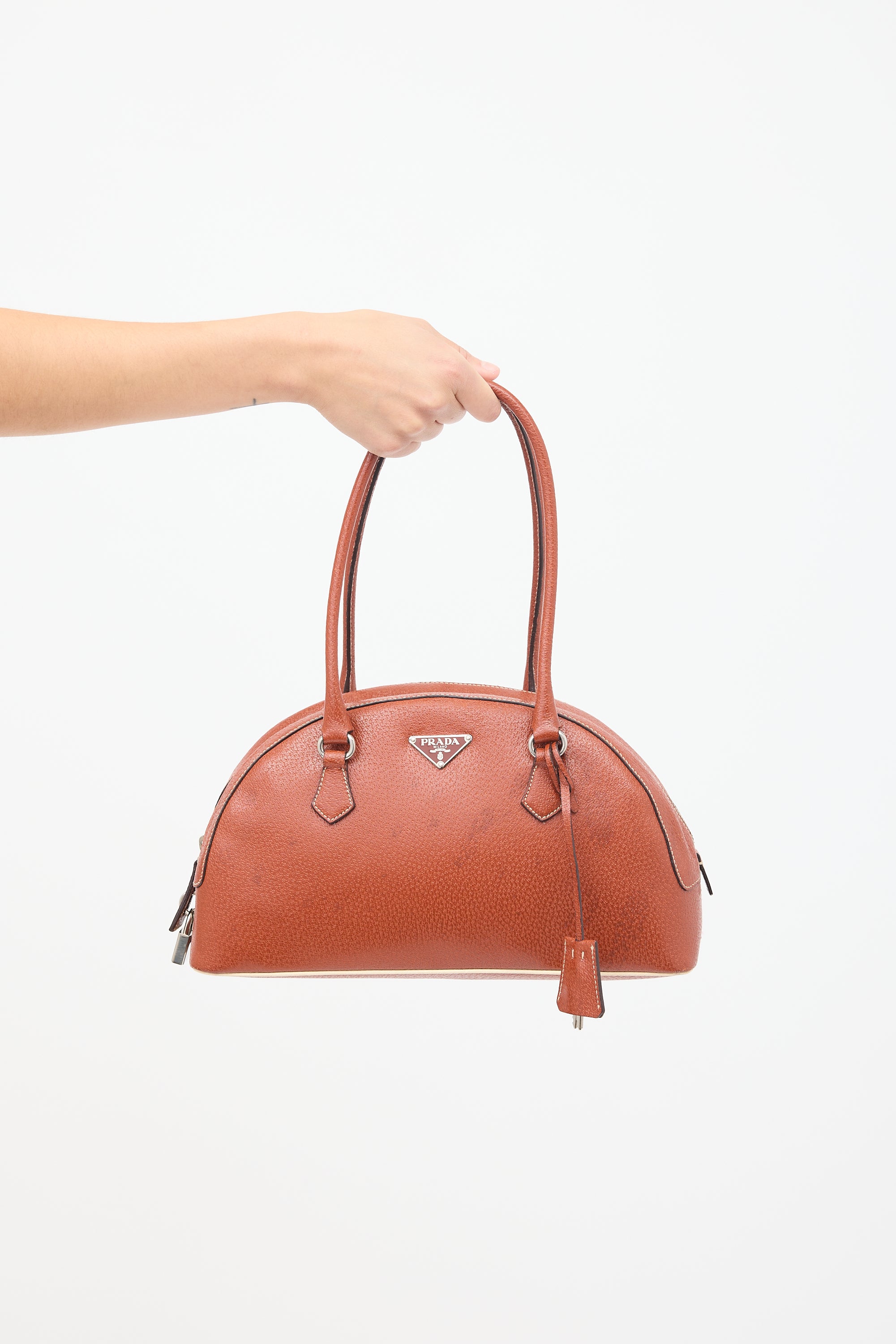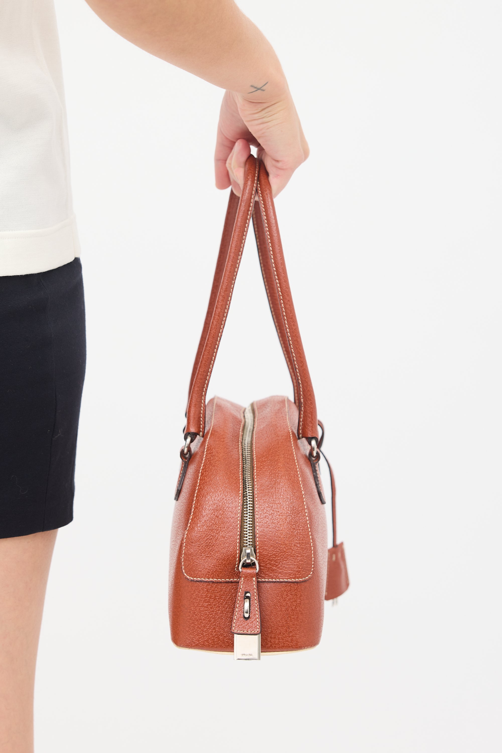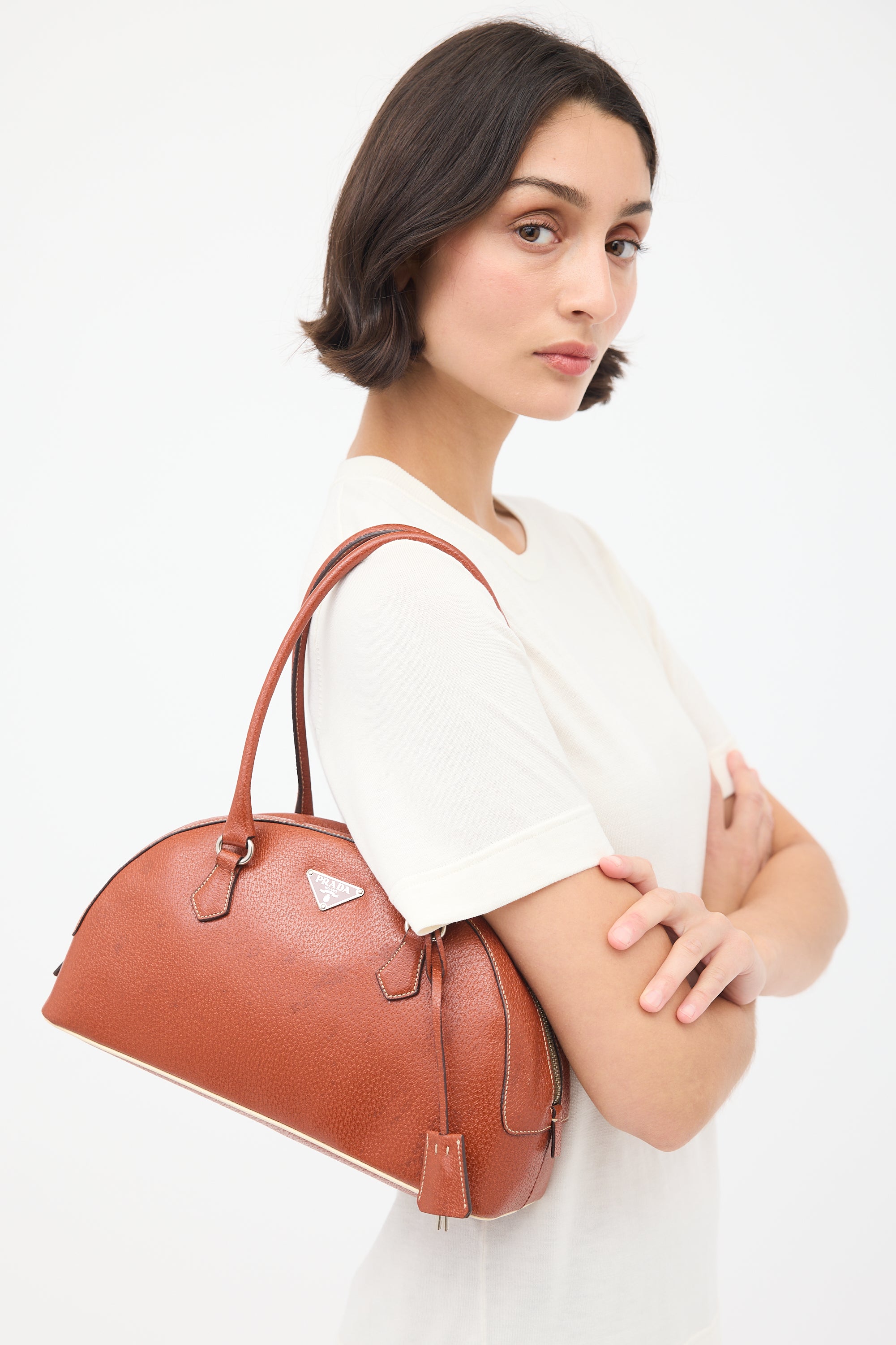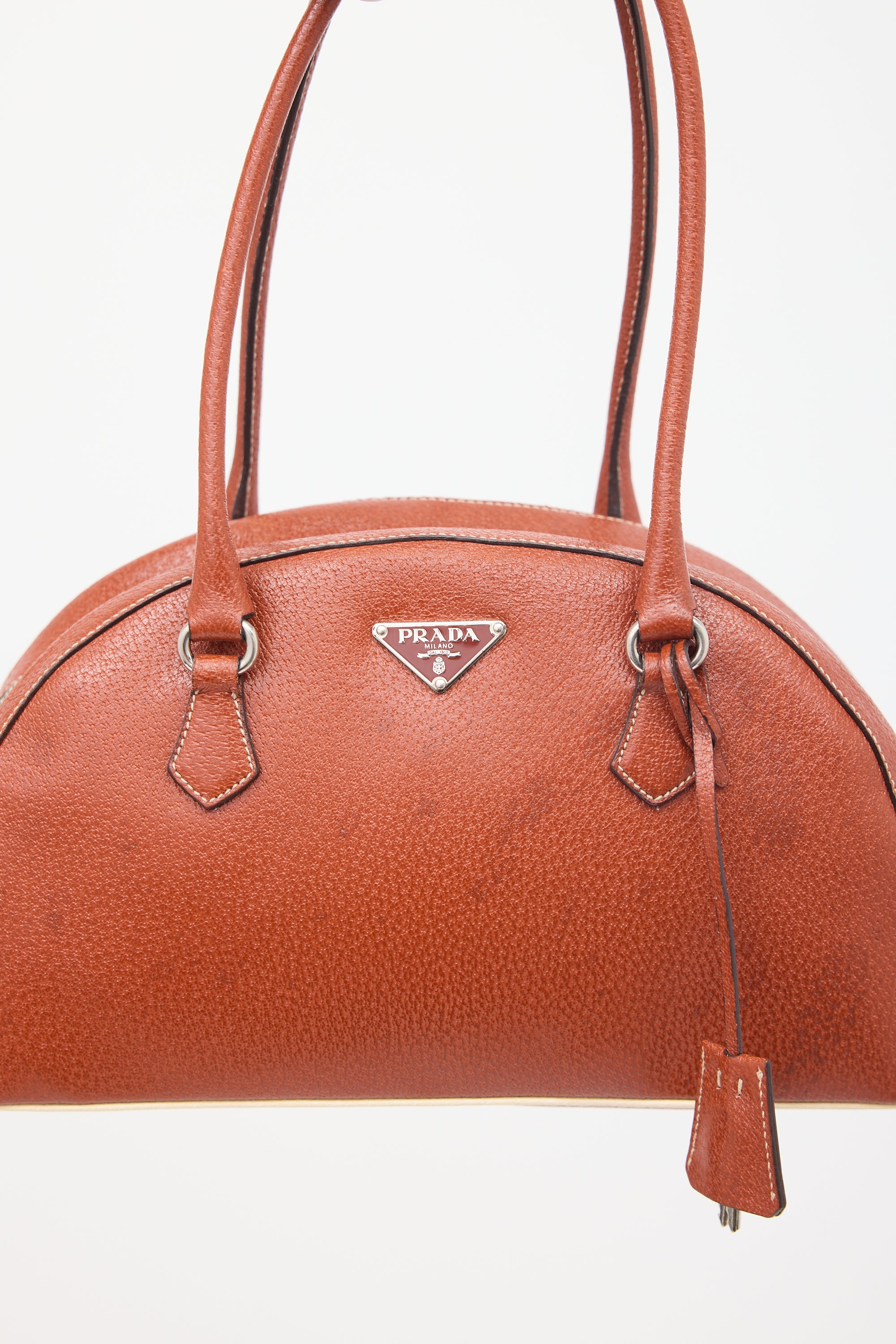 Pre-owned Prada vintage brown leather shoulder bag featuring dual rolled top handles, logo enamel hardware at front, detachable lock and key clochette, zip closure at top, lined main compartment, and one zip pocket inside. Comes with original dust bag.